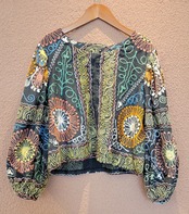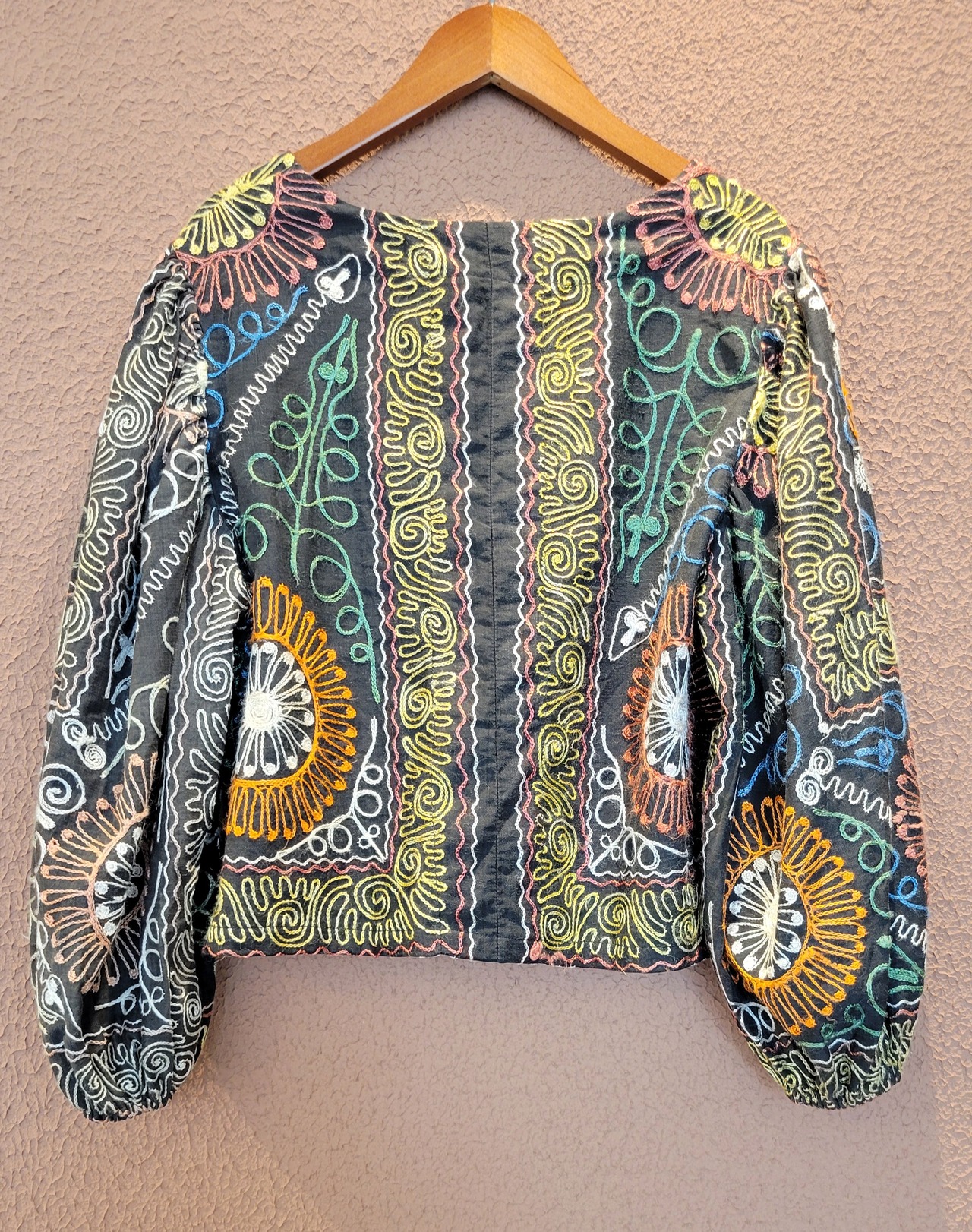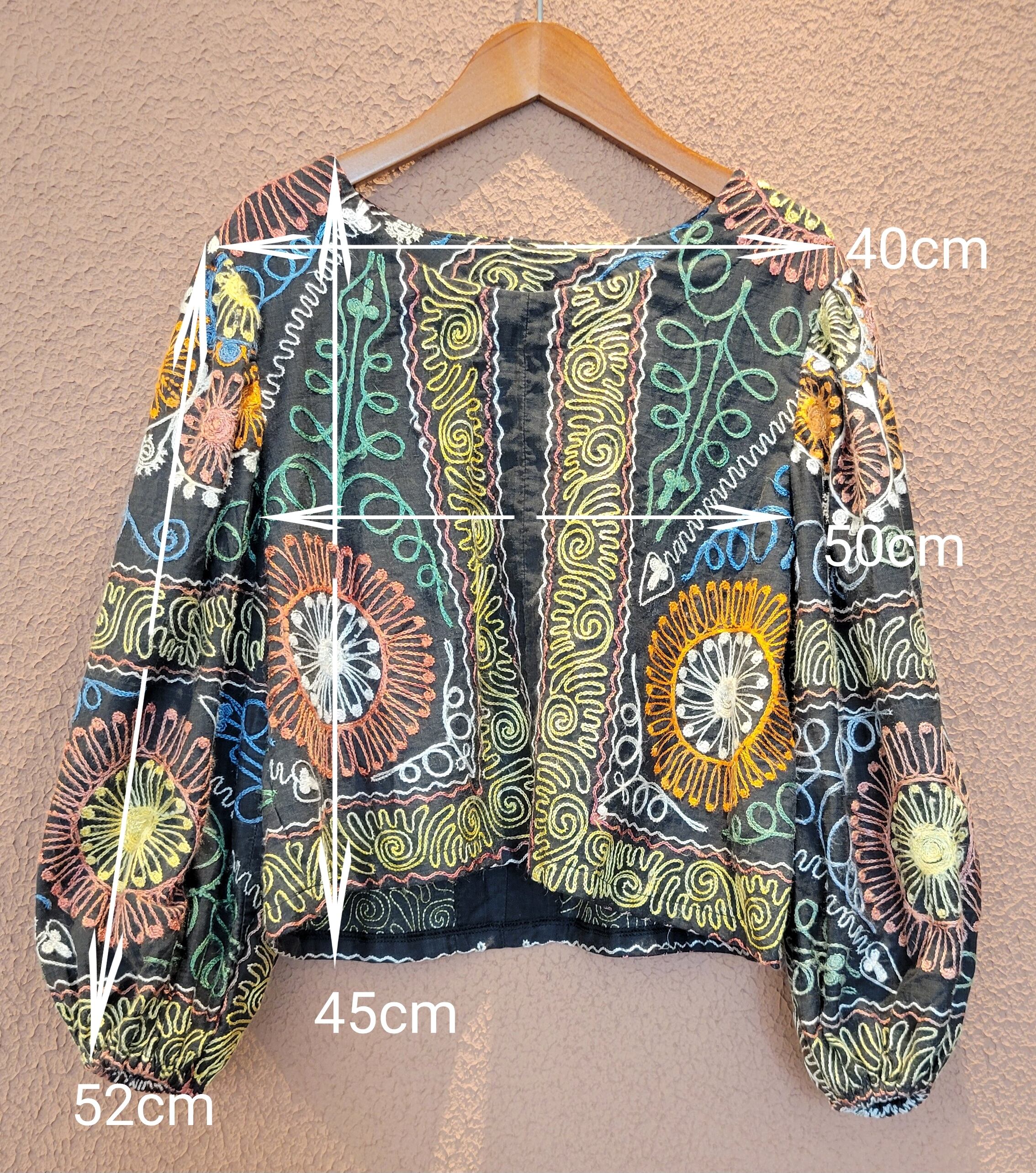 ヴィンテージのインド刺繍クロスを使用したリメイクプルオーバートップス。素材表記はありませんがコットンのようです。黒地にくすみのあるカラーの刺繍で派手すぎず着やすい1枚です。