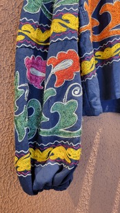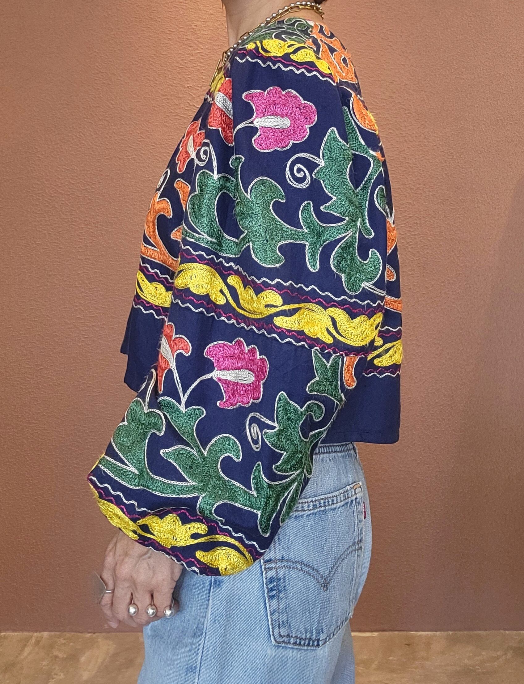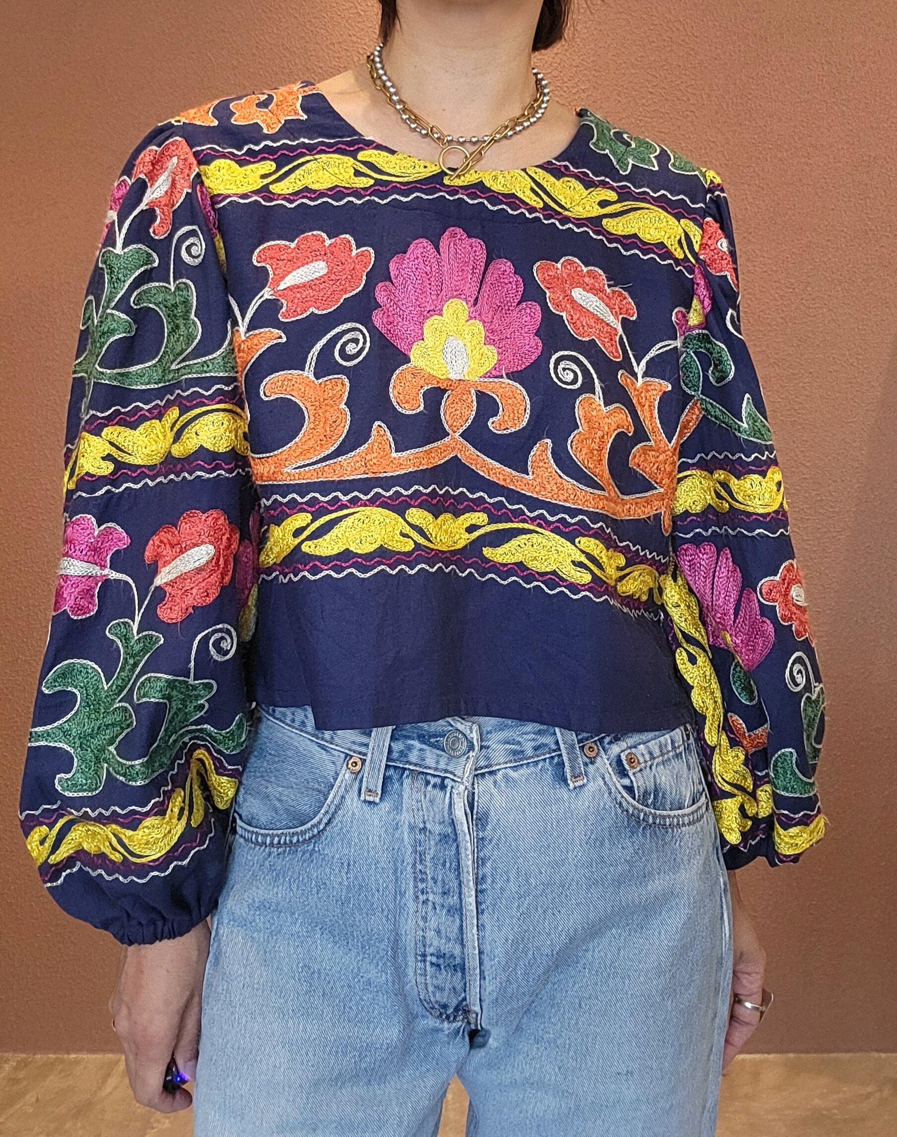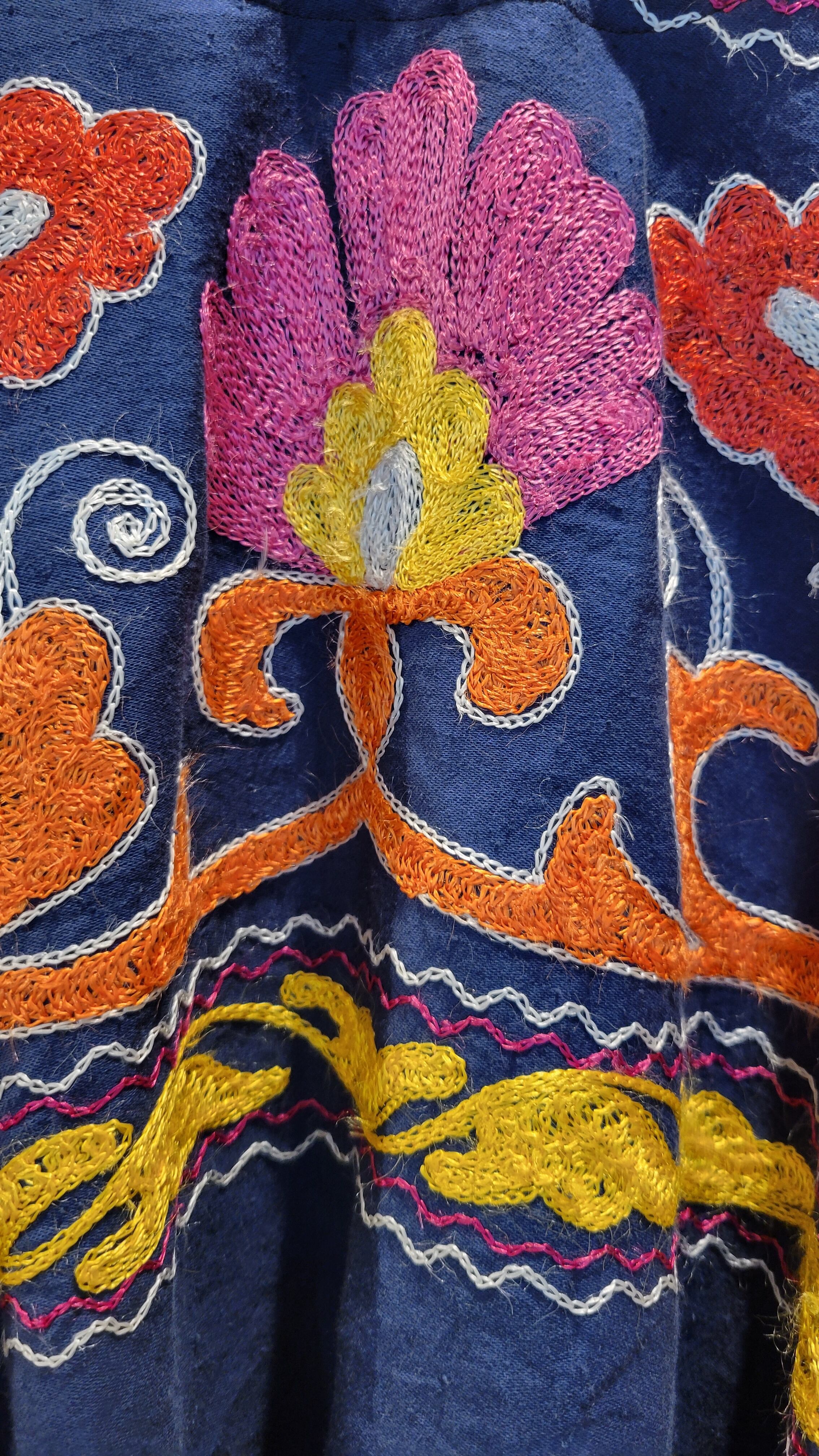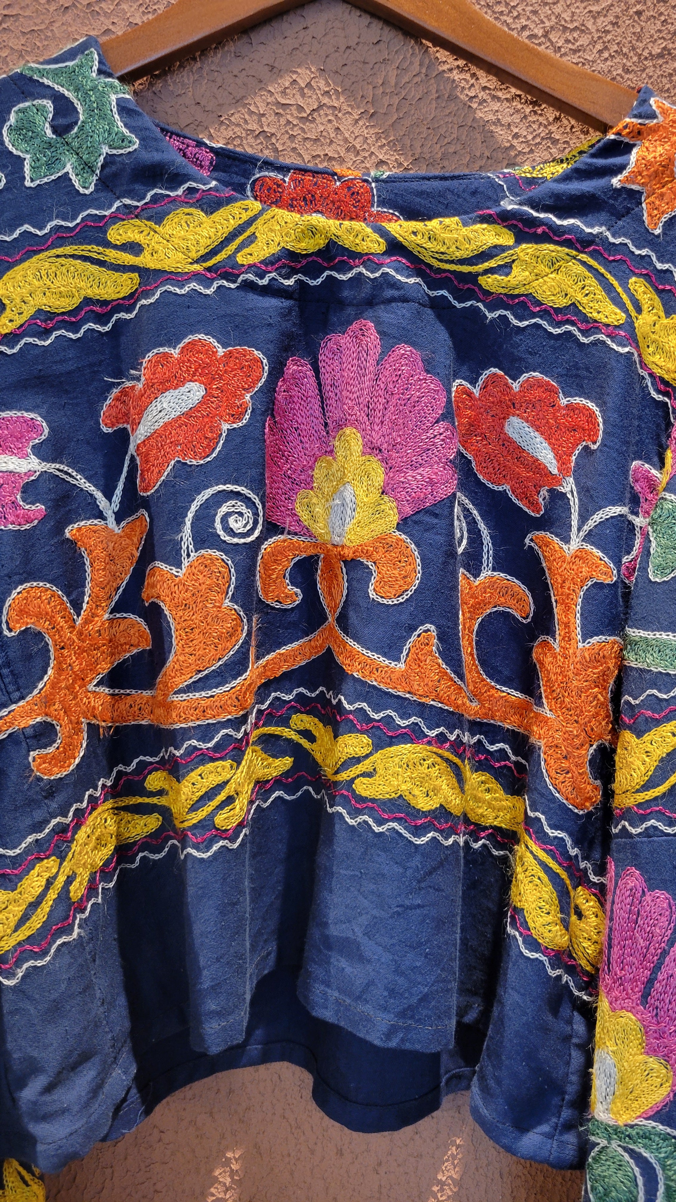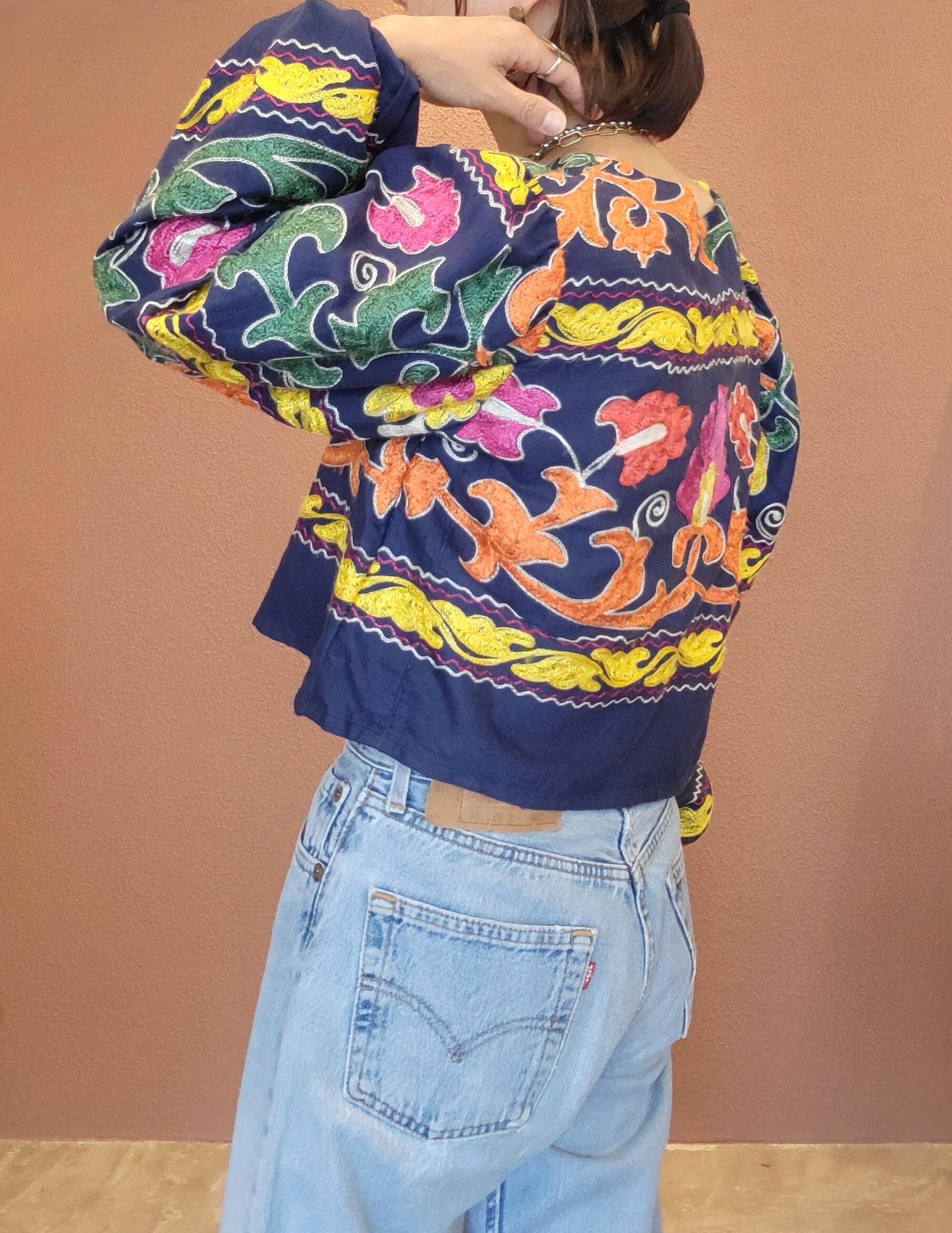 ヴィンテージのスザニ刺繍クロスを使用したリメイクプルオーバートップス。素材表記はありませんがコットンのようです。柔らかな肌触りです。ネイビーの地に鮮やかなカラーの刺繍が華やかでインパクトのある主役級トップスです。