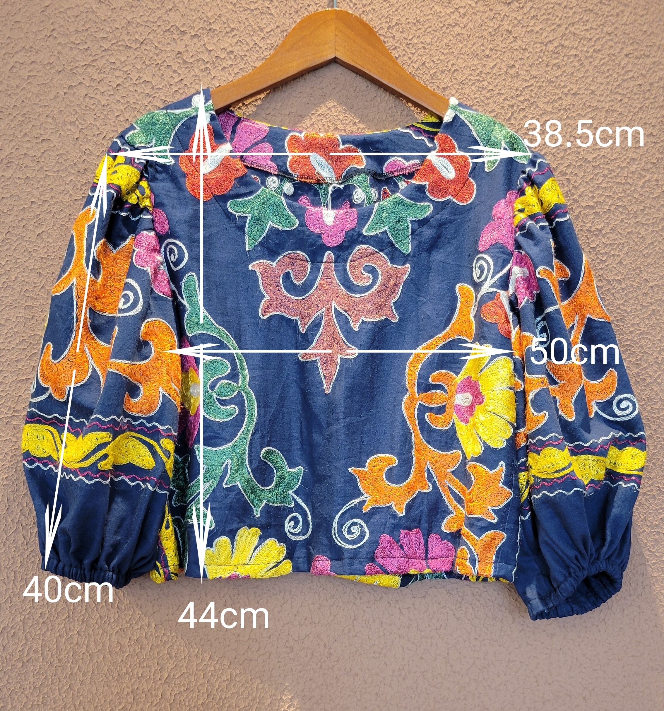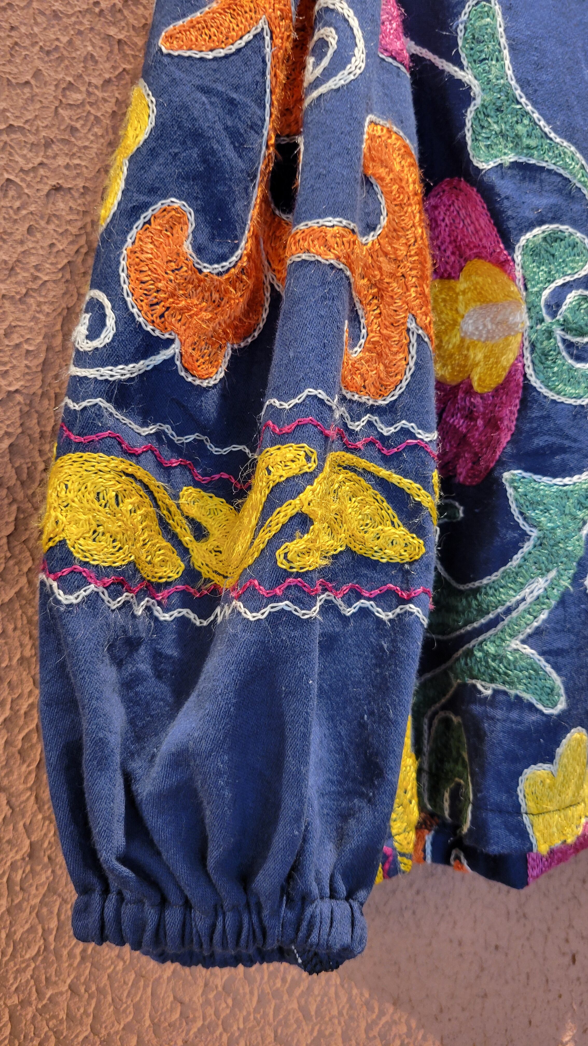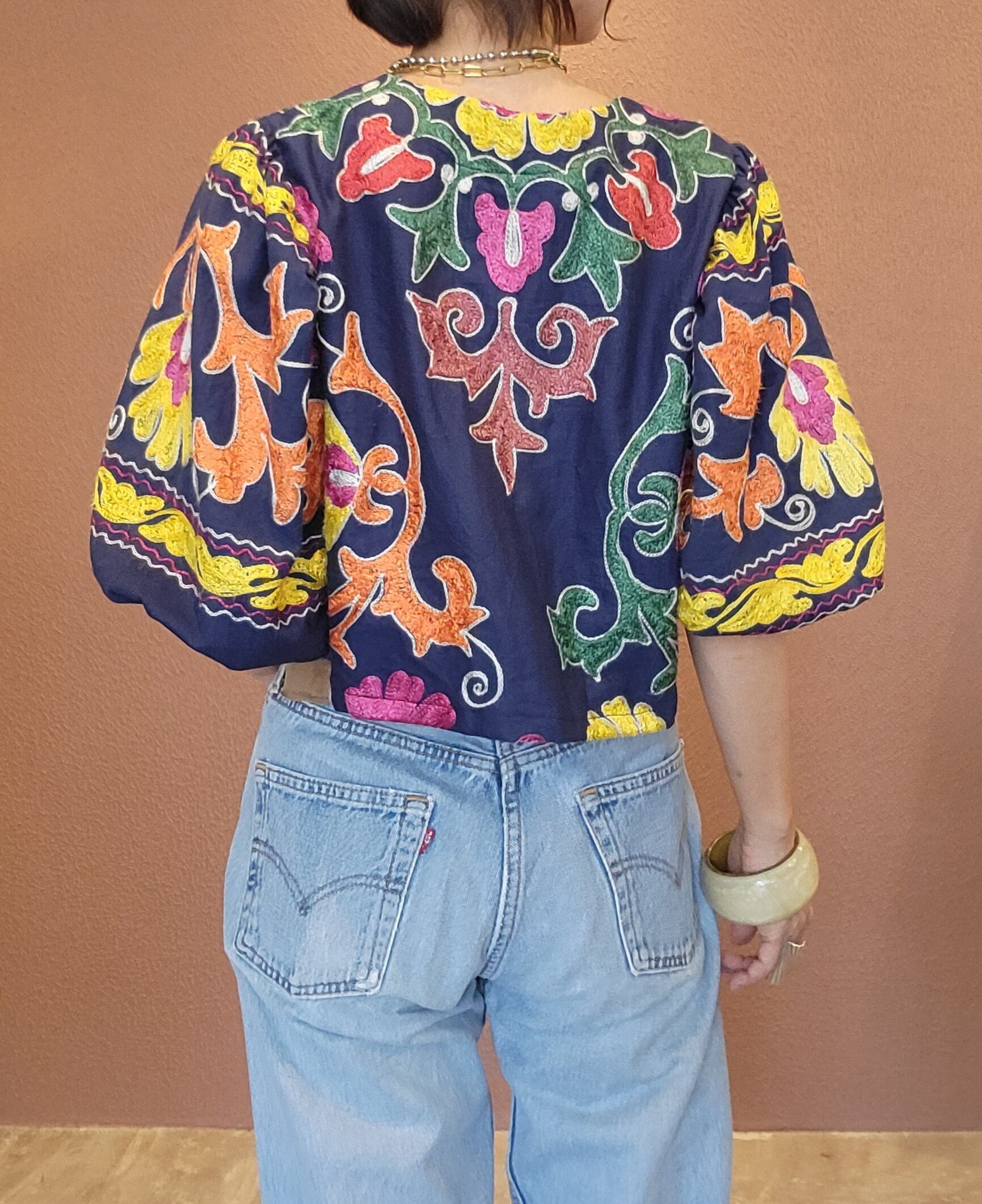 ヴィンテージのスザニ刺繍クロスを使用したリメイクプルオーバートップス。素材表記はありませんがコットンのようです。柔らかな肌触りです。ネイビーの地に鮮やかなカラーの刺繍が華やかでインパクトのある主役級トップスです。
