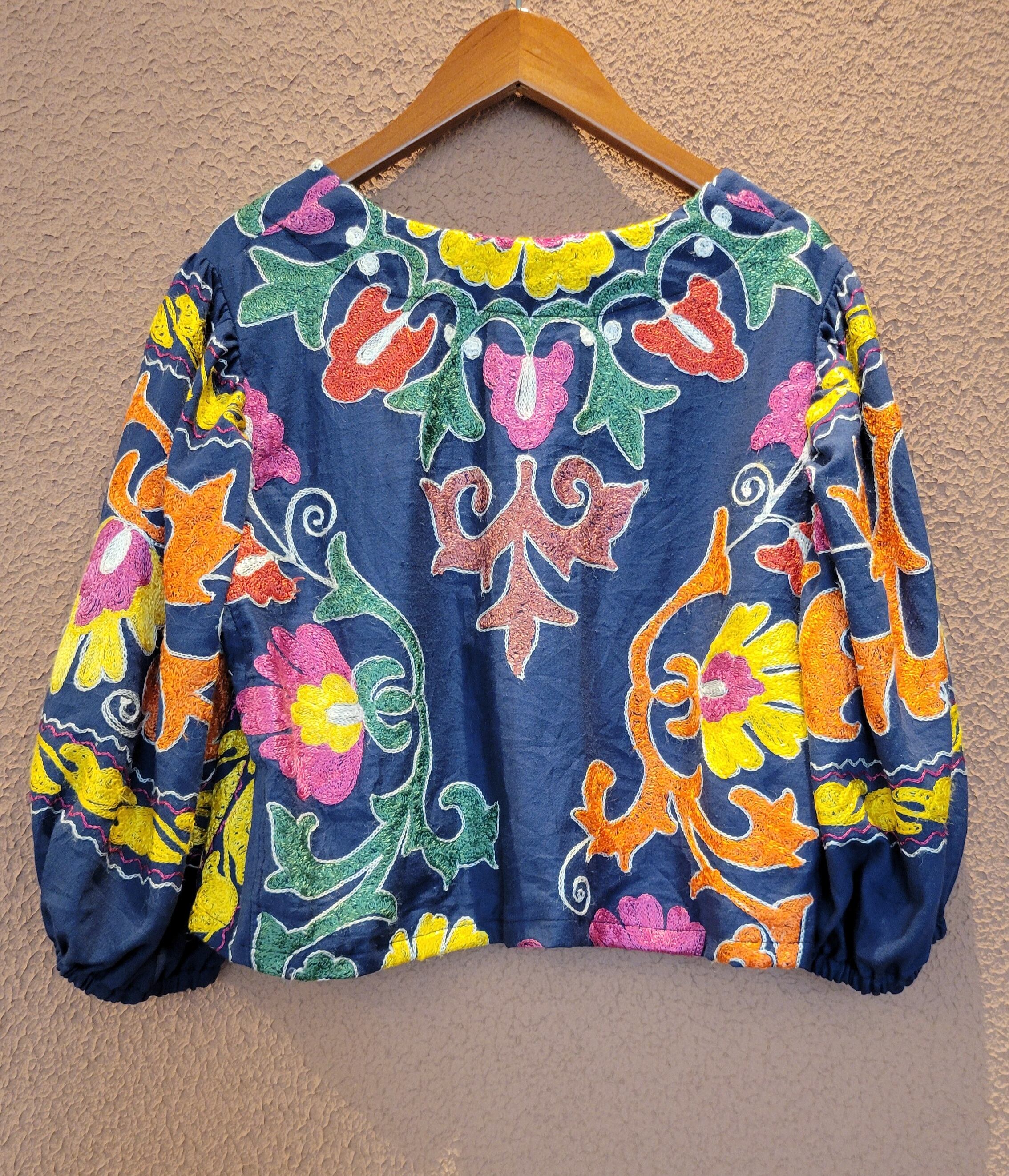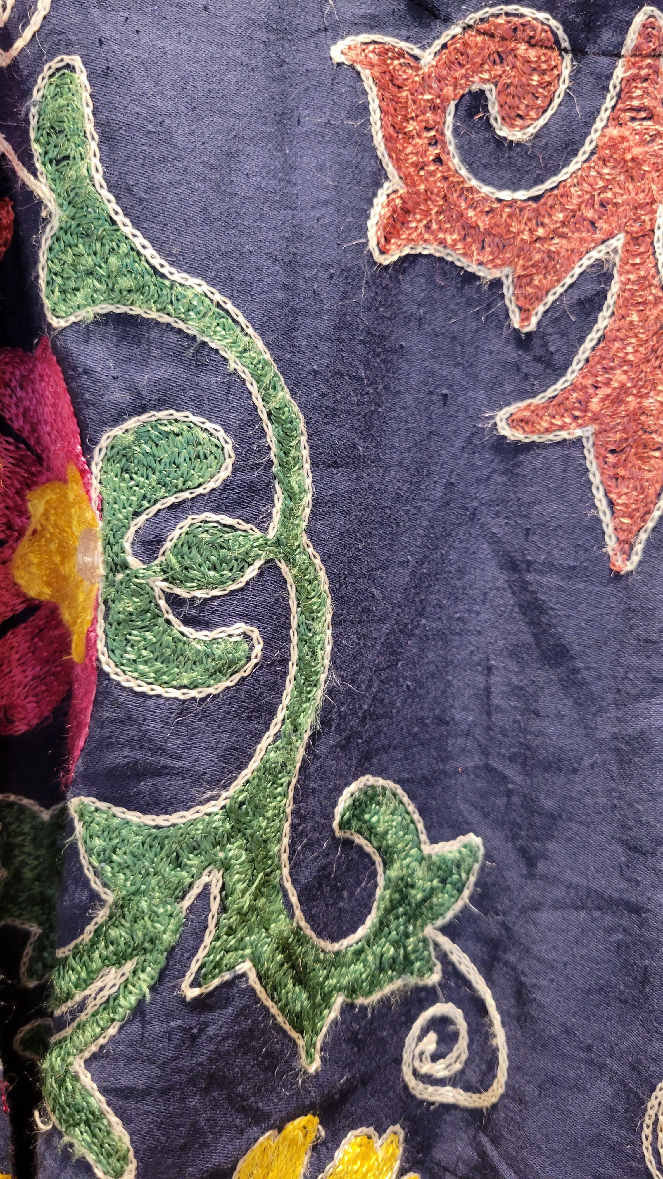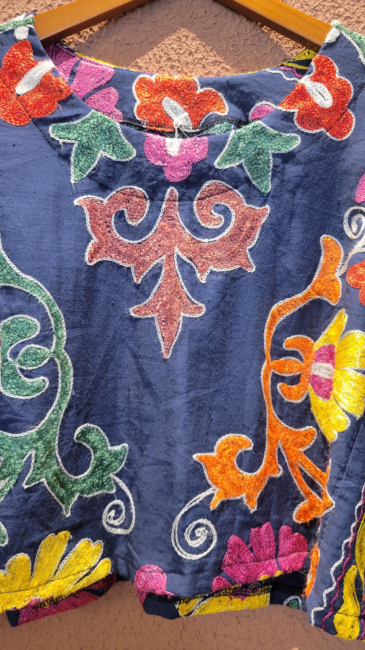 ヴィンテージのスザニ刺繍クロスを使用したリメイクプルオーバートップス。素材表記はありませんがコットンのようです。柔らかな肌触りです。ネイビーの地に鮮やかなカラーの刺繍が華やかでインパクトのある主役級トップスです。
