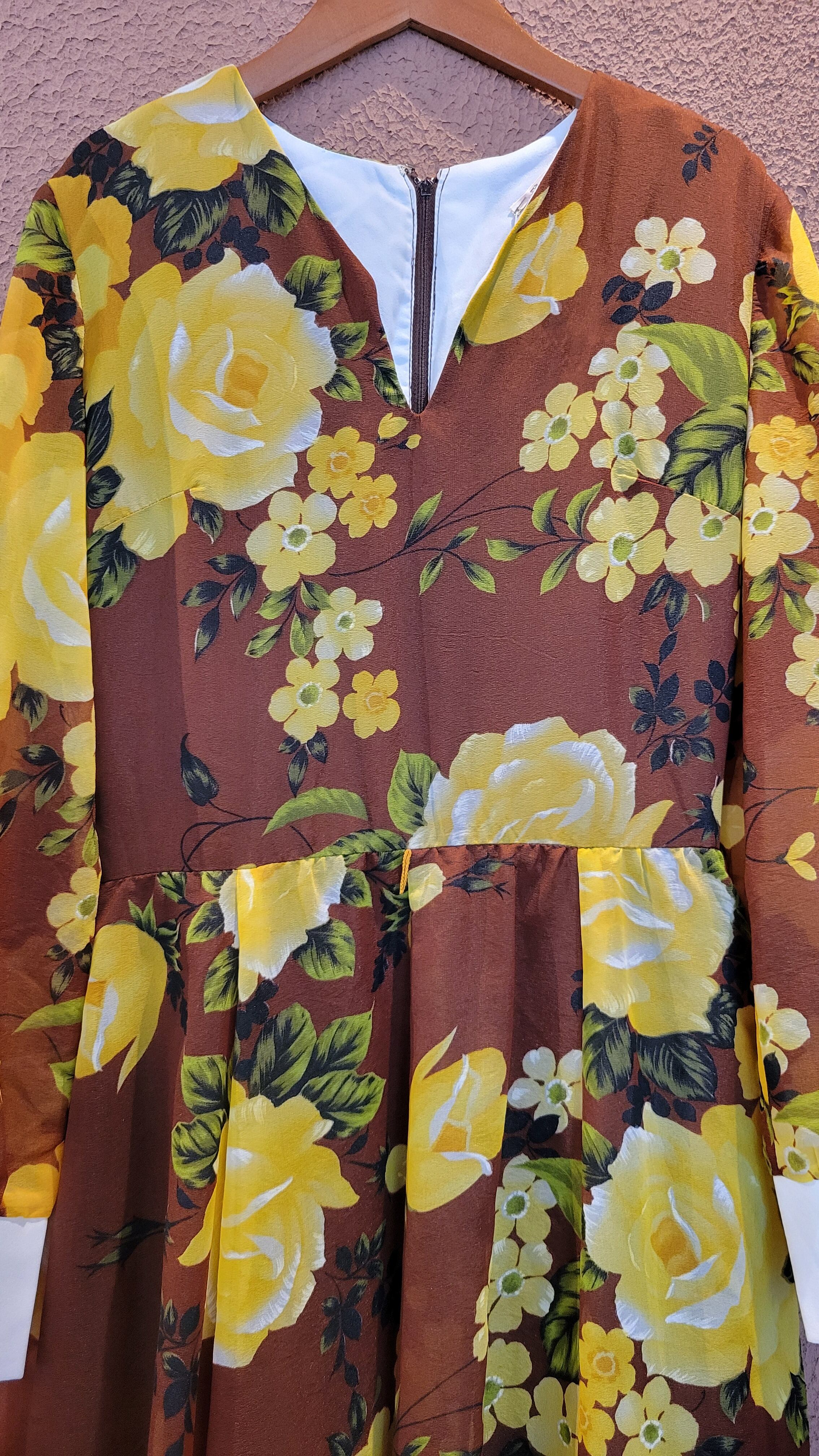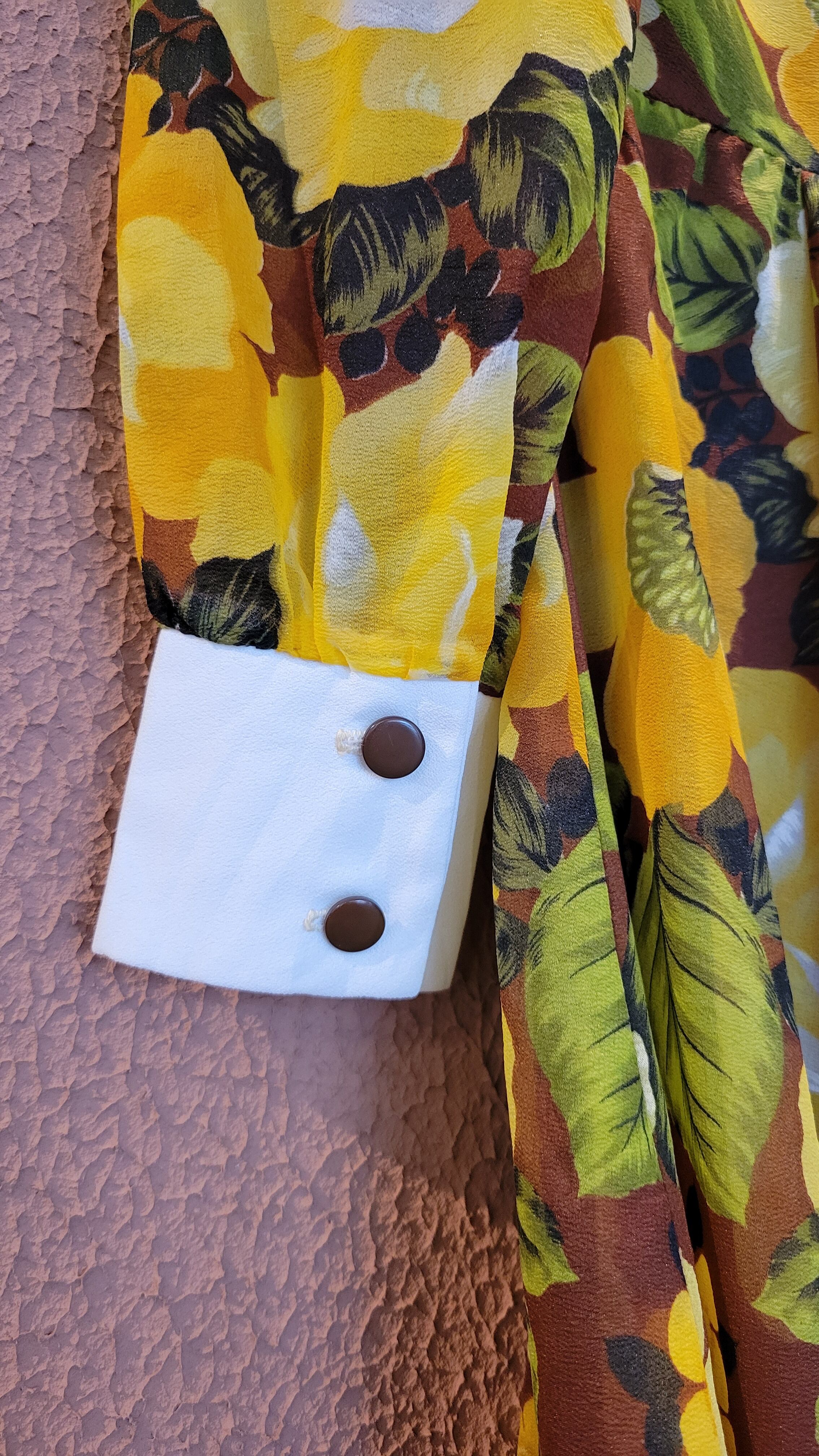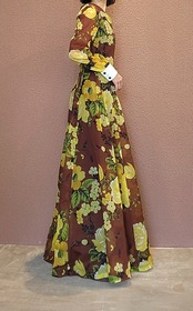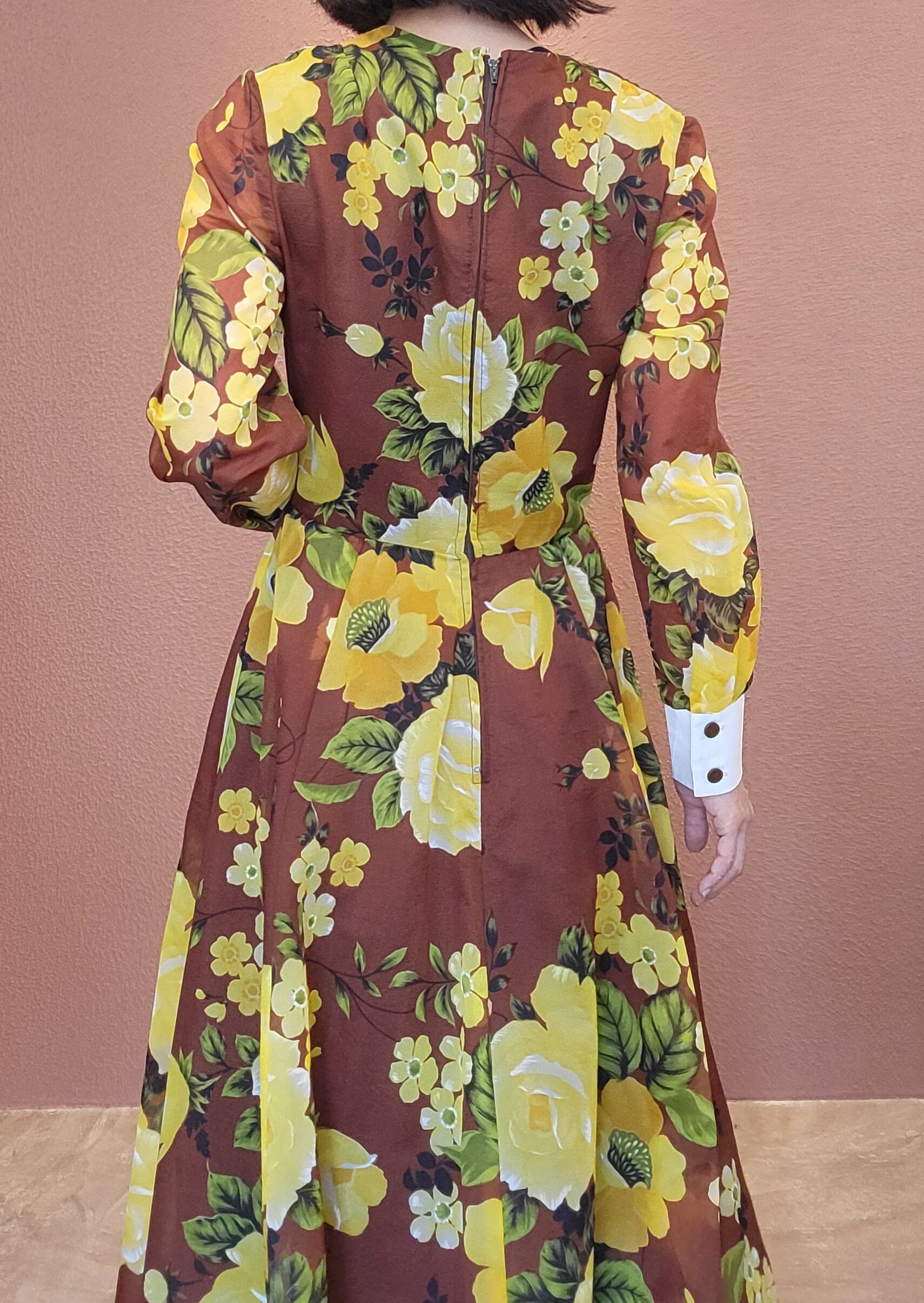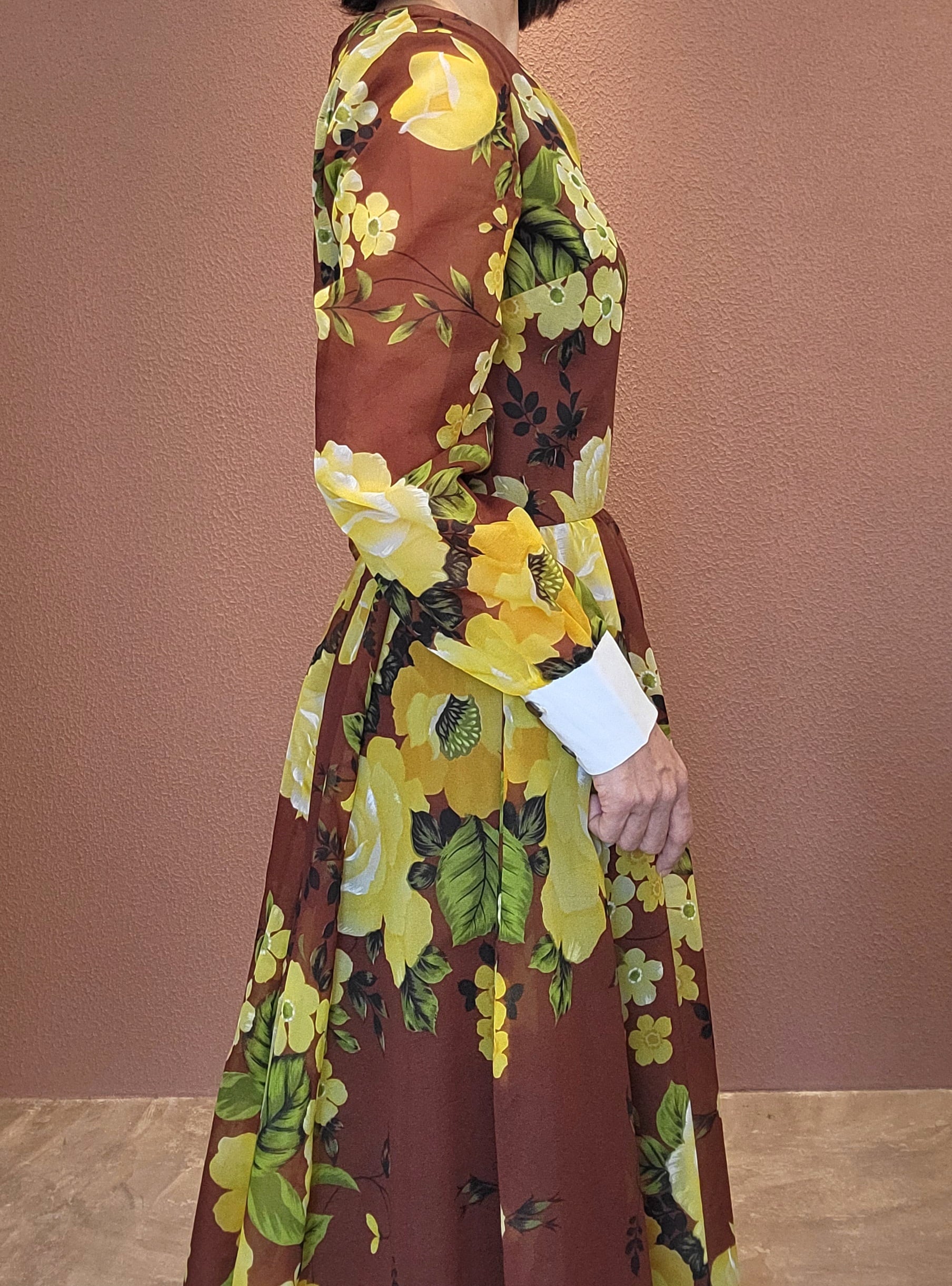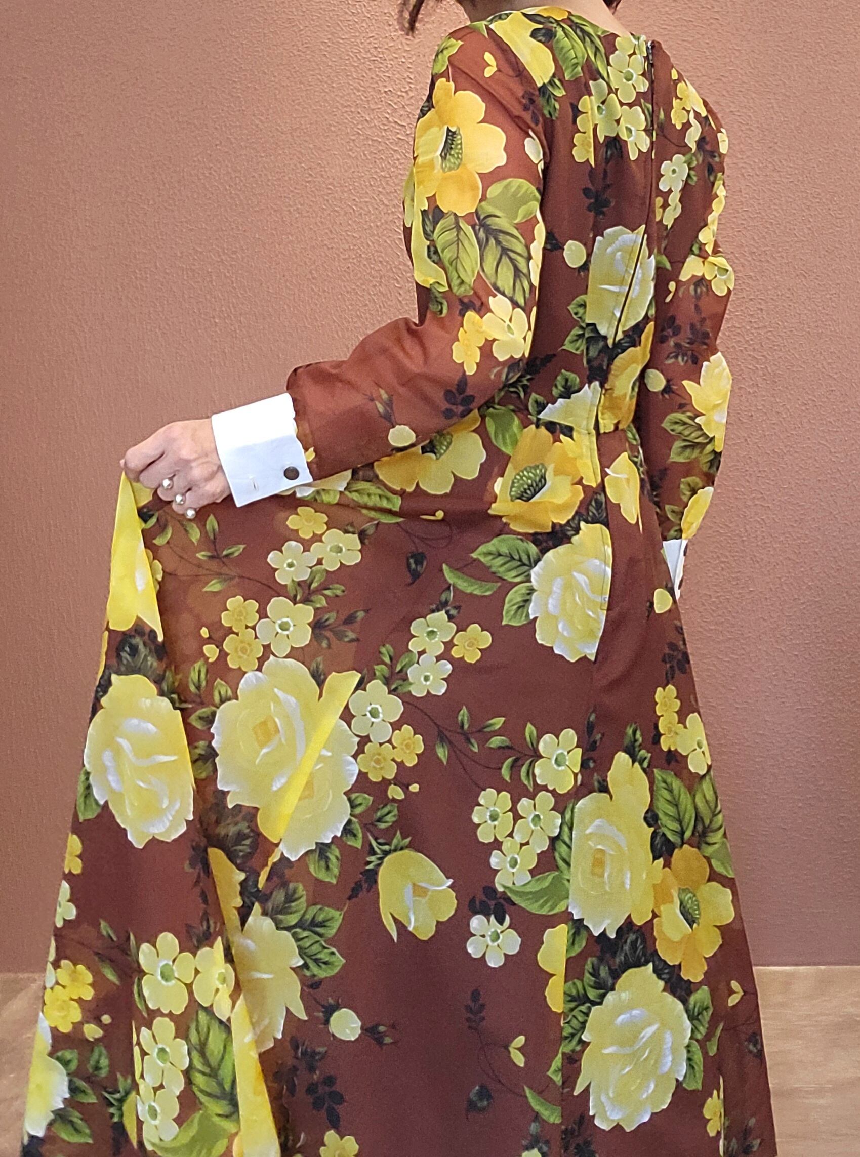 ヴィンテージフレアマキシワンピース。素材表記はありませんがポリエステルのようです。透け感のあるシアー素材で袖以外には裏地付きのため1枚で着られます。バックファスナー付き。白のカフスが良いアクセントに。着用時のフレアシルエットがとても美しいワンピースです。