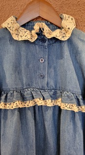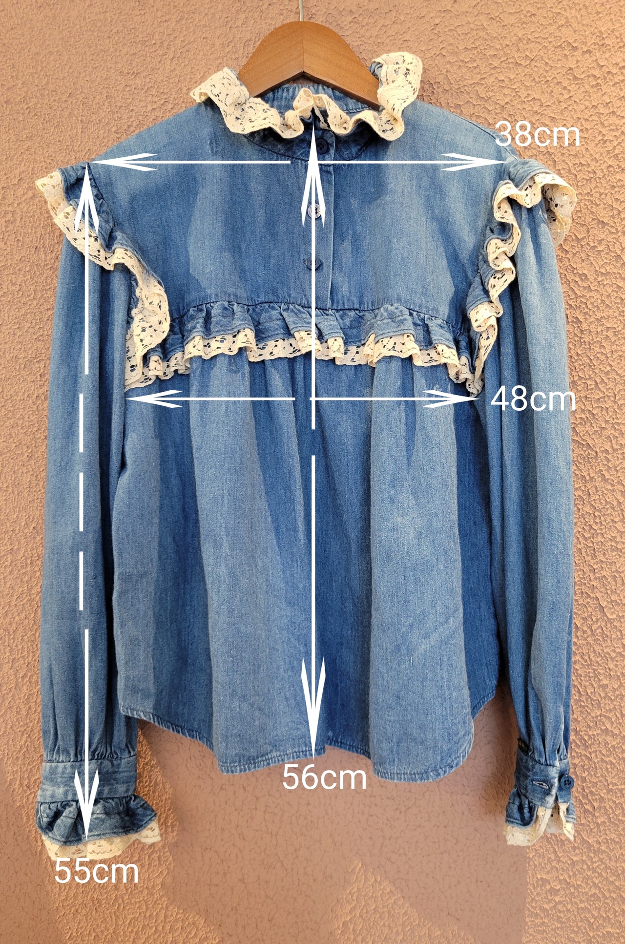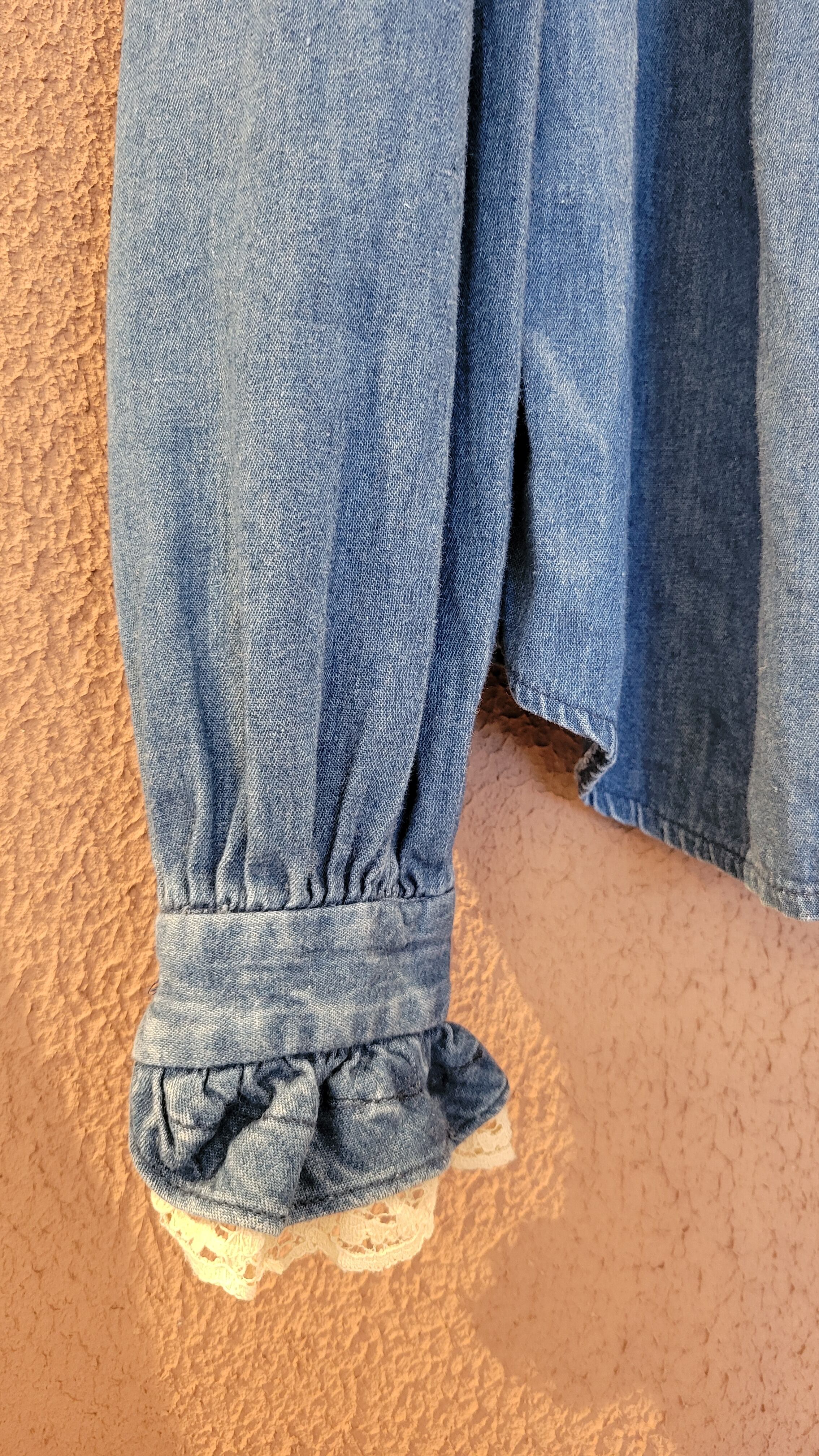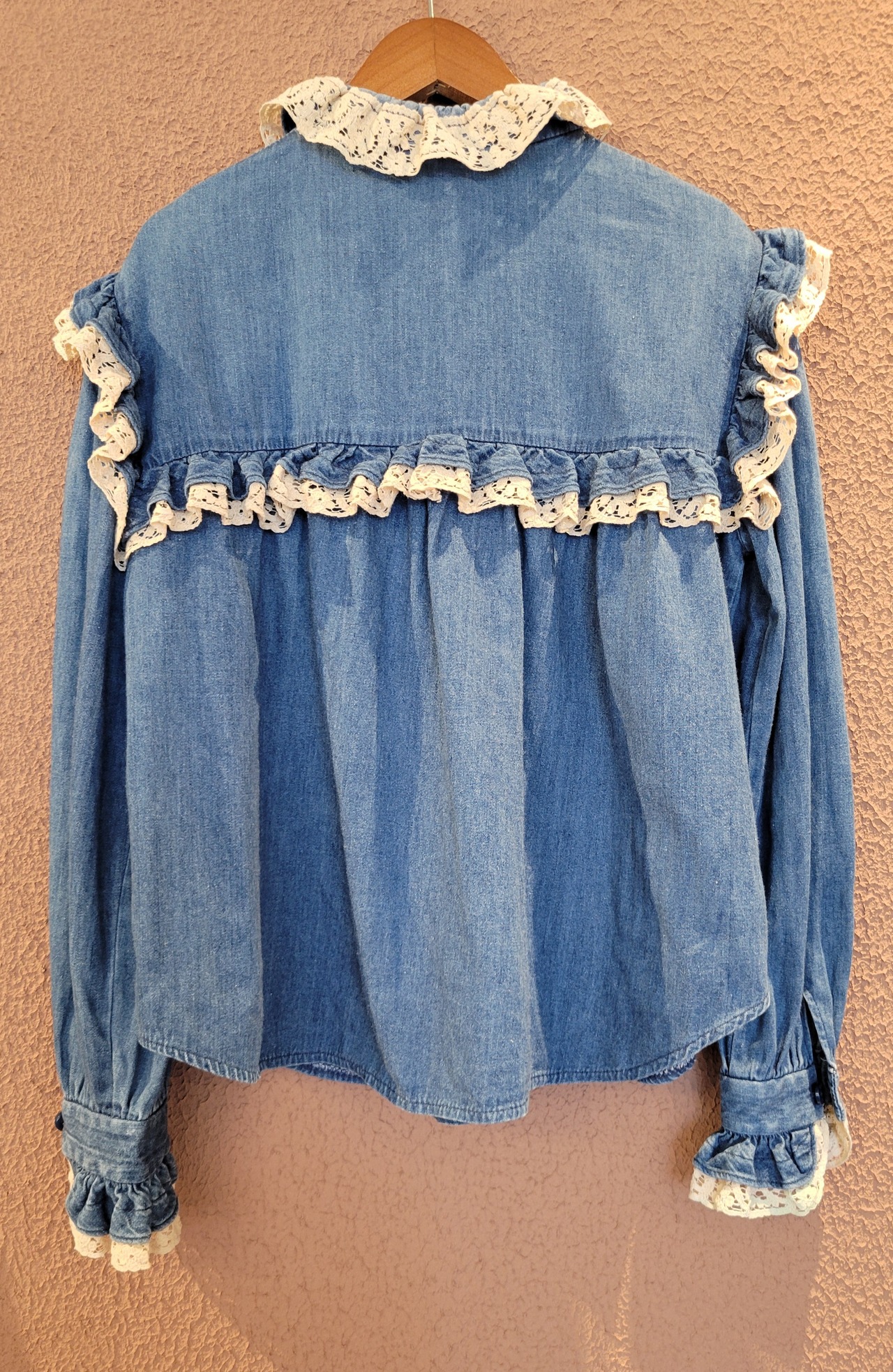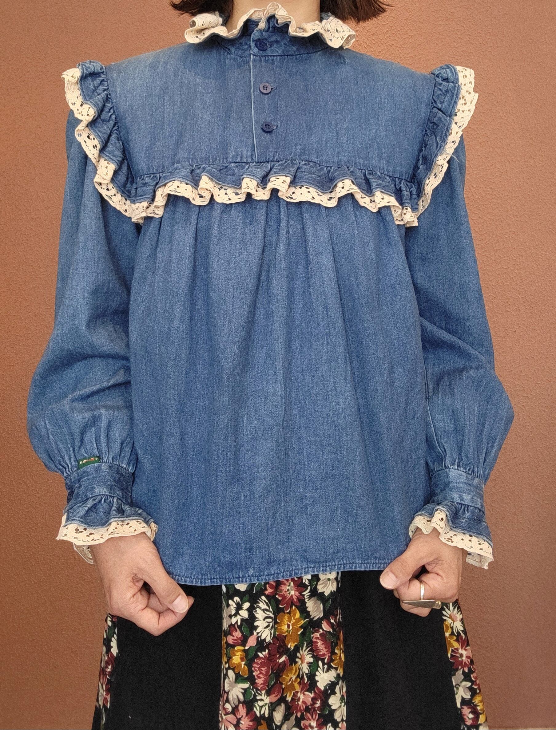 USAヴィンテージ "BIS BIS" デニムプルオーバートップス。フリルレースとデニムの相性が良く、フォークロアやウエスタンスタイルにもぴったりです。ブランドのオリジナルボタンも嬉しいポイント。