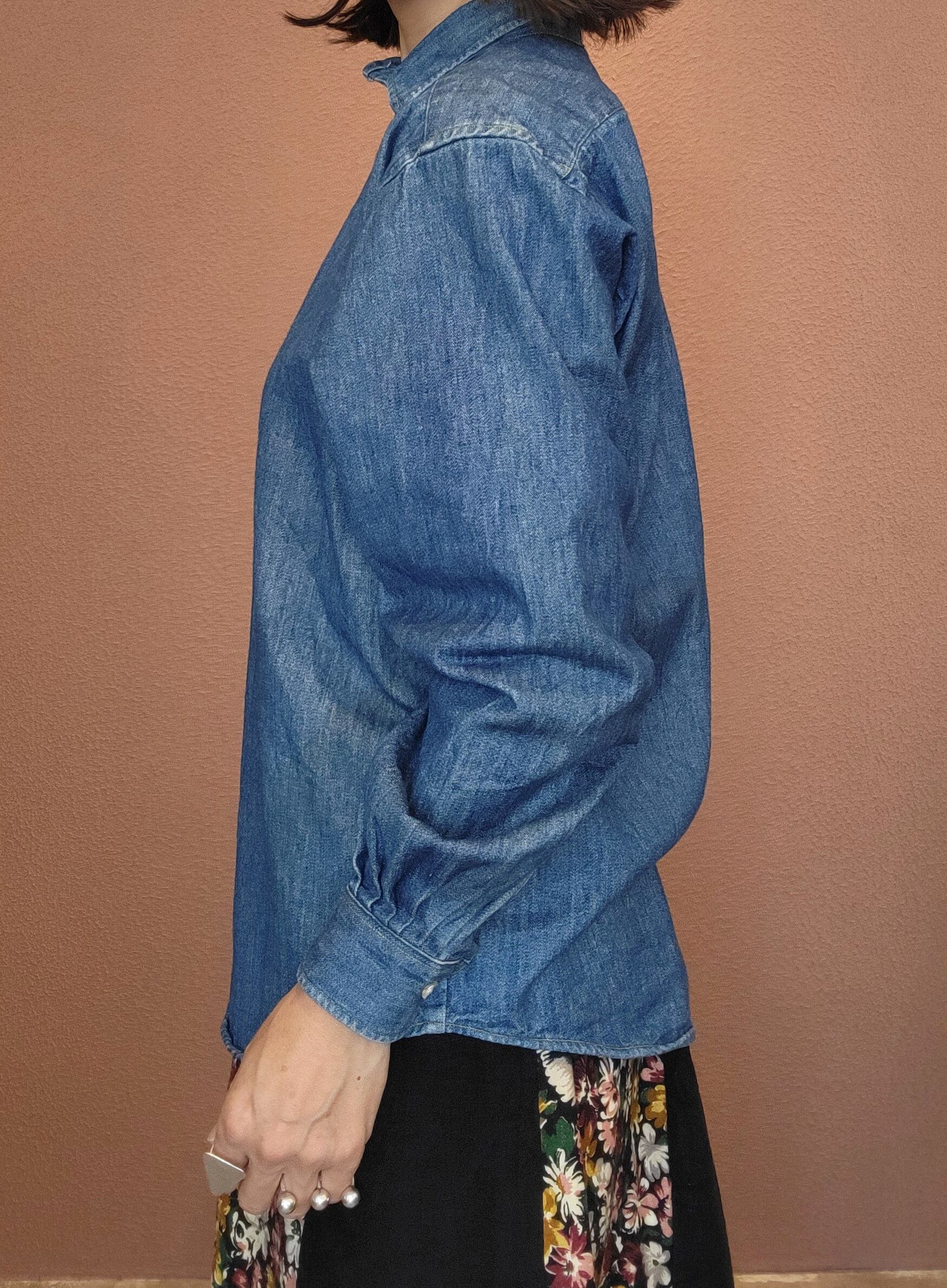 Made in USA used デニムプルオーバートップス。やや張り感のあるしっかりしたデニム素材です。どんなボトムにも良く合う万能なトップスです。斜めに配置されたボタンが目をひきます。