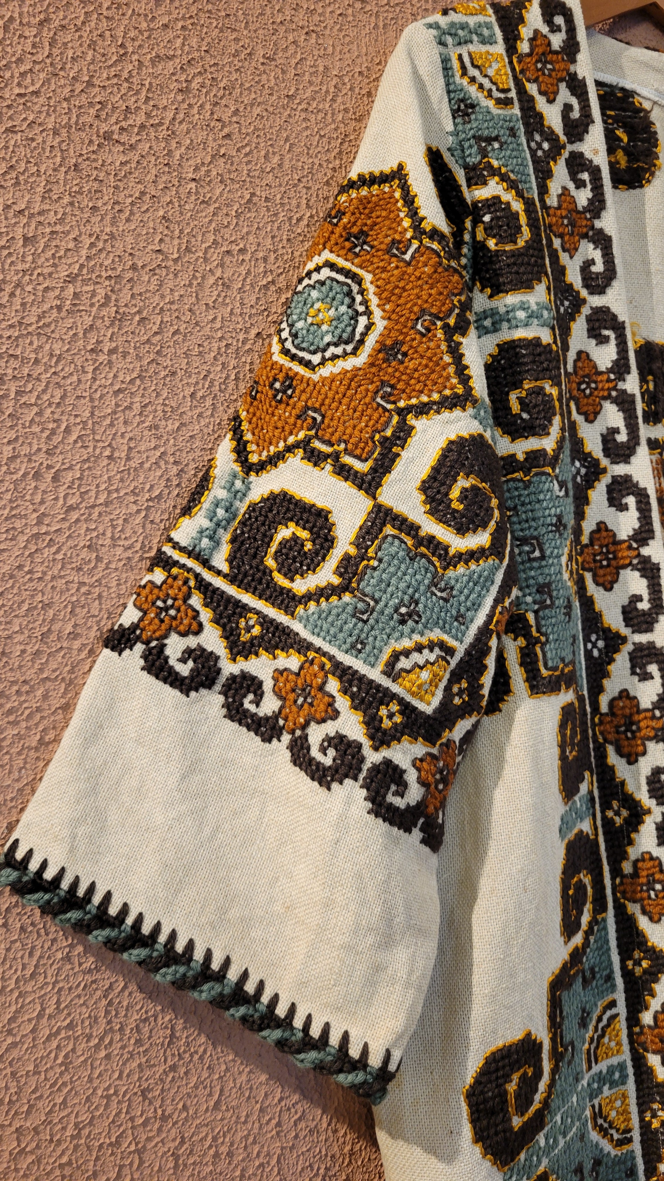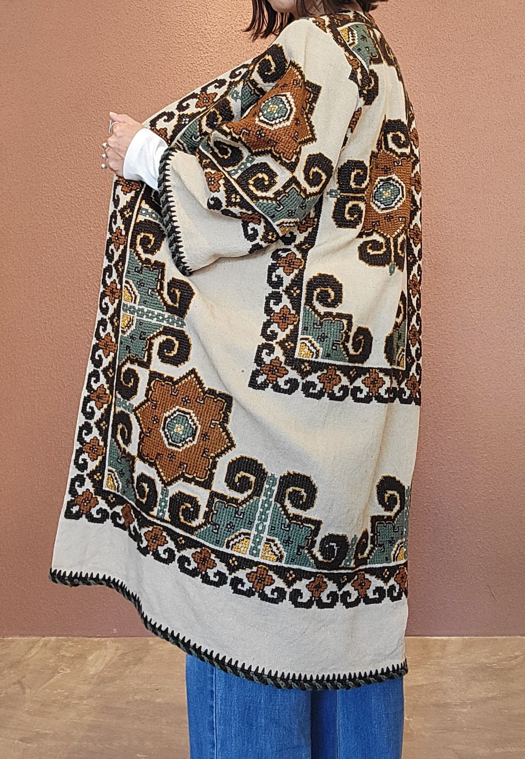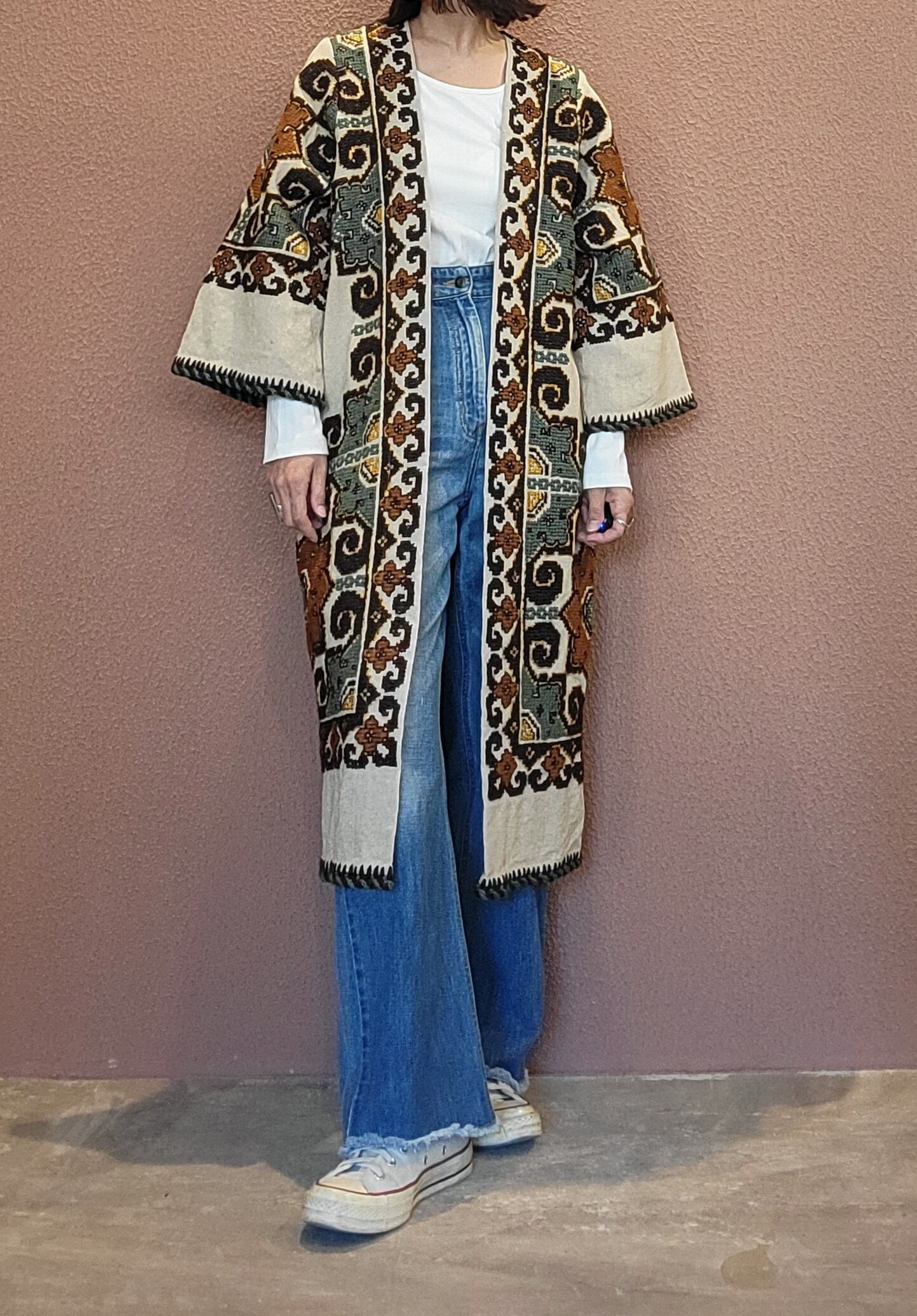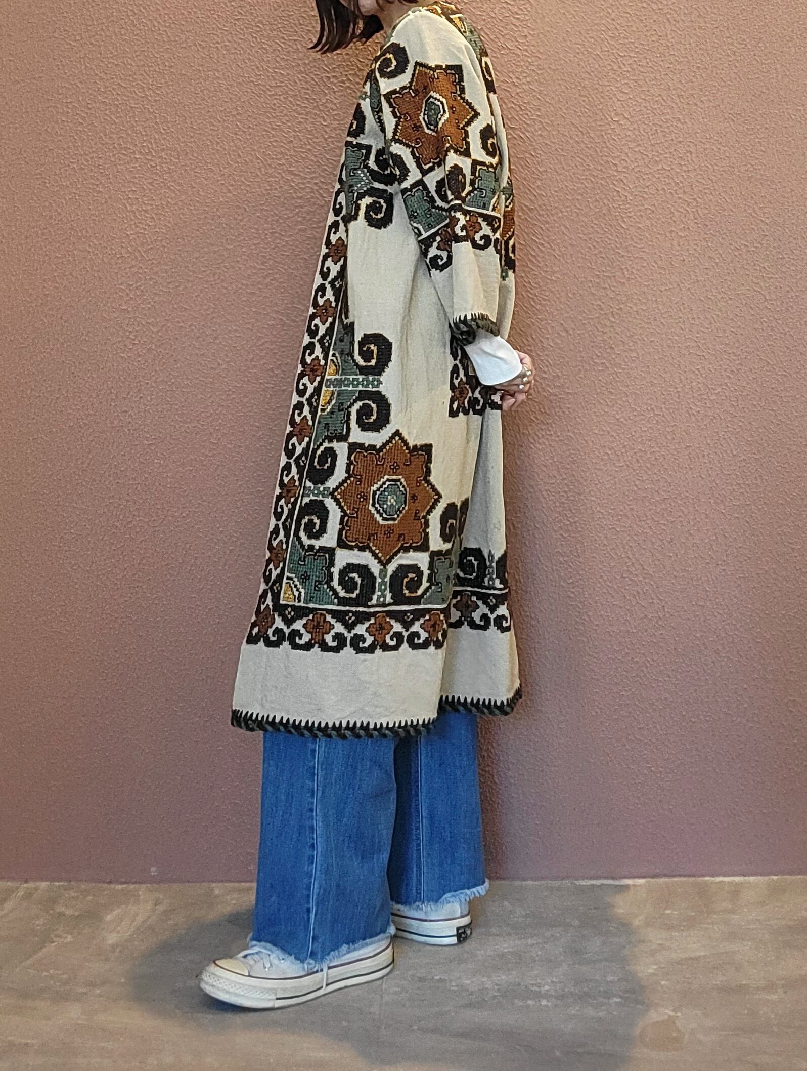 ヴィンテージの刺繍クロスを贅沢に使用したリメイクガウン。素材表記はありませんがリネンのようです。びっしり施された手刺繍によりやや重量感があります。ざっくりとした深みのある風合いはヴィンテージならでは。存在感がありながもこっくり落ち着いた色合いで着やすい1枚です。
