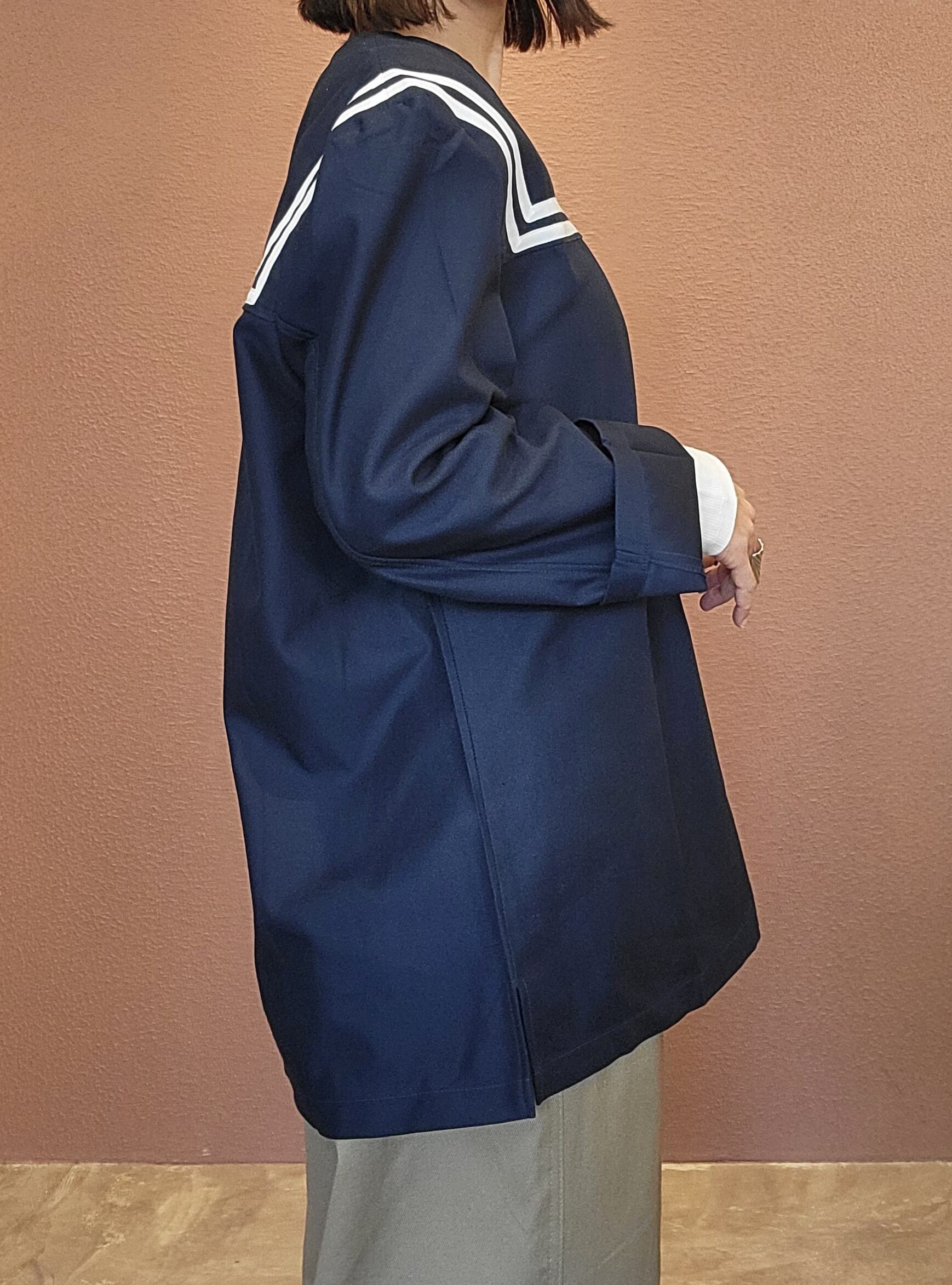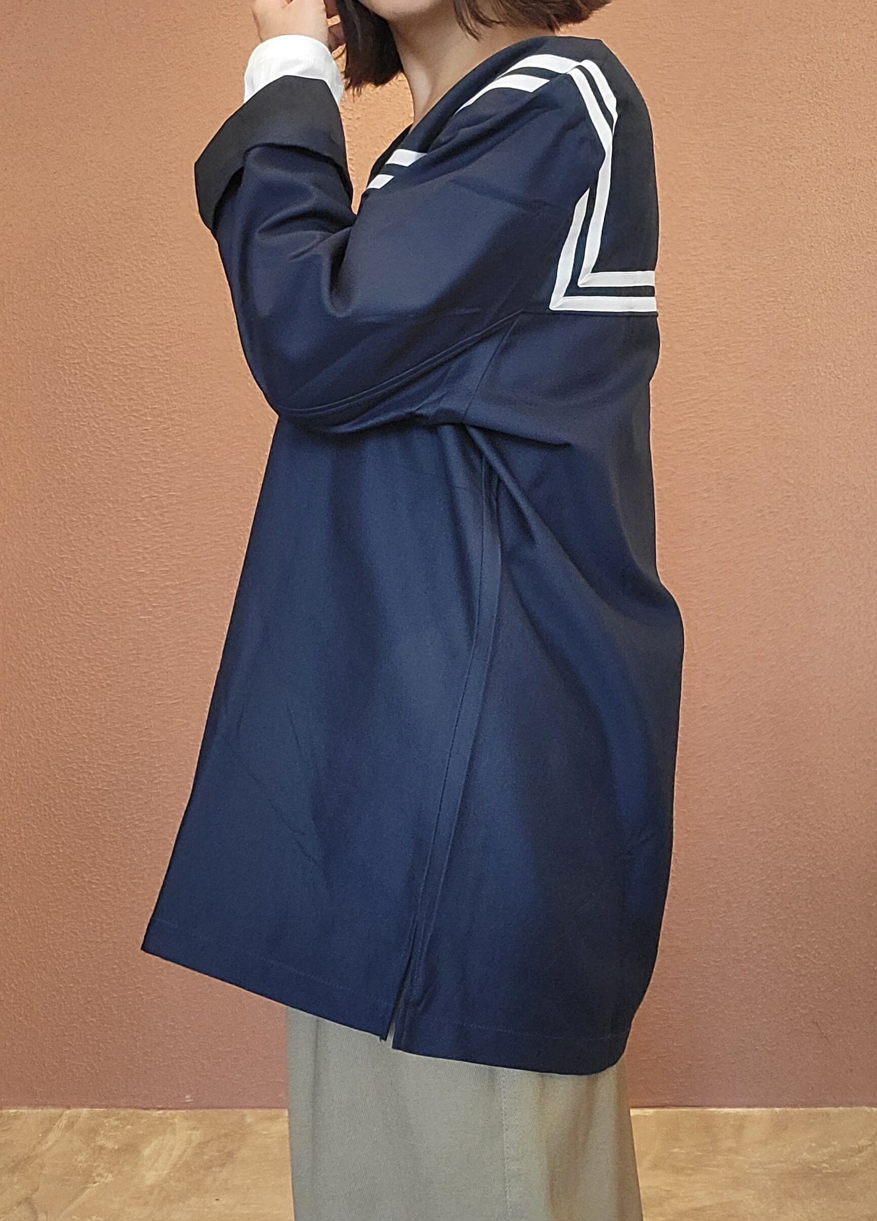 デッドストック(未使用)のミリタリーセイラートップス。素材はコットンとポリエステルの混紡です。襟無しのVネックトップスでTシャツ感覚でシーズン長く着用できます。ゆったりオーバーサイズでほどよい抜け感があり、幅広いスタイリングでお楽しみいただけます。*こちらは未使用品ですが、胸元中央辺りに白っぽく色ムラのような箇所があります。画像にてご確認ください。