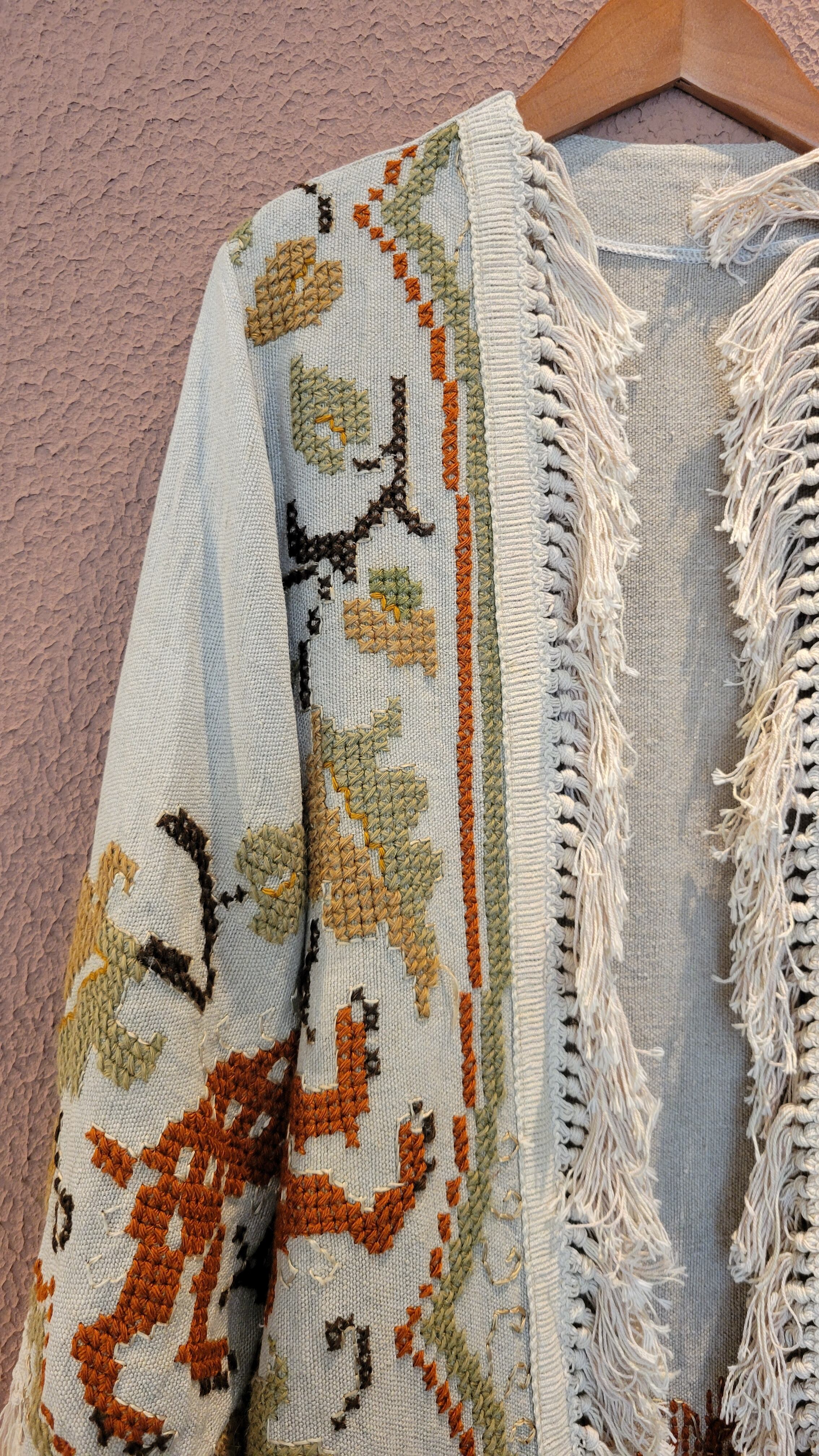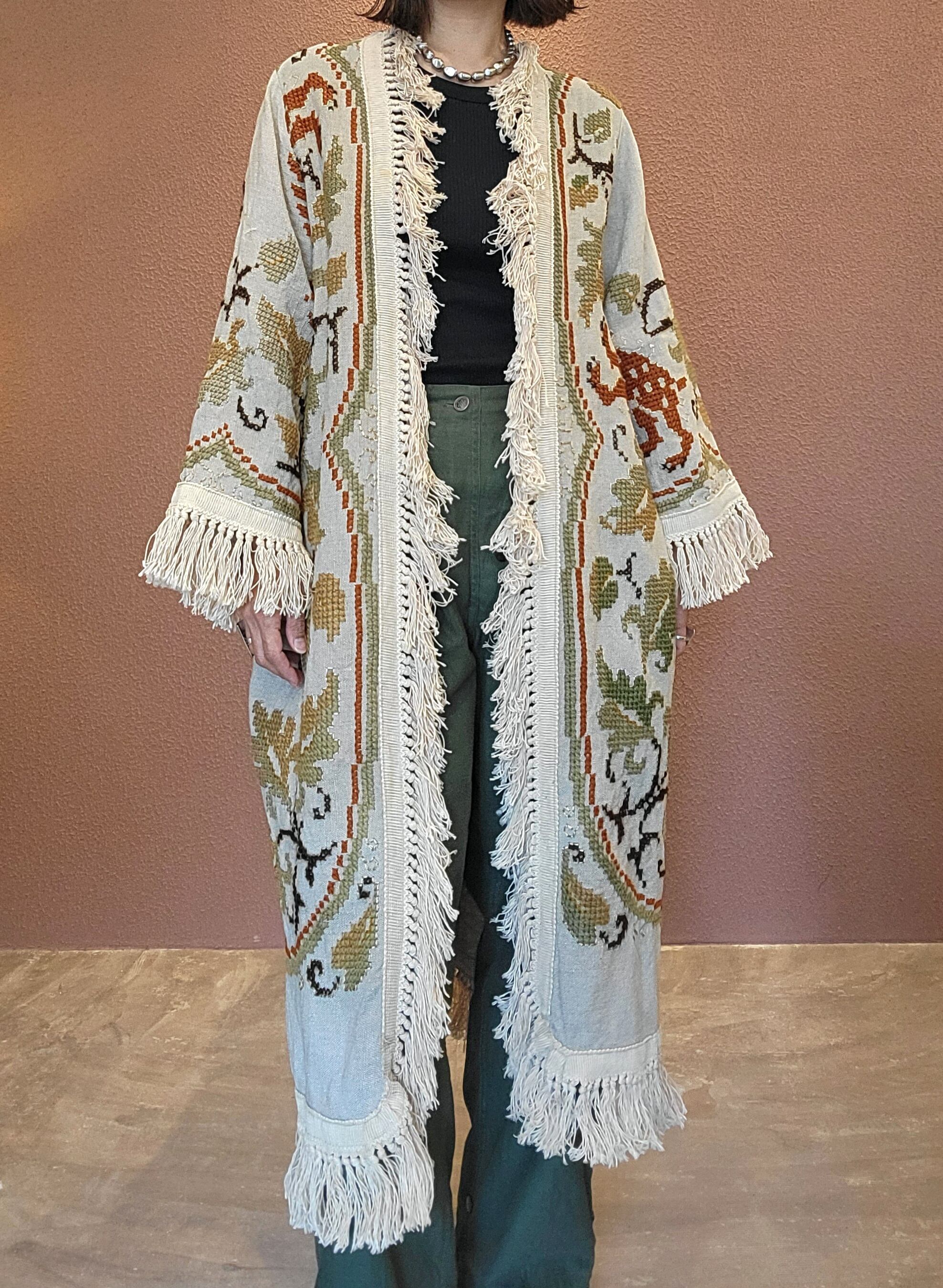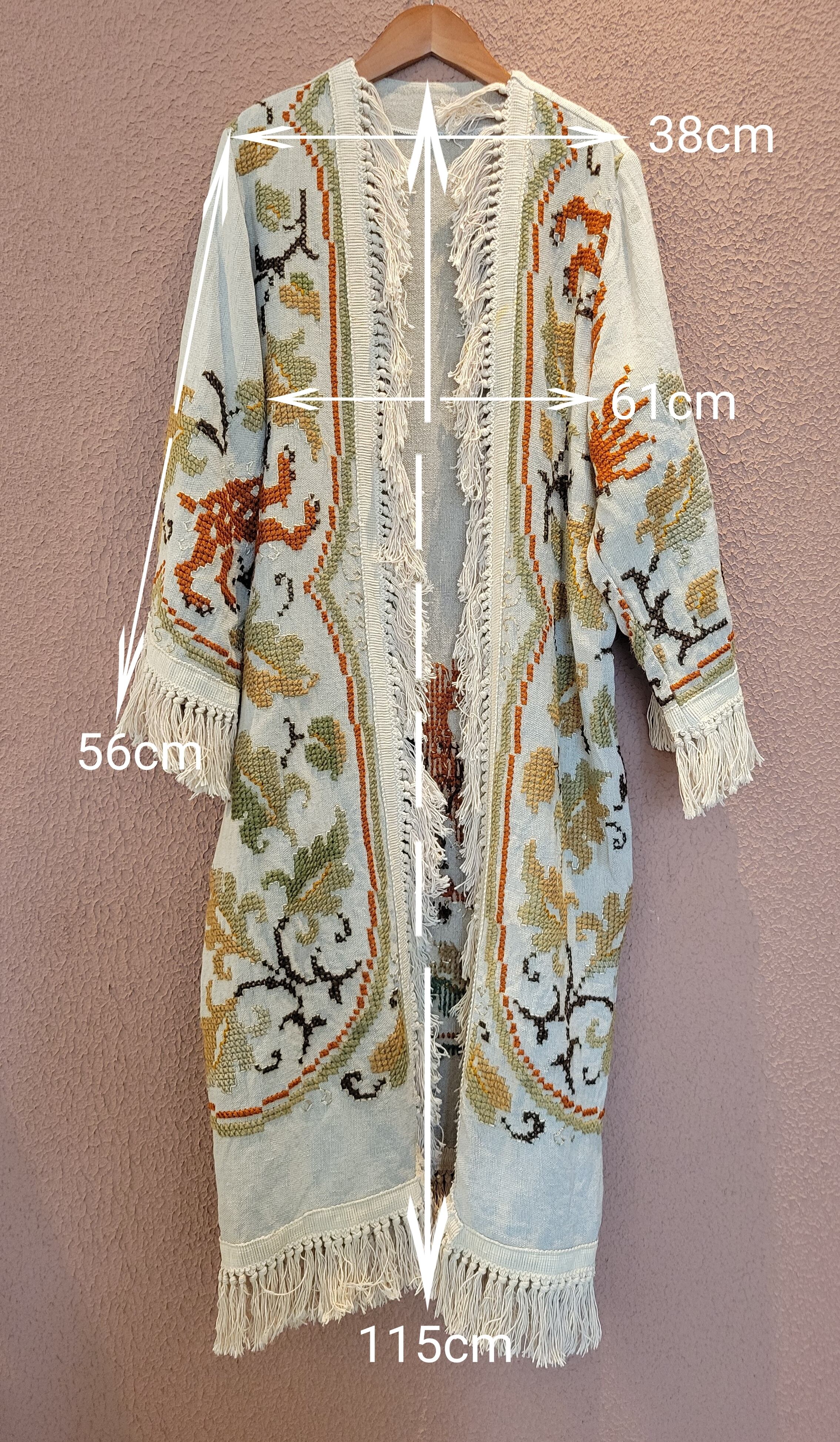 ヴィンテージの刺繍クロスを贅沢に使用したリメイクガウン。素材表記はありませんがリネンのようです。びっしり施された手刺繍のためやや重量感があります。ざっくりとした深みのある風合いはヴィンテージならでは。存在感がありながも落ち着いた色合いで着やすい1枚です。*左胸あたりに1cmほどのシミがあります。画像でご確認ください。