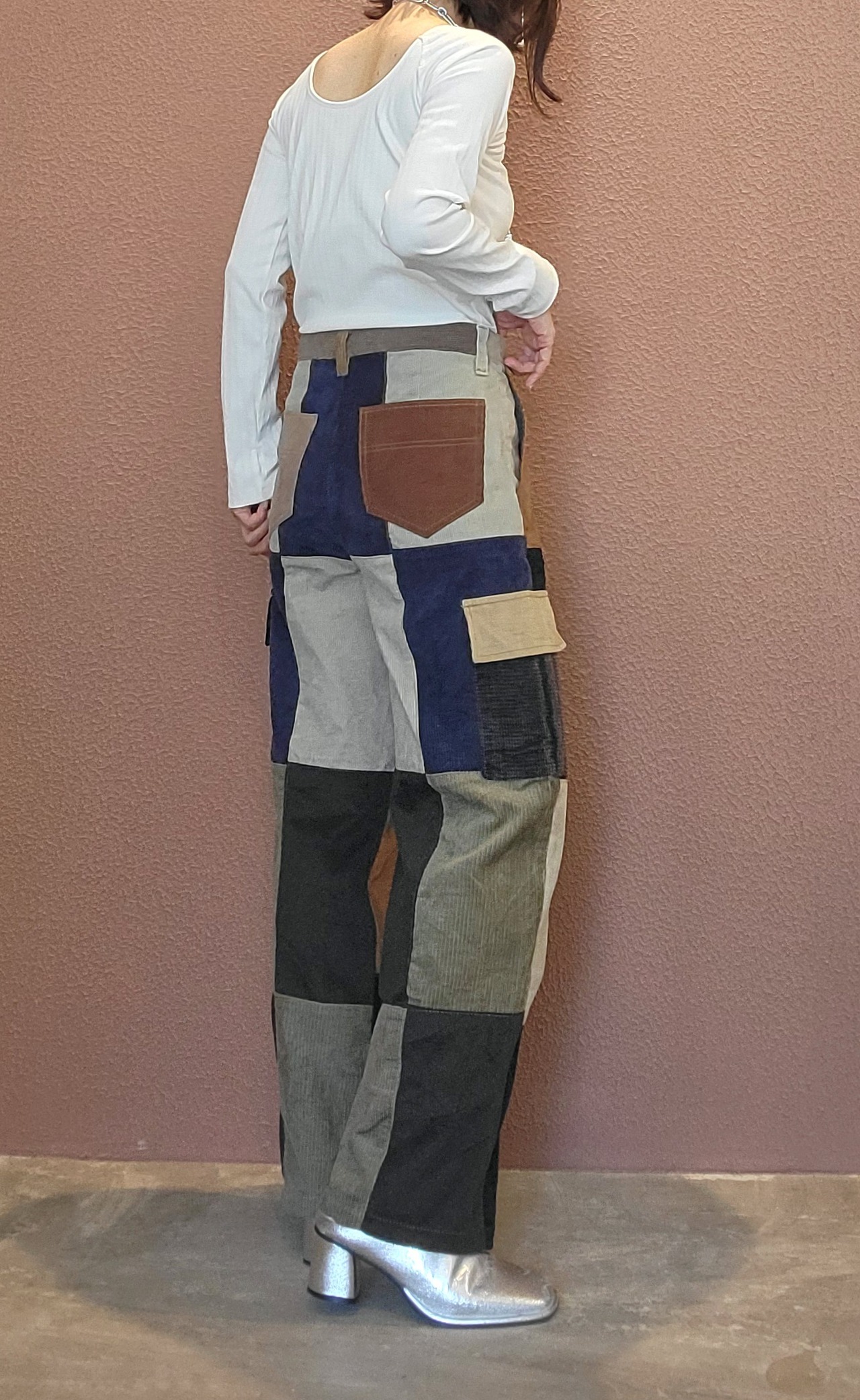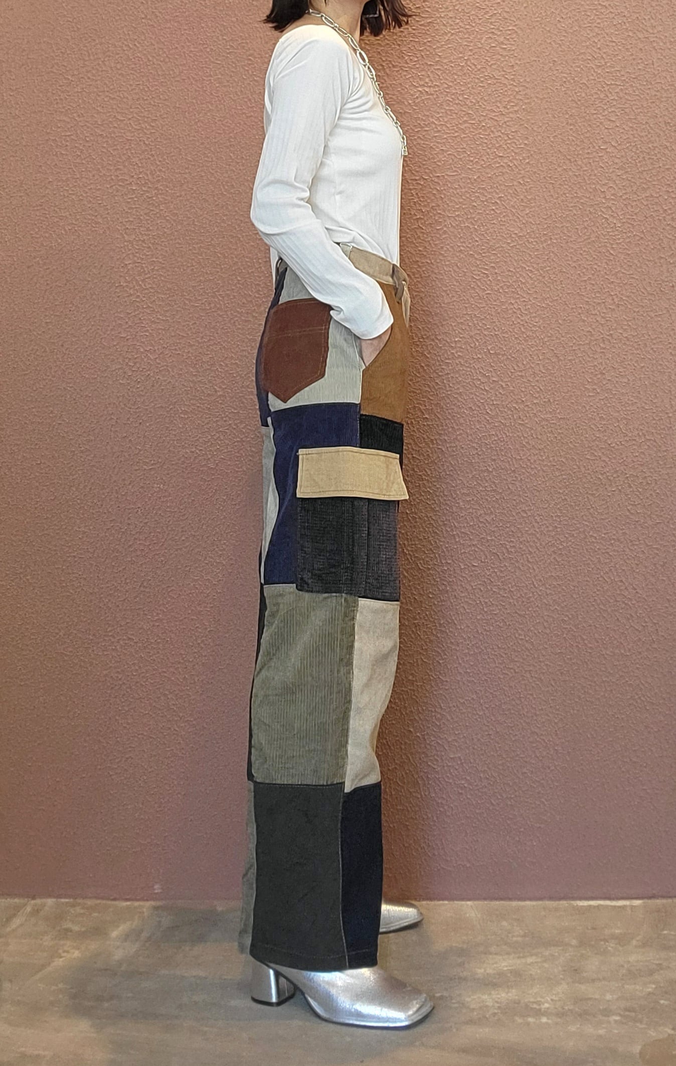 古着のコーデュロイ生地を裁断しいくつもの布片を縫い合わせたリメイクカーゴパンツ。素材表記はありませんがコットンのようです。シンプルなトップスに合わせるだけで可愛く仕上がります。スニーカー等フラットシューズにも合わせやすい丈感。
