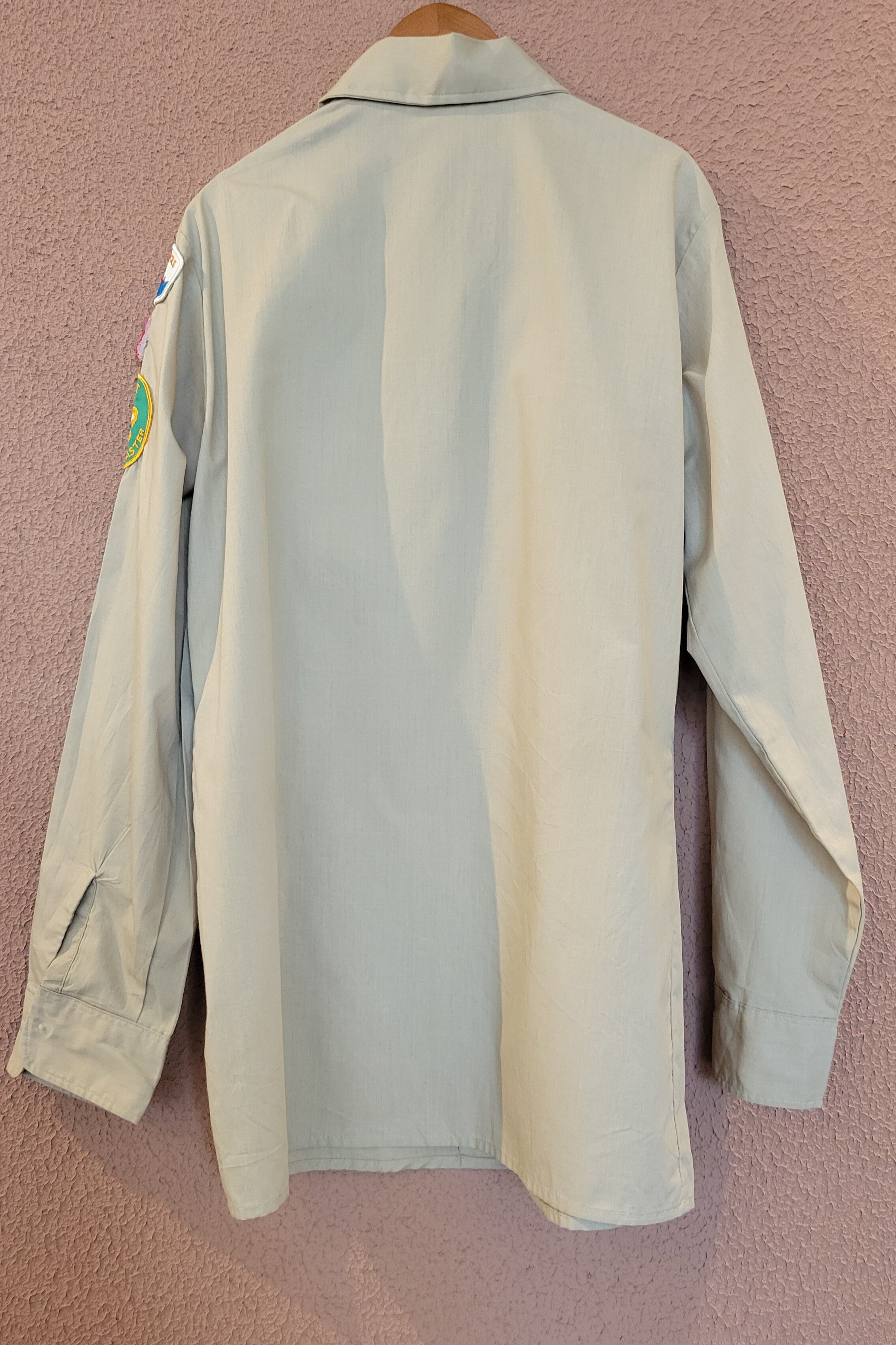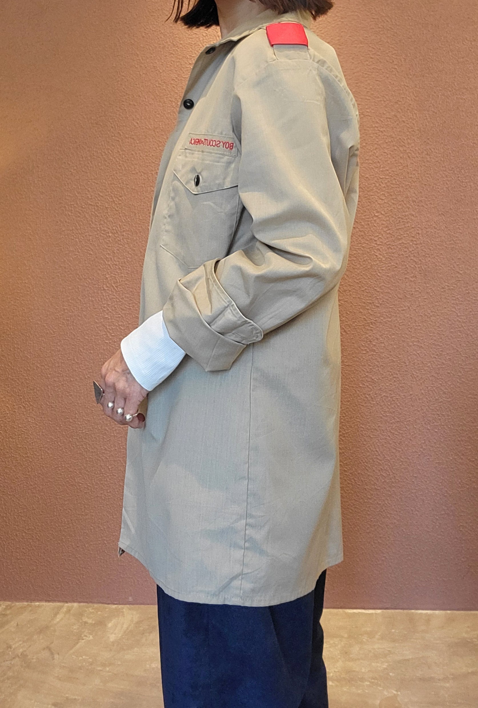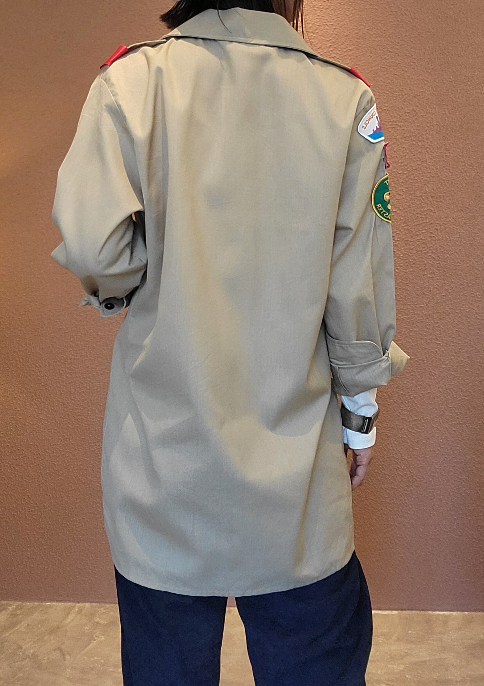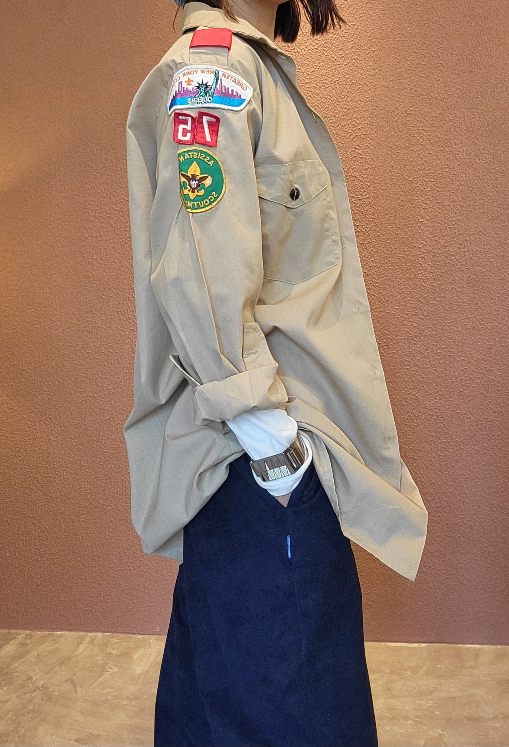 UsedのUSA ボーイスカウトシャツ。素材はポリエステルとコットンの混紡素材です。表記サイズ メンズMです。ワッペン多めでカジュアルなスタイリングにぴったり。さらりとした素材でボタンを開けて羽織りとしても。