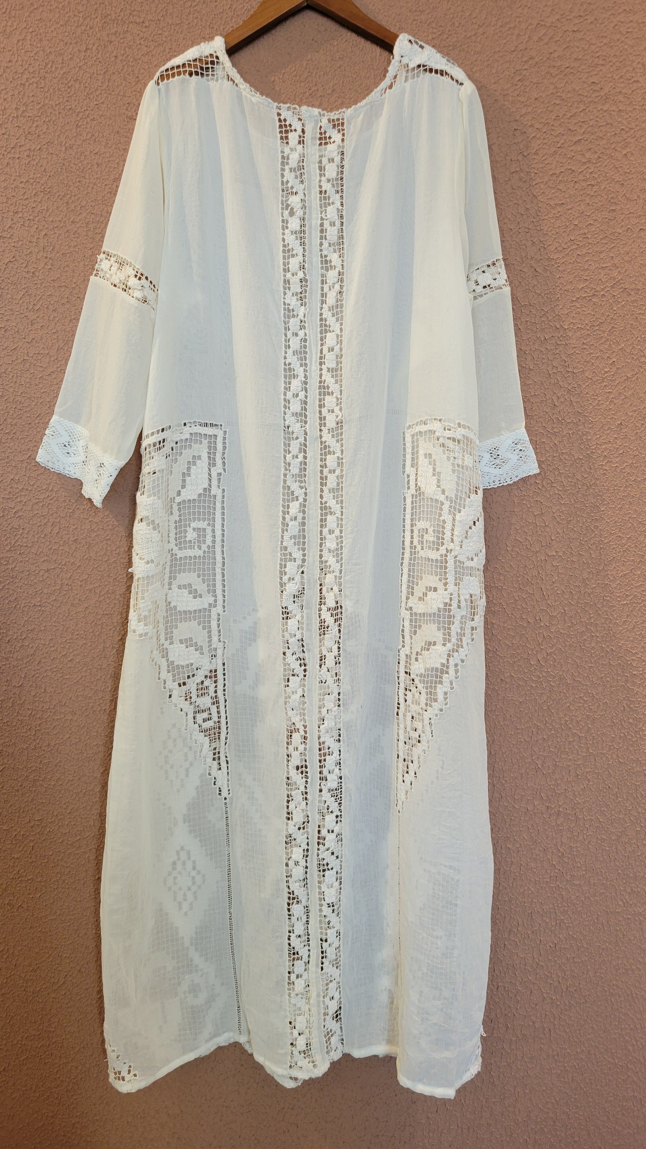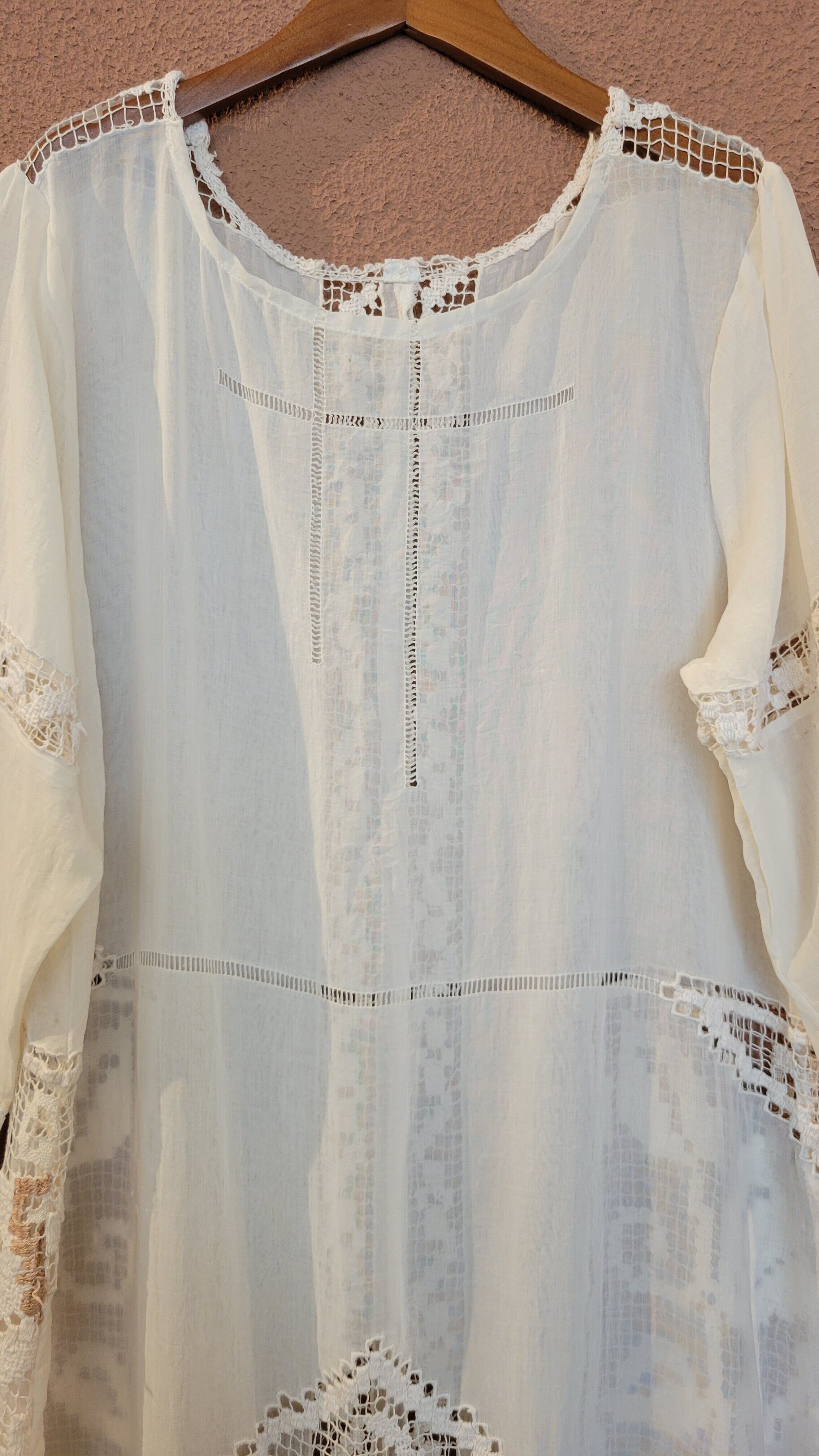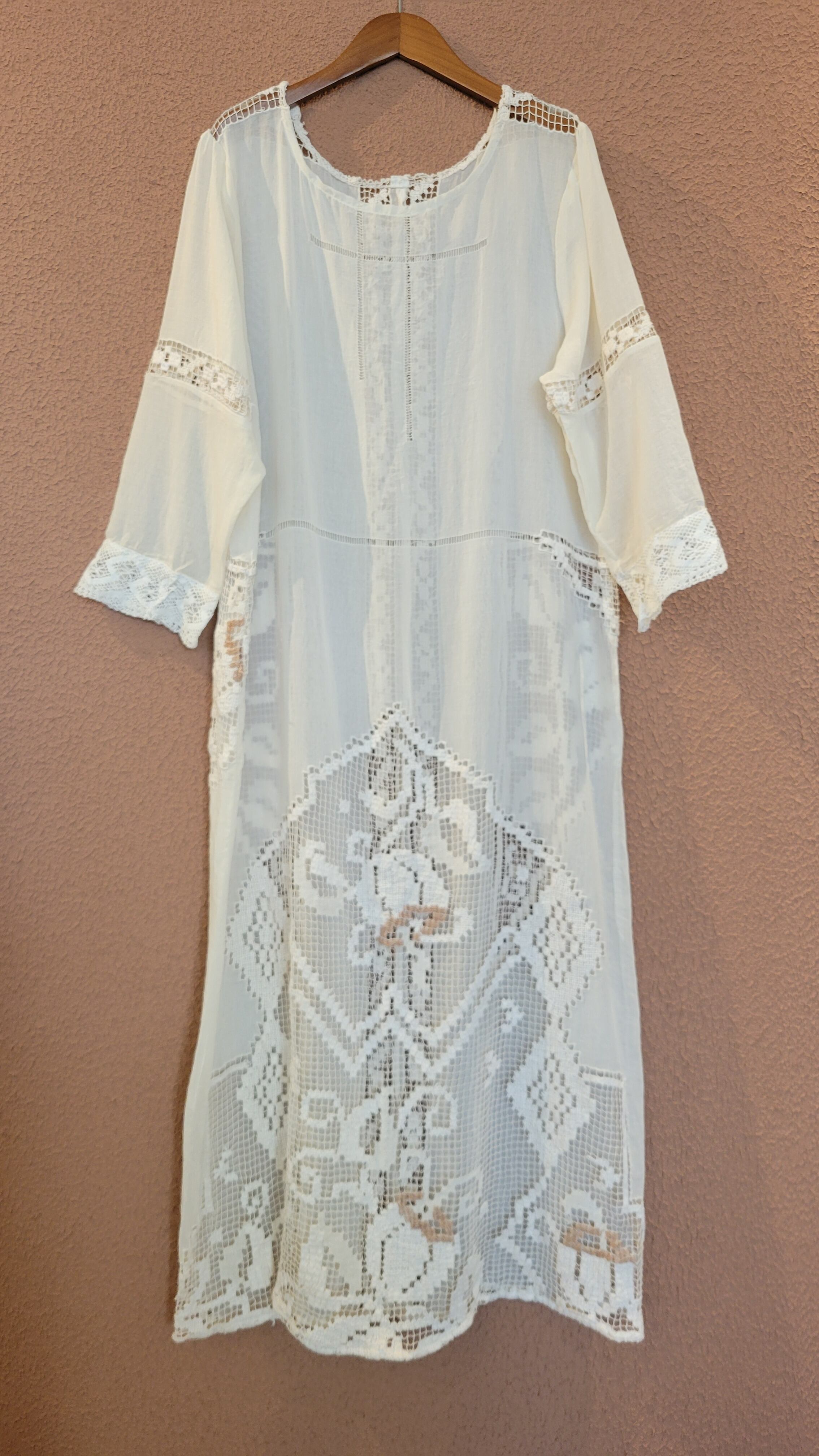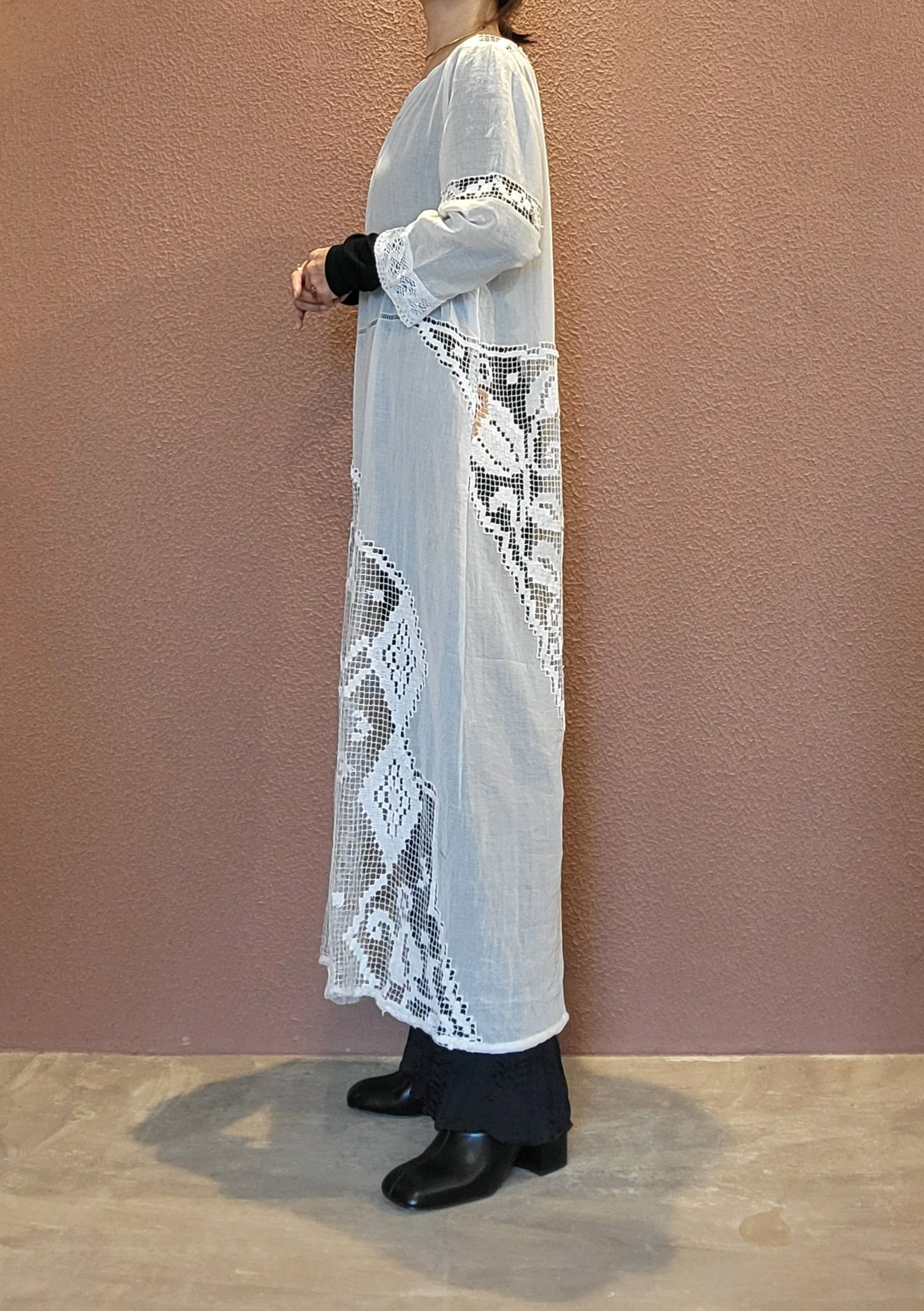 フランスのアンティークレースを使用したリメイクワンピース。素材表記はありませんが薄手のコットンのようです。非常に繊細な素材で透け感があります。合わせるインナーの色とのコントラストによってフィレレースの柄が浮き出る、大変雰囲気のある1枚です。画像でご確認ください。薄い小さなシミが数ヶ所あります。着用に支障のあるものではありませんがごちらはアンティーク、ヴィンテージに慣れている方、ご理解のある方へおすすめいたします。