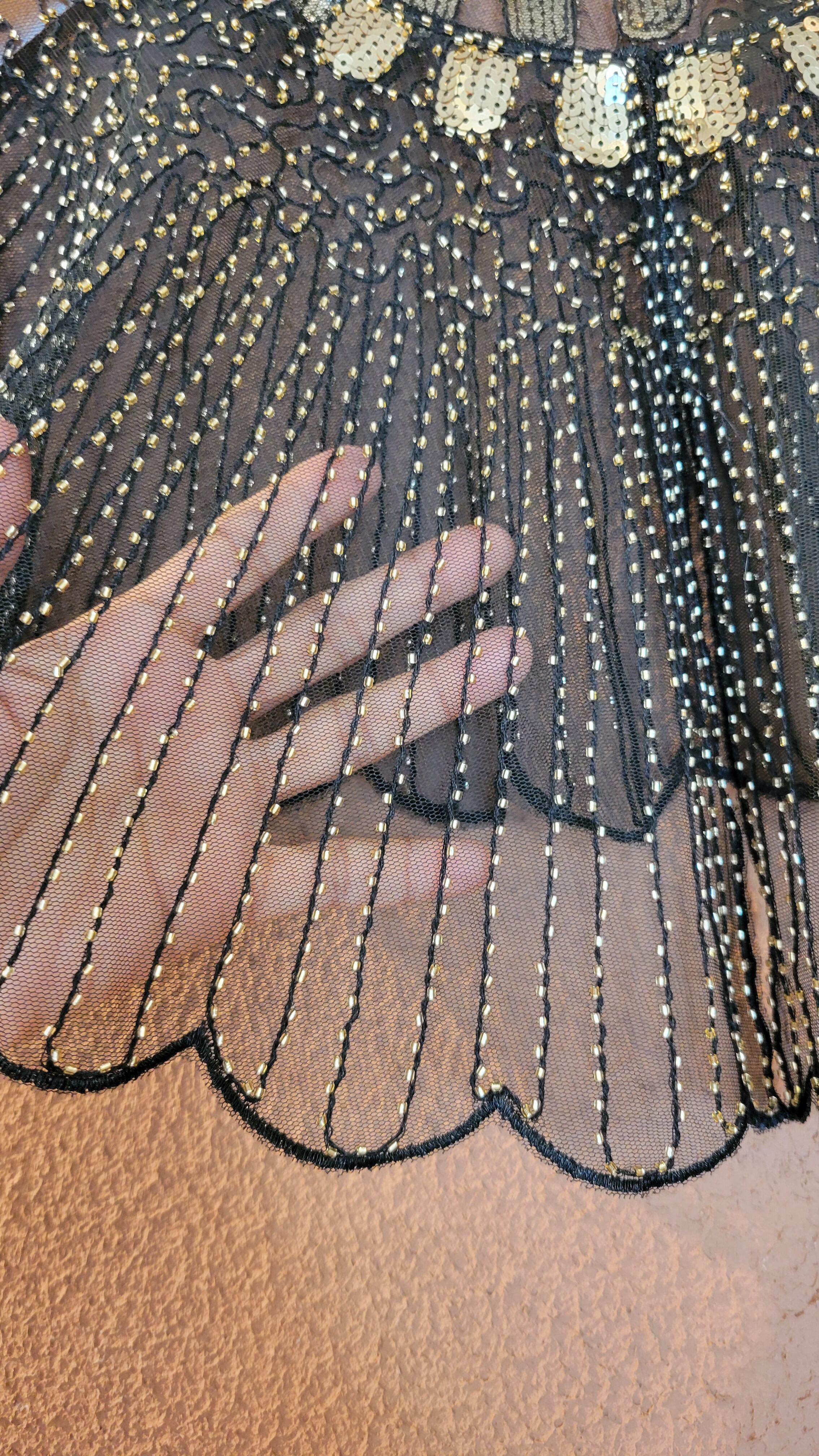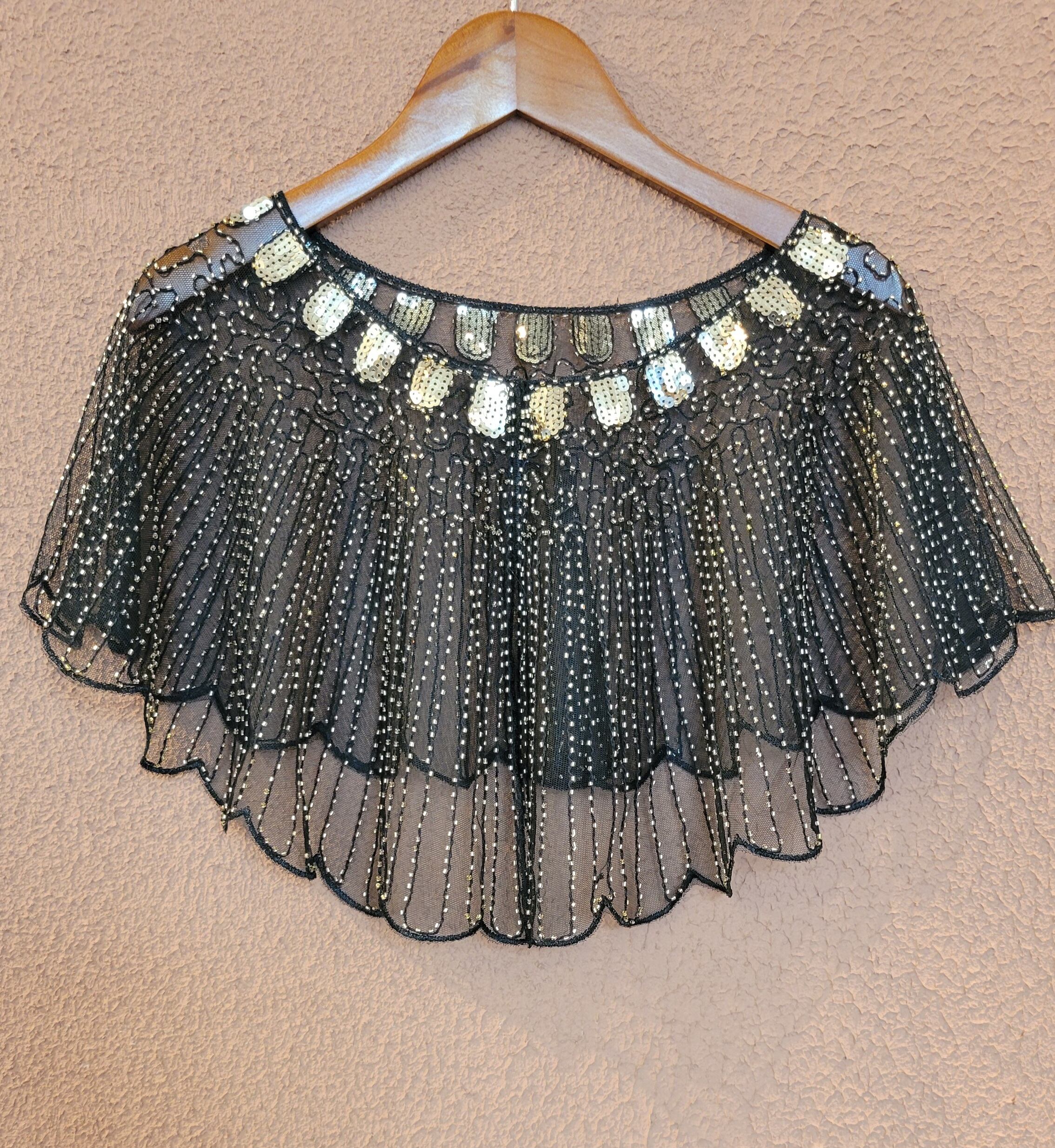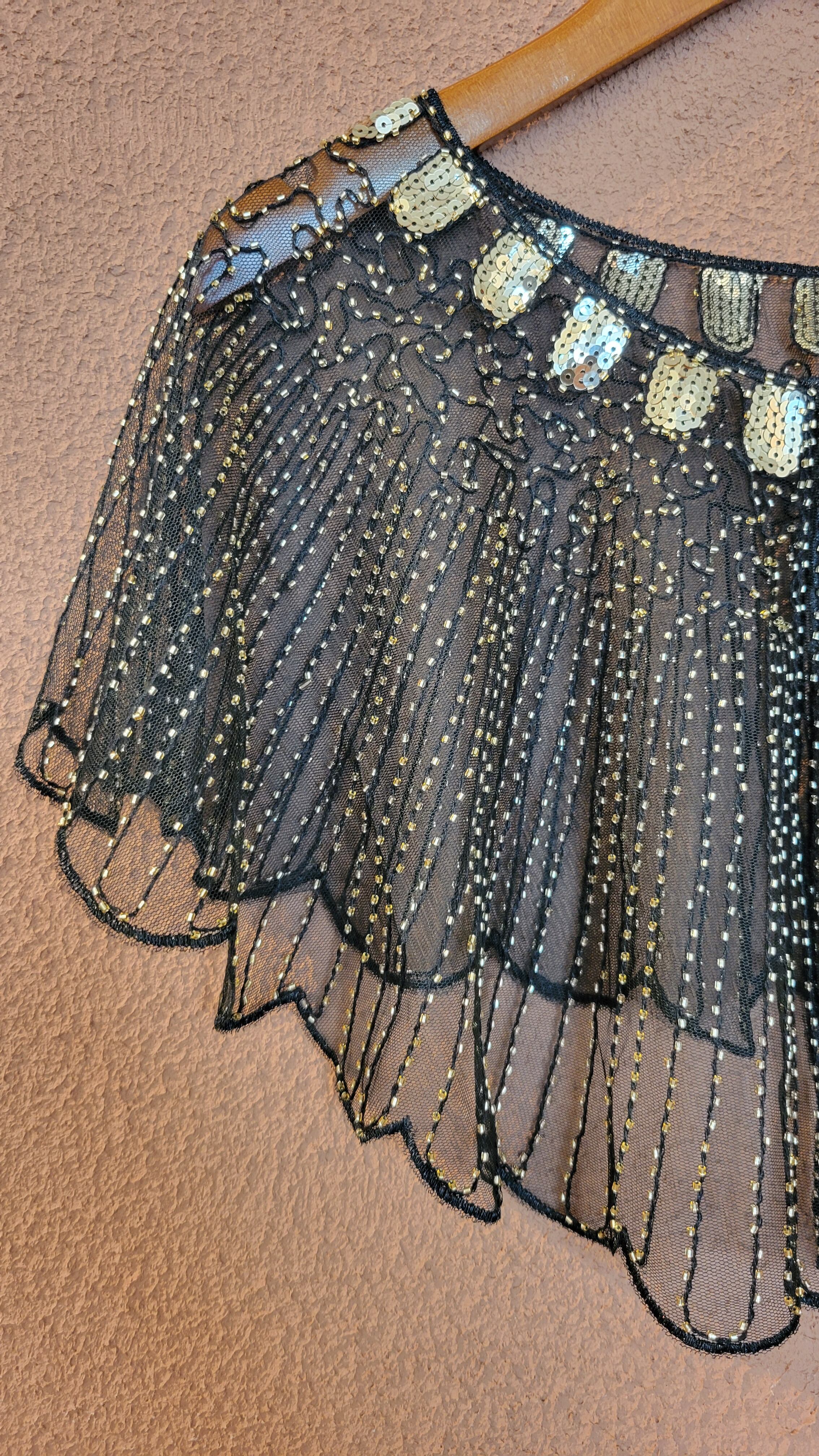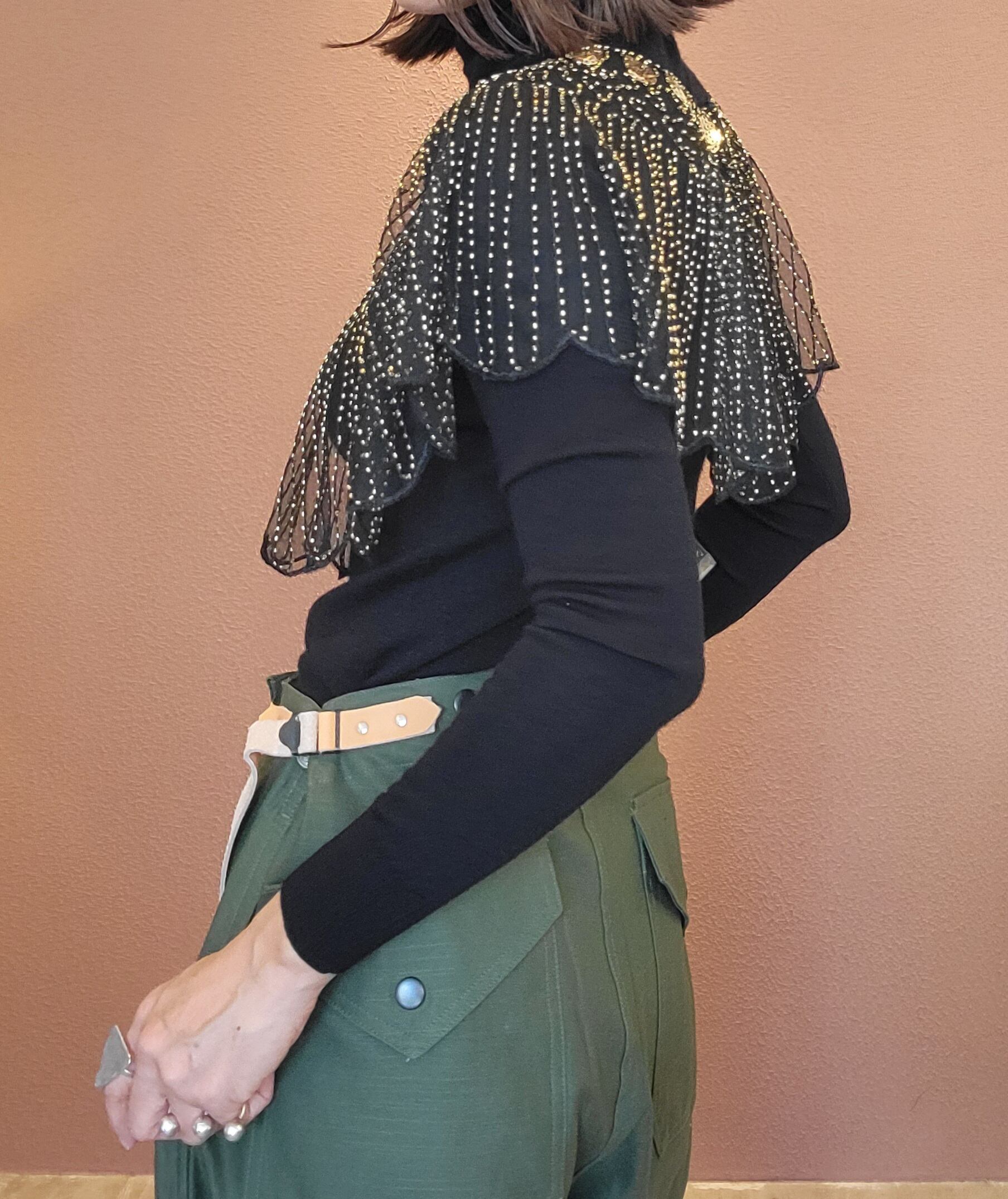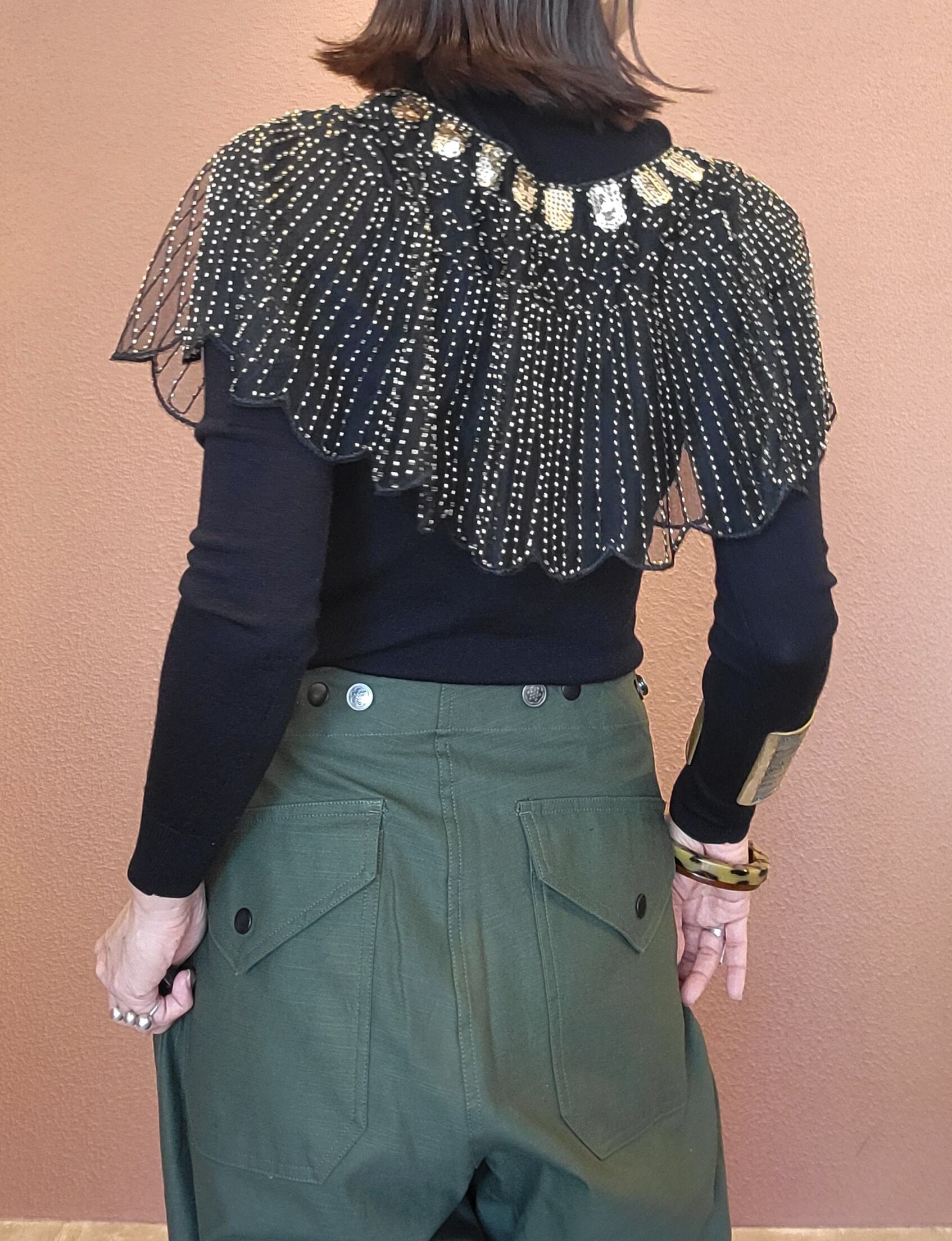 シアー感のあるチュール素材にビーズとスパンコール刺繍が全面に施された付け襟です。フロント中央に小さなホックがひとつ付いています。ニットやワンピース、カジュアルなTシャツやスウェットにプラスして。
