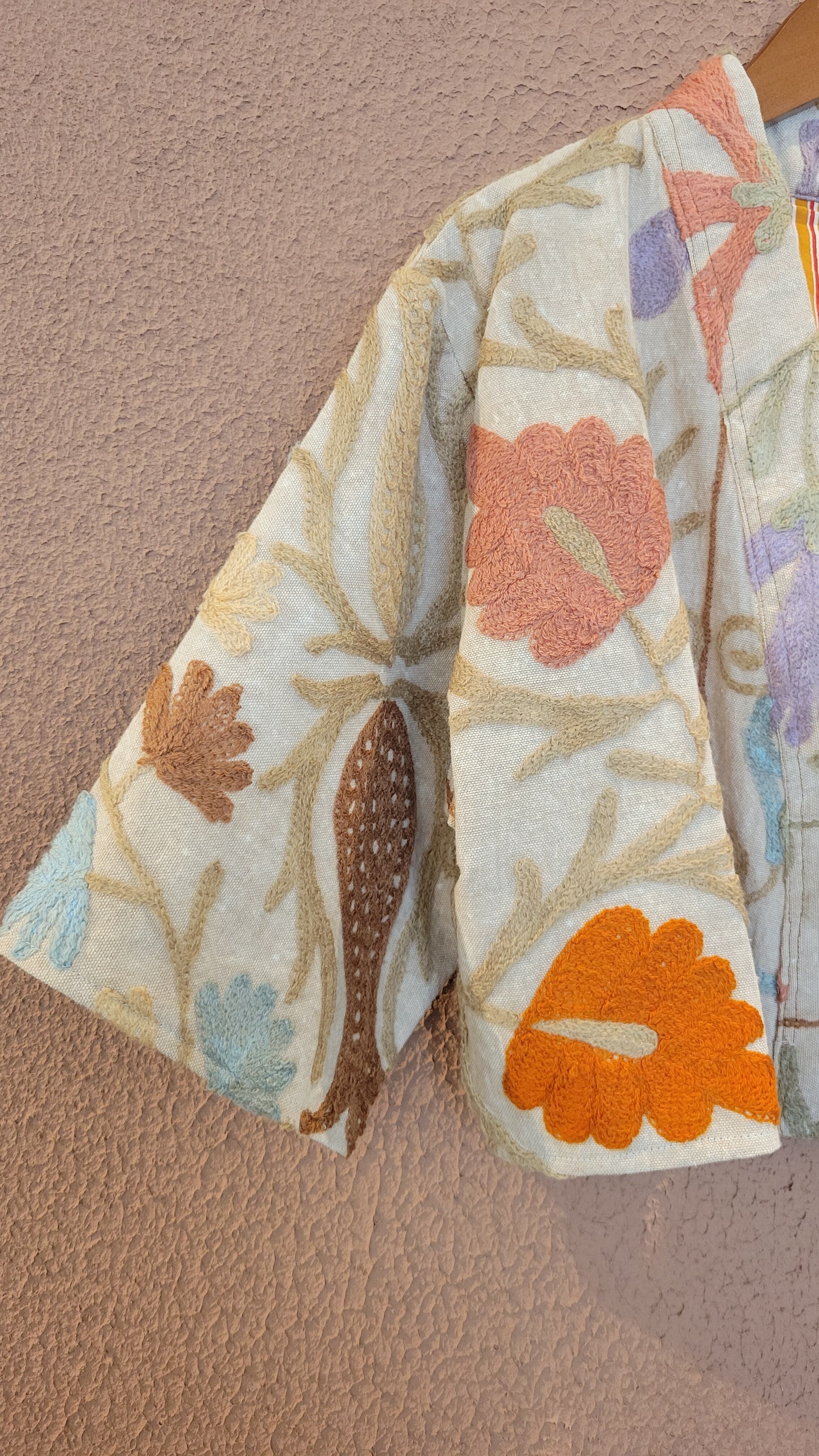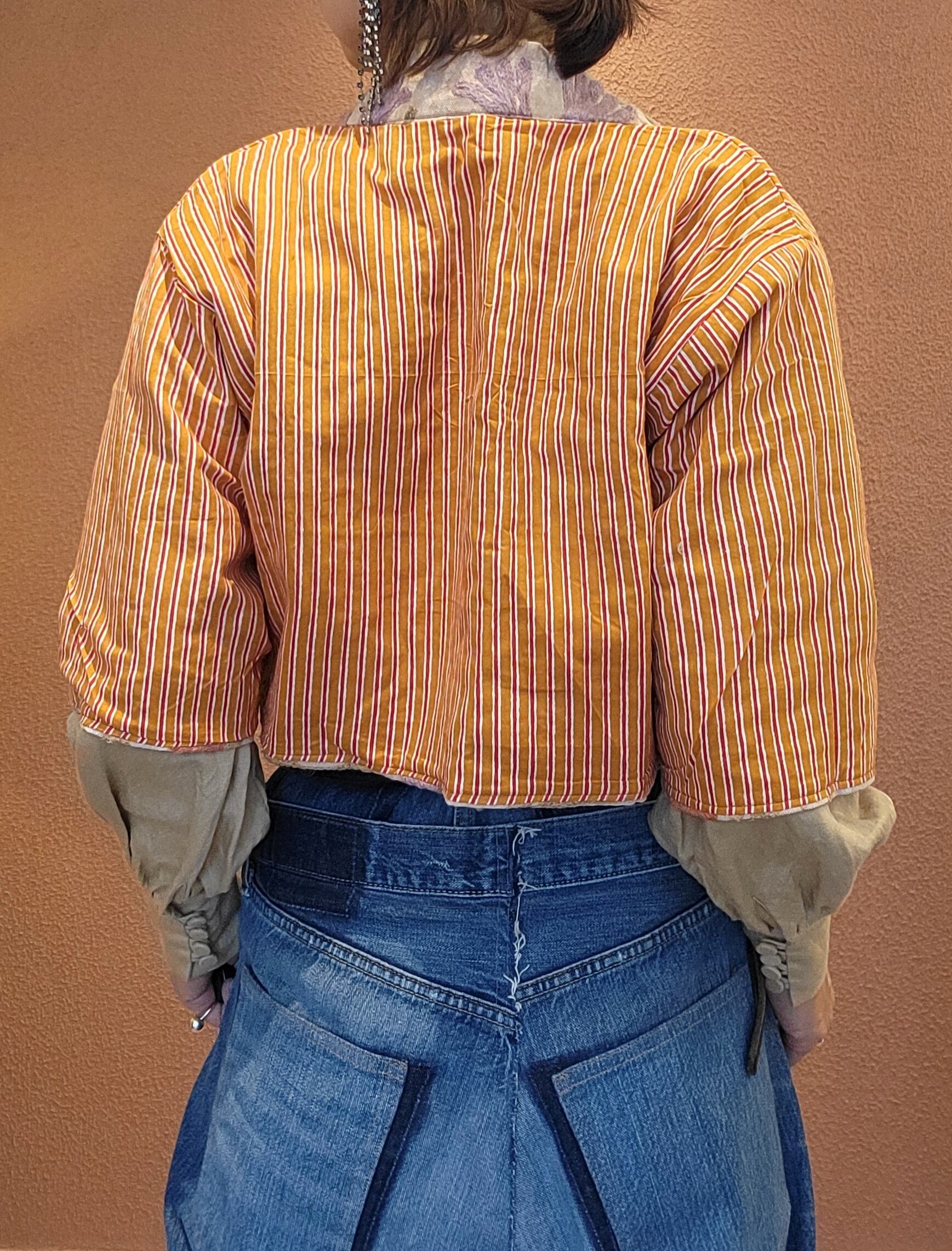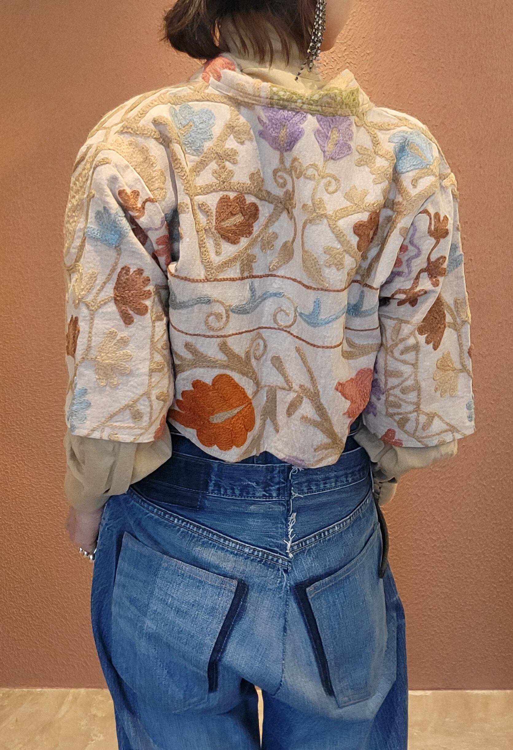 オールドスザニ刺繍生地を使用したリメイクジャケット。素材表記はありませんがコットンのようです。リバーシブルで着用できます。トップスやワンピースに重ねてバランスの良いショート丈。ジャケットやコートの下から覗かせても素敵です。