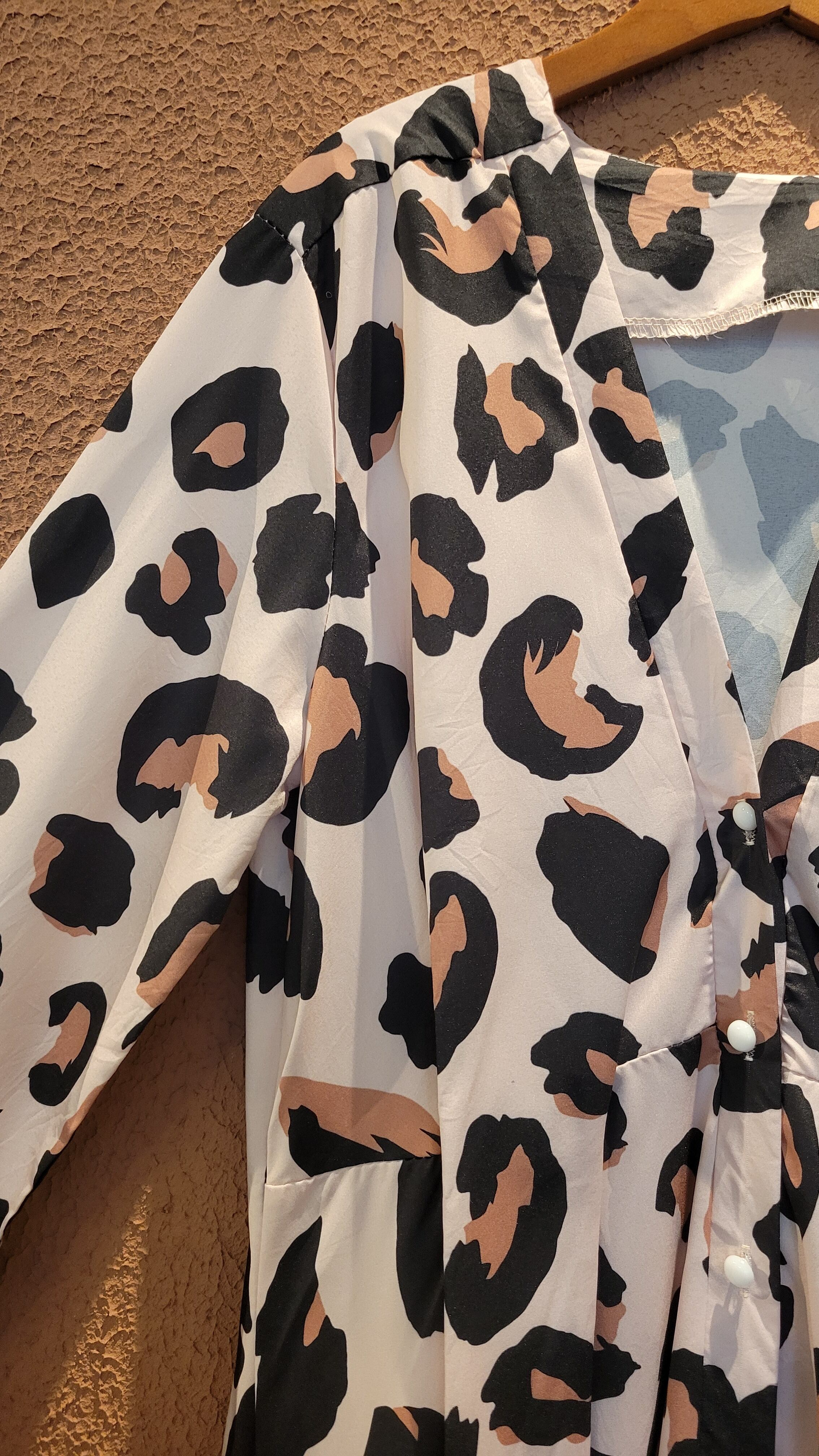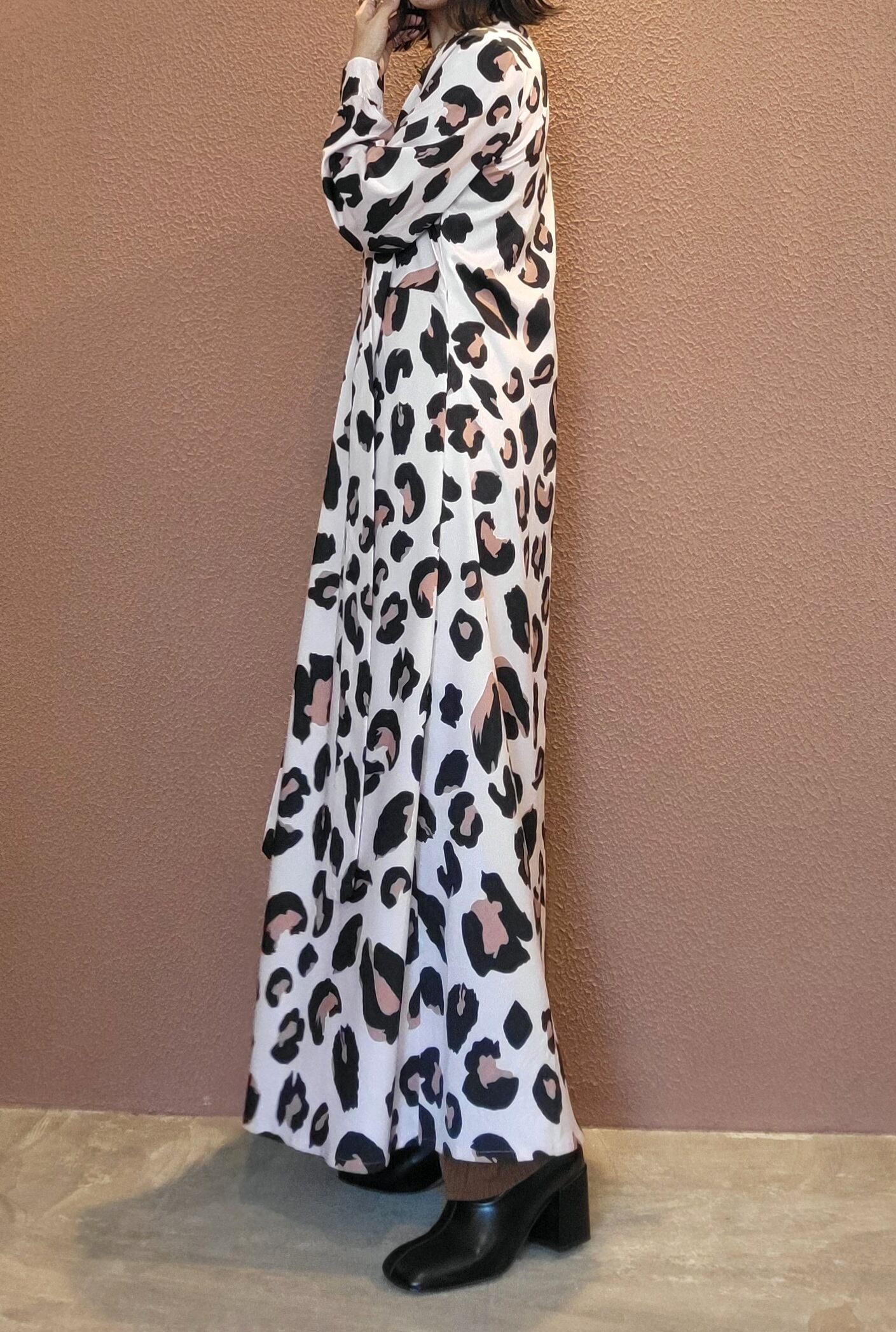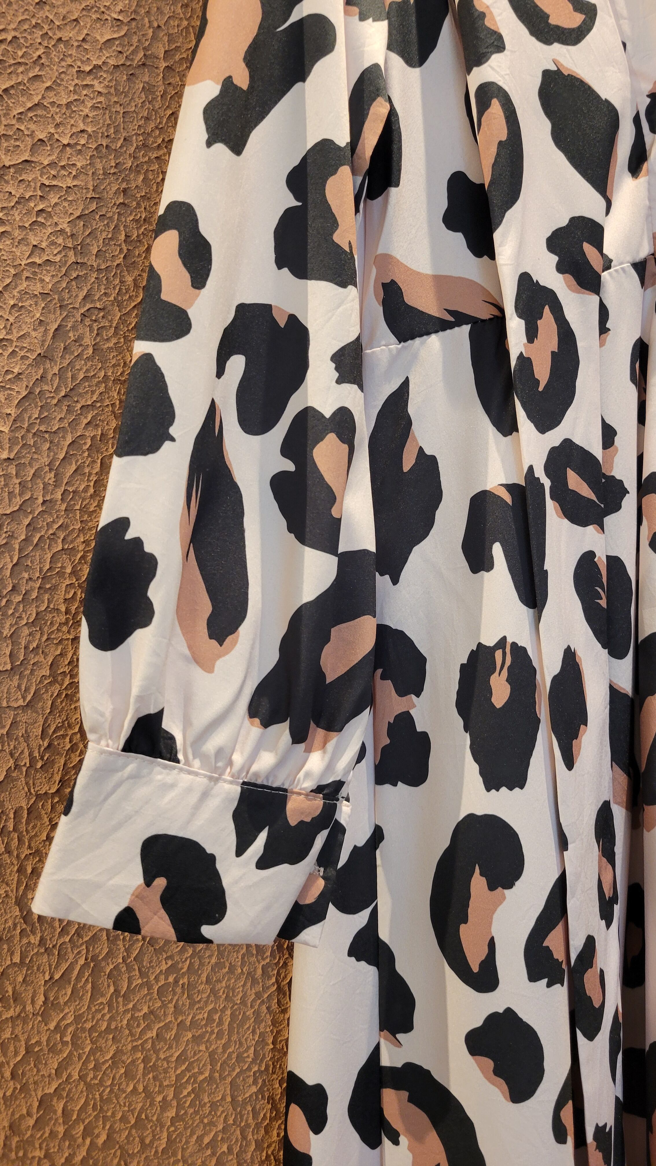 Used レオパードプリントマキシワンピース。素材表記はありませんがポリエステルのようです。透け感はありません。ボタンを開けて羽織りのようにも着用できます。前身ごろウエストにリボンが2本付いていますが、こちらは飾りリボンで前後で結んだりせずそのまま垂らした状態で着用するものです。