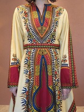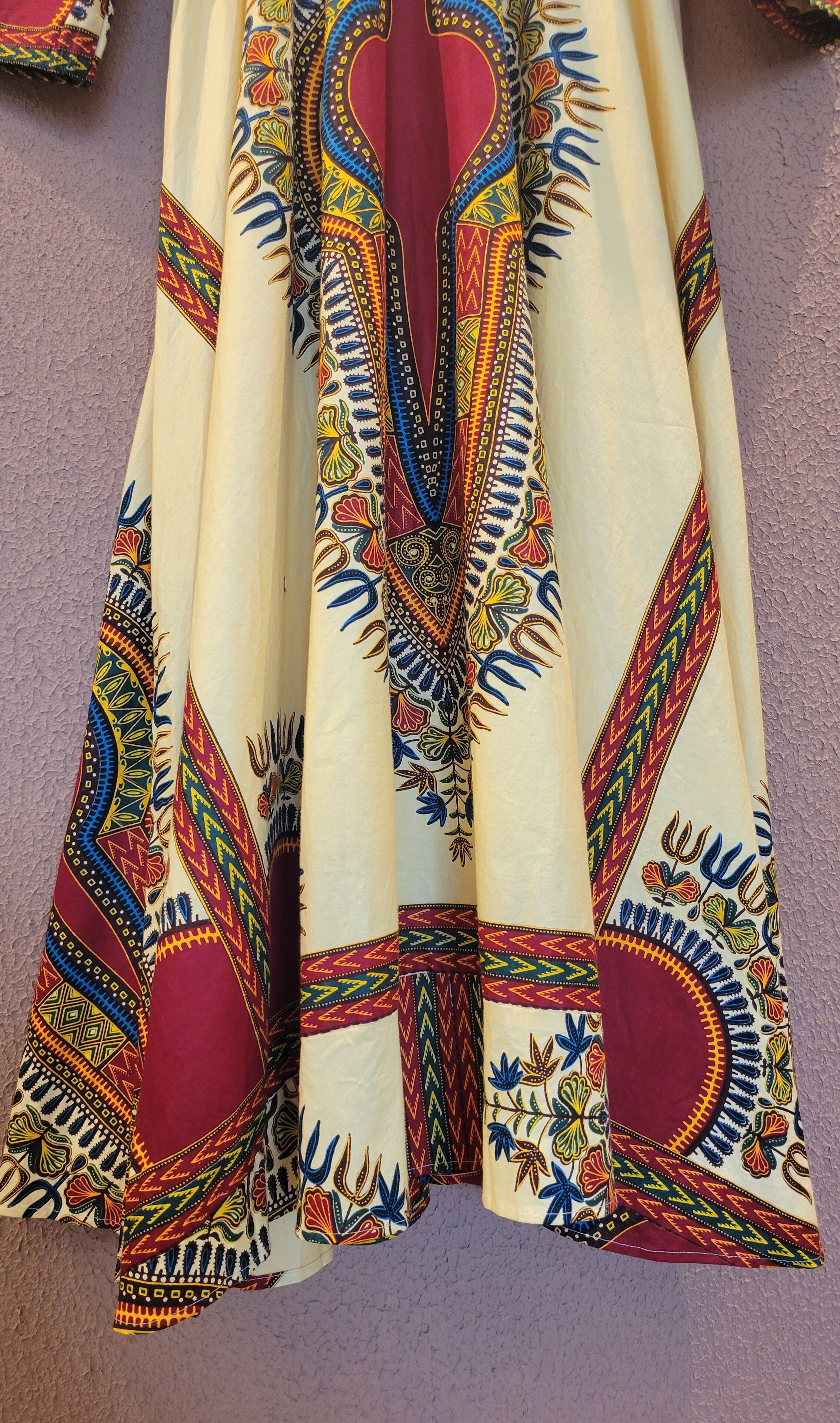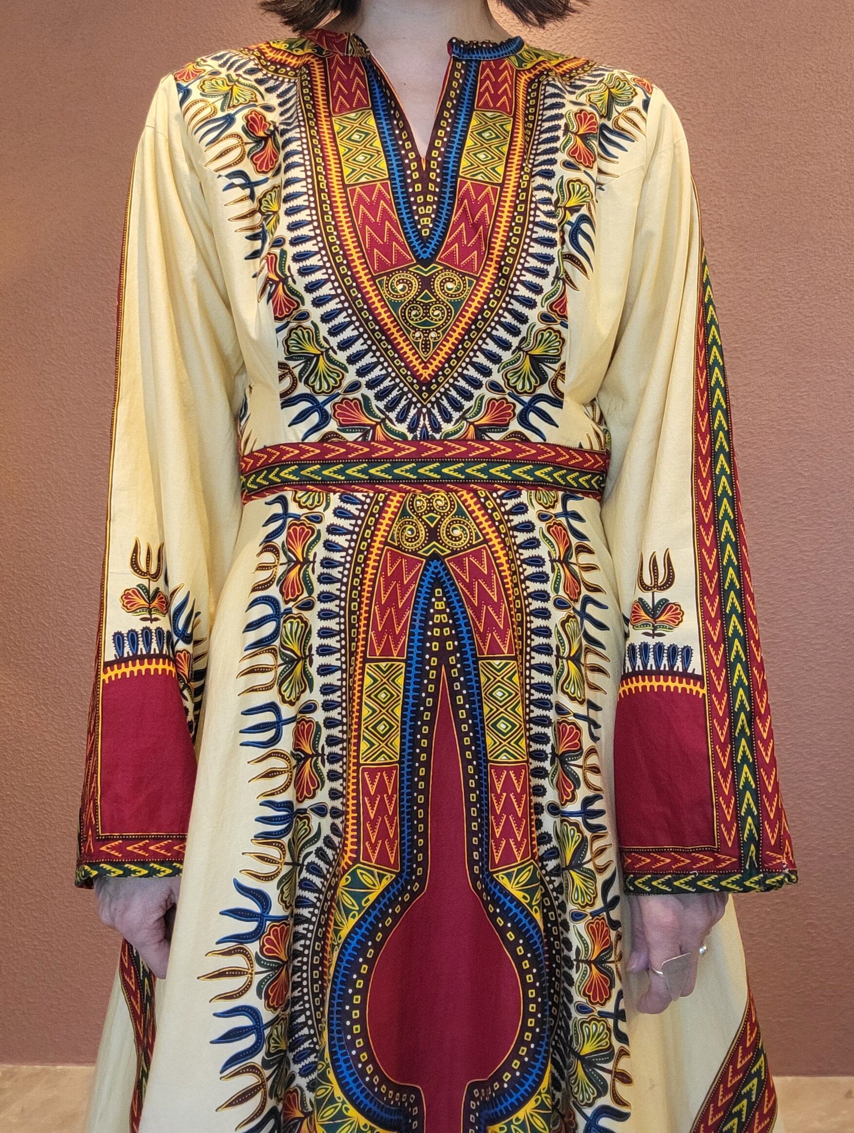 ヴィンテージのアフリカンバティックダシキプリントワンピース。素材表記はありませんがコットンです。しっかりした張り感により美しいフレアシルエットを着用時もキープ。バックファスナー付きで着脱も簡単にできます。存在感抜群の華やかなダシキ柄の主役級ワンピースです。