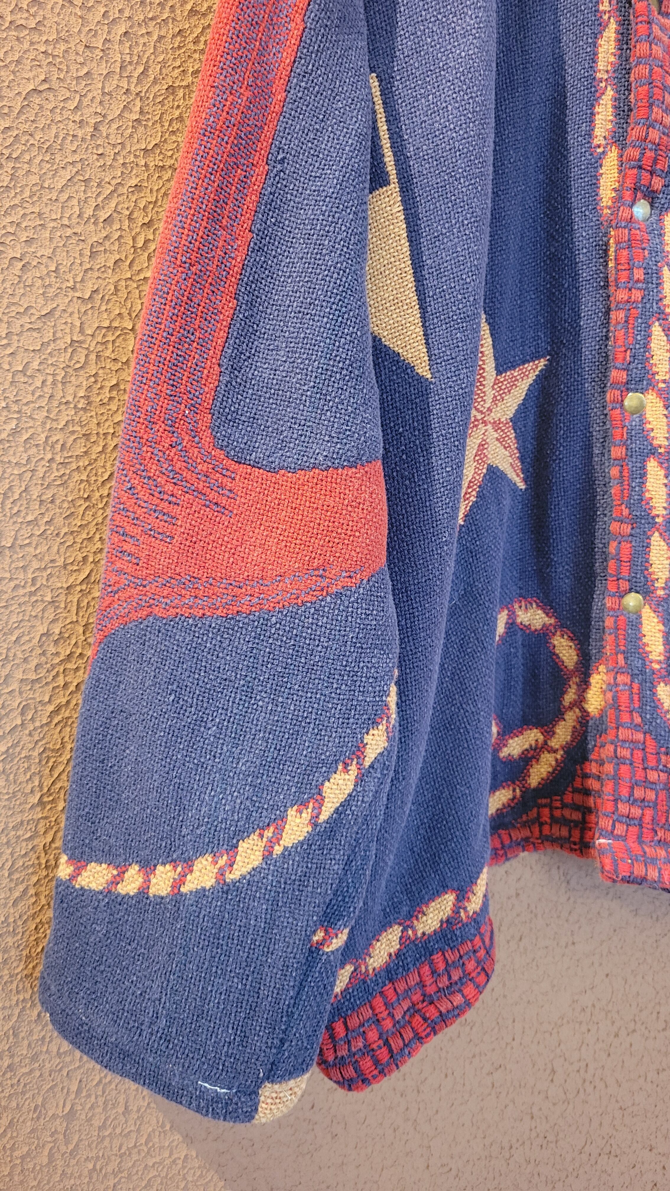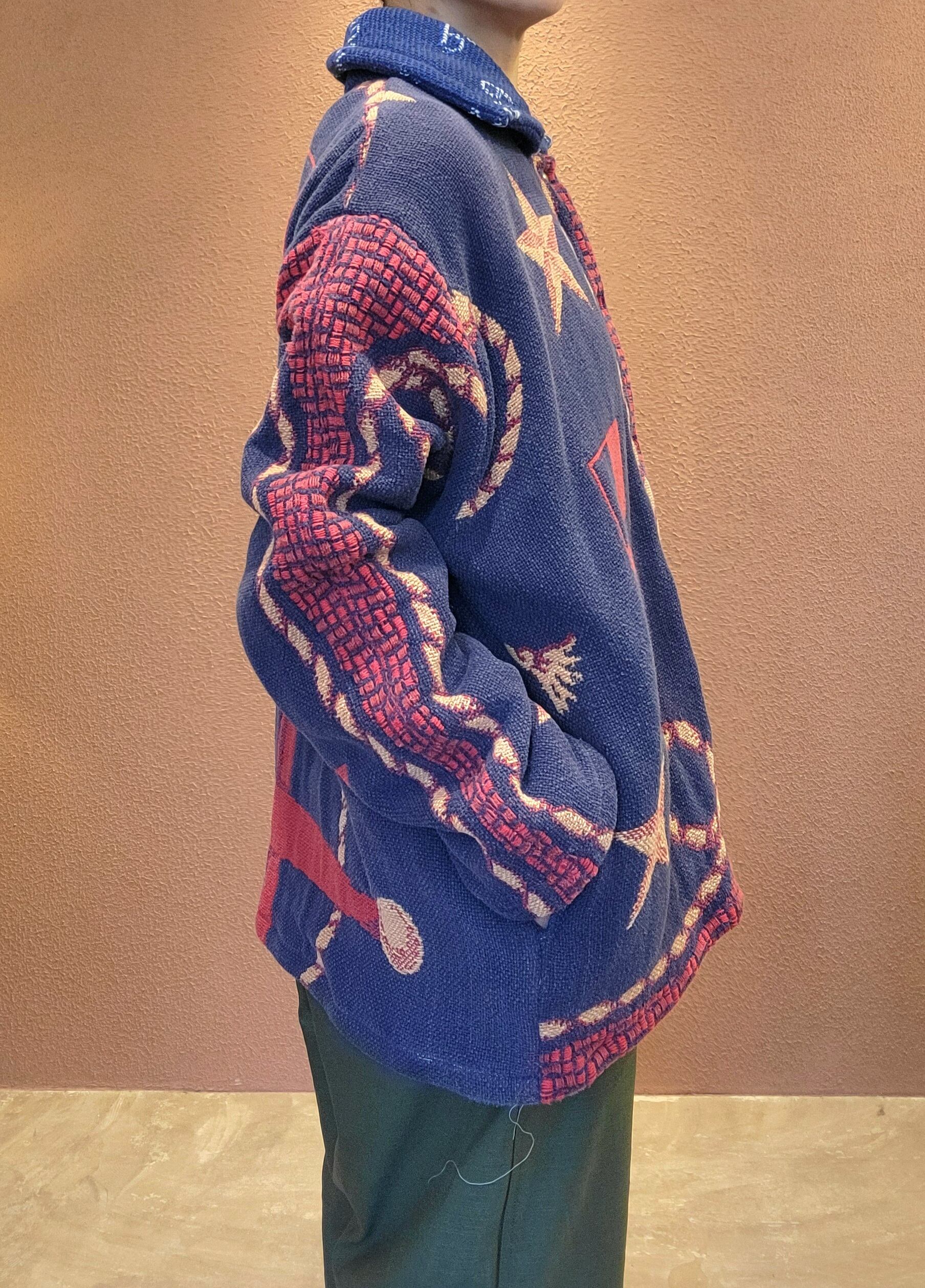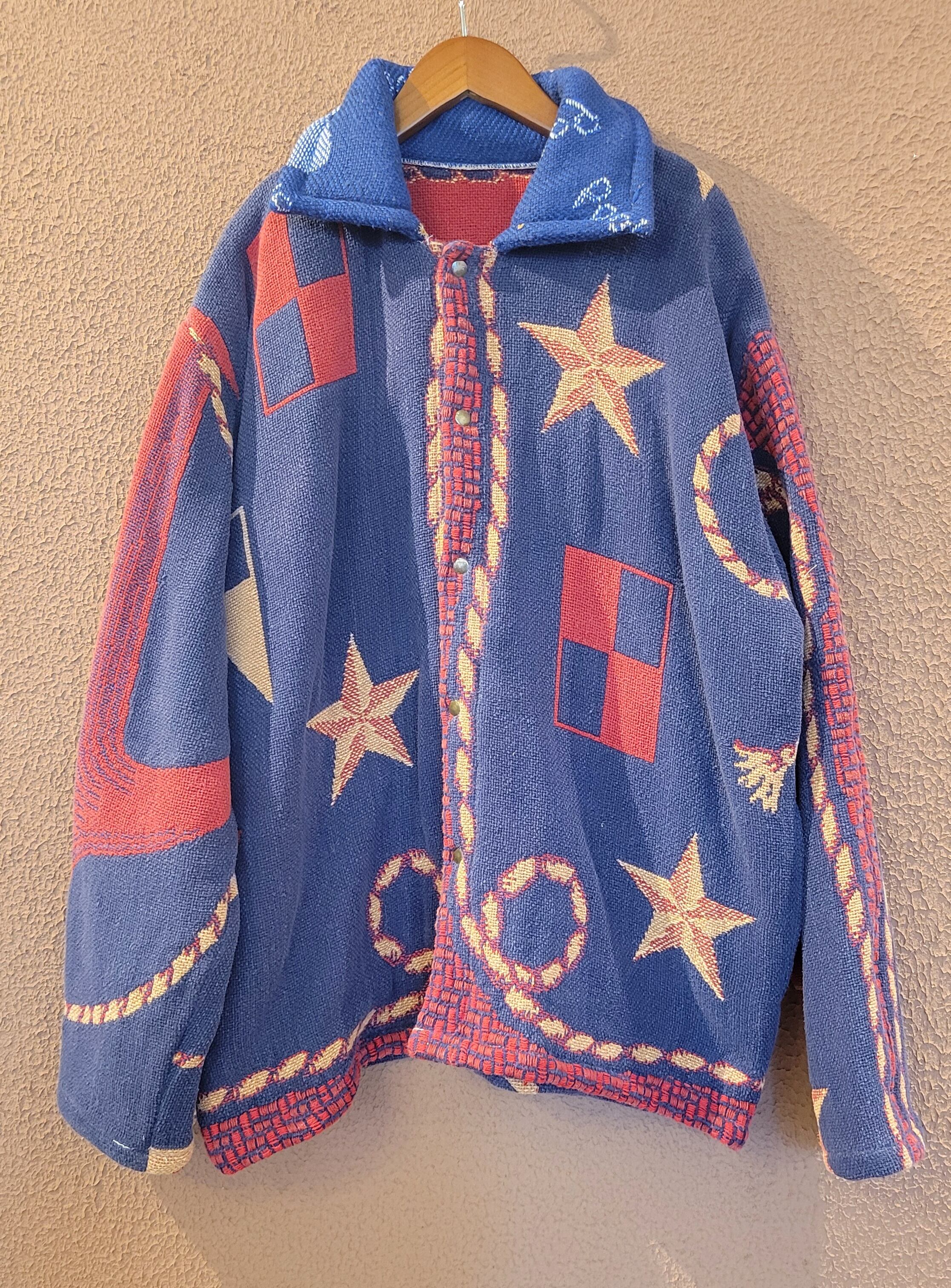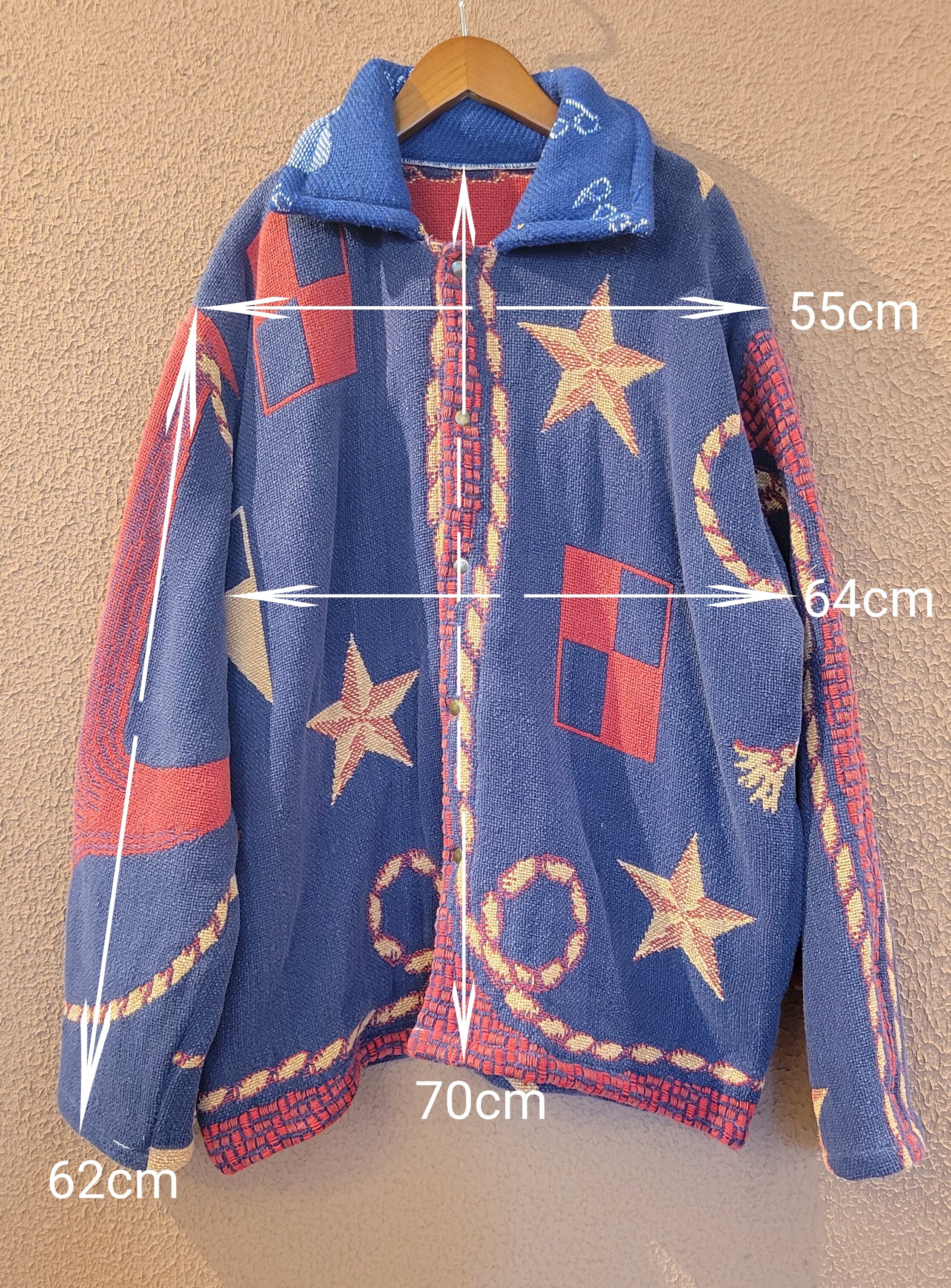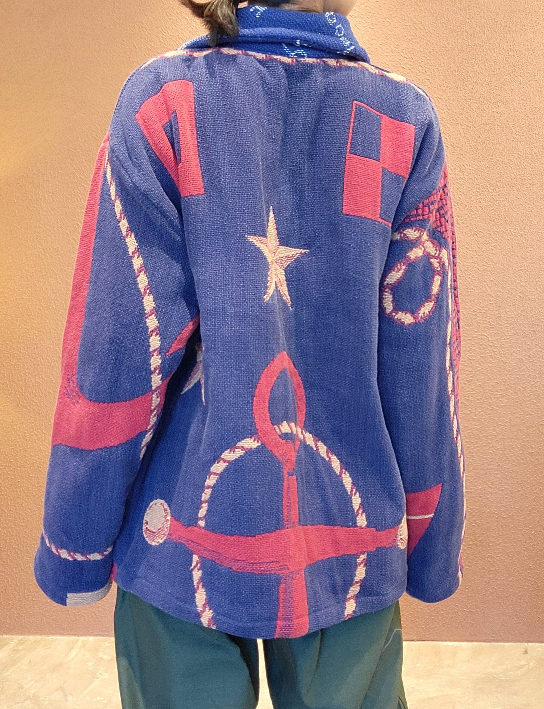 Usedブランケットを使用したリメイクジャケット。素材表記はありませんがコットンのようです。フロントはスナップボタン。メンズ仕様ですが女性がオーバーサイズで着るのも可愛いです。男女兼用で着用可能。