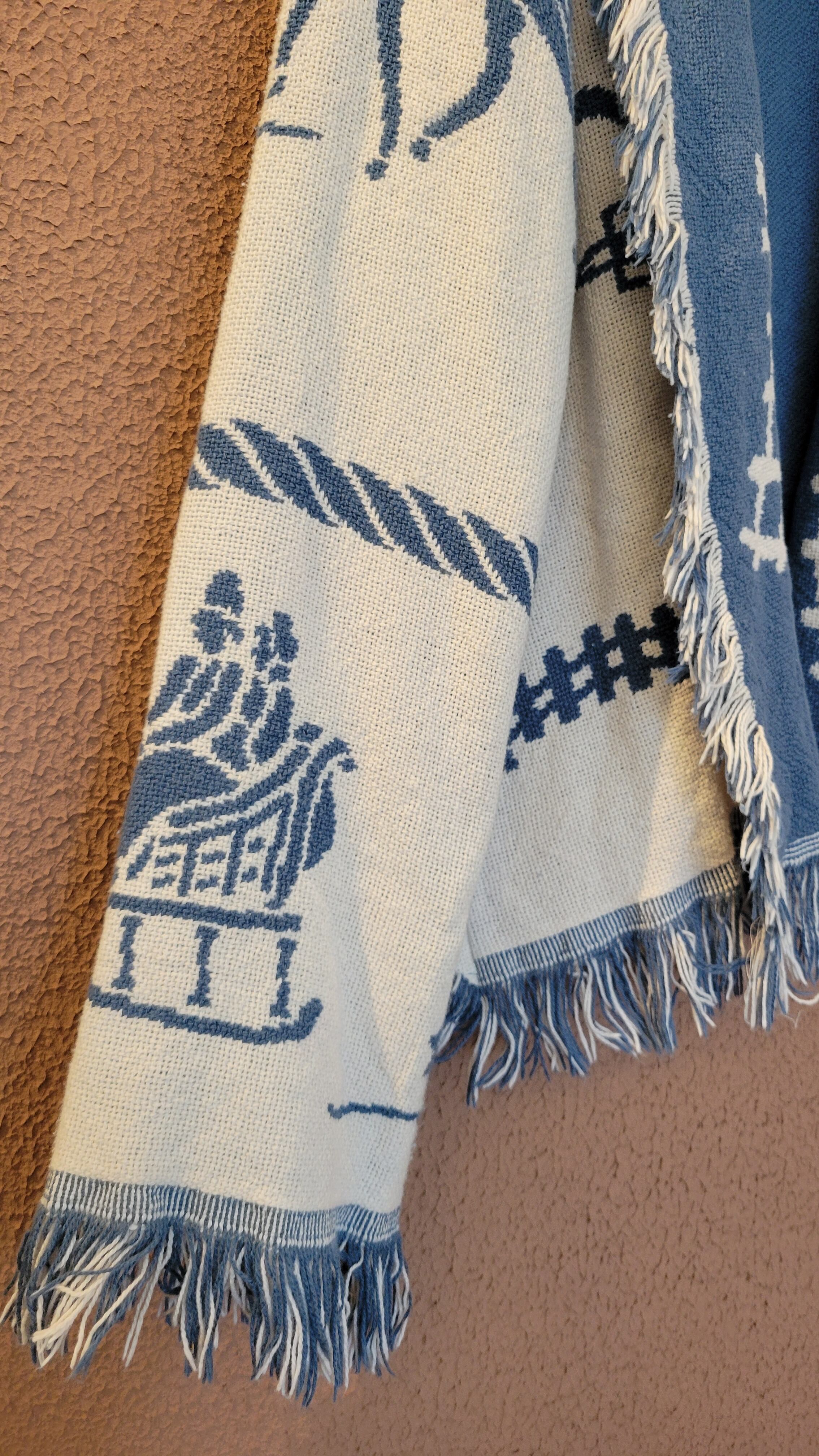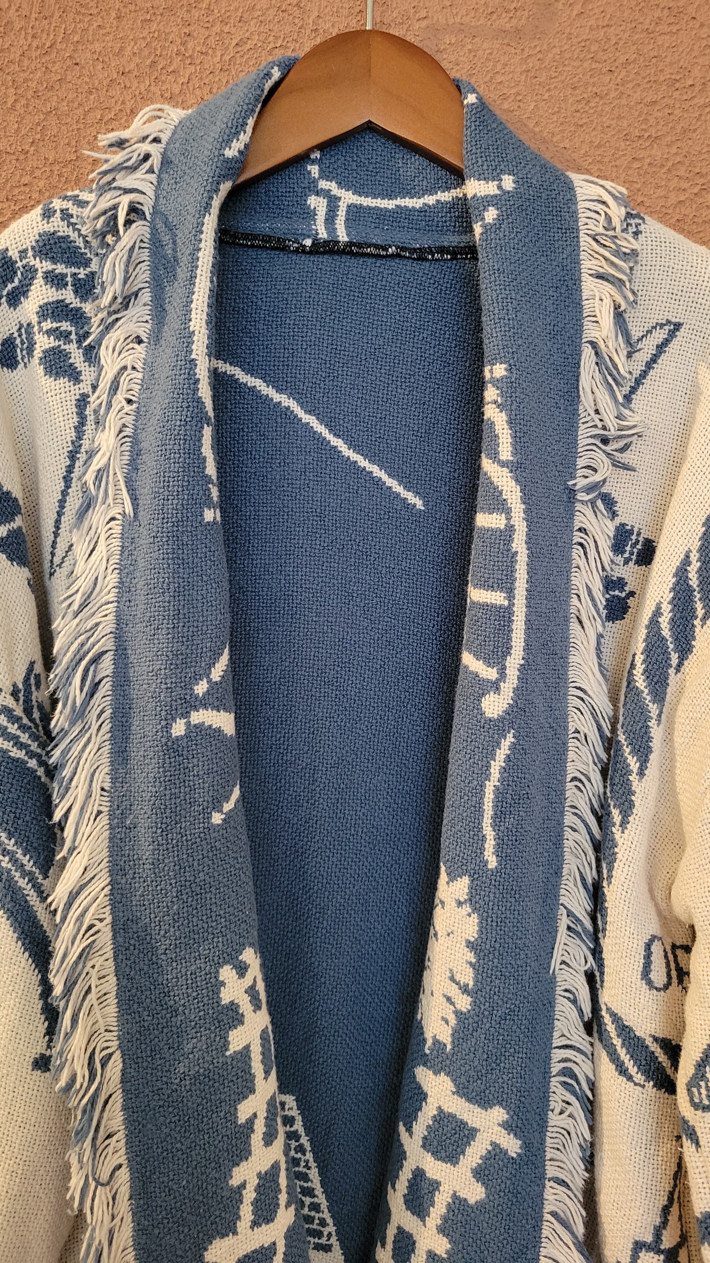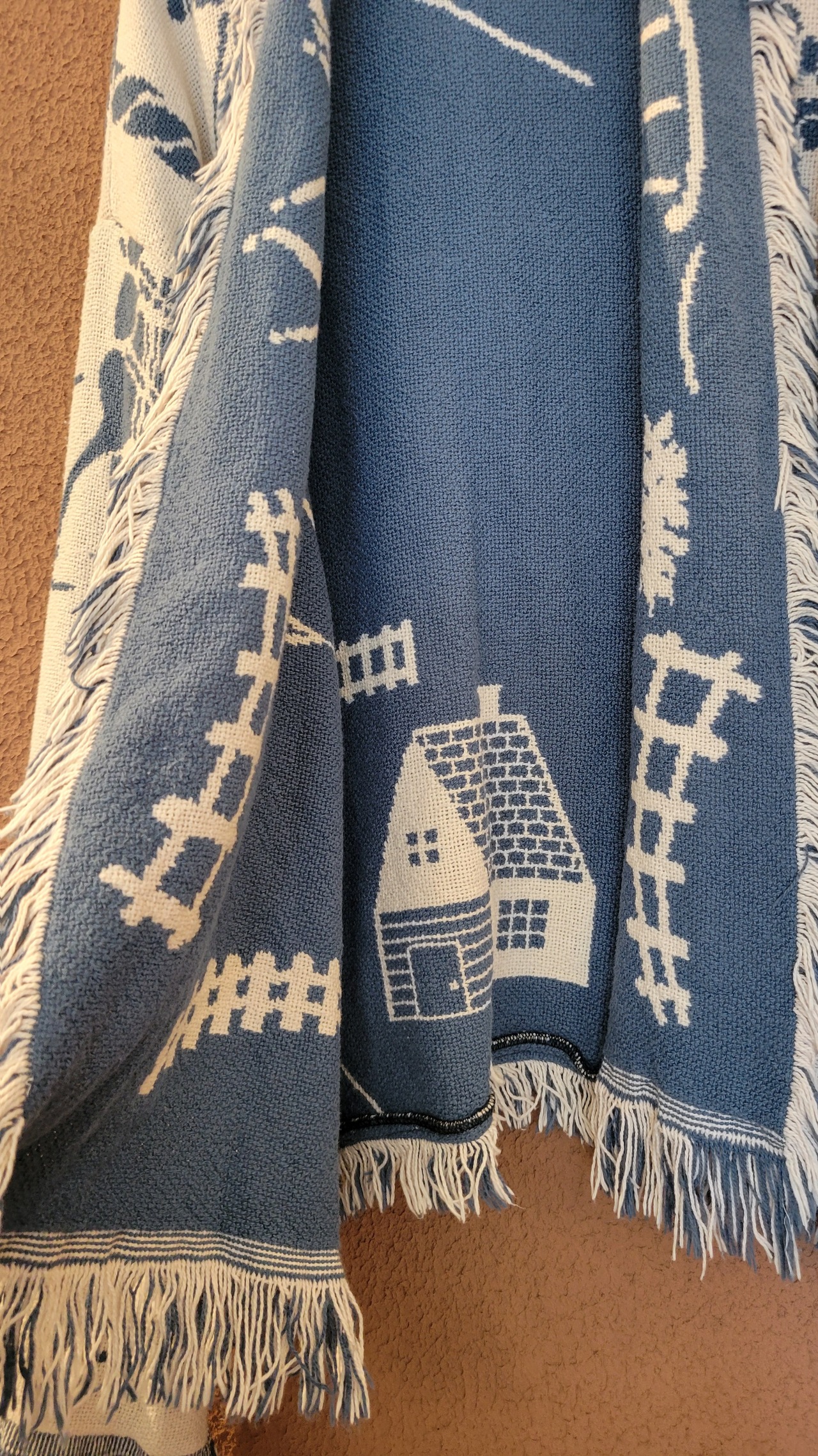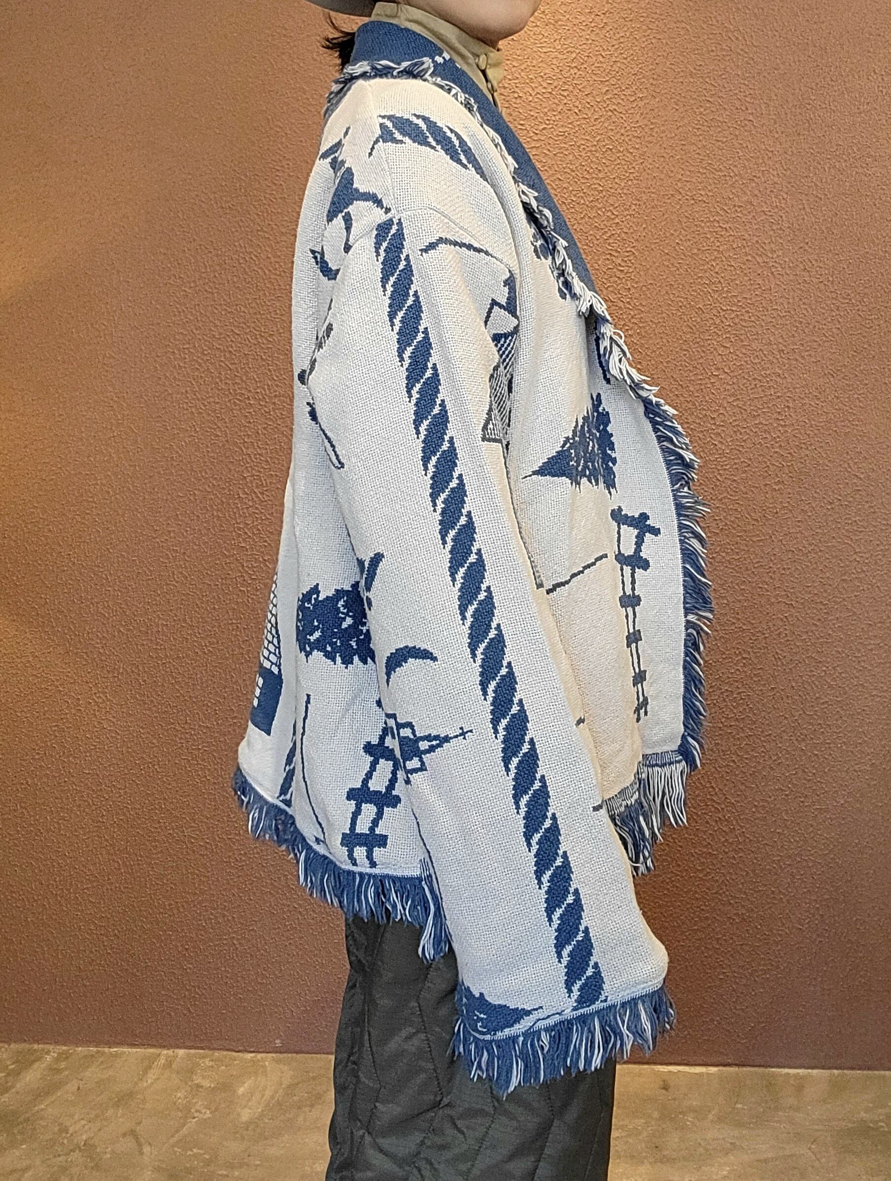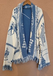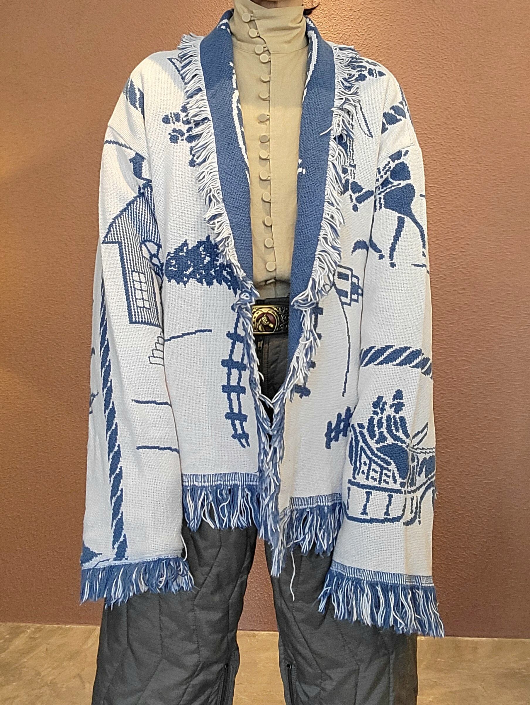 ヴィンテージのブランケットを使用したリメイクジャケット。素材表記はありませんがコットンのようです。肌触り柔らかで軽量、さっと羽織れるオープンタイプです。袖丈長めでユニセックスで着用可能てす。全体的にゆったりサイズでお部屋でのくつろぎ時間にもぴったりです。