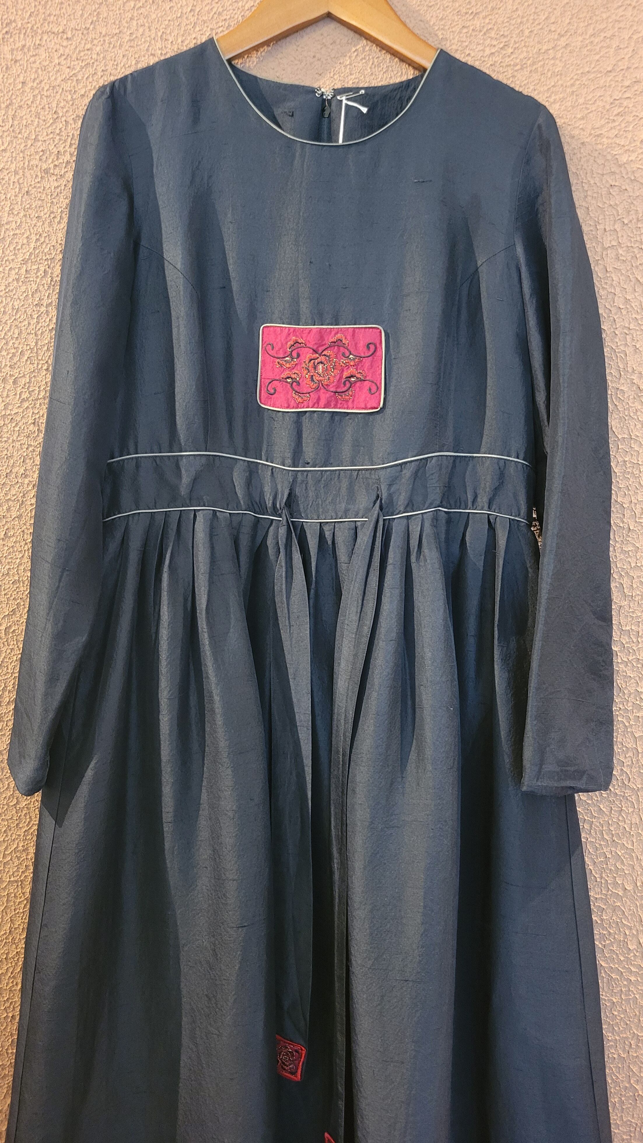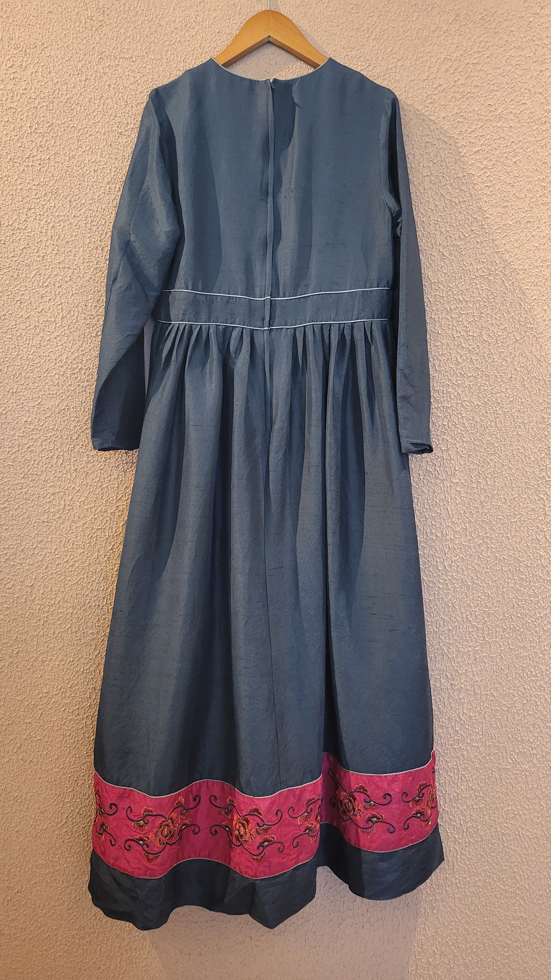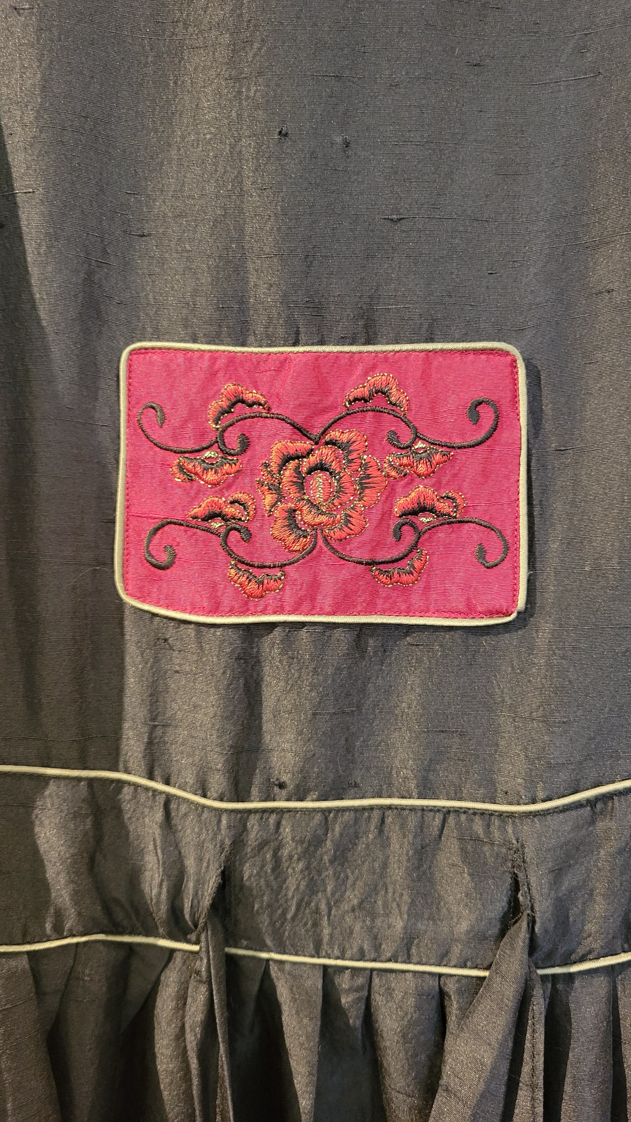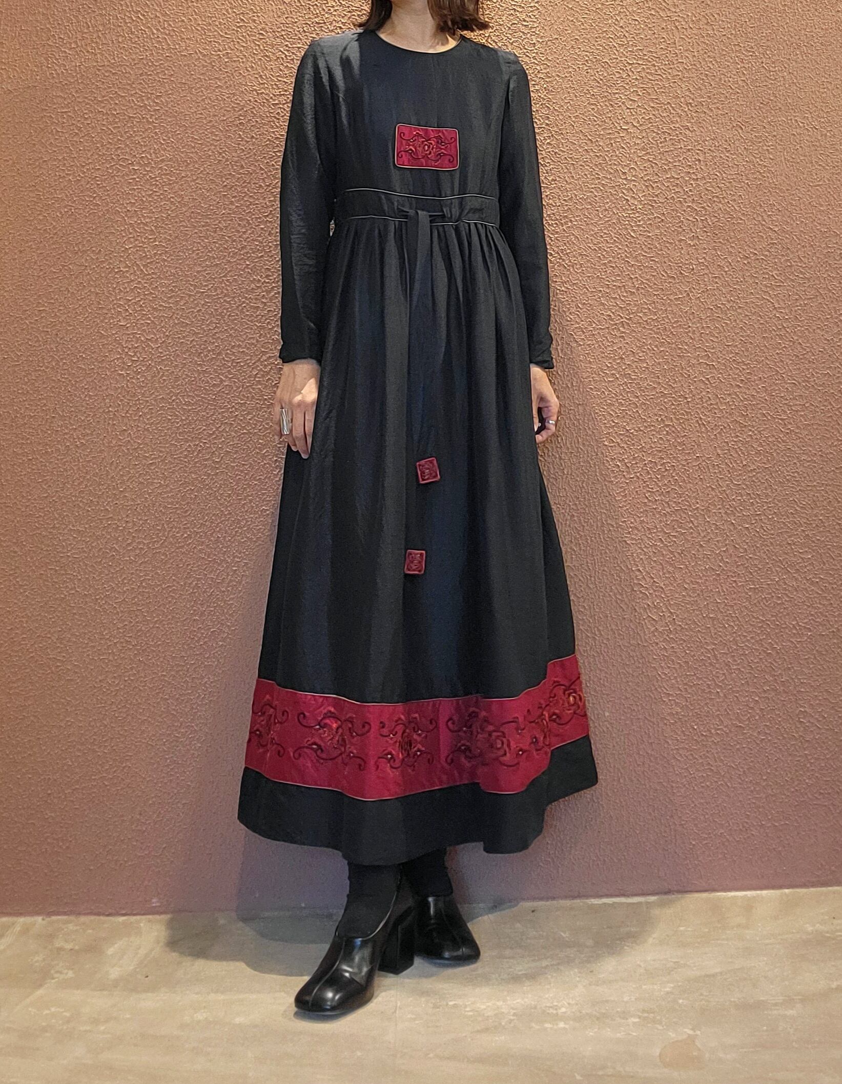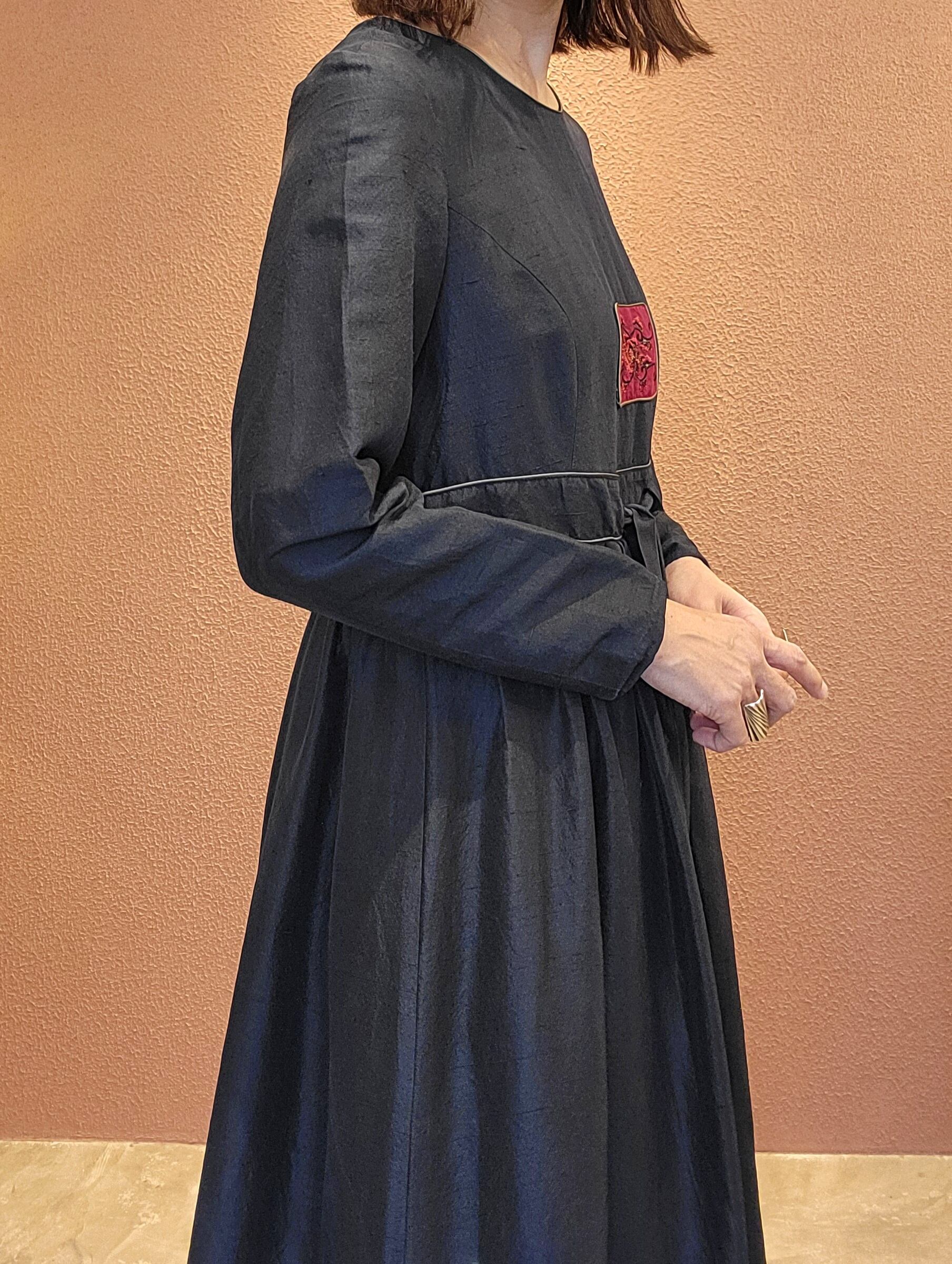 ヴィンテージのタフタ素材マキシワンピース。ハンドメイドのようです。タフタ特有の控えめな光沢と張り感があり着用時にもきれいなシルエットをキープできます。胸元と裾にあしらわれた刺繍入りの赤い生地が良いアクセントになり全体をぴりっと引き締めています。