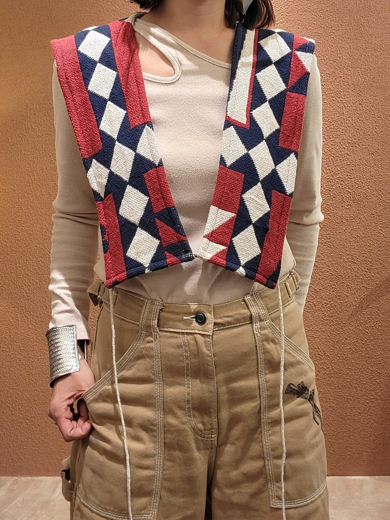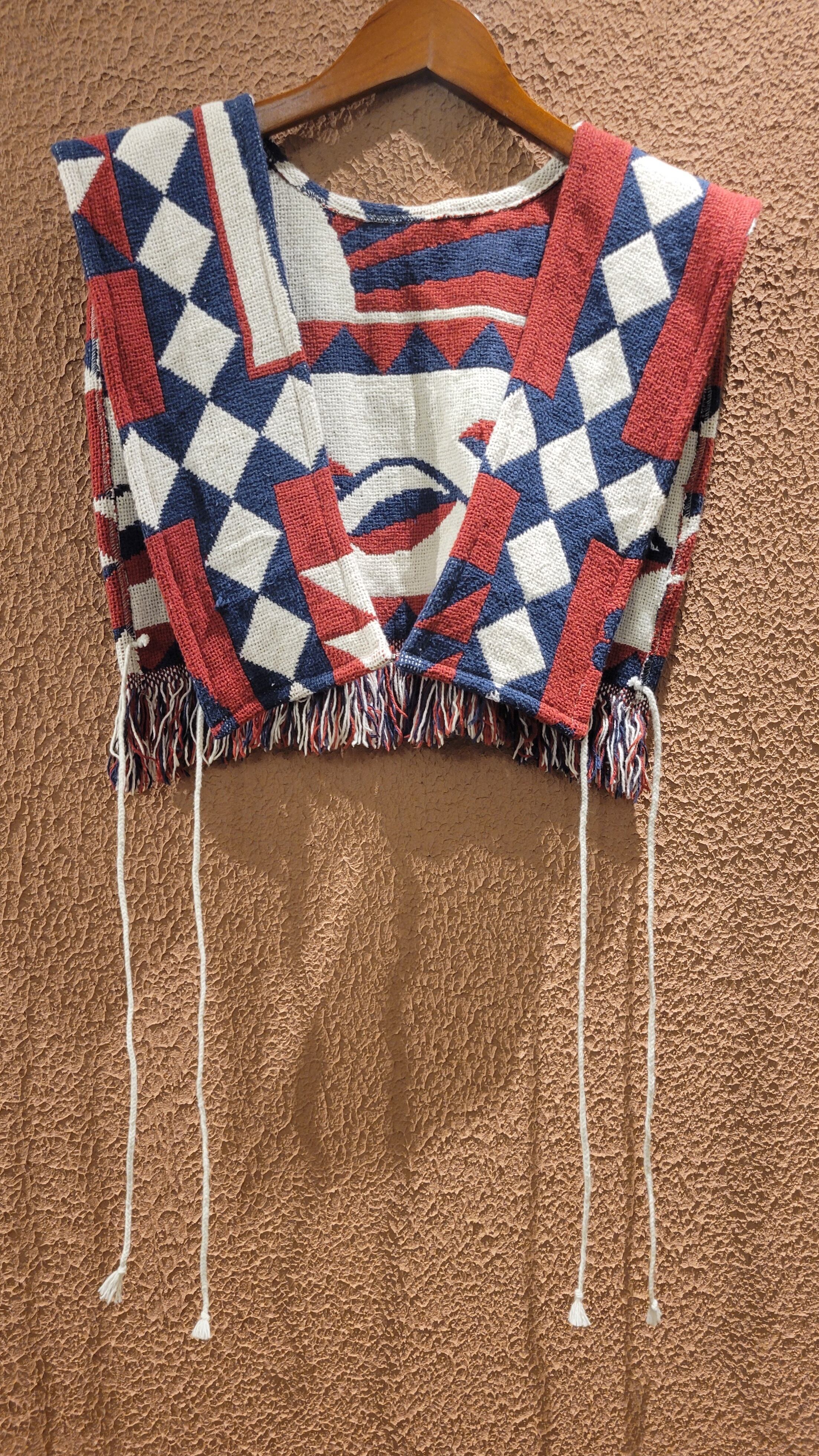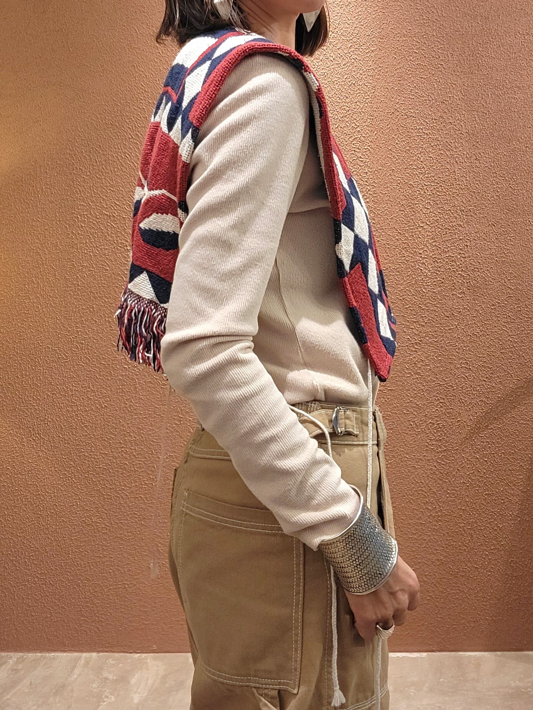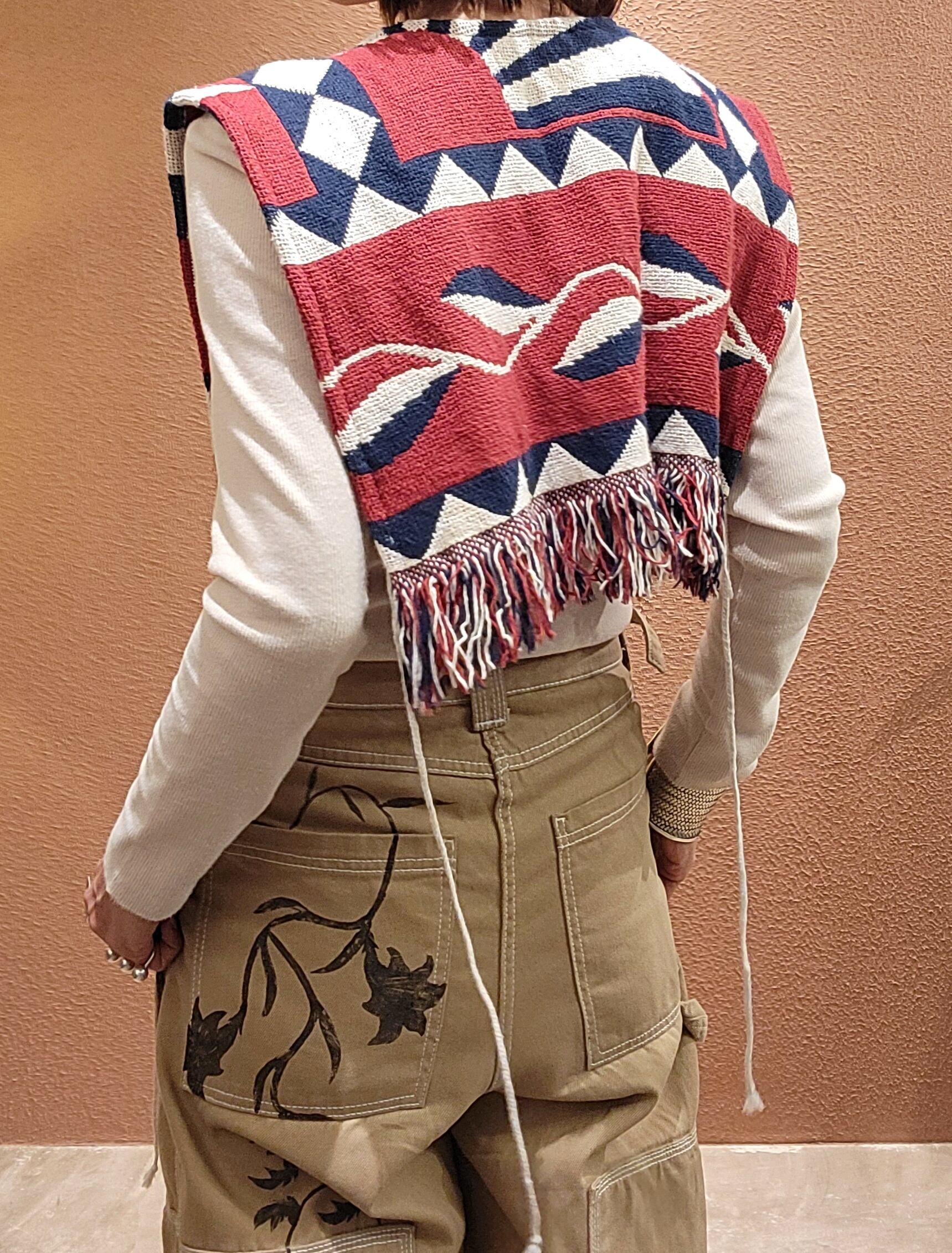 ヴィンテージのブランケットを使用したリメイクベスト。サイドオープンタイプです。左右に付いている紐はそのまま垂らしても、結んでも可愛く着られます。シンプルな無地のトップスやワンピースにプラスしてお楽しみください。