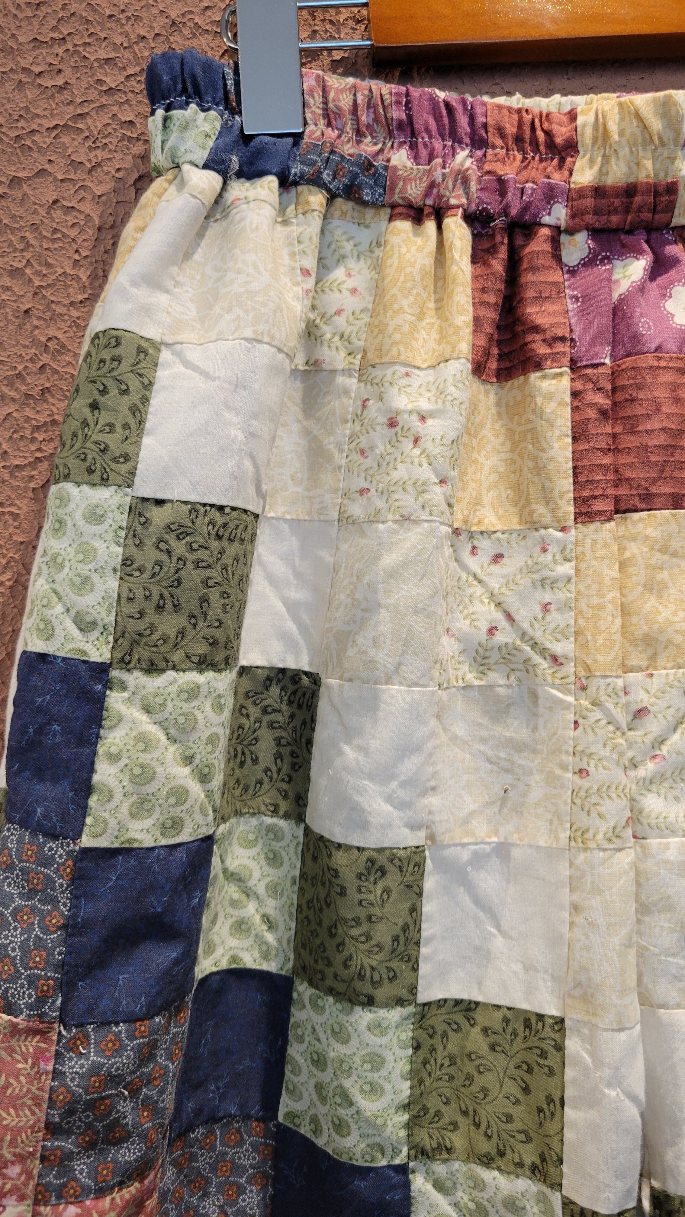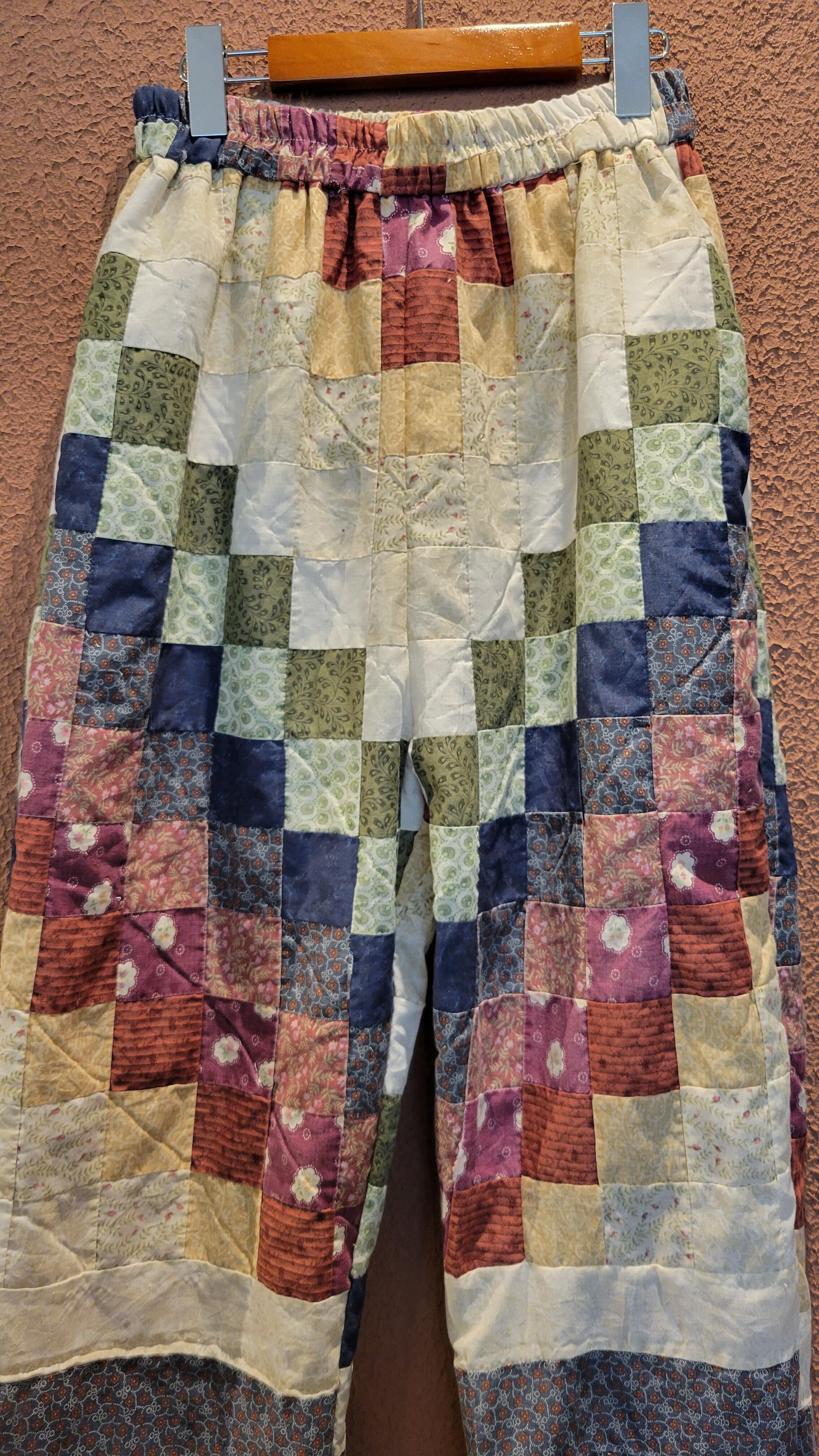 ヴィンテージのパッチワークキルト生地を使用したリメイクパンツ。素材表記はありませんがコットンのようです。ウエストゴム、左右シームポケット付きです。中綿入りではなく、通年ではいていただけます。楽な履き心地で日常使いにぴったりな1本です。
