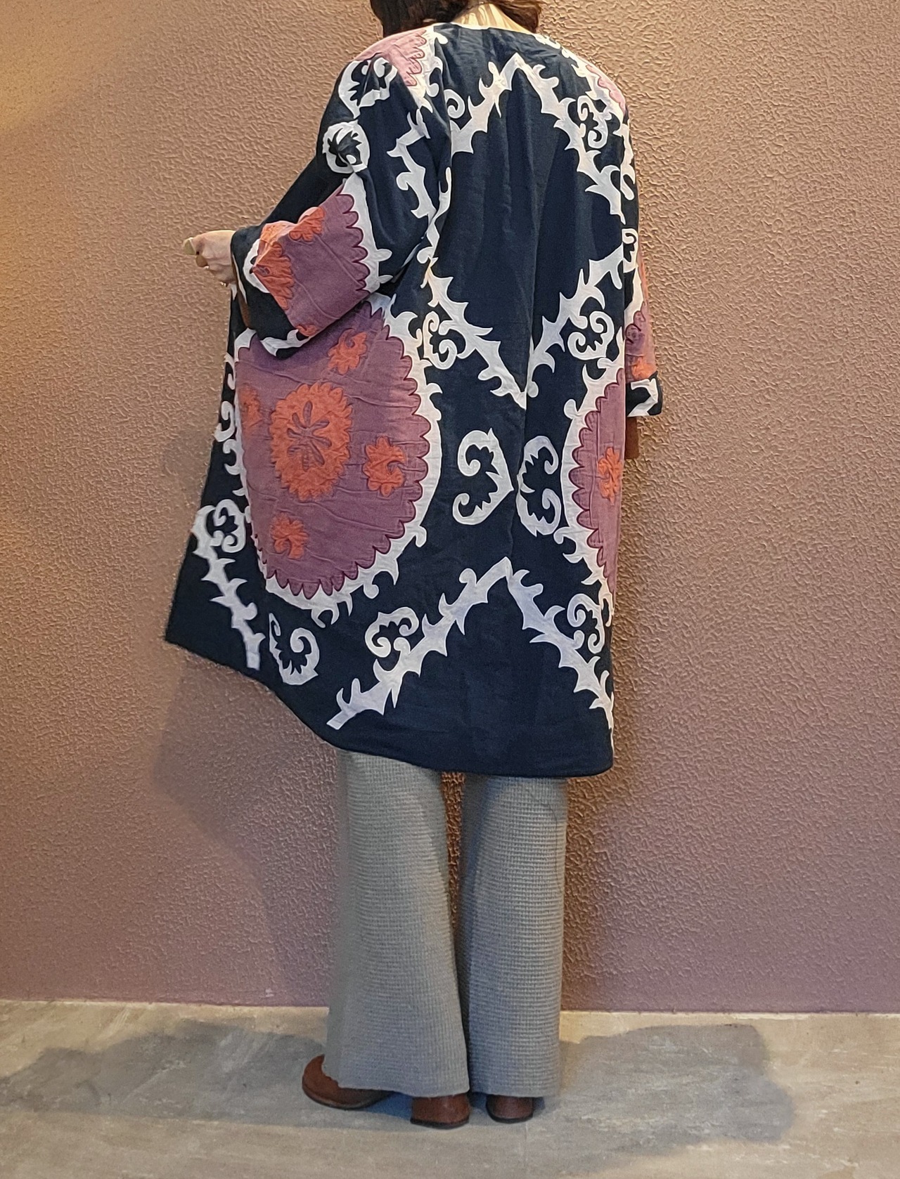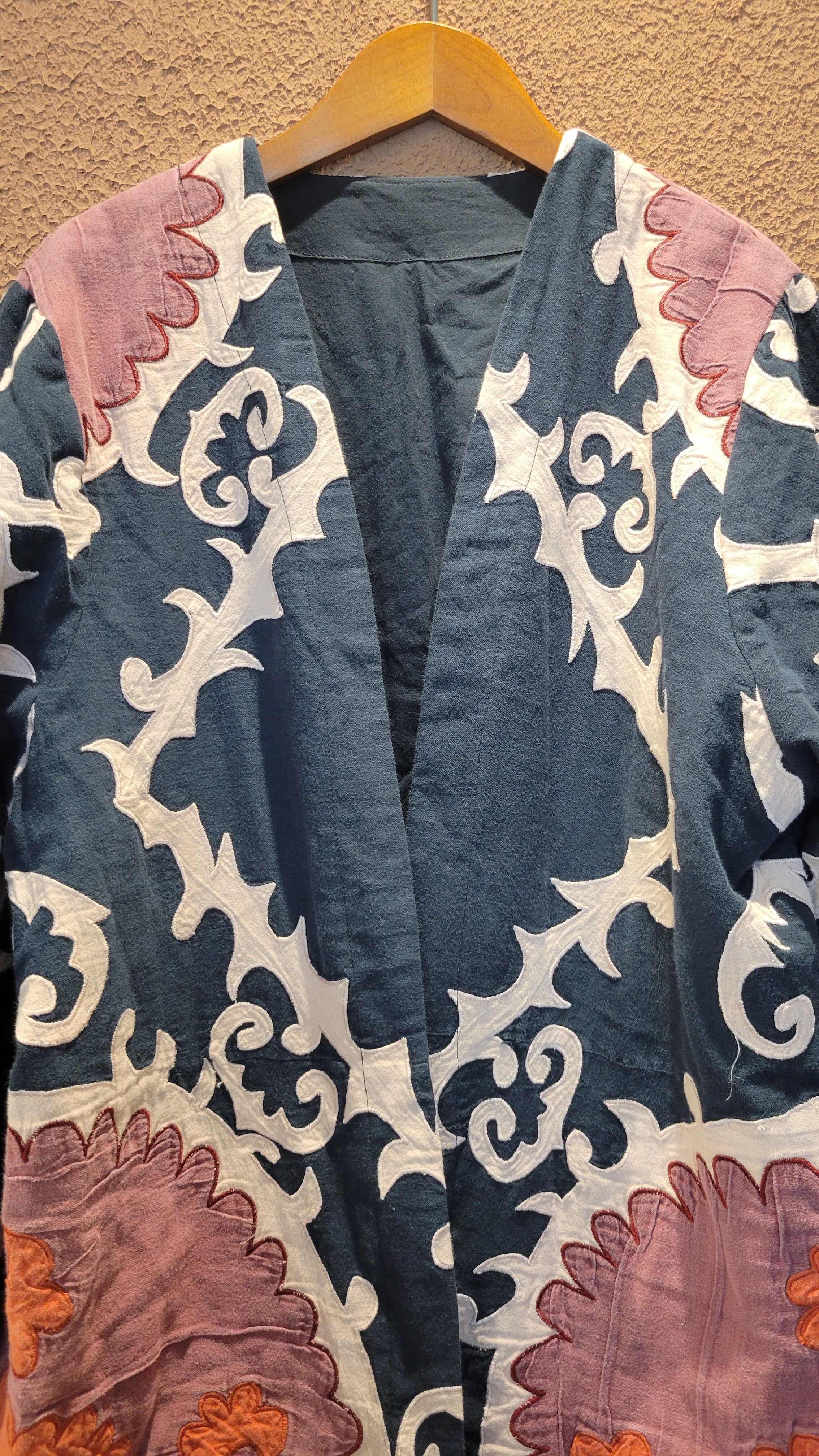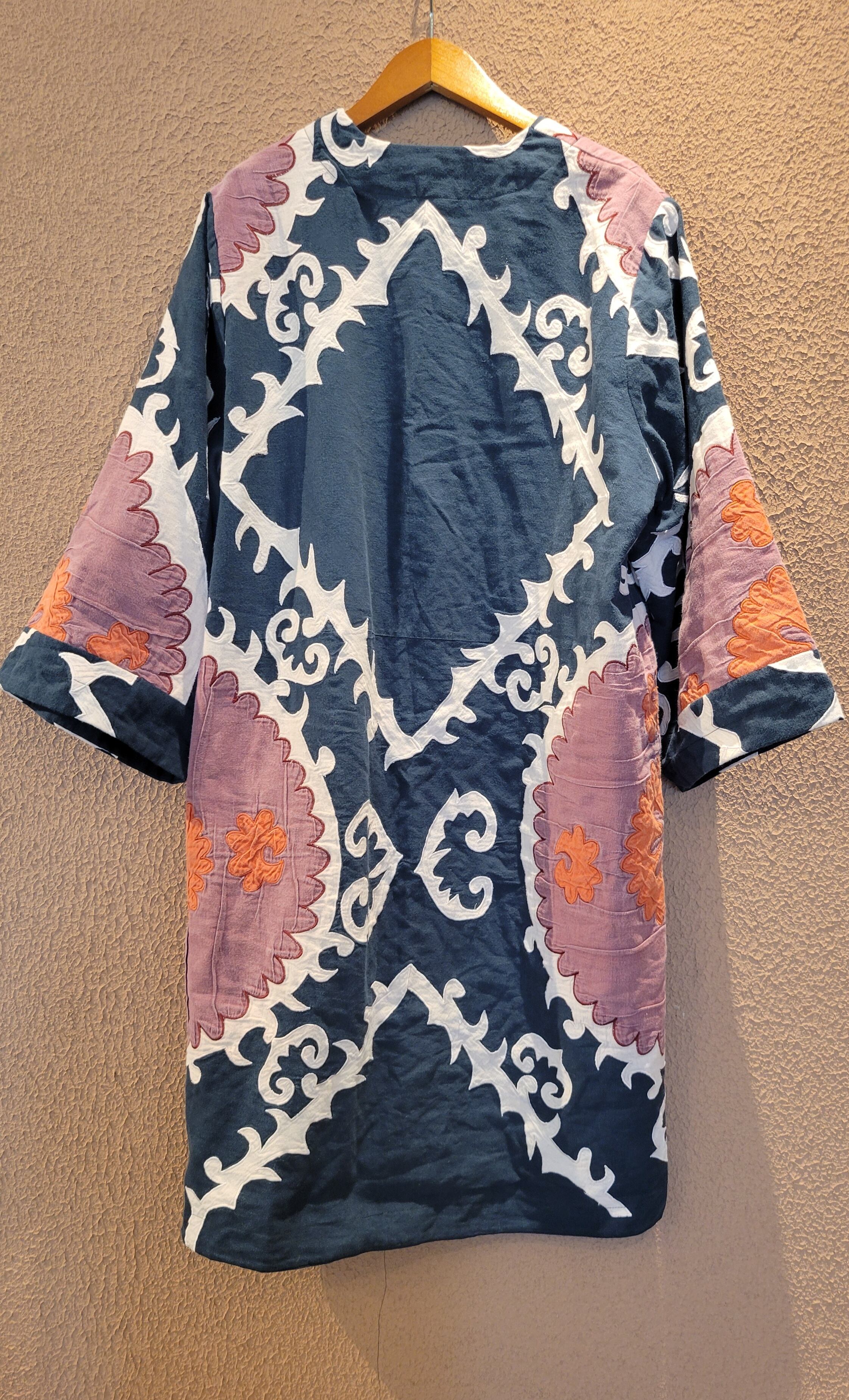インドの古いパッチワーク生地を使用したリメイクガウン。素材表記はありませんがコットンです。フロントオープンタイプ。さっと羽織るだけでスタイリングの格上げが叶います。厚手過ぎず薄手過ぎず長く着られる素材感。