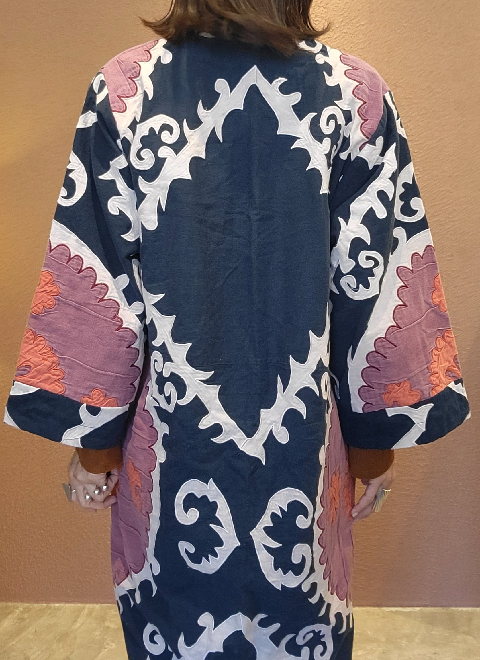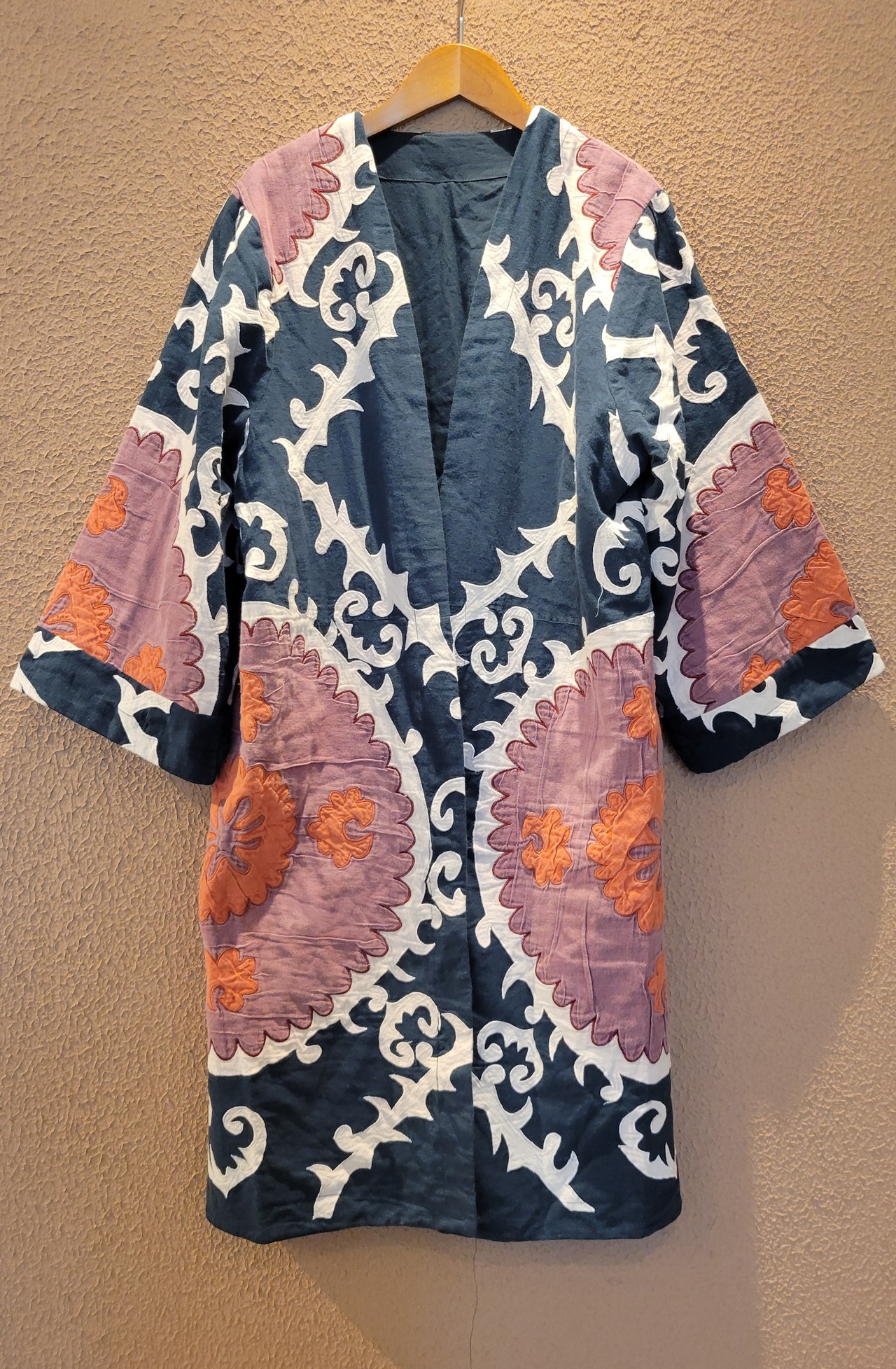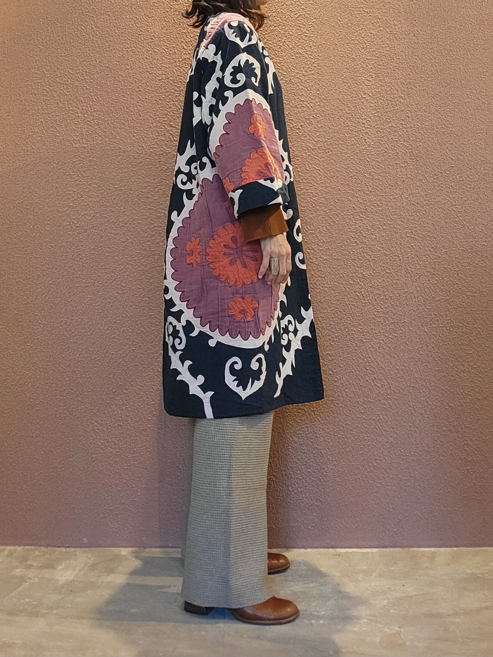 インドの古いパッチワーク生地を使用したリメイクガウン。素材表記はありませんがコットンです。フロントオープンタイプ。さっと羽織るだけでスタイリングの格上げが叶います。厚手過ぎず薄手過ぎず長く着られる素材感。