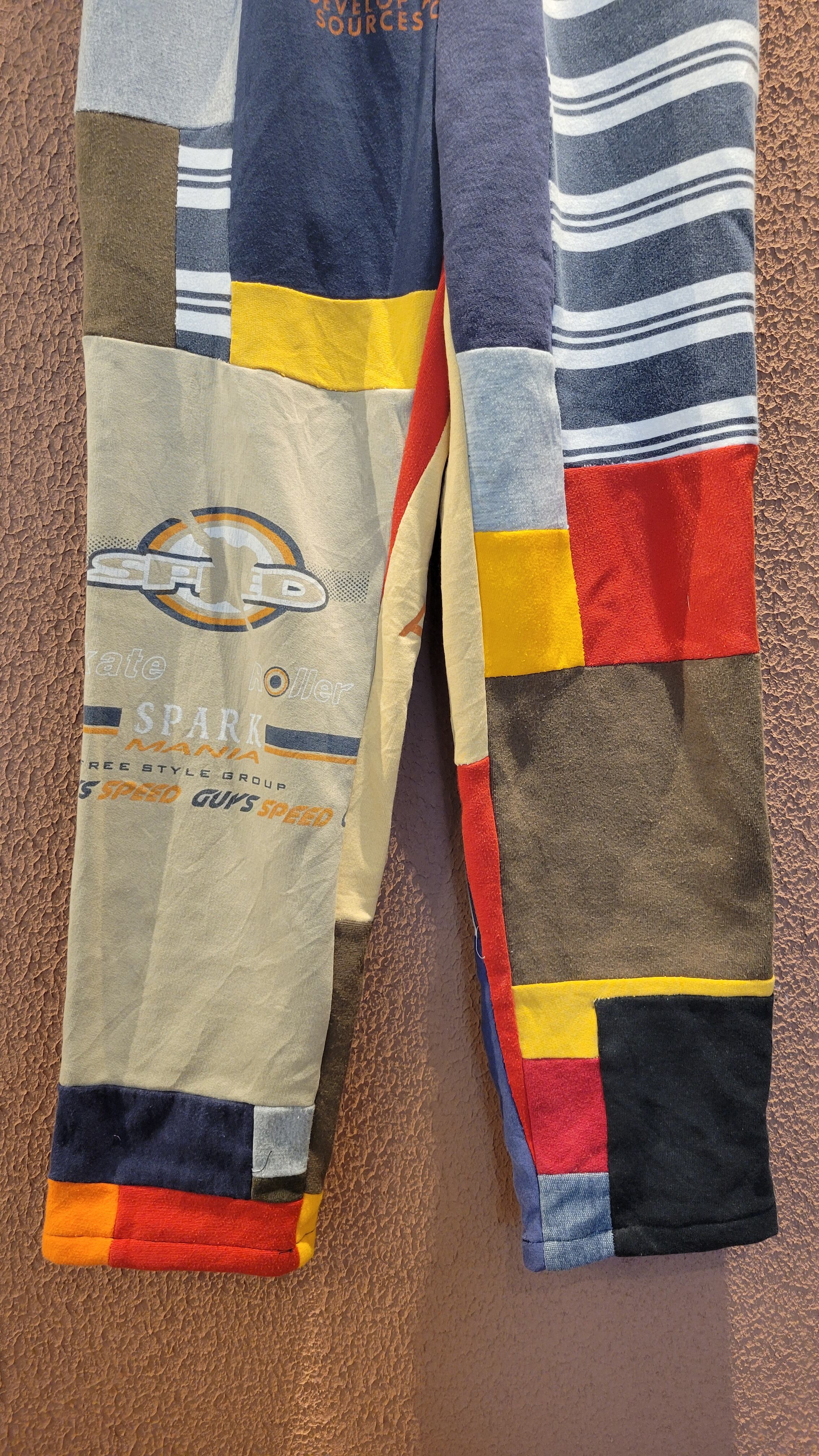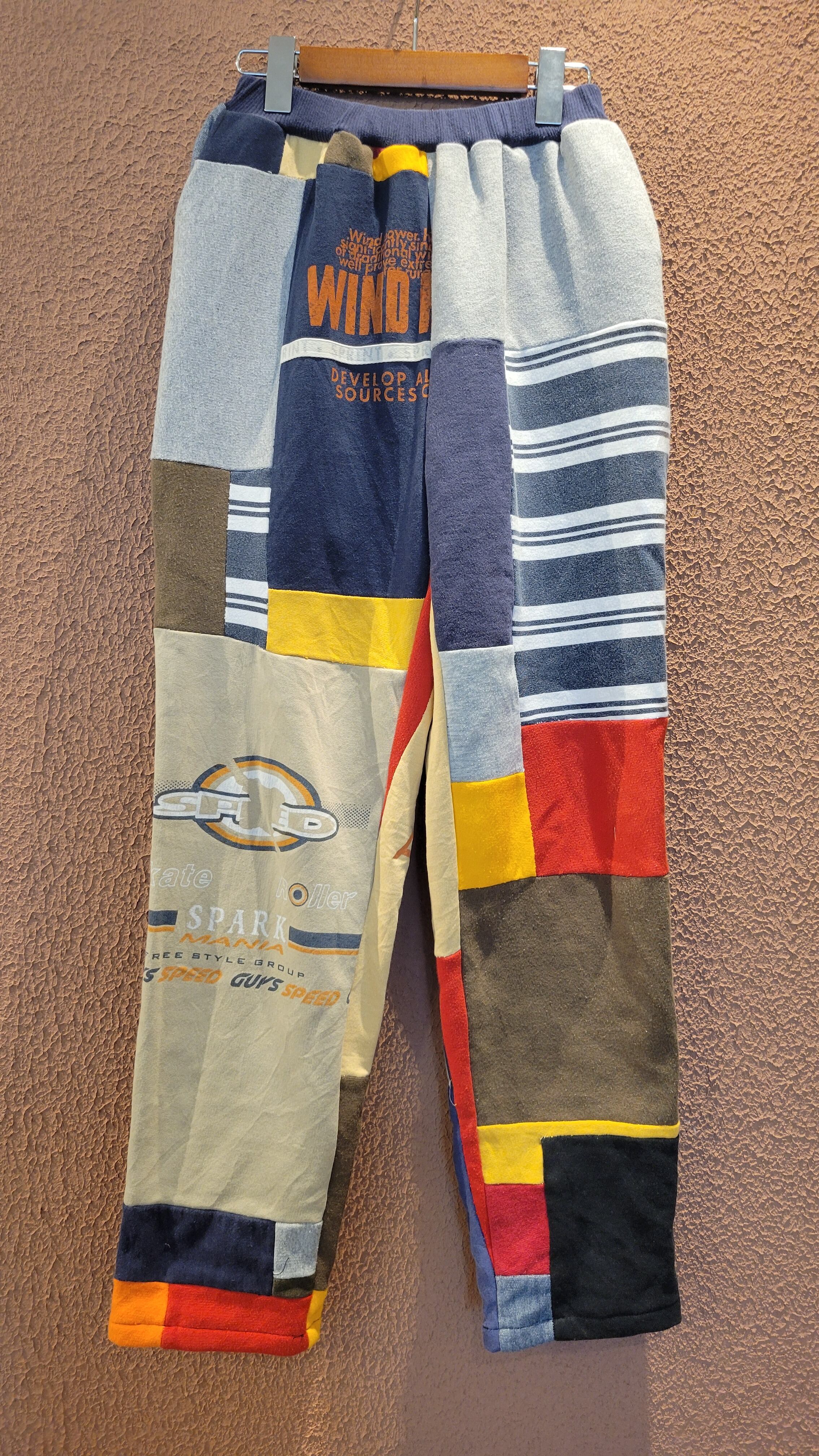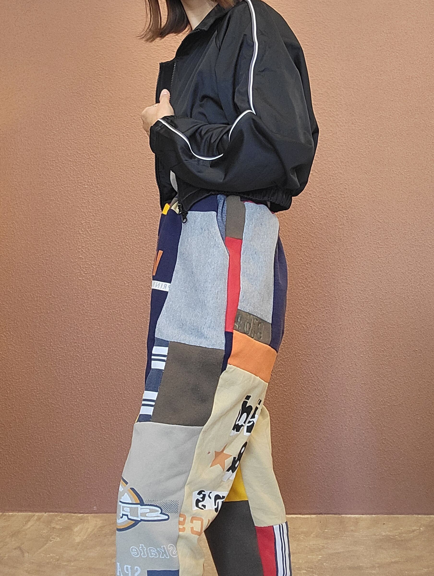 Usedのスウェットシャツをカットしパッチワークで繋ぎ合わせて仕立てたリメイクパンツ。ウエストゴム、左右ポケット付きです。腰回りはゆったり、裾に向かって細くなるテーパードシルエット。ストレスフリーな履き心地ながらも見た目はすっきり。移動の多い旅行にもぴったりです。足元はスニーカーはもちろん、パンプス合わせも素敵です。