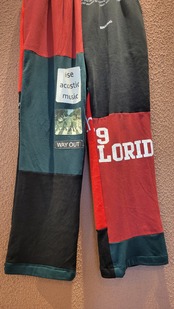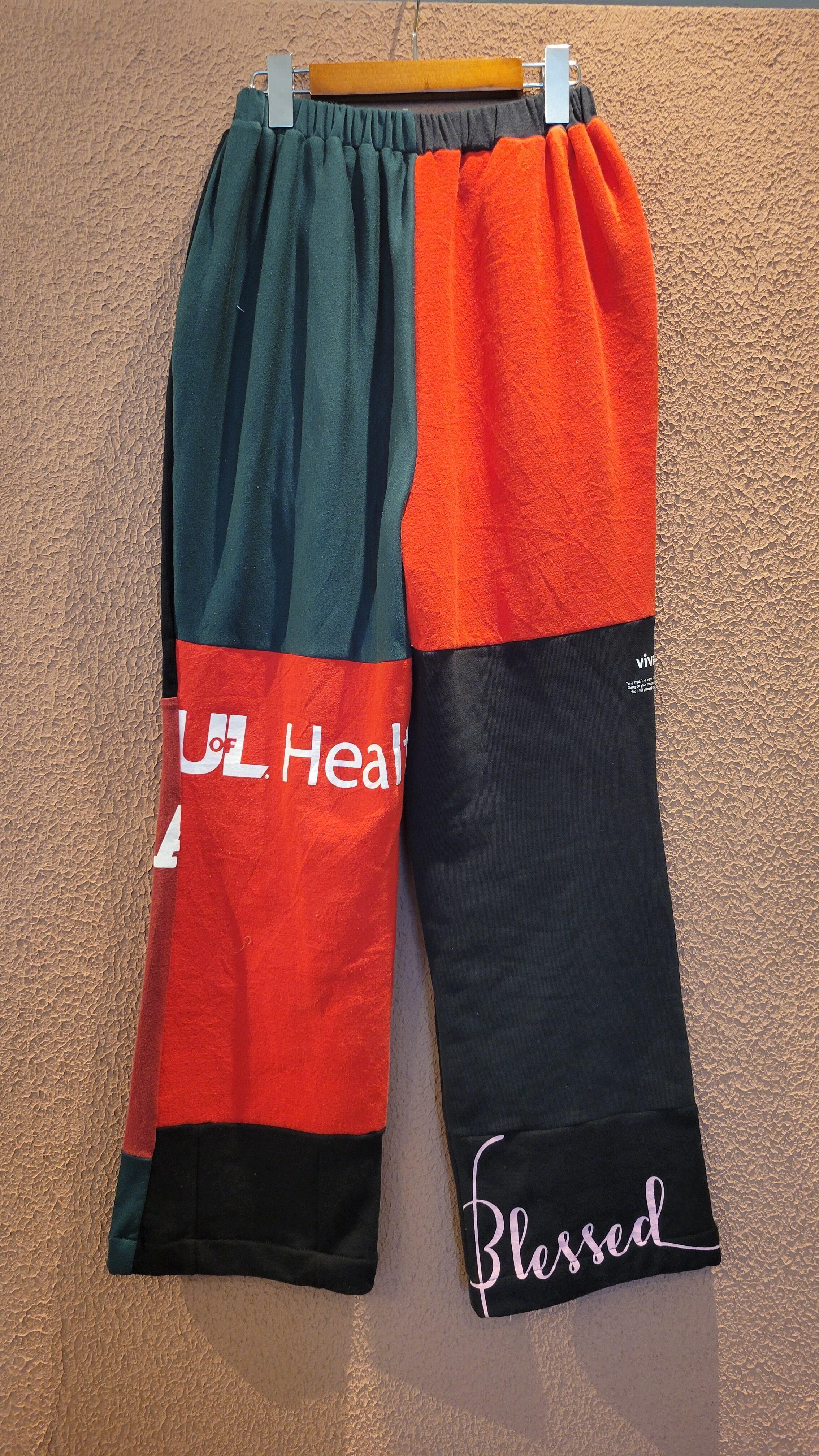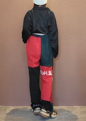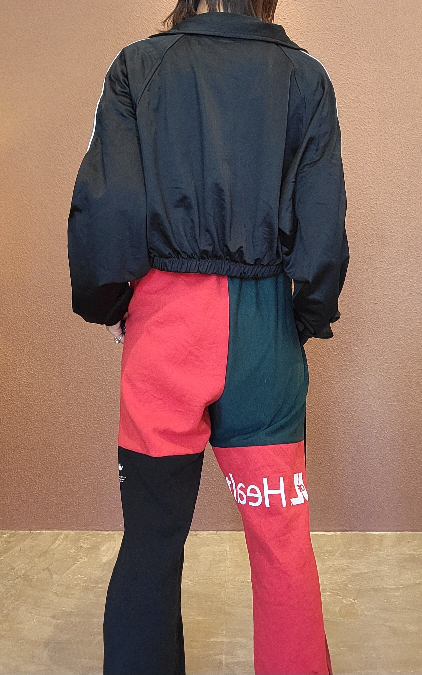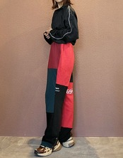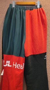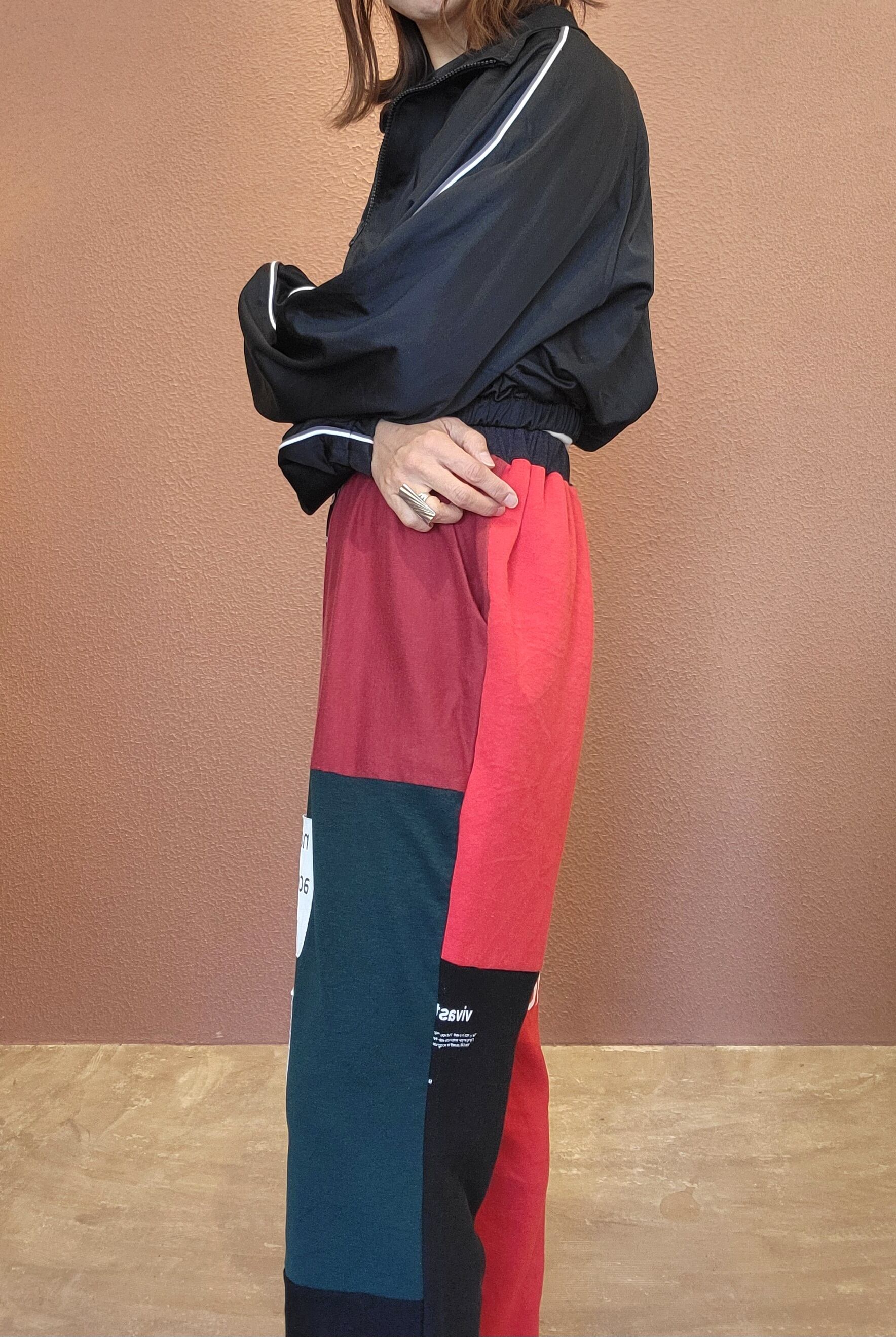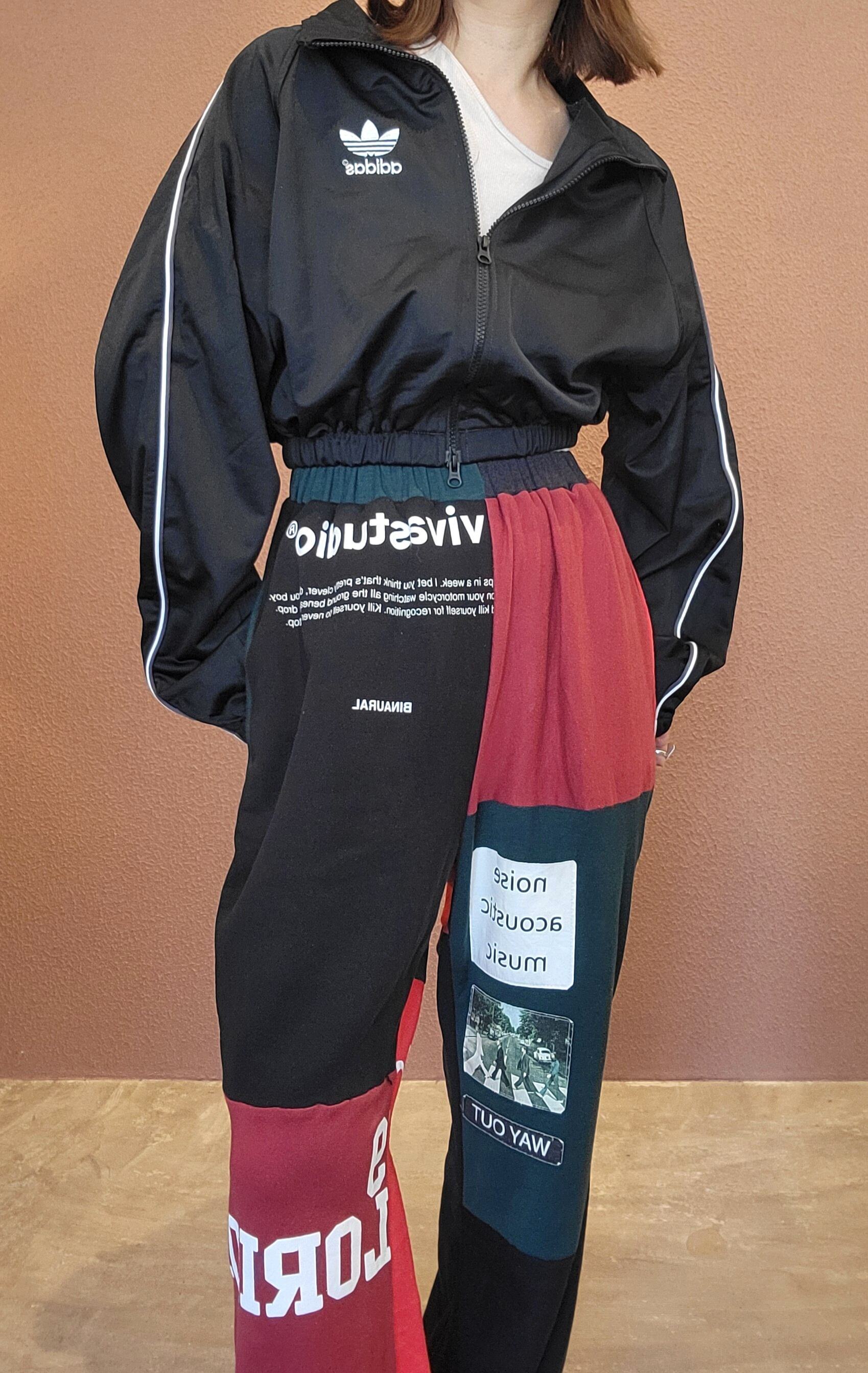 Usedのスウェットシャツをカットしパッチワークで繋ぎ合わせて仕立てたリメイクパンツ。ウエストゴム、左右ポケット付きです。腰回りはゆったり、裾に向かって細くなるテーパードシルエット。ストレスフリーな履き心地ながらも見た目はすっきり。移動の多い旅行にもぴったりです。足元はスニーカーはもちろん、パンプス合わせも素敵です。