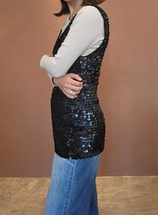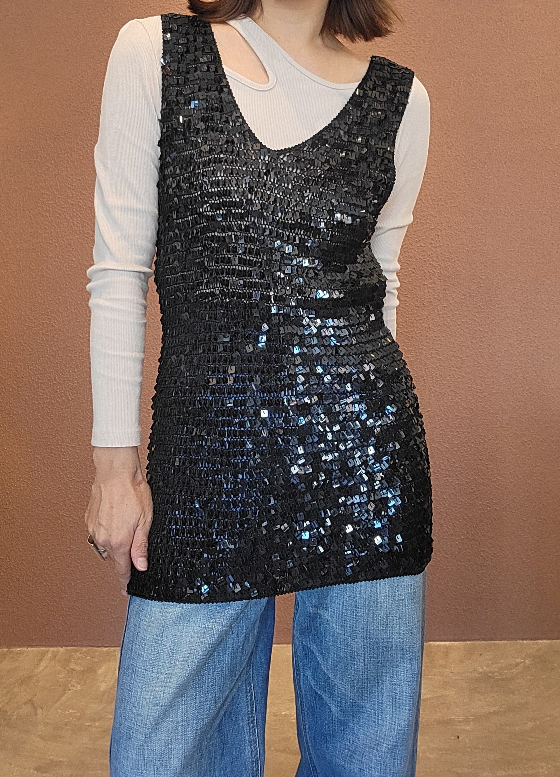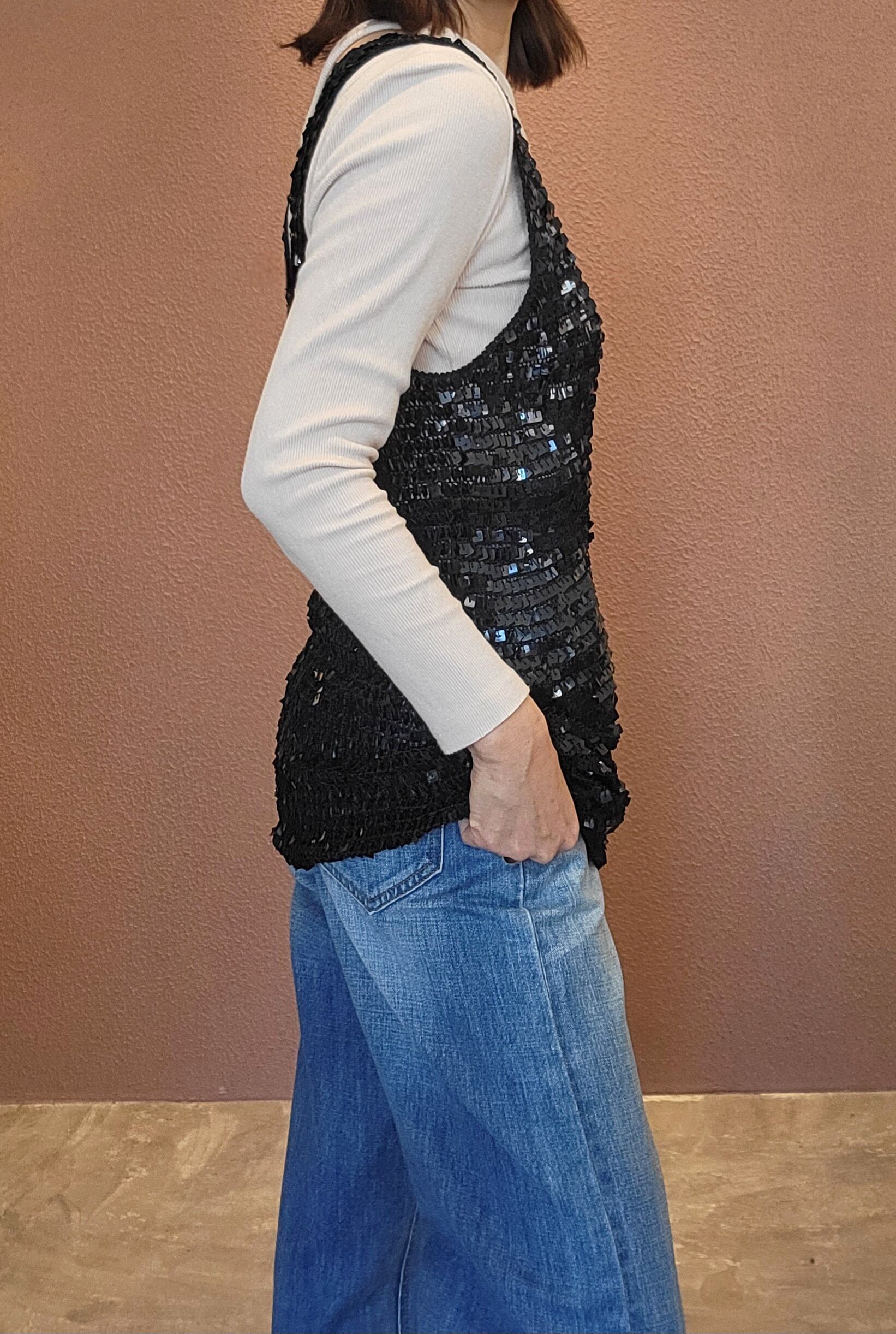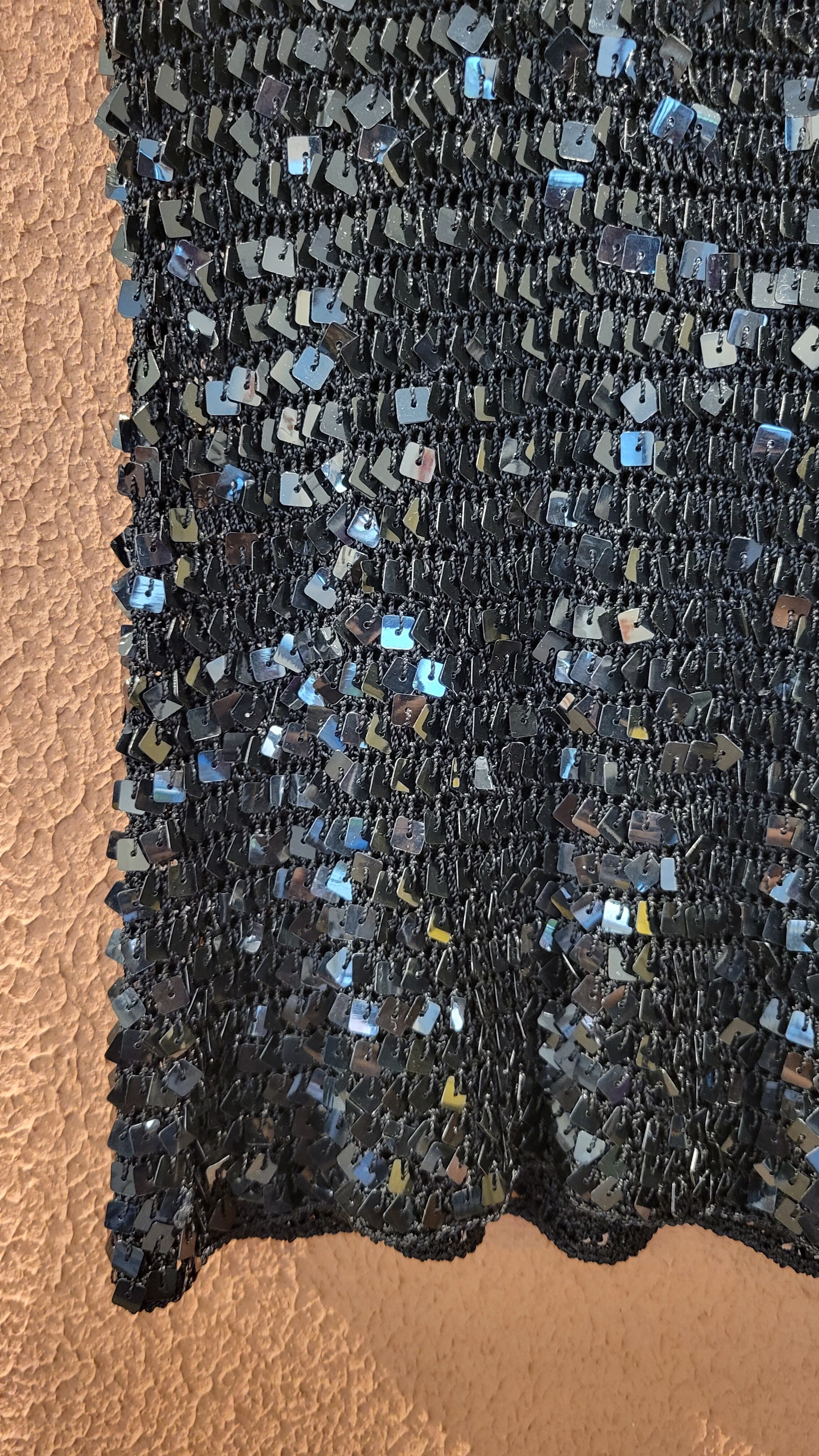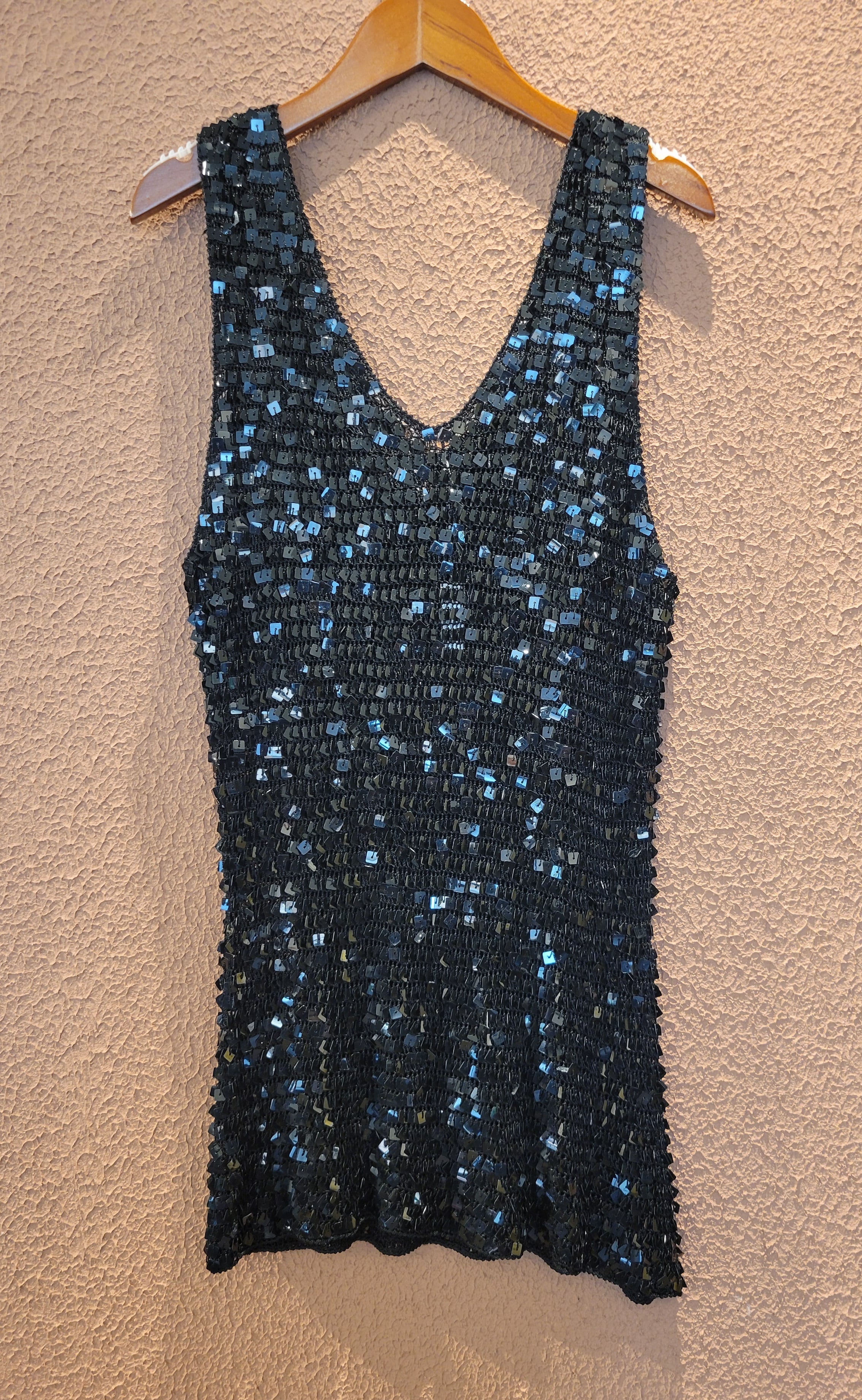 ヴィンテージのスパンコールニットトップス。クロシェ編みニットのベースにブラックのスパンコールが全面に施され、華やかながらもシックな1着です。伸縮性抜群で着心地がとても良いです。レイヤード使いで通年で色々なスタイリングでお楽しみいただけます。