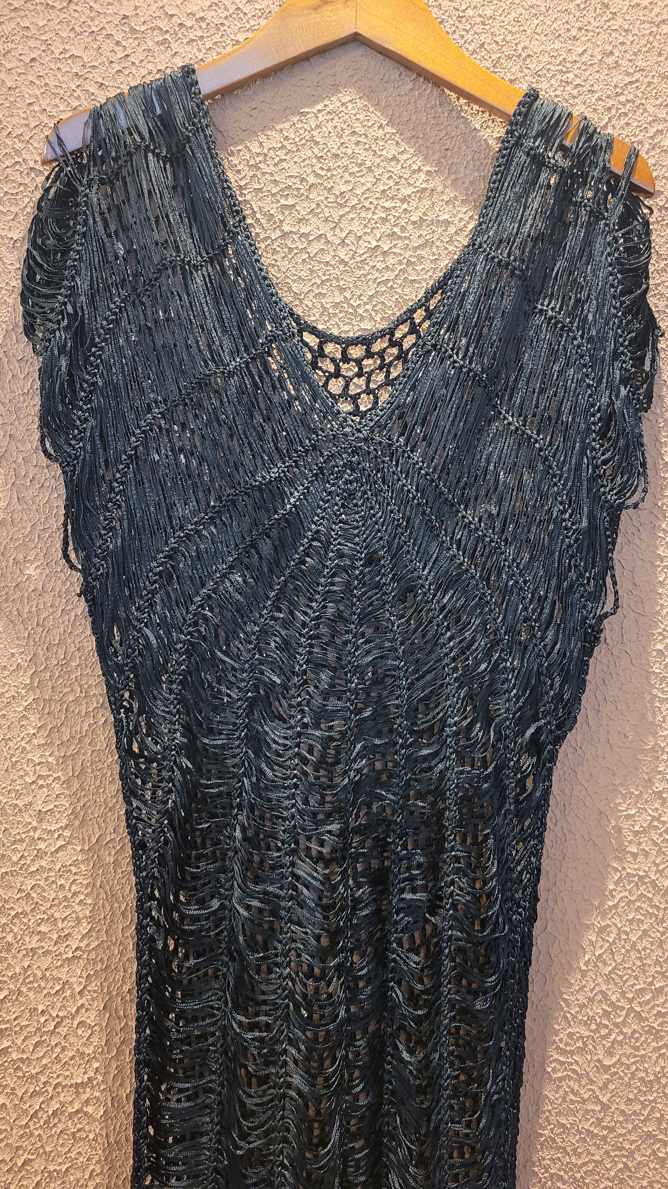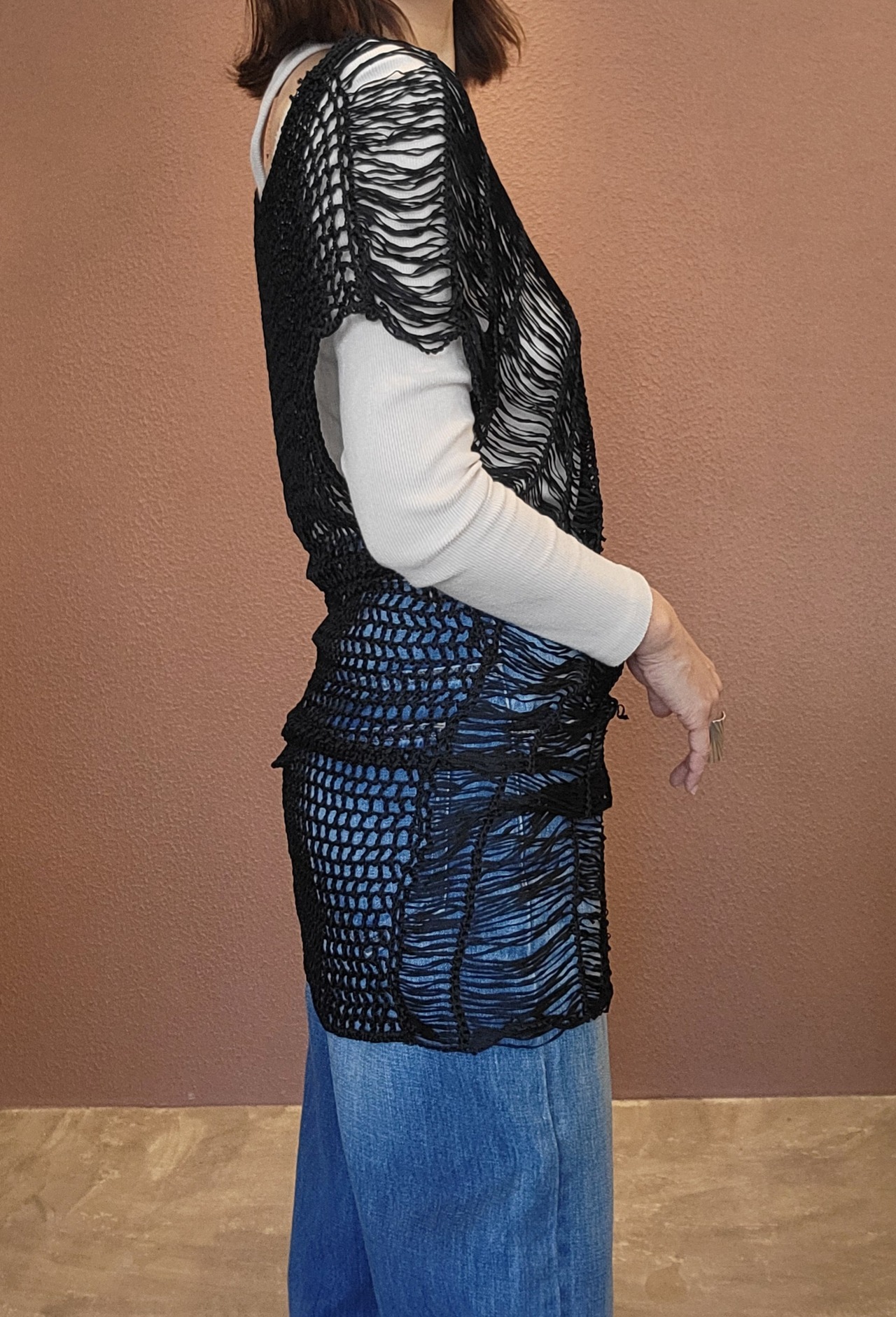 ヴィンテージの総クロシェニットトップス。素材表記はありませんがやや光沢げありツルッとした素材感で落ち感があります。前身ごろと後ろ身ごろで編み模様が異なり、華やかながらもシックな雰囲気。カジュアルにもドレスアップにも使えます。ニットやシャツなど色々なアイテムにレイヤードして通年でお楽しみいただけます。