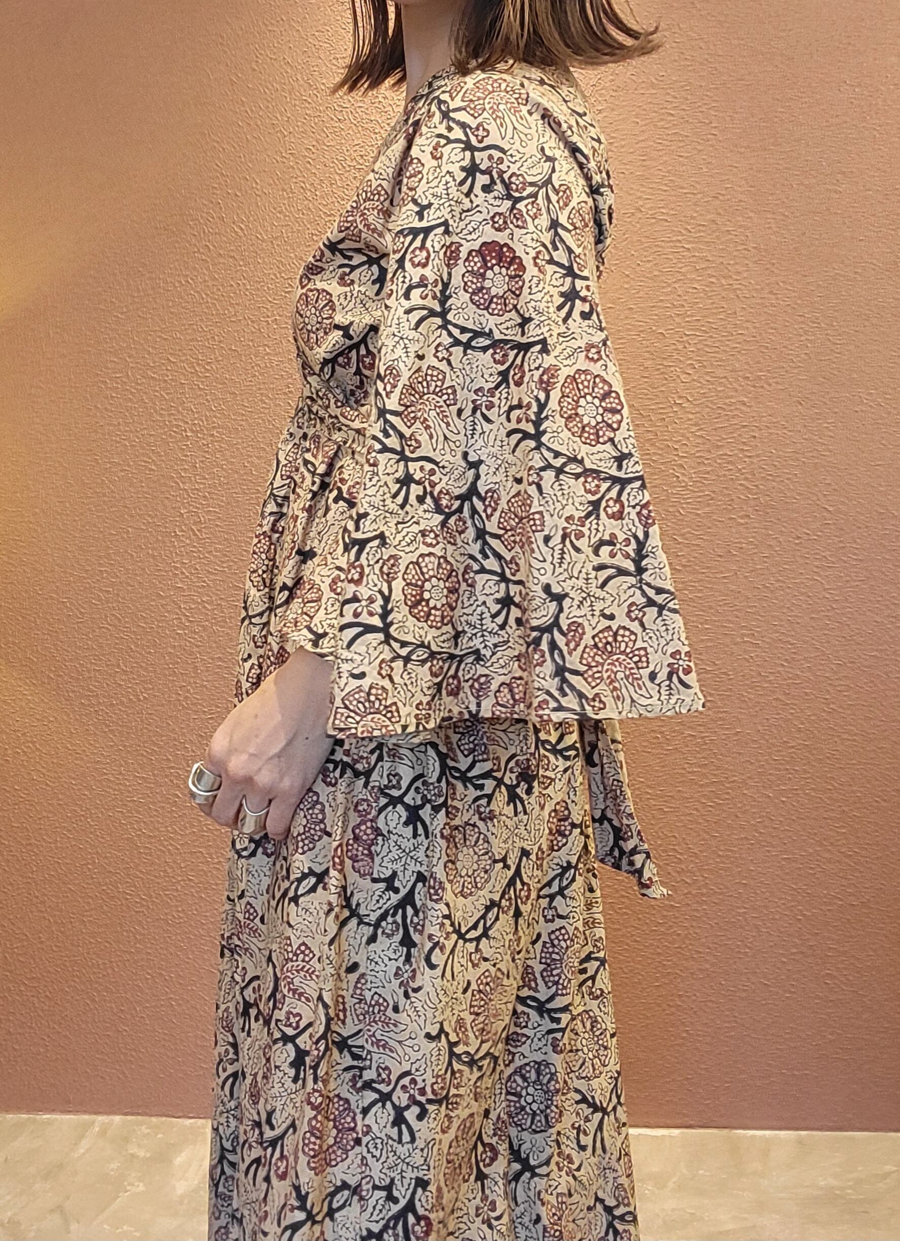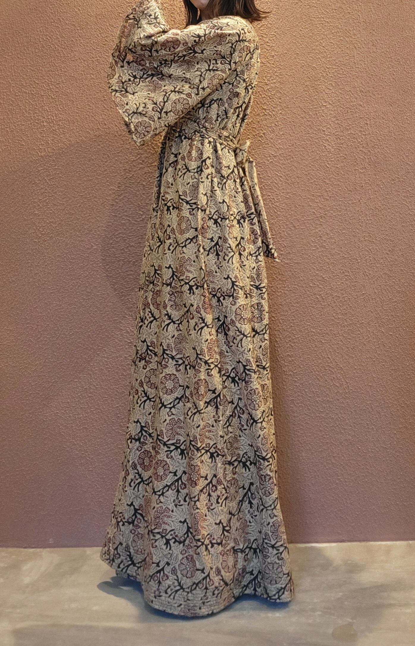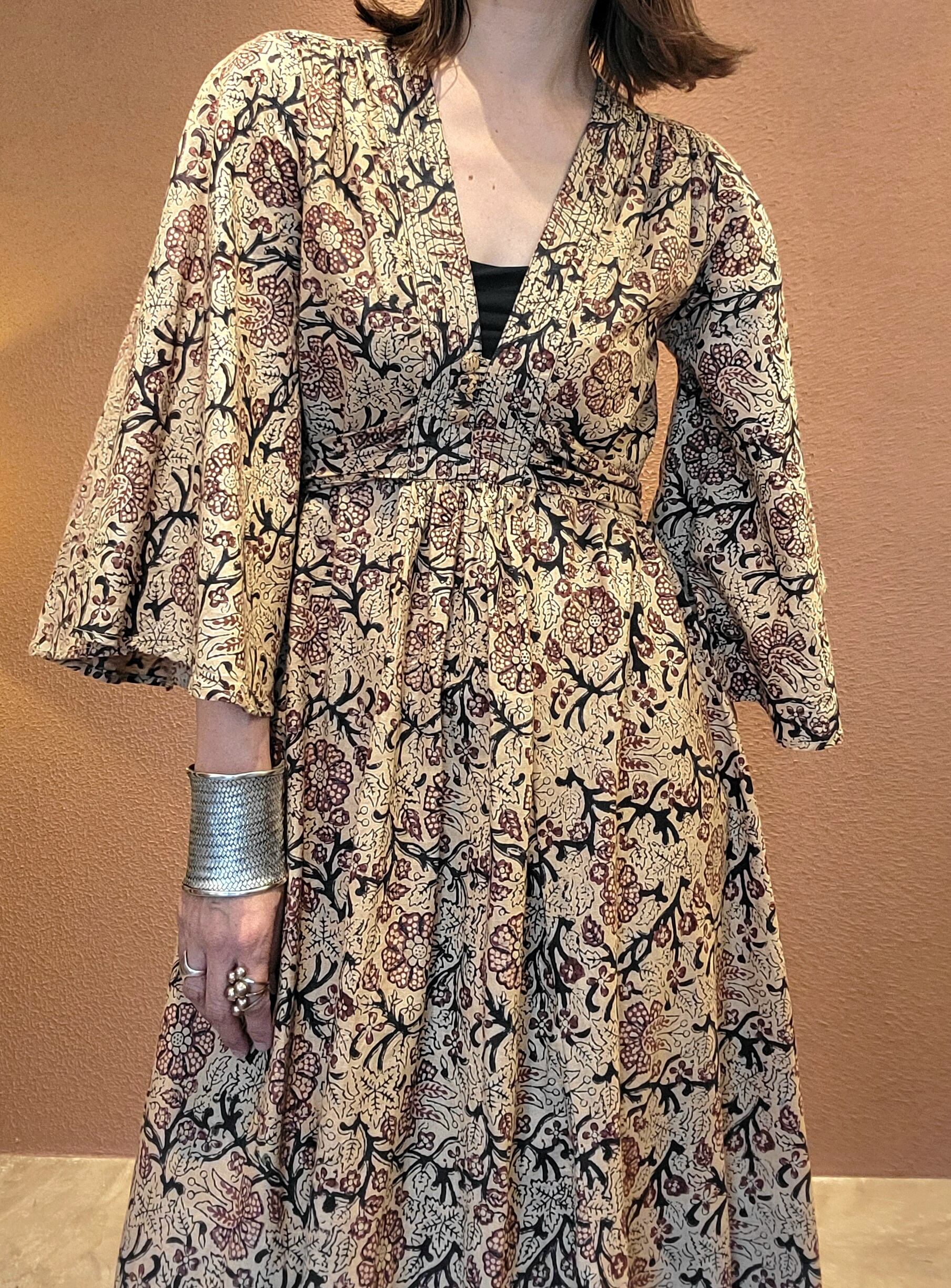 Made in Inidia コットンマキシワンピース。ヴィンテージのブロックプリント生地がたっぷり贅沢に使われれており圧巻の雰囲気です。着用感は見た目よりもゆったりしており、ウエストリボンをきゅっと絞ってスタイルアップが叶うデザインとなっています。Vネック、フレアスリーブ、Aラインシルエット、ハイウエスト位置のリボンなど、デザイン、コンディションともに優れた稀少な1枚です。