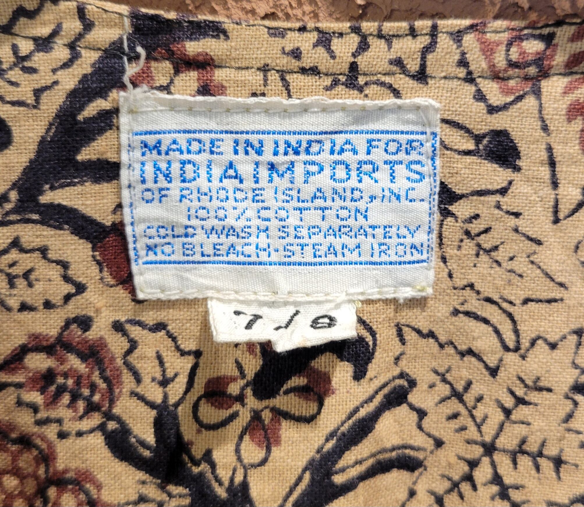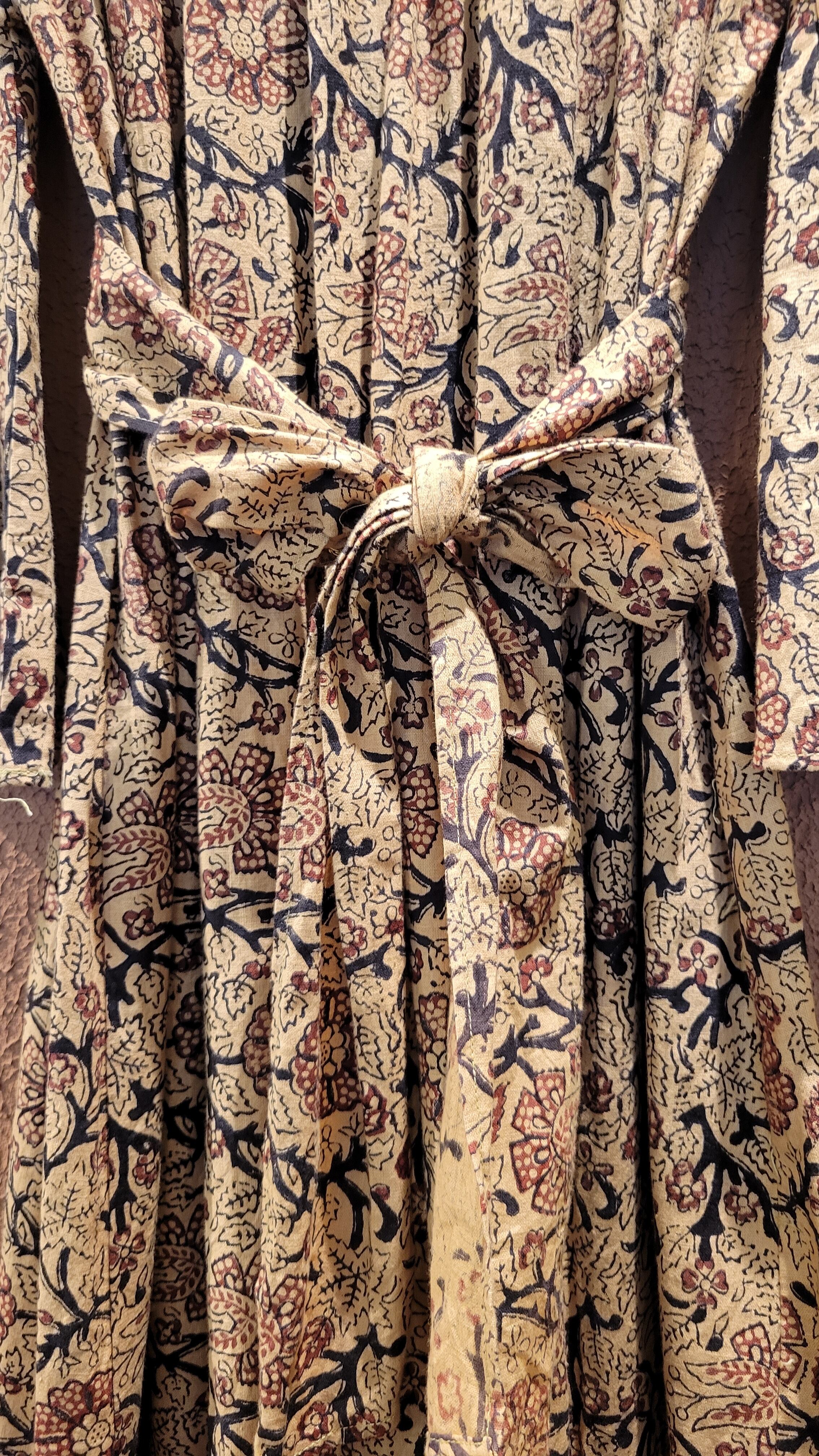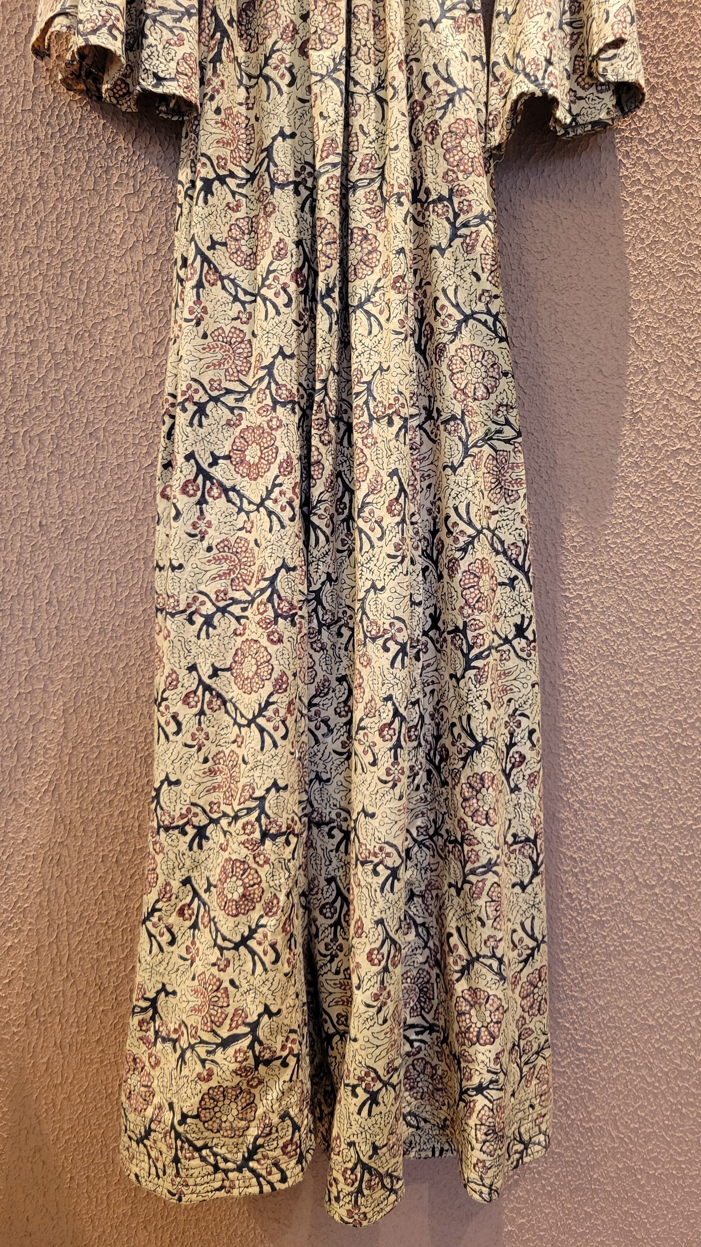 Made in Inidia コットンマキシワンピース。ヴィンテージのブロックプリント生地がたっぷり贅沢に使われれており圧巻の雰囲気です。着用感は見た目よりもゆったりしており、ウエストリボンをきゅっと絞ってスタイルアップが叶うデザインとなっています。Vネック、フレアスリーブ、Aラインシルエット、ハイウエスト位置のリボンなど、デザイン、コンディションともに優れた稀少な1枚です。
