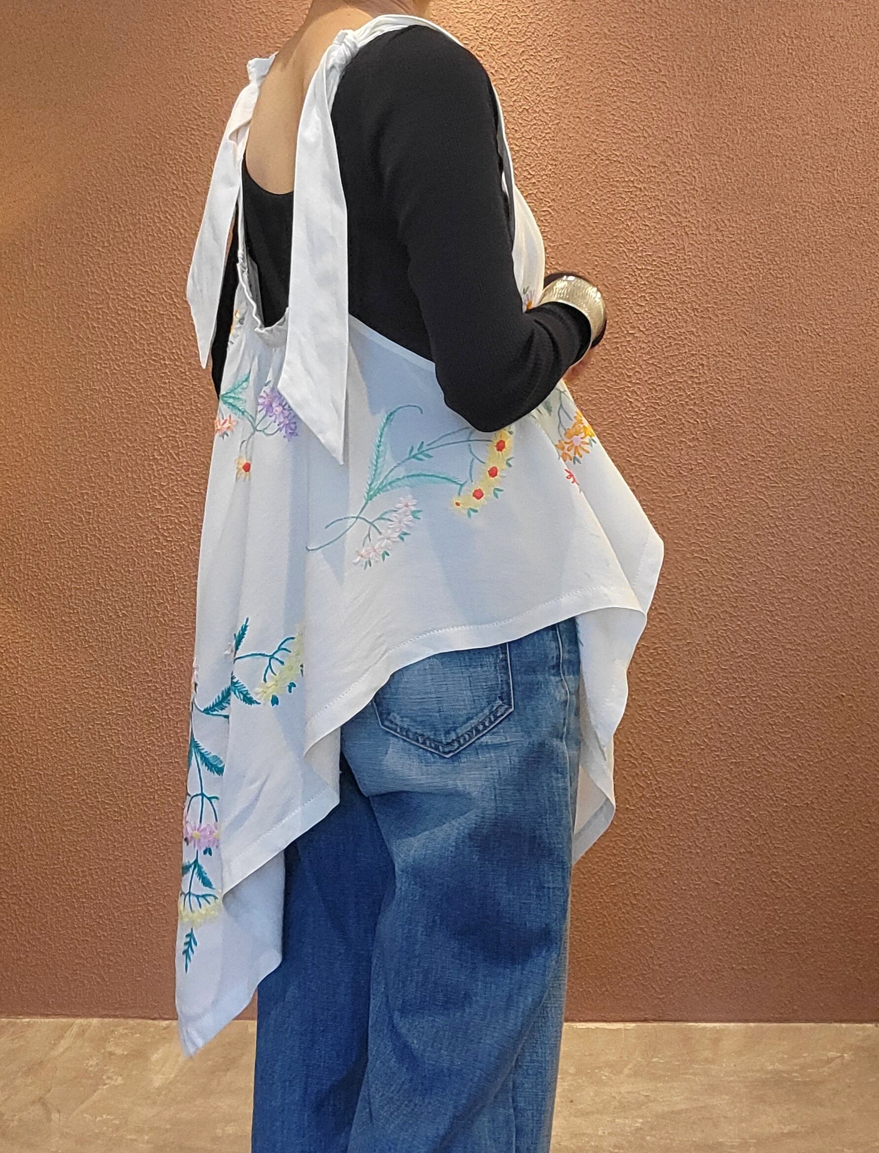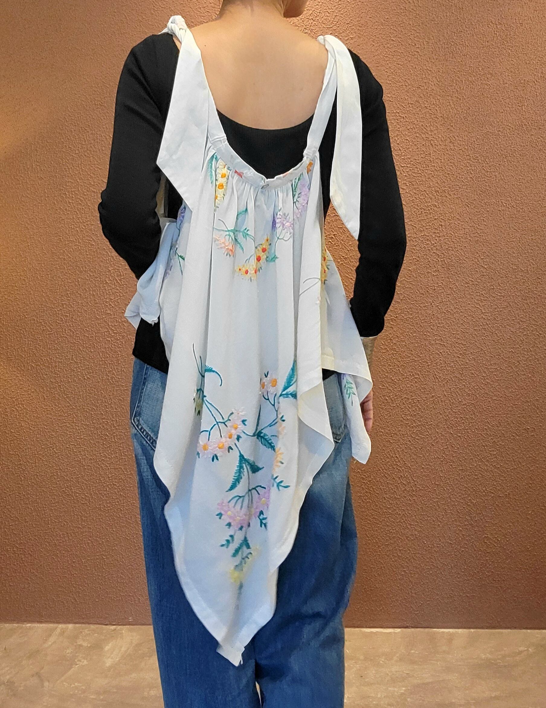 ヴィンテージの刺繍生地を使用したリメイクトップス。素材表記はありませんがコットンのようです。肩紐はお好きな位置で結べるので着丈の調節が可能です。前後どちらでも着用可能。動きに合わせて揺れるたっぷりのフレアが美しい1枚。