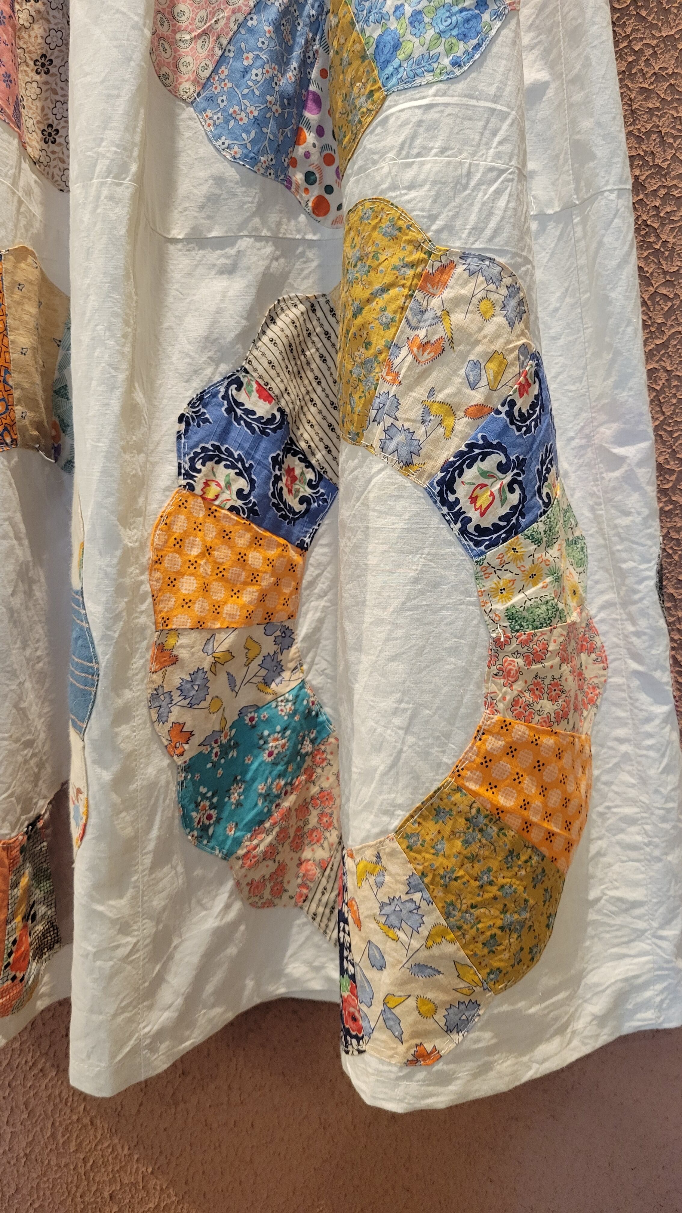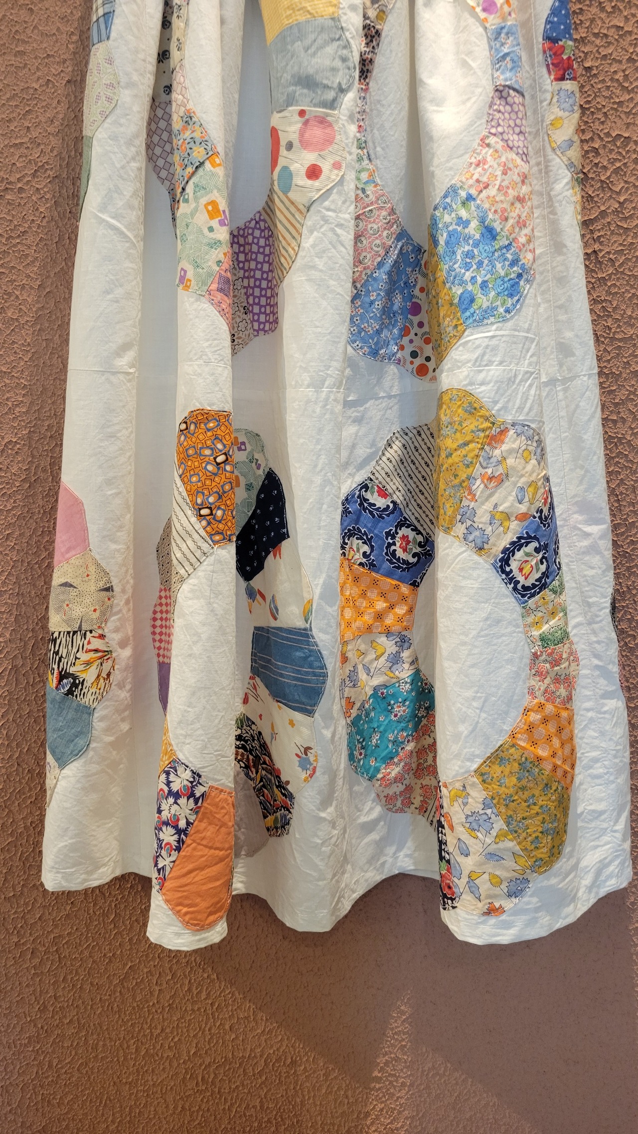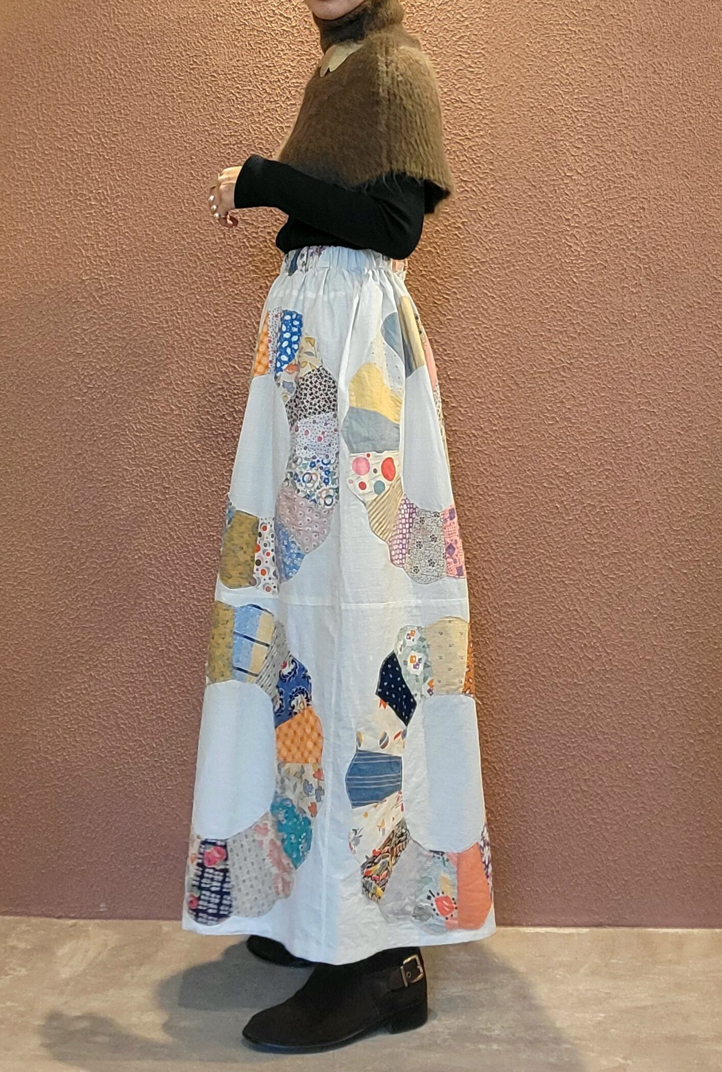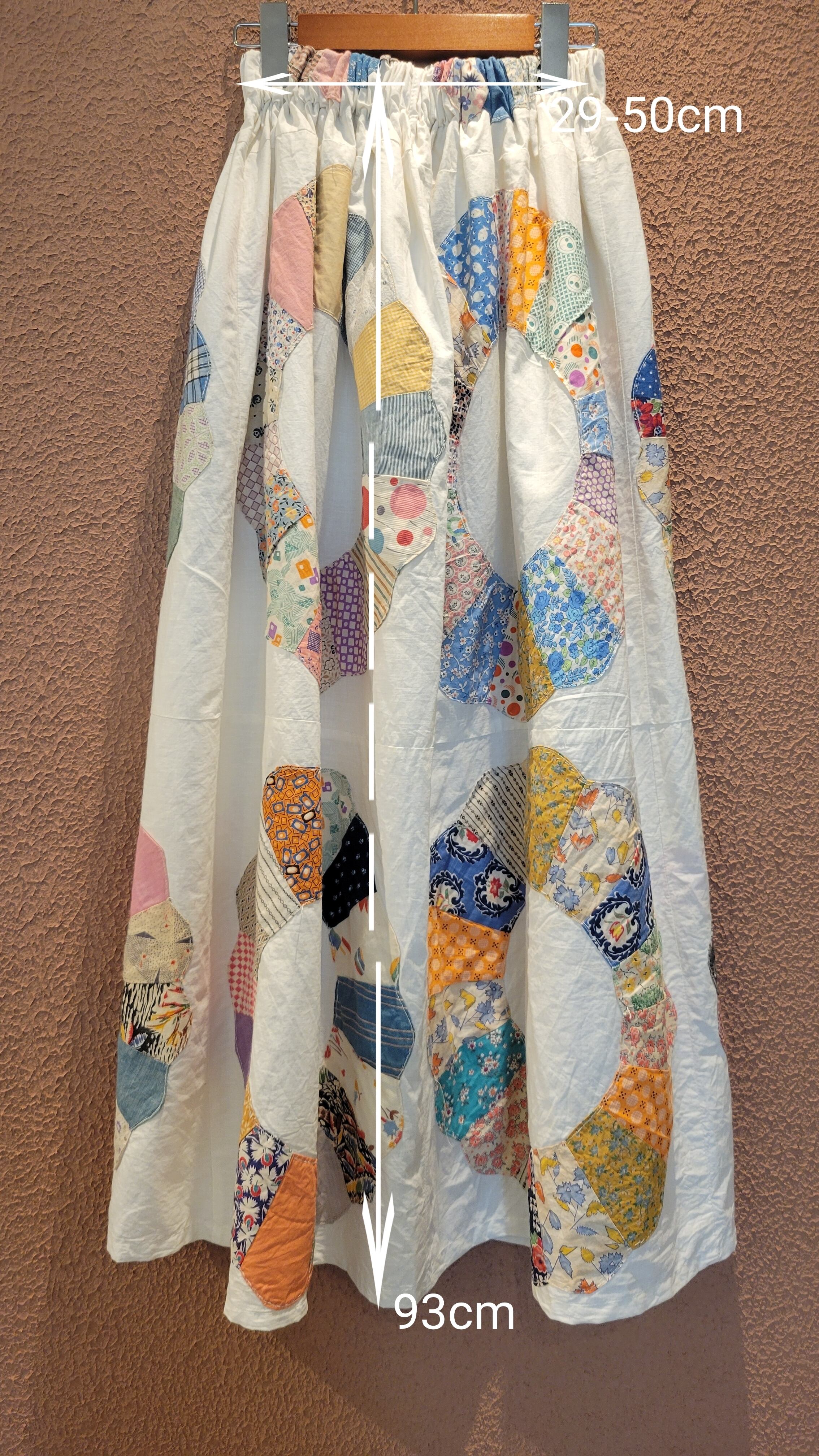 ヴィンテージのパッチワークキルト生地を使用したリメイクスカート。素材表記はありませんがコットンのようです。ウエストゴム。軽量、ふんわりシルエット。ひとつひとの布片の色柄も可愛く、デニム等パンツにオーバースカートとしてはいても可愛いです。*生地に色移りのある箇所があります。画像でご確認ください。