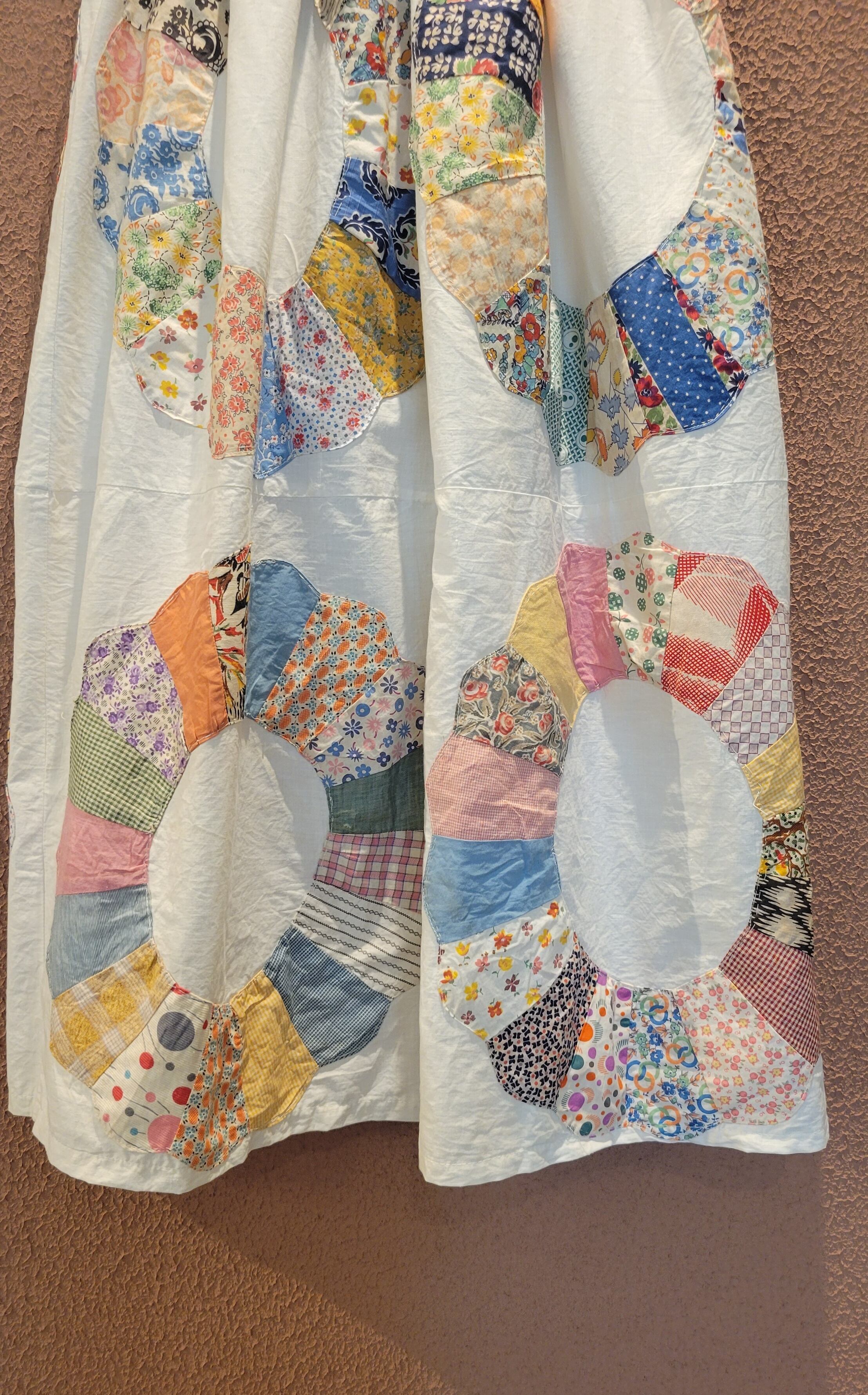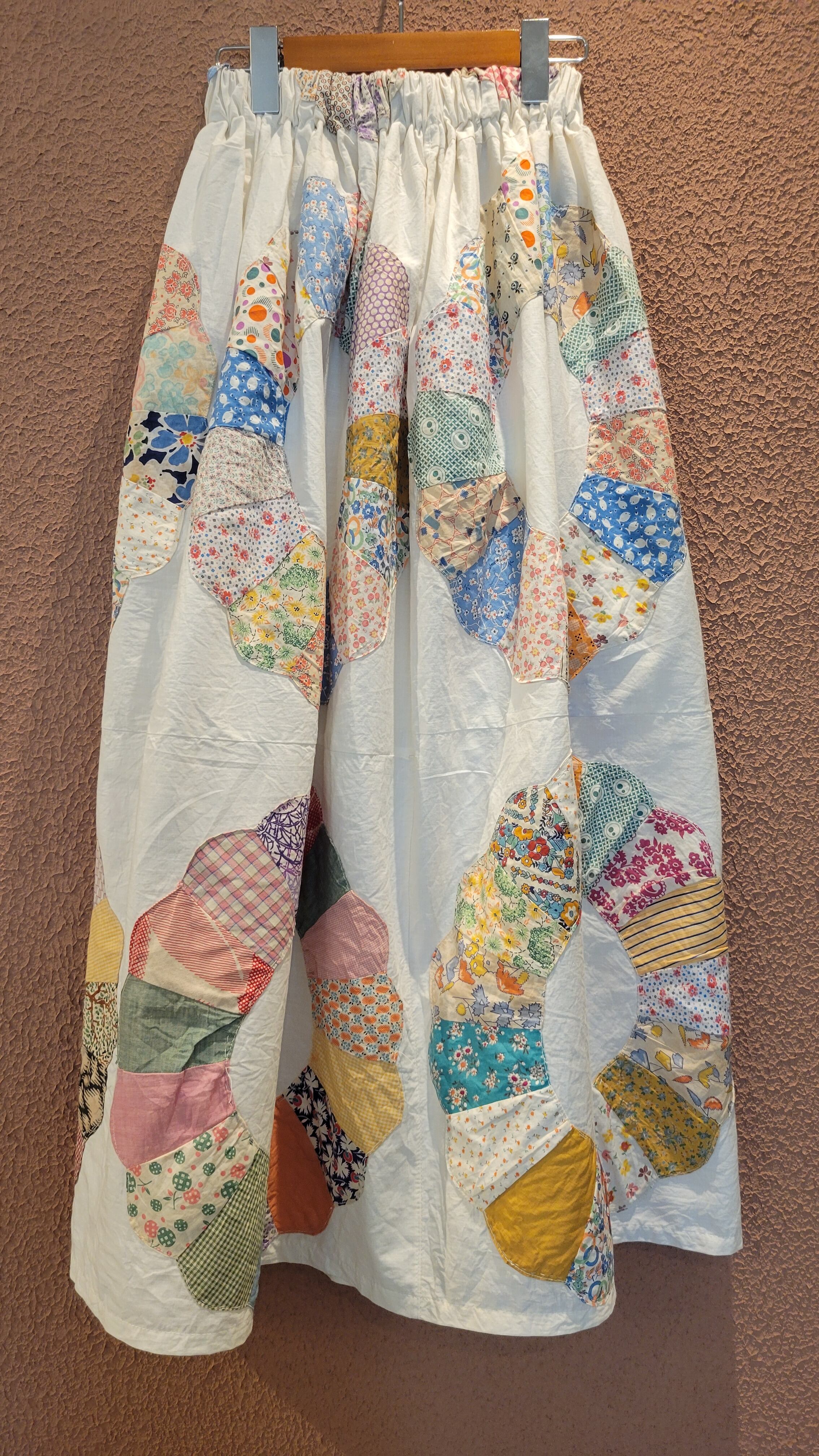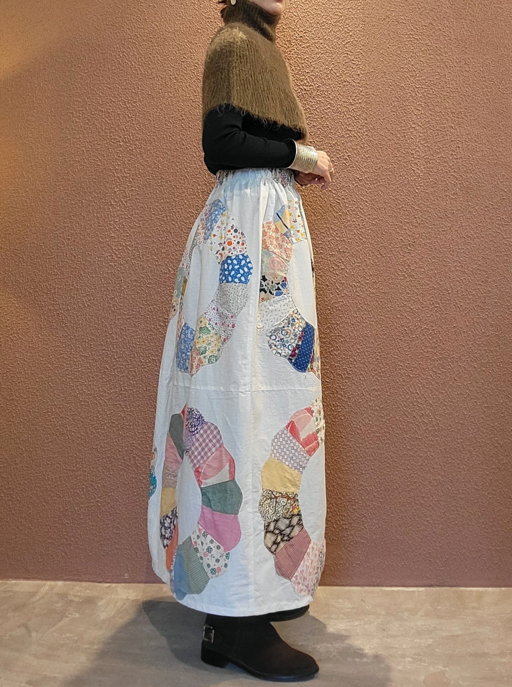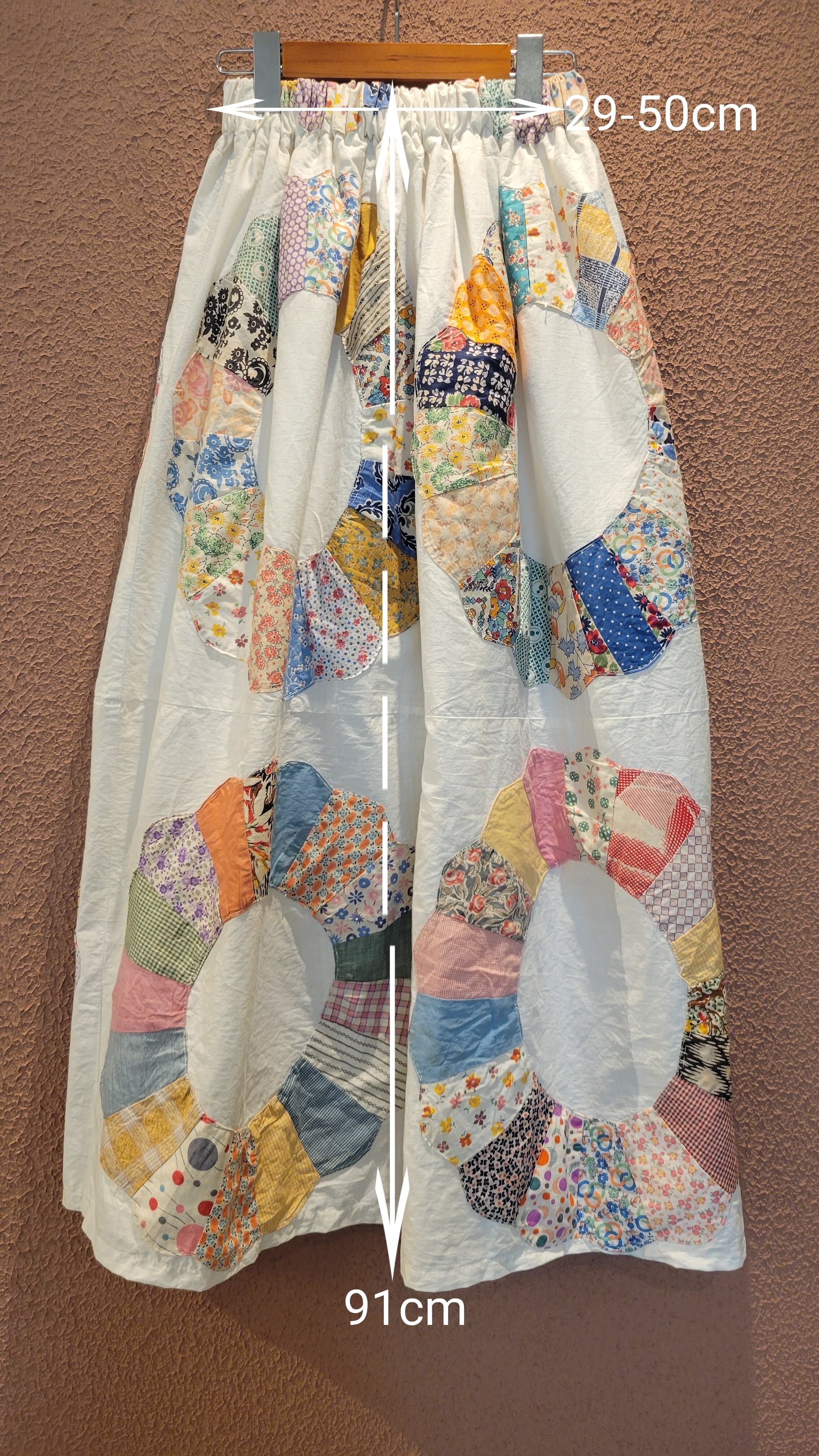 ヴィンテージのパッチワークキルト生地を使用したリメイクスカート。素材表記はありませんがコットンのようです。ウエストゴム。軽量、ふんわりシルエット。ひとつひとの布片の色柄も可愛く、デニム等パンツにオーバースカートとしてはいても可愛いです。
