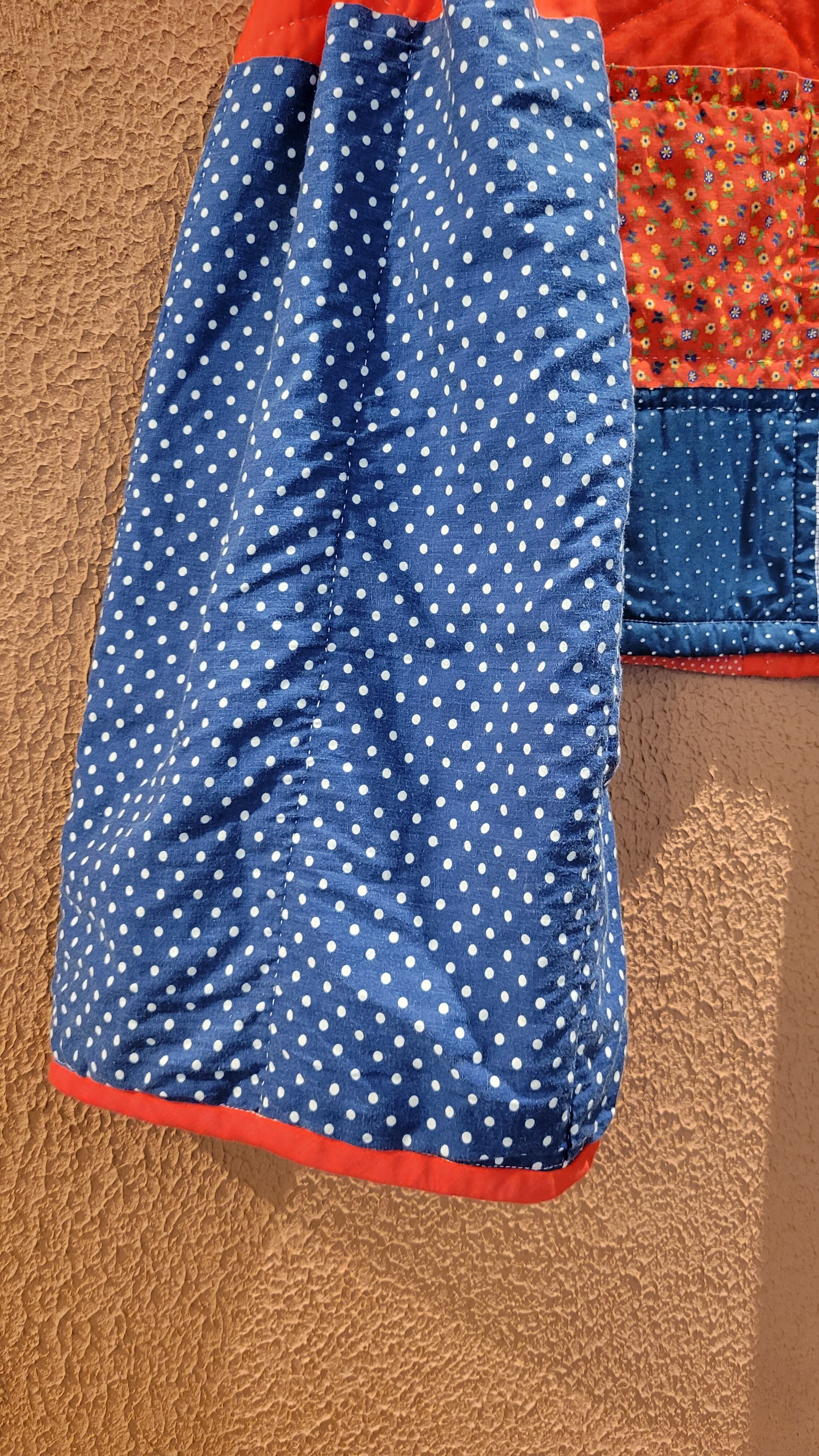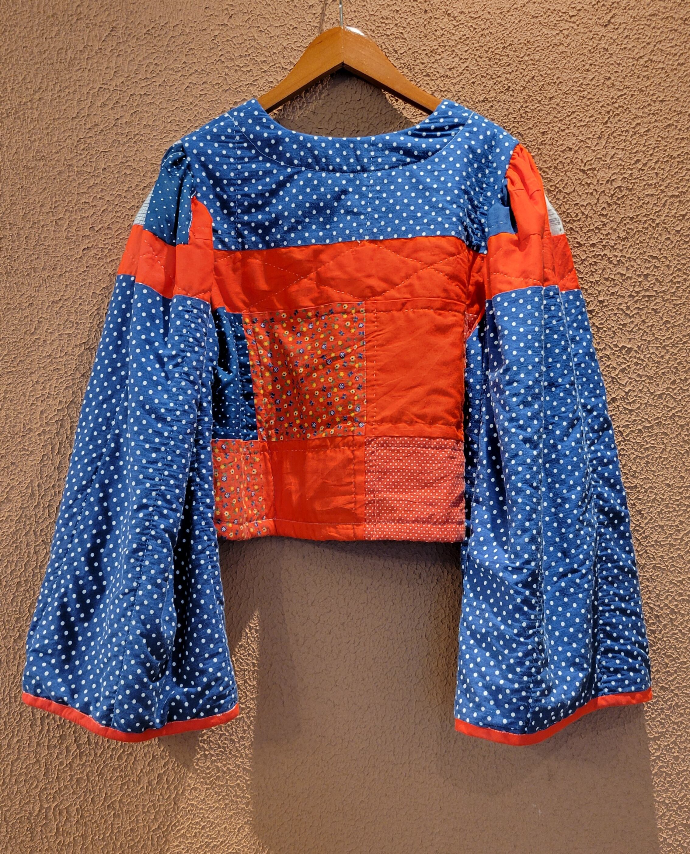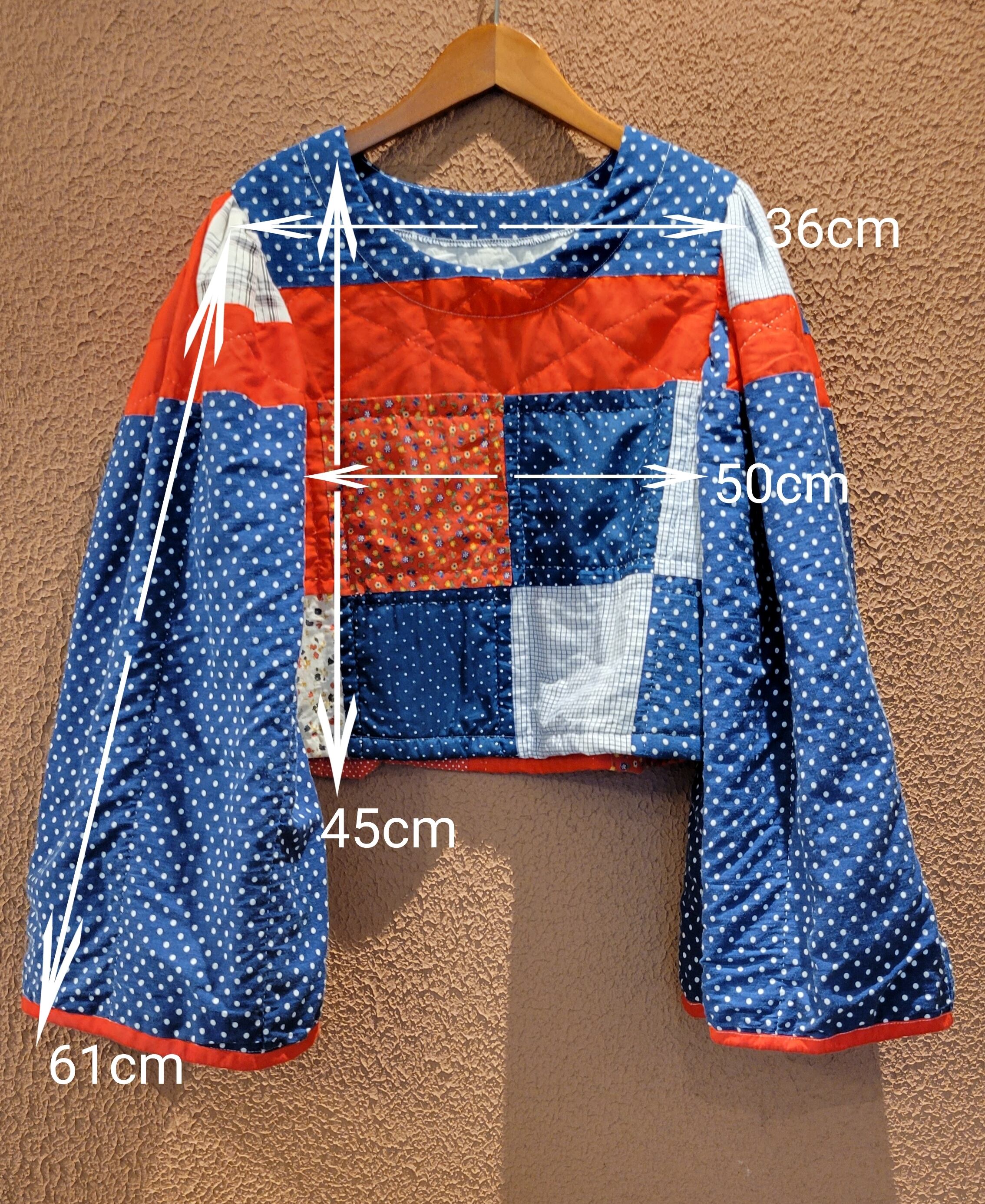 ヴィンテジのキルト生地を使用したリメイクトップス。素材表記はありませんが薄手の中綿入りコットンです。パッチワークの柄はプリントです。頭から被るように着用するプルオーバータイプ。ワイドスリーブが個性の際立つ1着です。