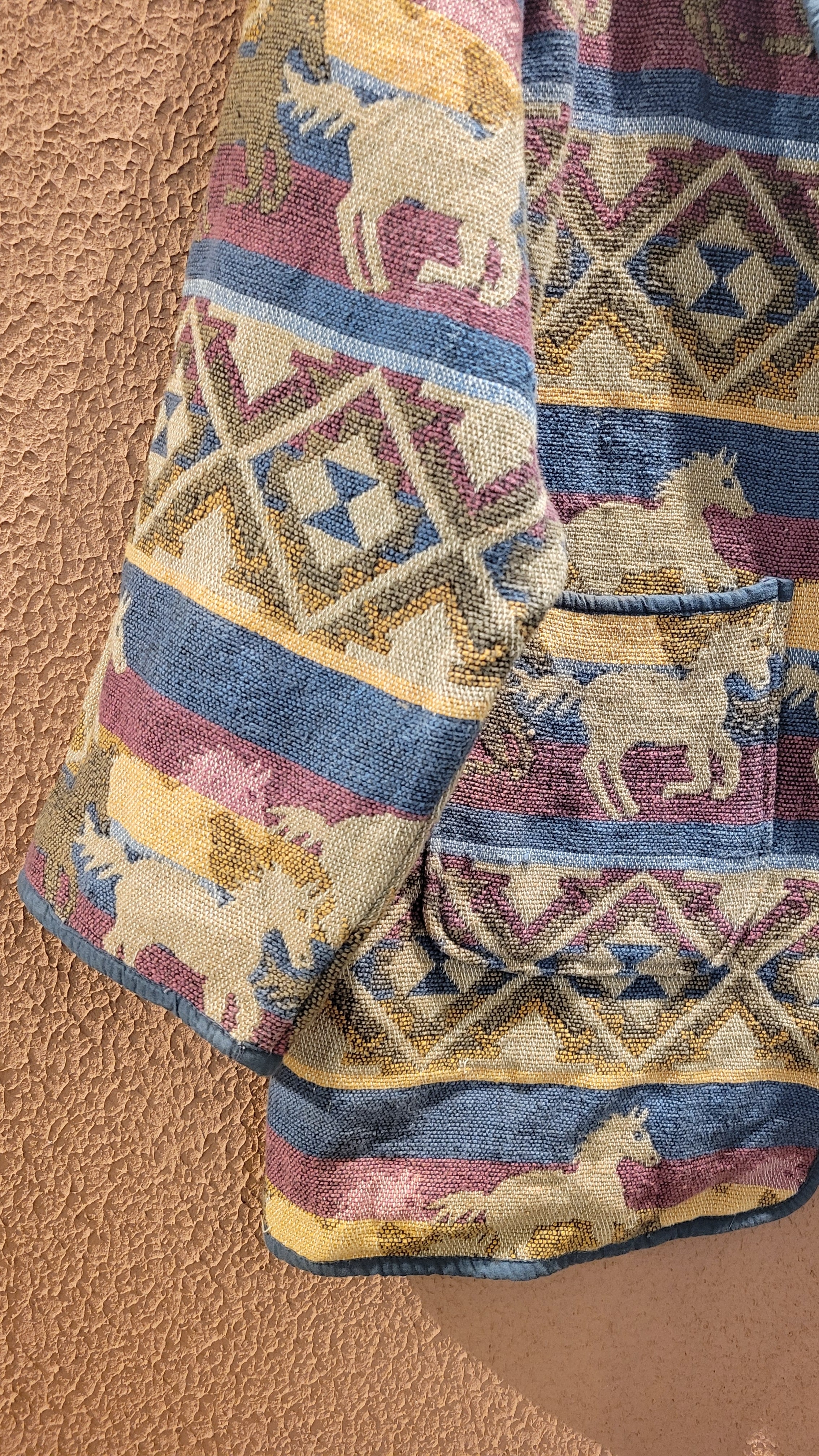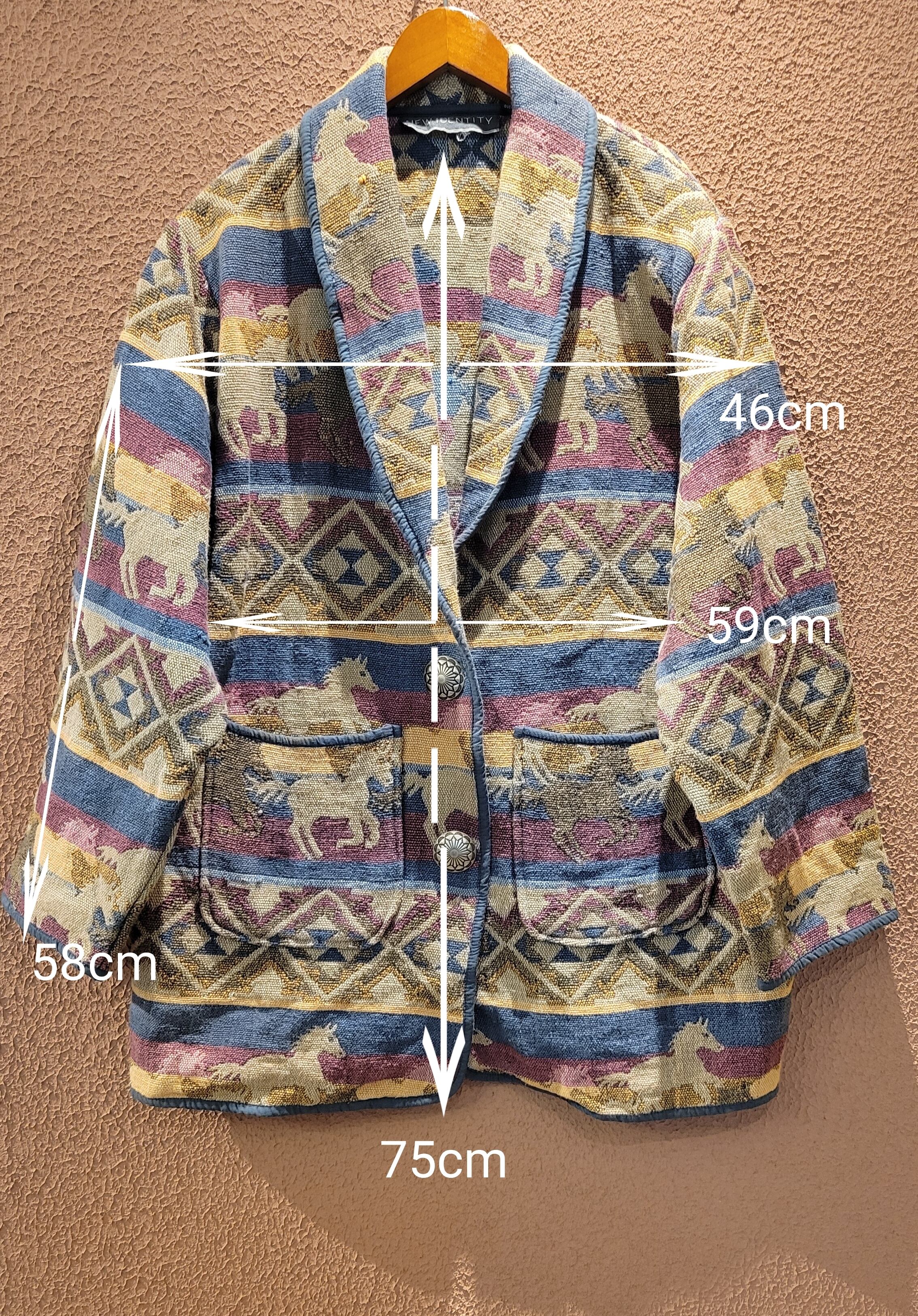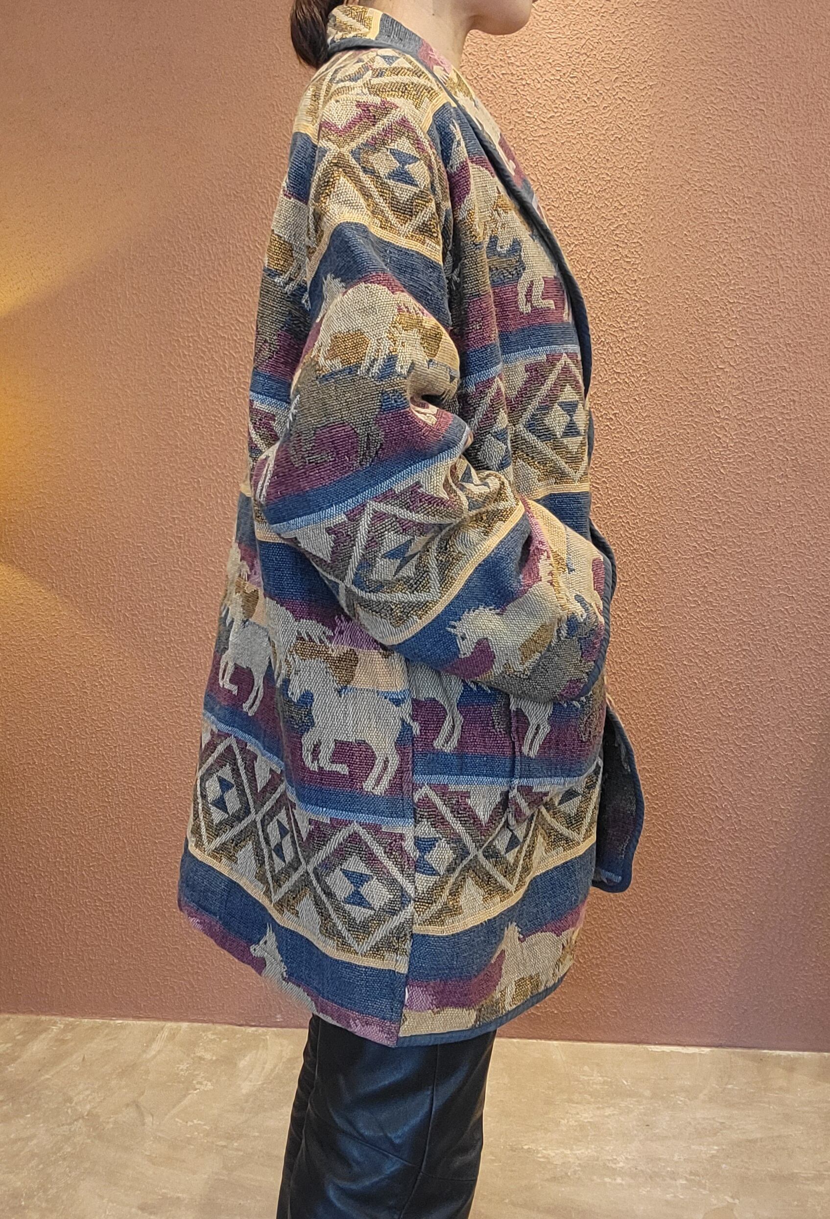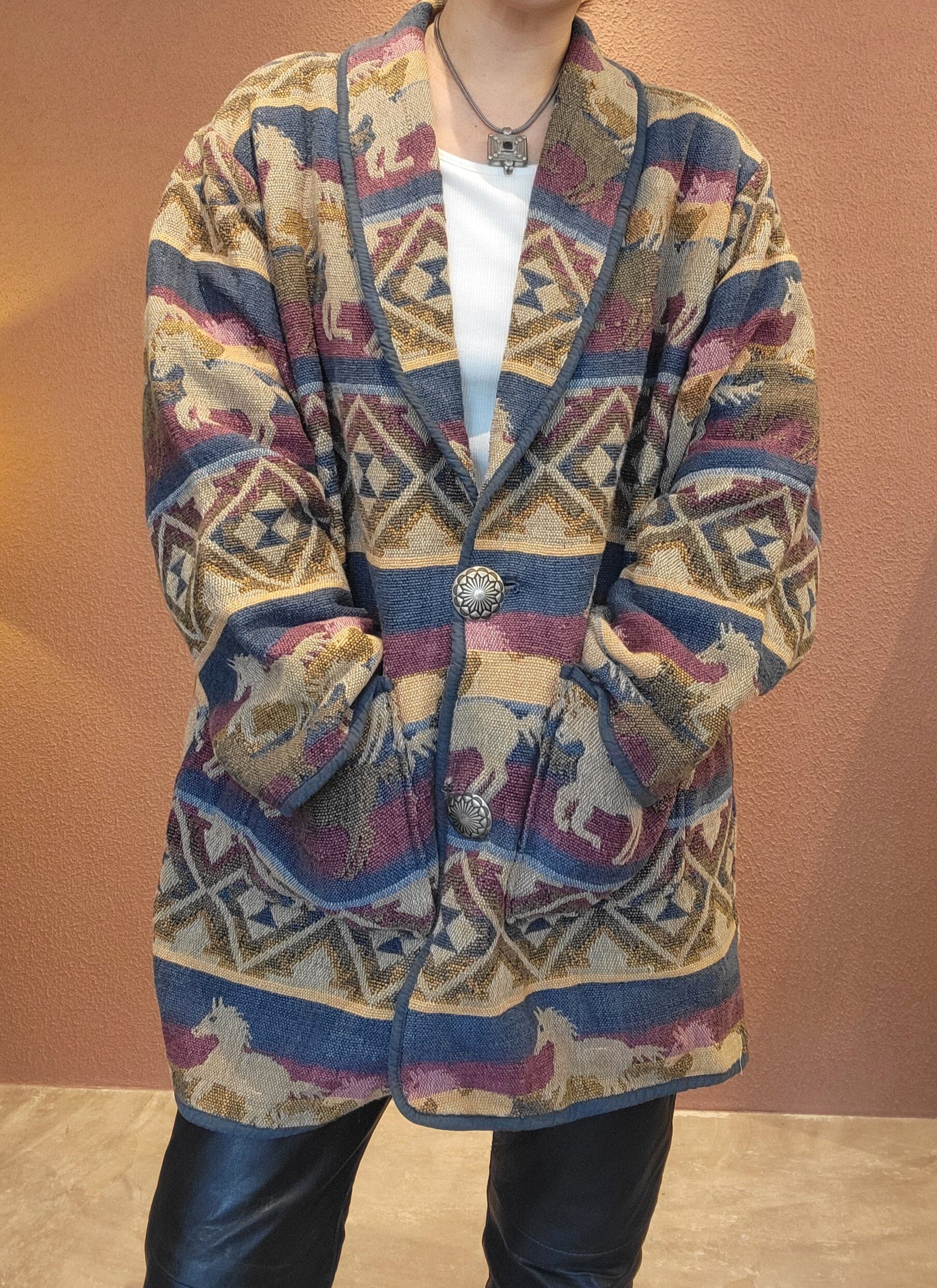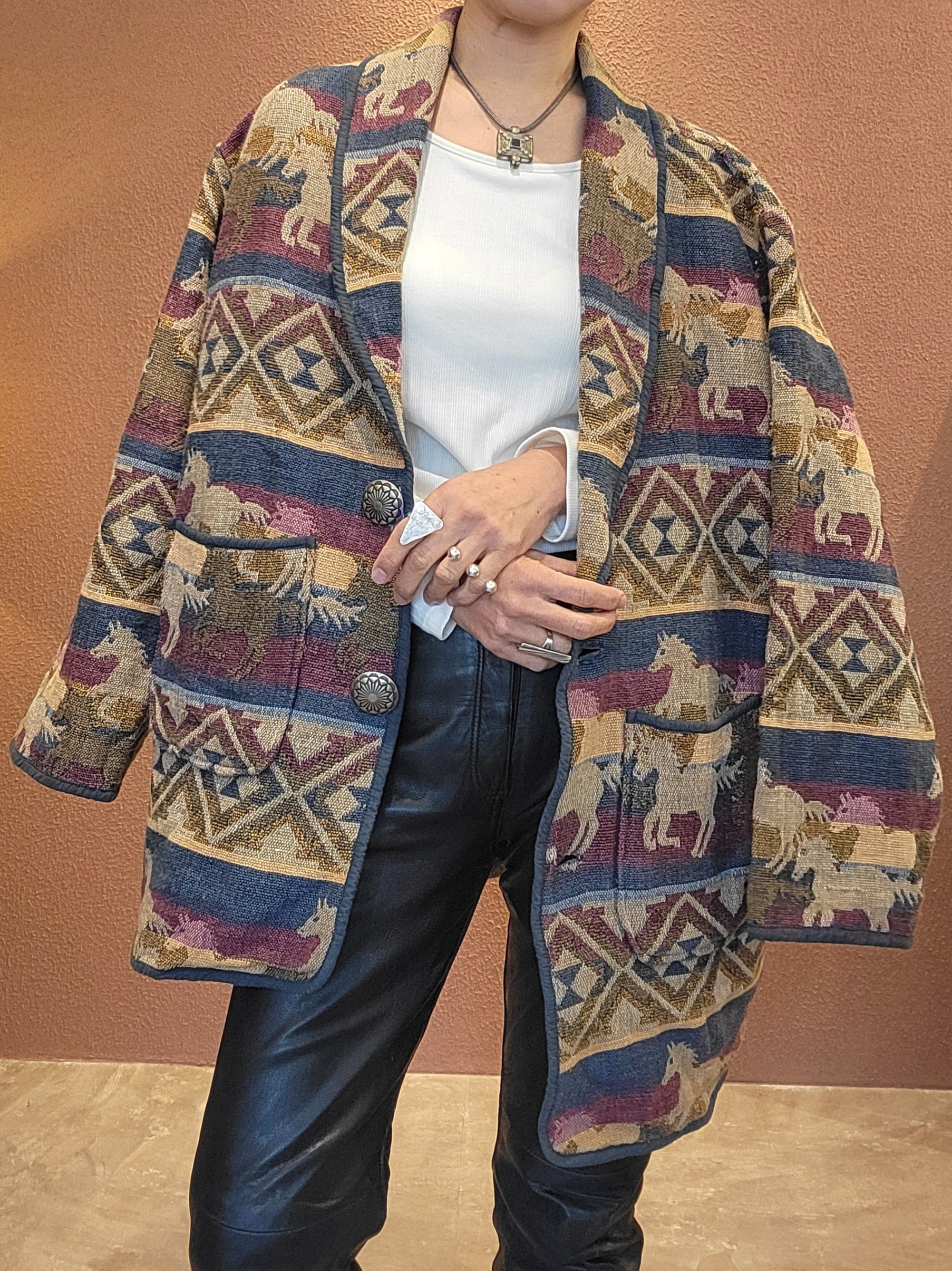 ヴィンテージのタペストリージャケット。素材表記はありませんがやや厚手のコットンのようです。ゆったりしたサイズなので中にスウェットやニットなども着込めます。大ぶりのコンチョボタンがアクセント。全体的に落ち着いたくすみカラーで大人っぽく着られます。