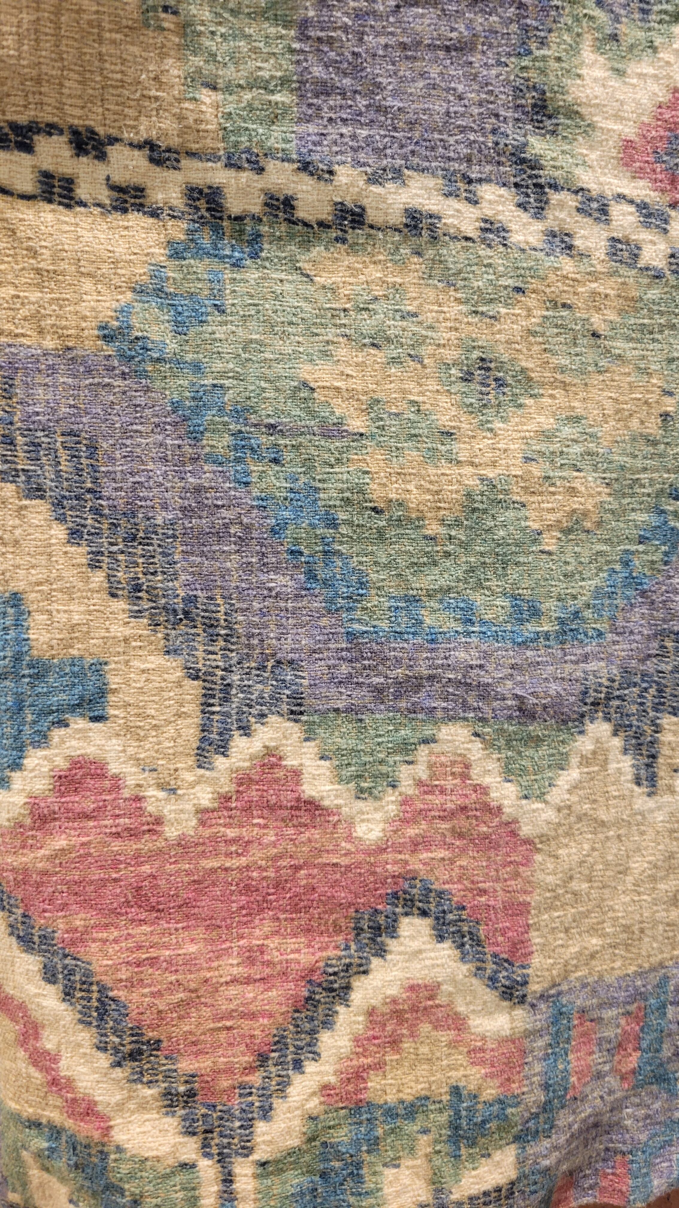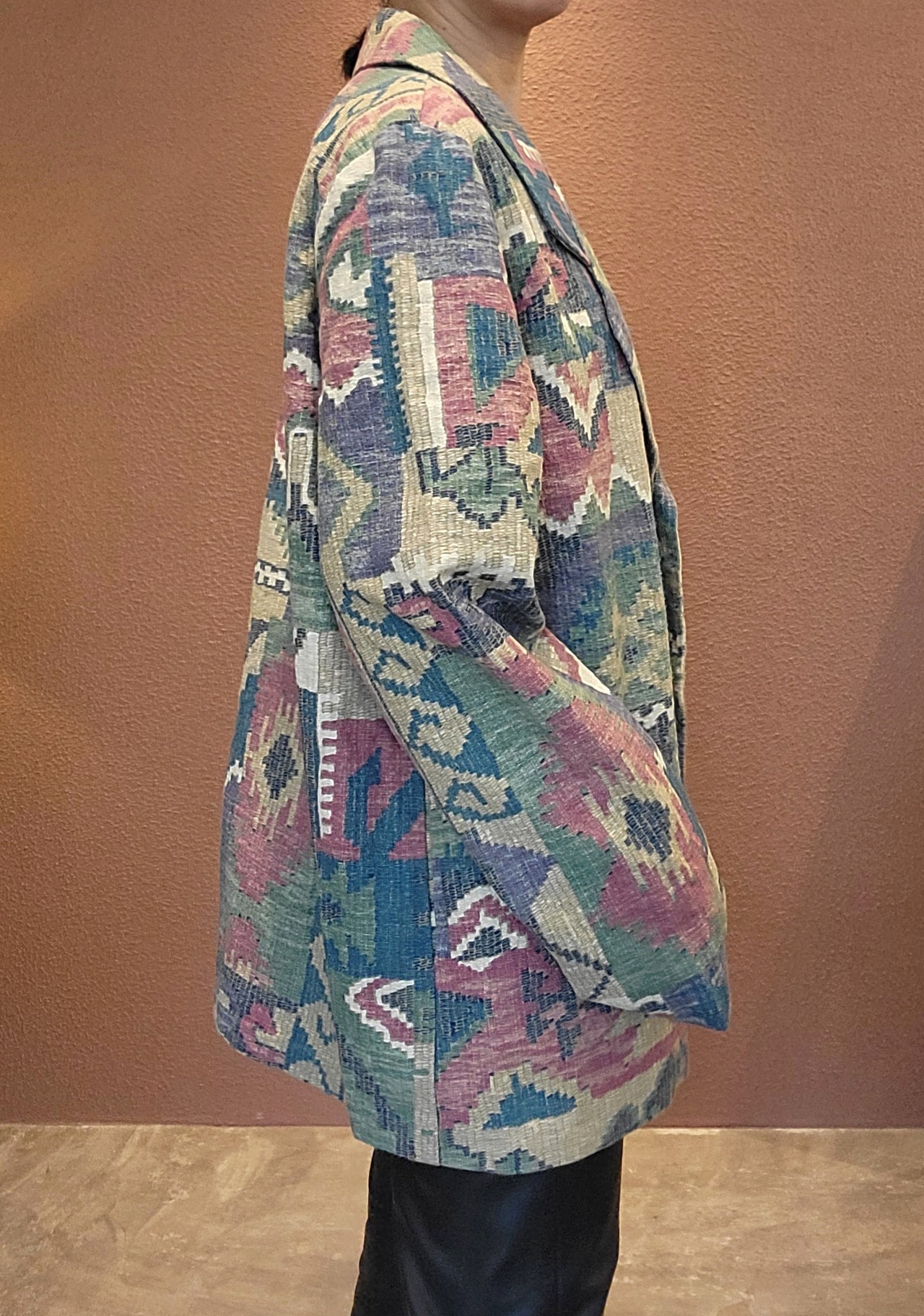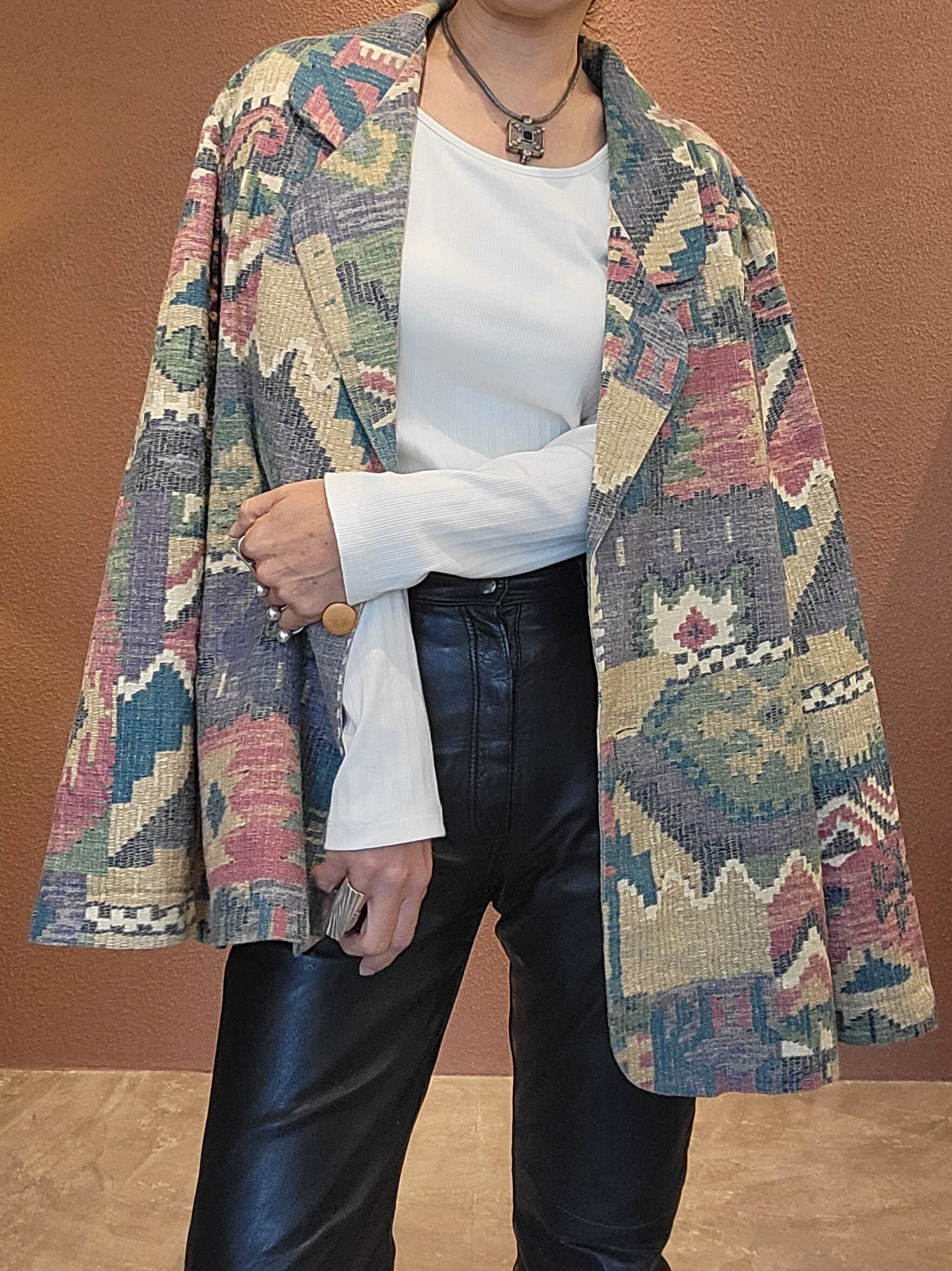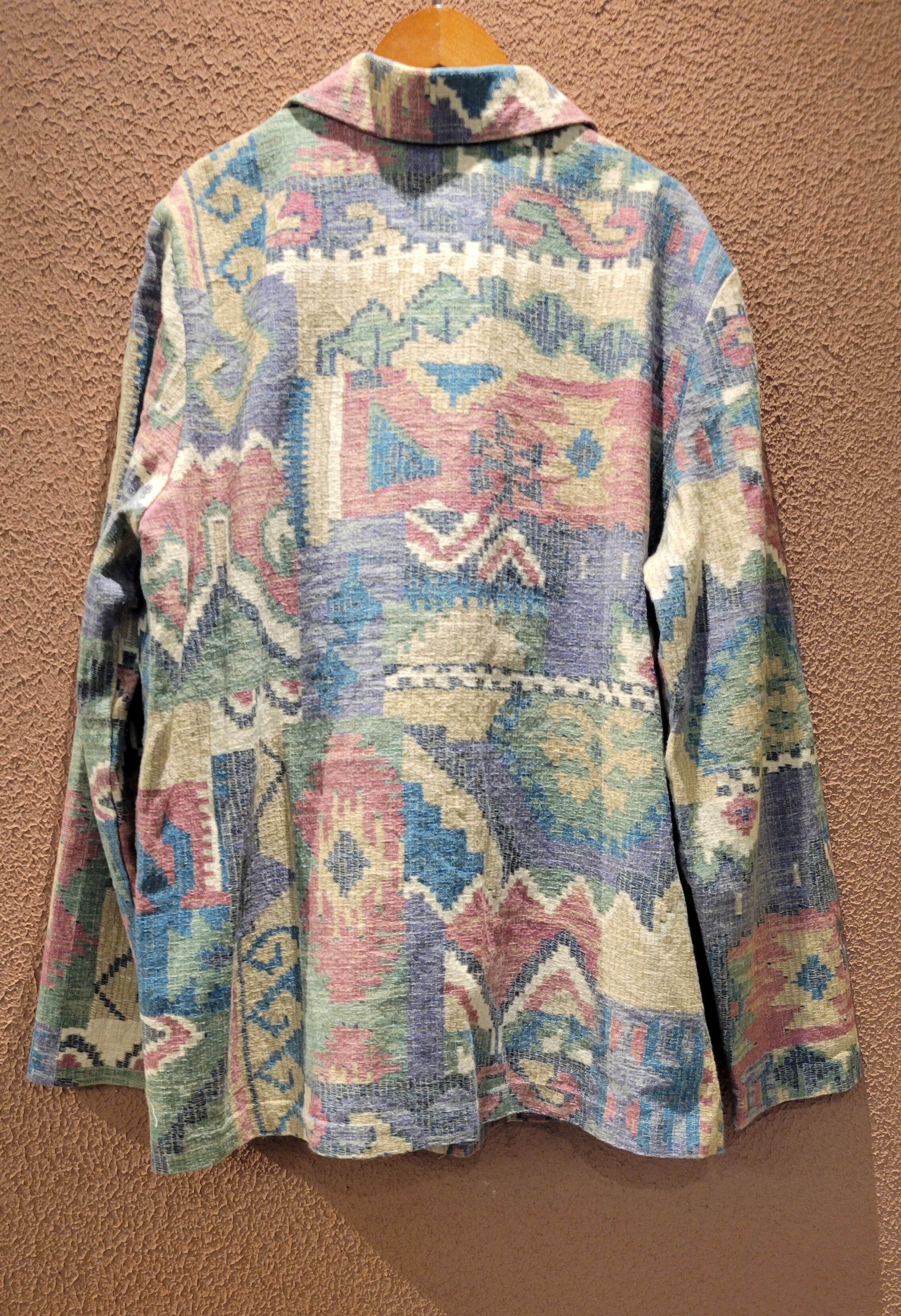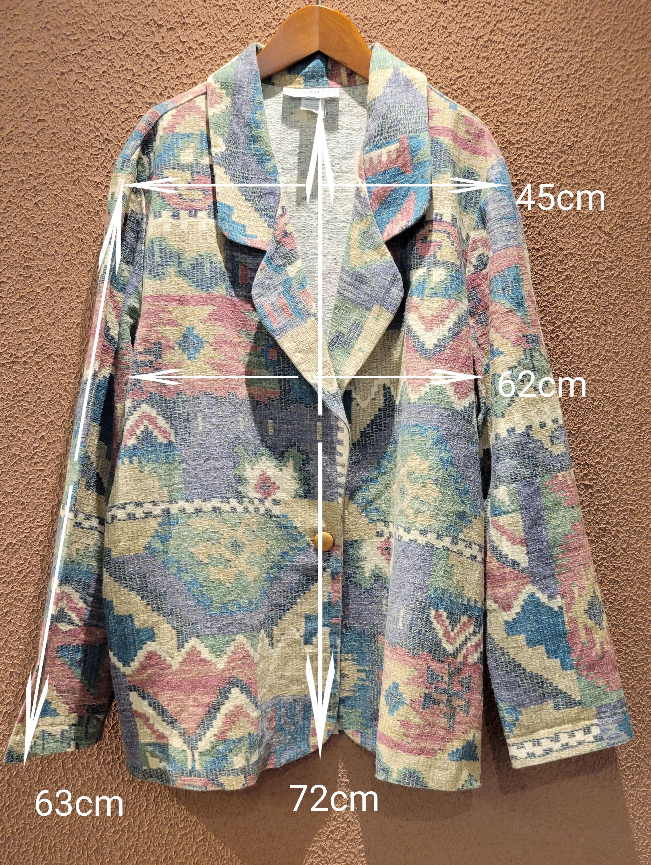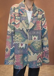 Made in USA usedテーラードジャケット。素材はコットン100%です。大きめのゆったりサイズにひとつボタンでこなれた雰囲気。元々全体的にフェード感のあるサンタフェ柄が素敵な1枚です。