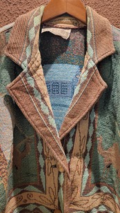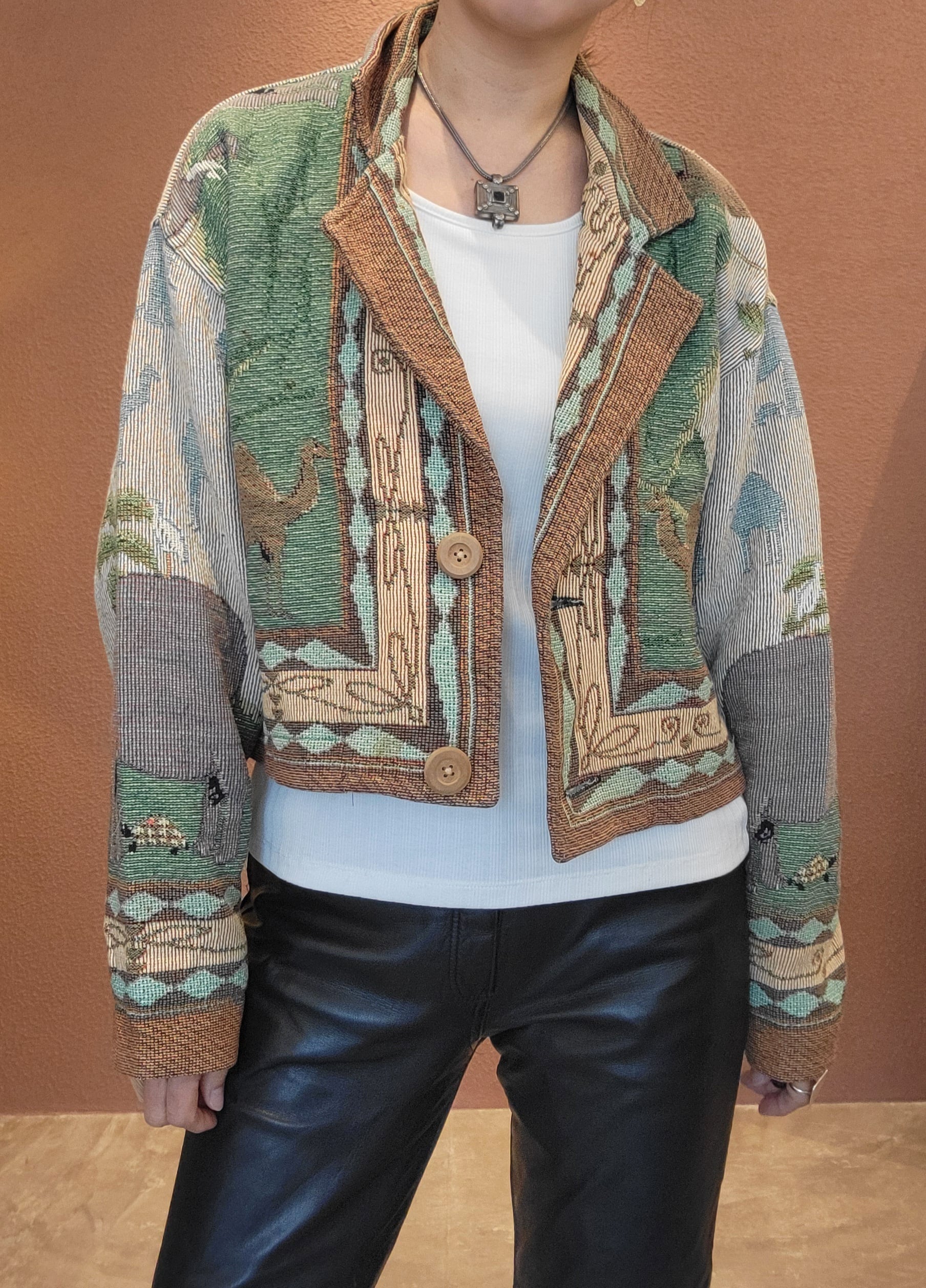 Usedのタペストリージャケット。素材表記はありませんがコットンのようです。ノアの方舟の柄になっており動物たちの絵柄が可愛らしい1着。短めの丈でハイウエストのボトムや長めのインナーとのレイヤードにもぴったりです。
