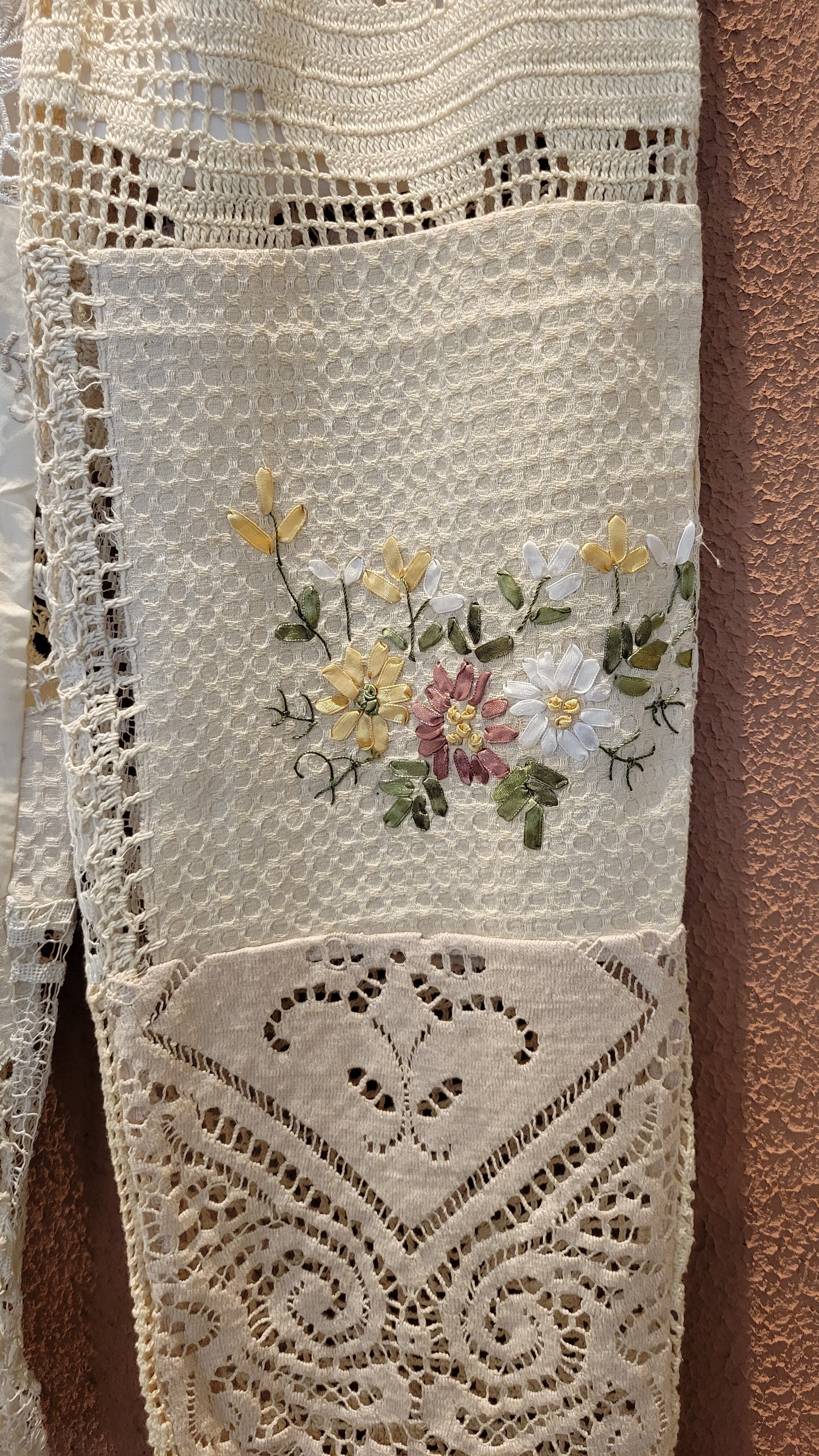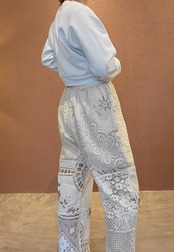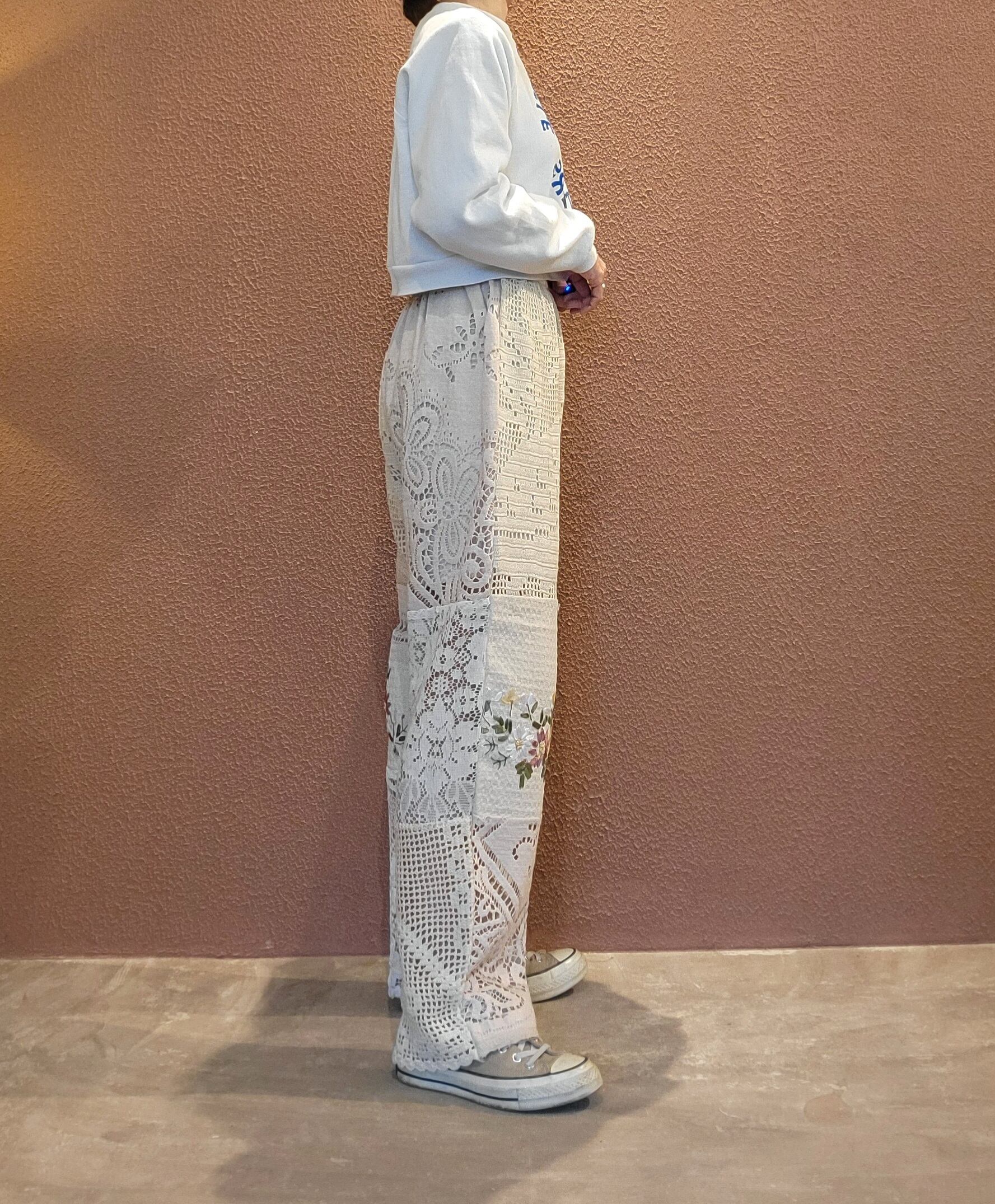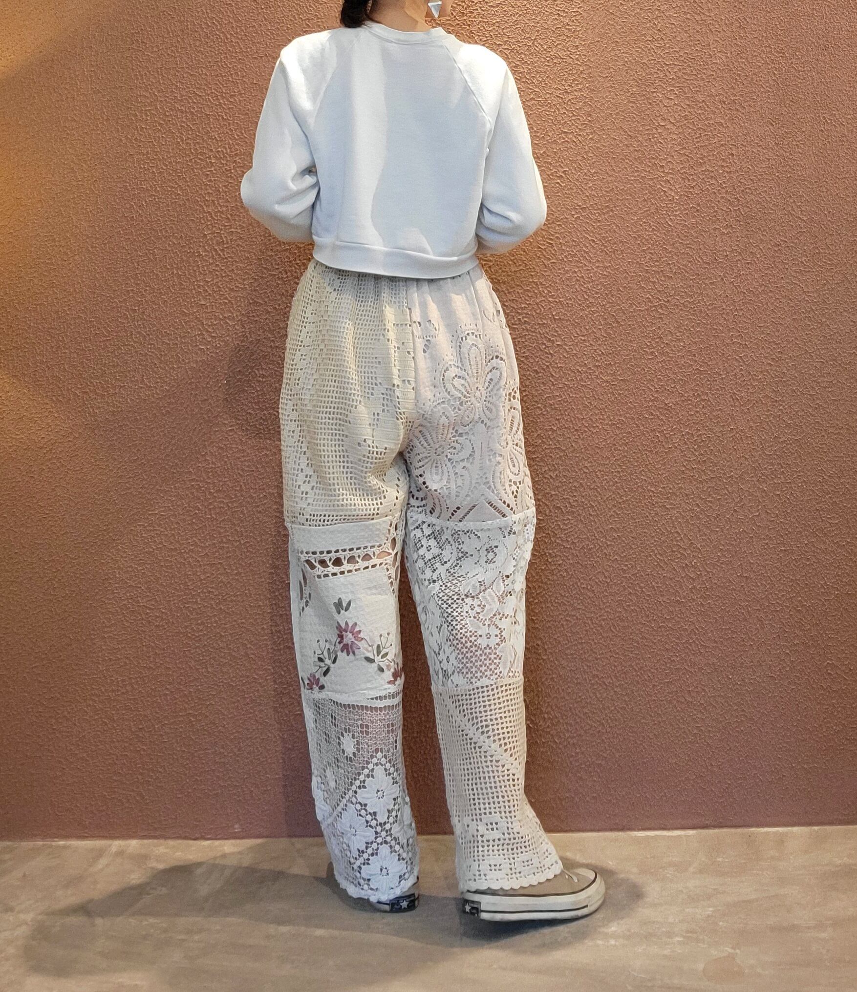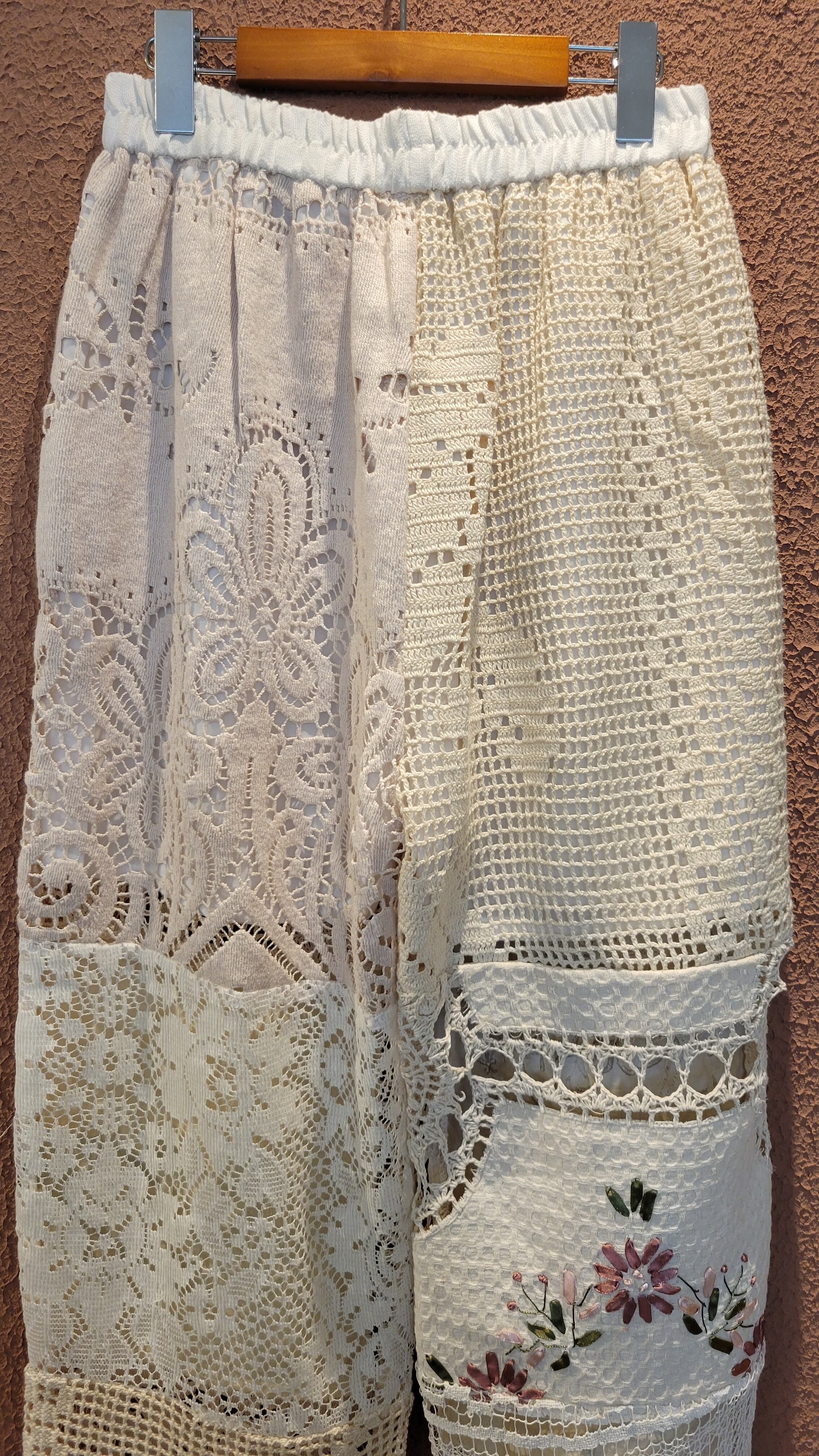 異なる種類のヴィンテージレースを繋げて仕立てたリメイクイージーパンツ。ウエストゴム。ポケットは付いていません。素材はコットンが主になりますがその他の素材も混在しています。ハーフ丈の裏地付き(ウエストから43cm)。ポイントでサテンリボンの刺繍が配置されています。ふんだんに使用したレースはどの角度から見ても色々な表情を楽しめます。