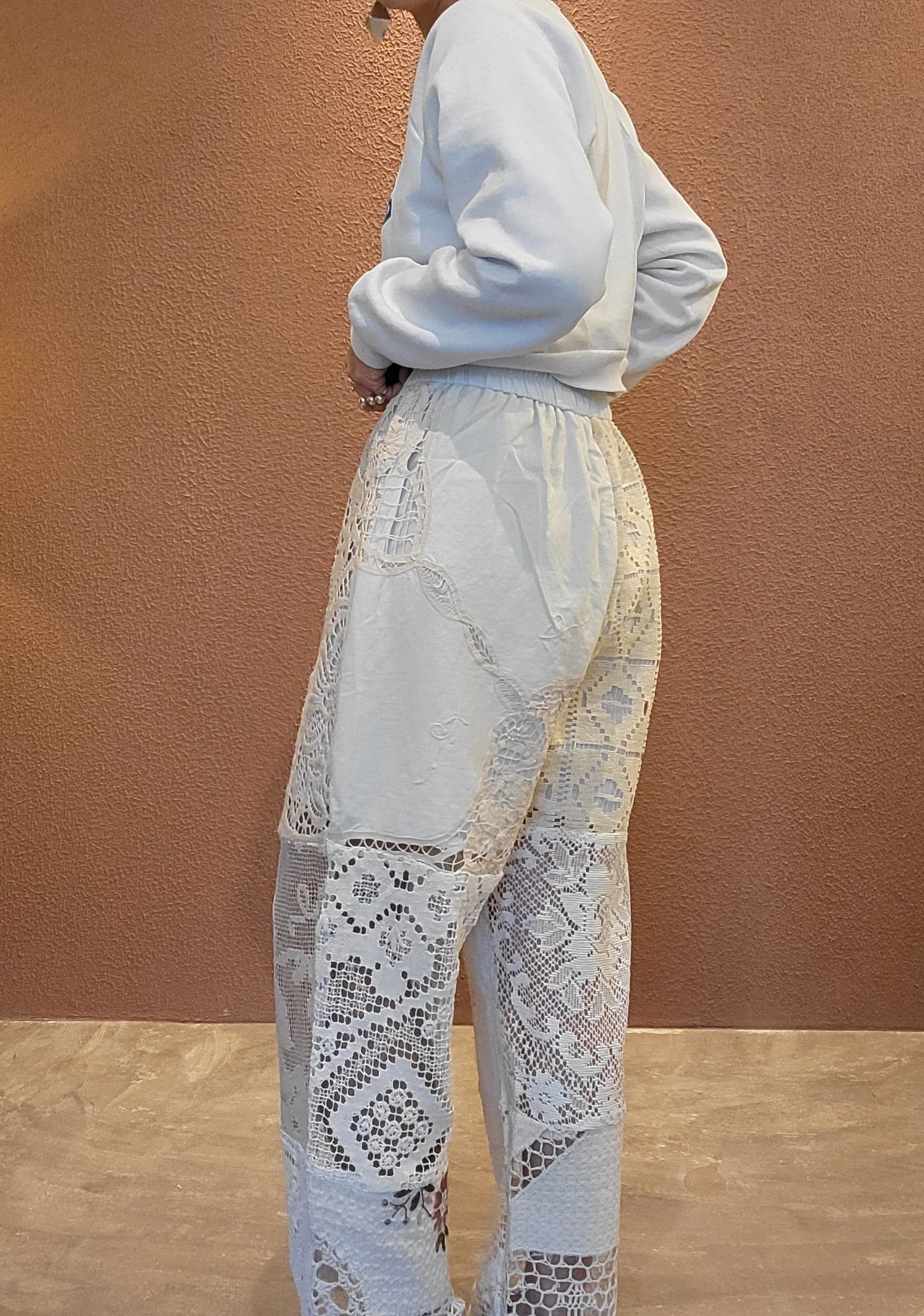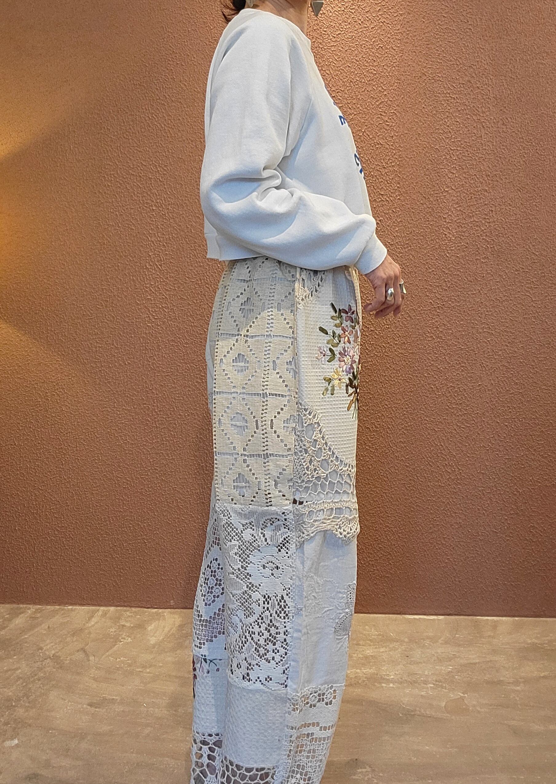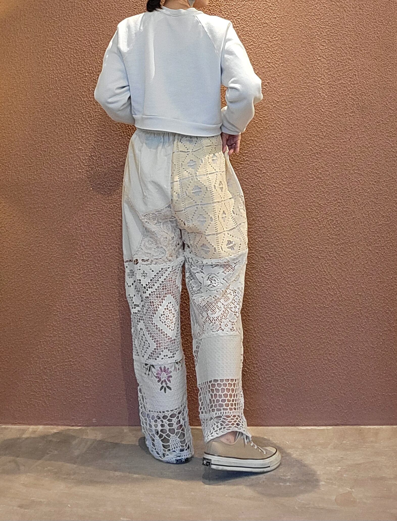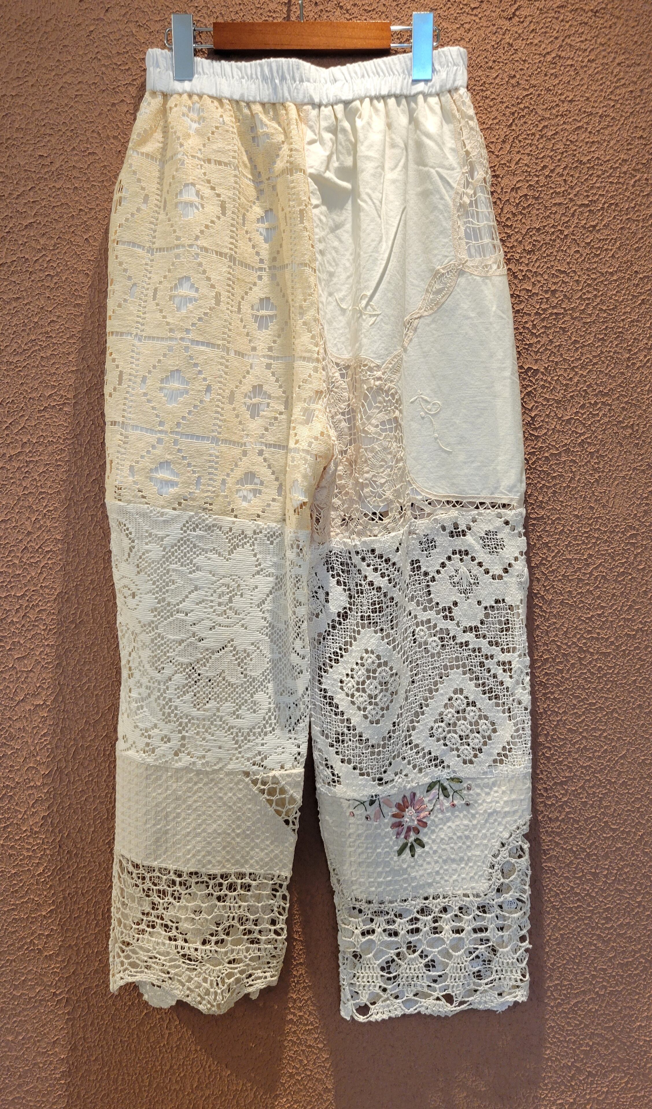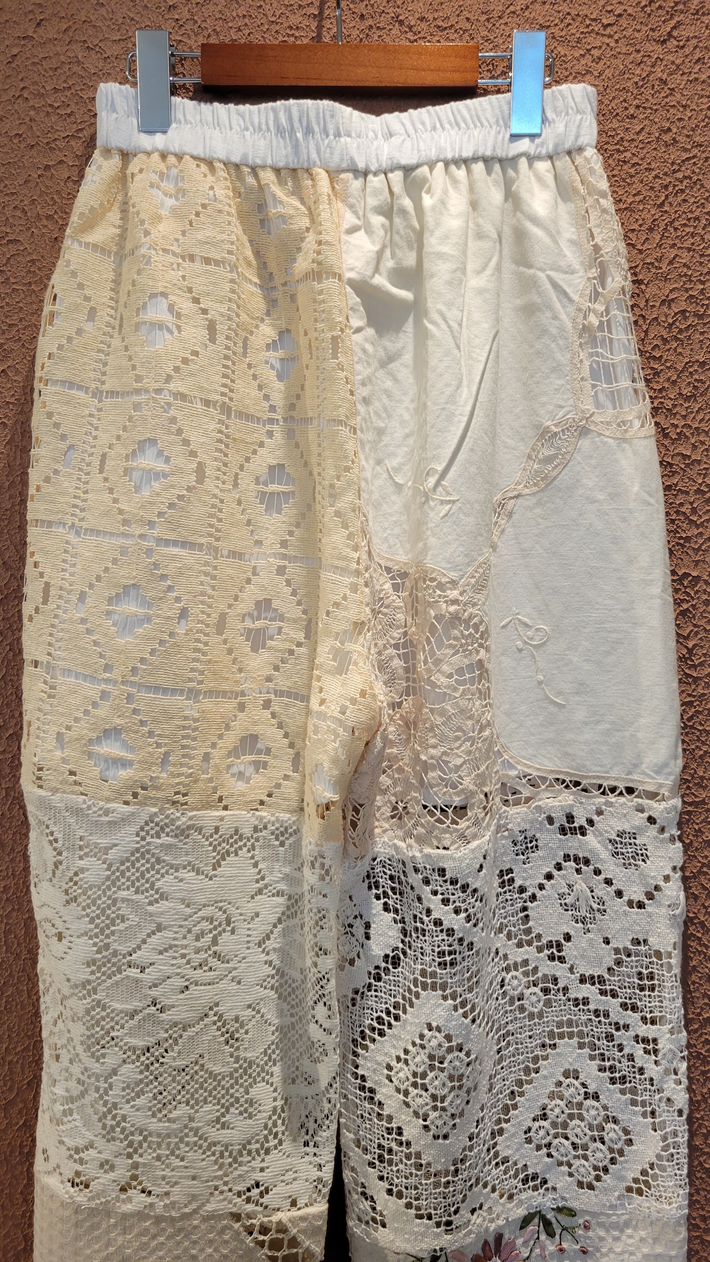 異なる種類のヴィンテージレースを繋げて仕立てたリメイクイージーパンツ。ウエストゴム。ポケットは付いていません。素材はコットンが主になりますがその他の素材も混在しています。ハーフ丈の裏地付き(ウエストから43cm)。ポイントでサテンリボンの刺繍が配置されています。ふんだんに使用したレースはどの角度から見ても色々な表情を楽しめます。