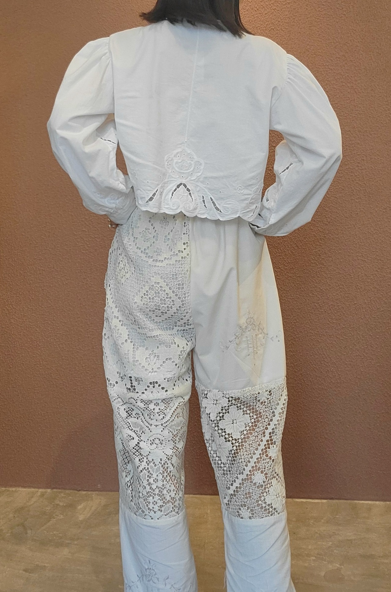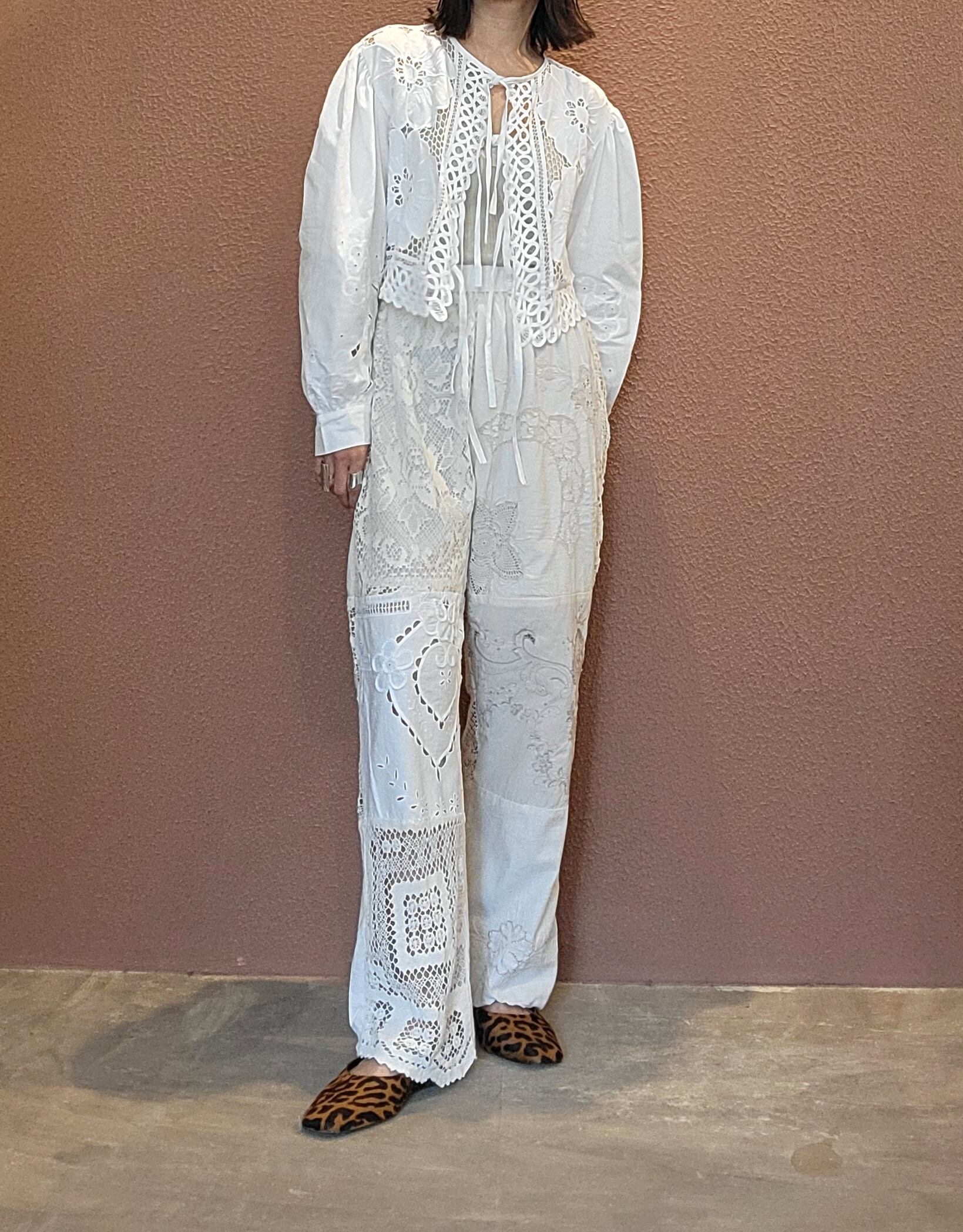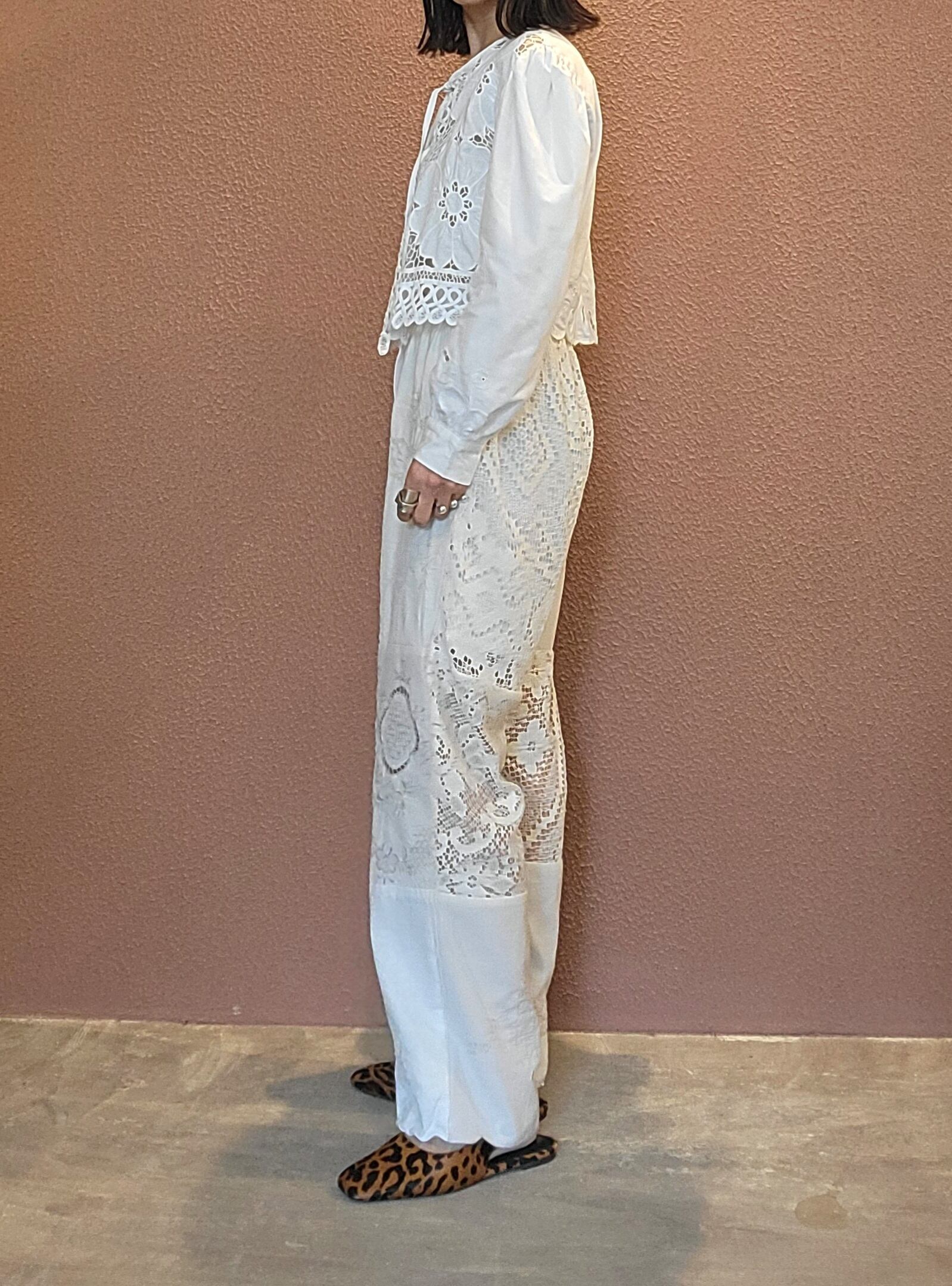 ヴィンテージレース生地を繋ぎ合わせたリメイクイージーパンツ。素材表記はありませんがコットンのようです。ウエストゴム、ポケット無し。ウエストから約40cmのハーフ丈の裏地付きで1枚で着用できます。腰回りゆったり、履き心地ストレスフリーな1本です。