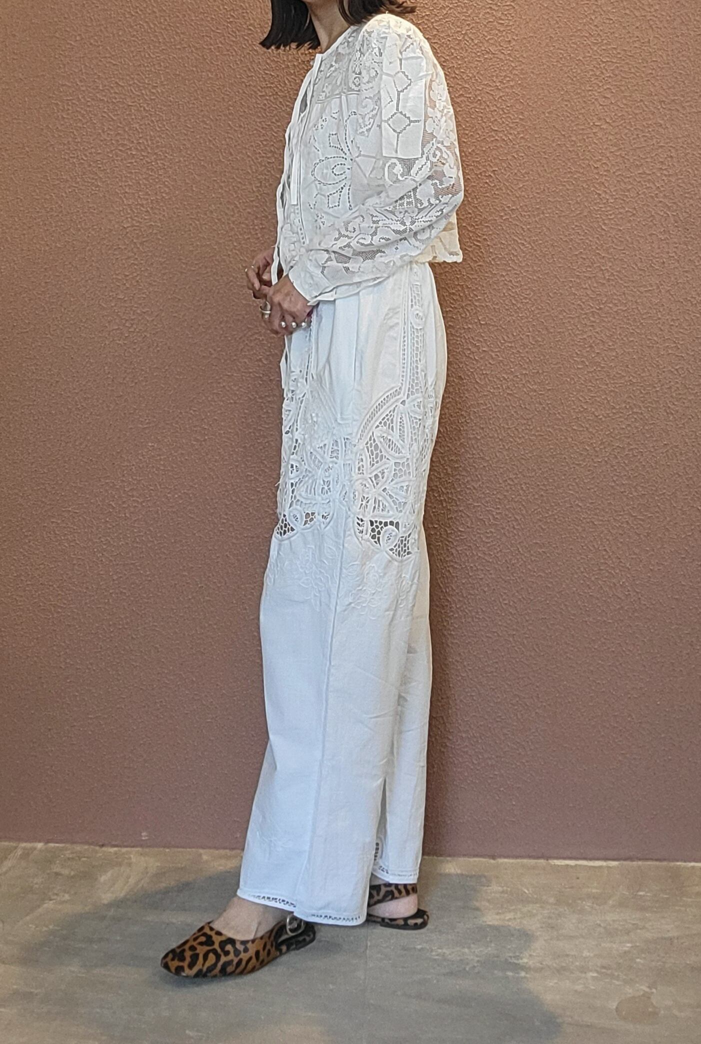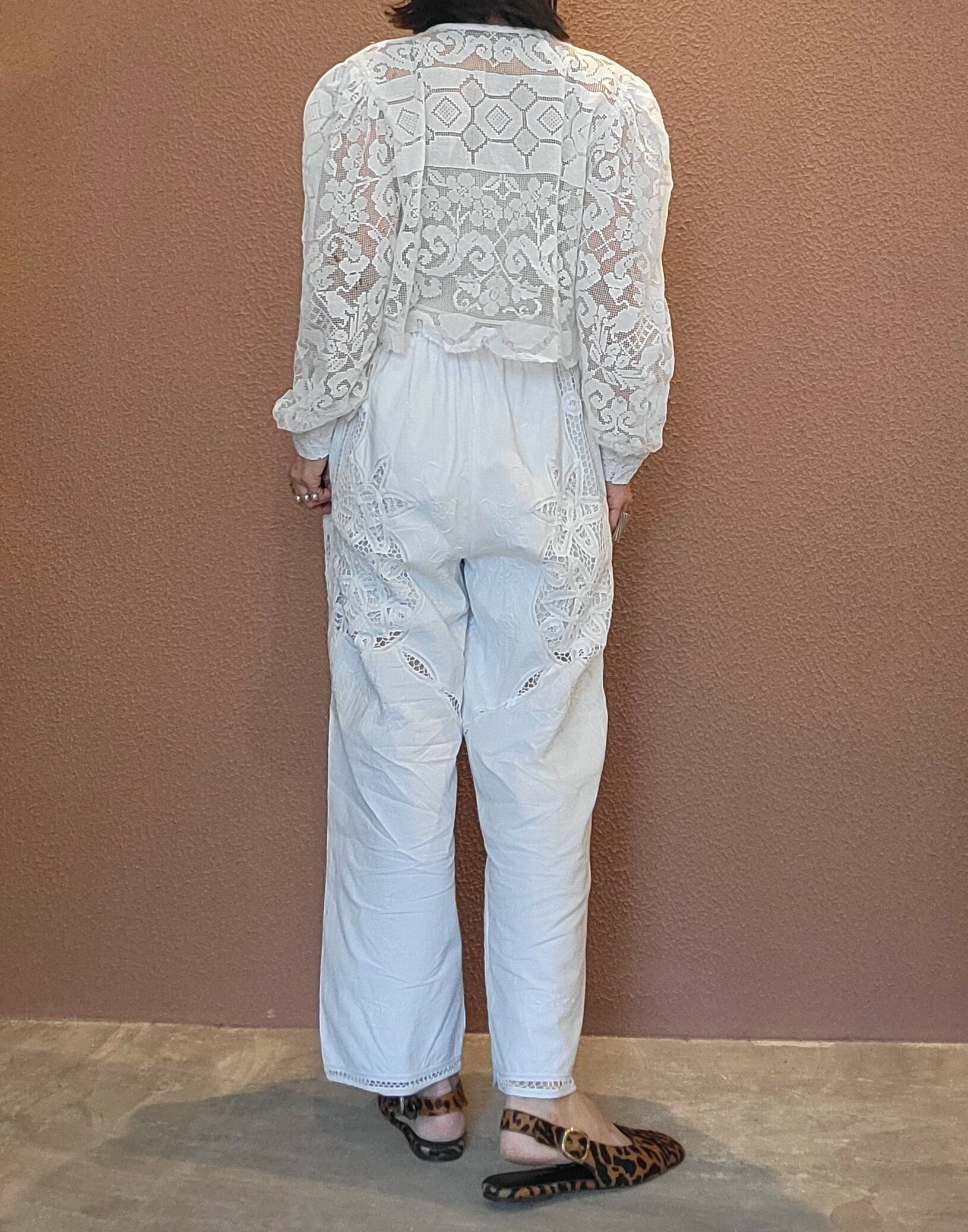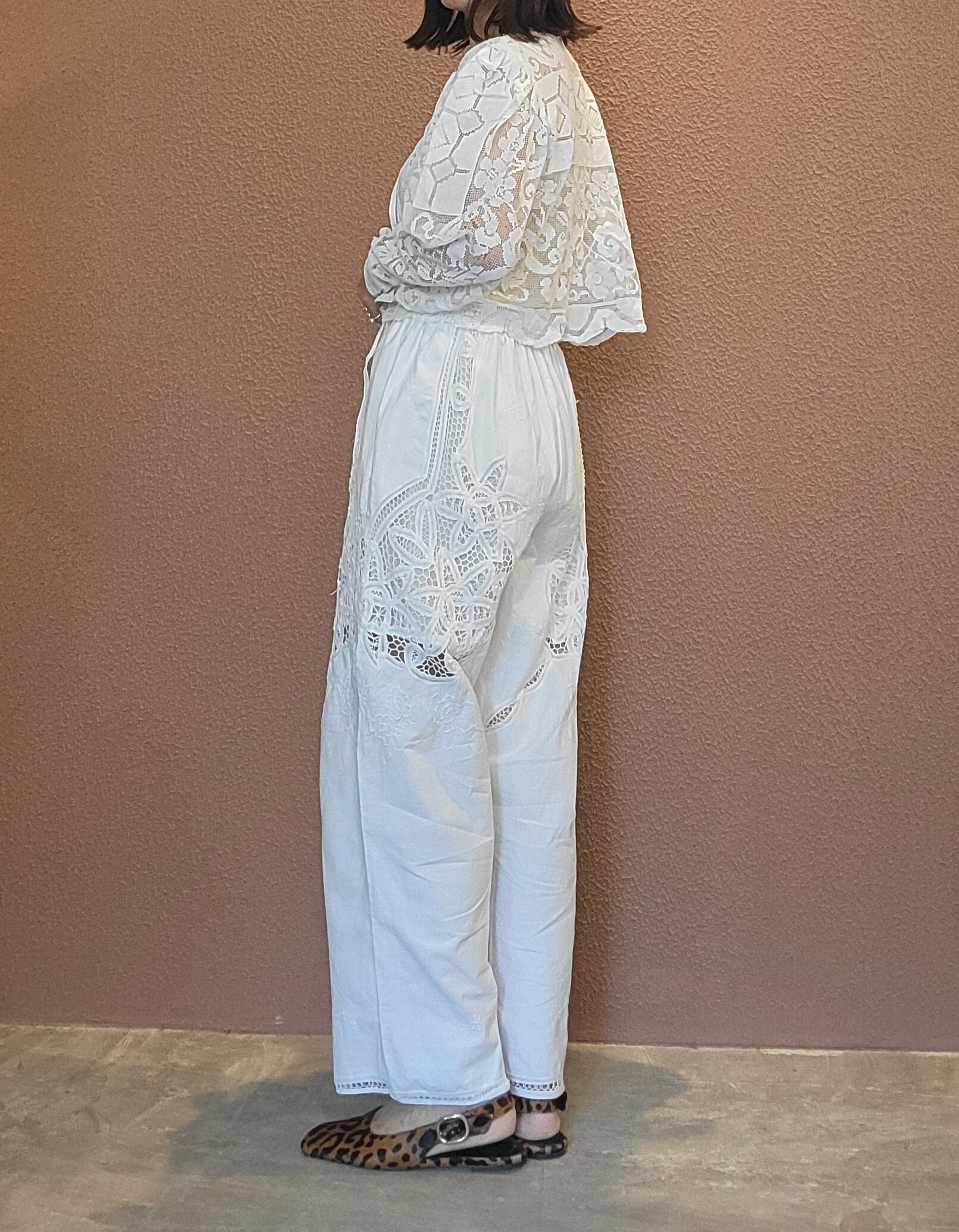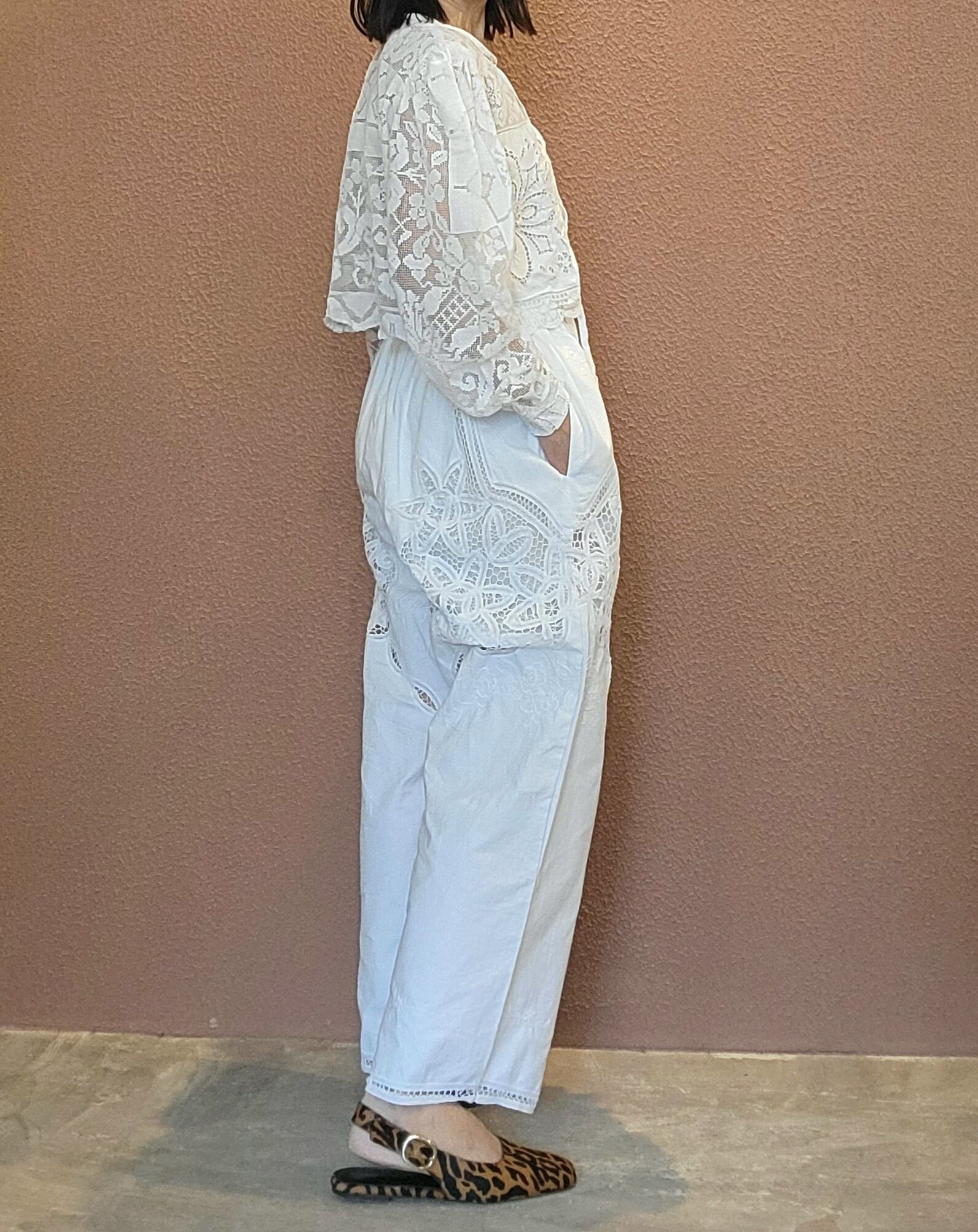 ヴィンテージレース生地を繋ぎ合わせたリメイクイージーパンツ。素材表記はありませんがコットンのようです。ウエストゴム、左右サイドポケット付き。ウエストから約40cmのハーフ丈の裏地付きで1枚で着用できます。腰回りゆったり、履き心地ストレスフリーな1本です。