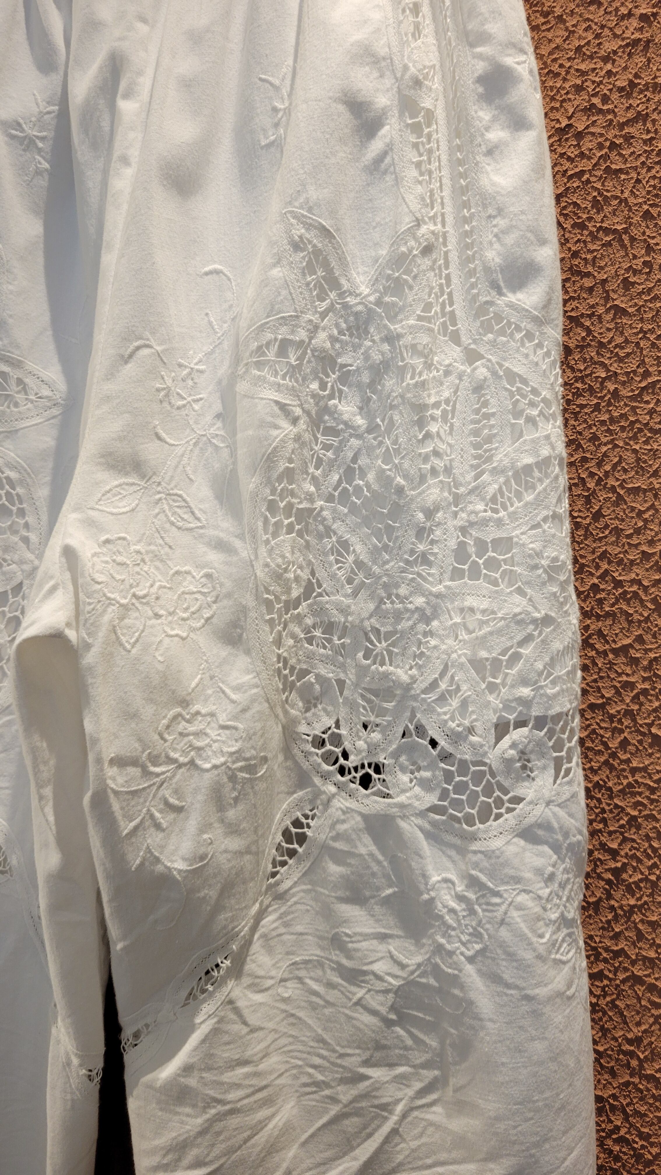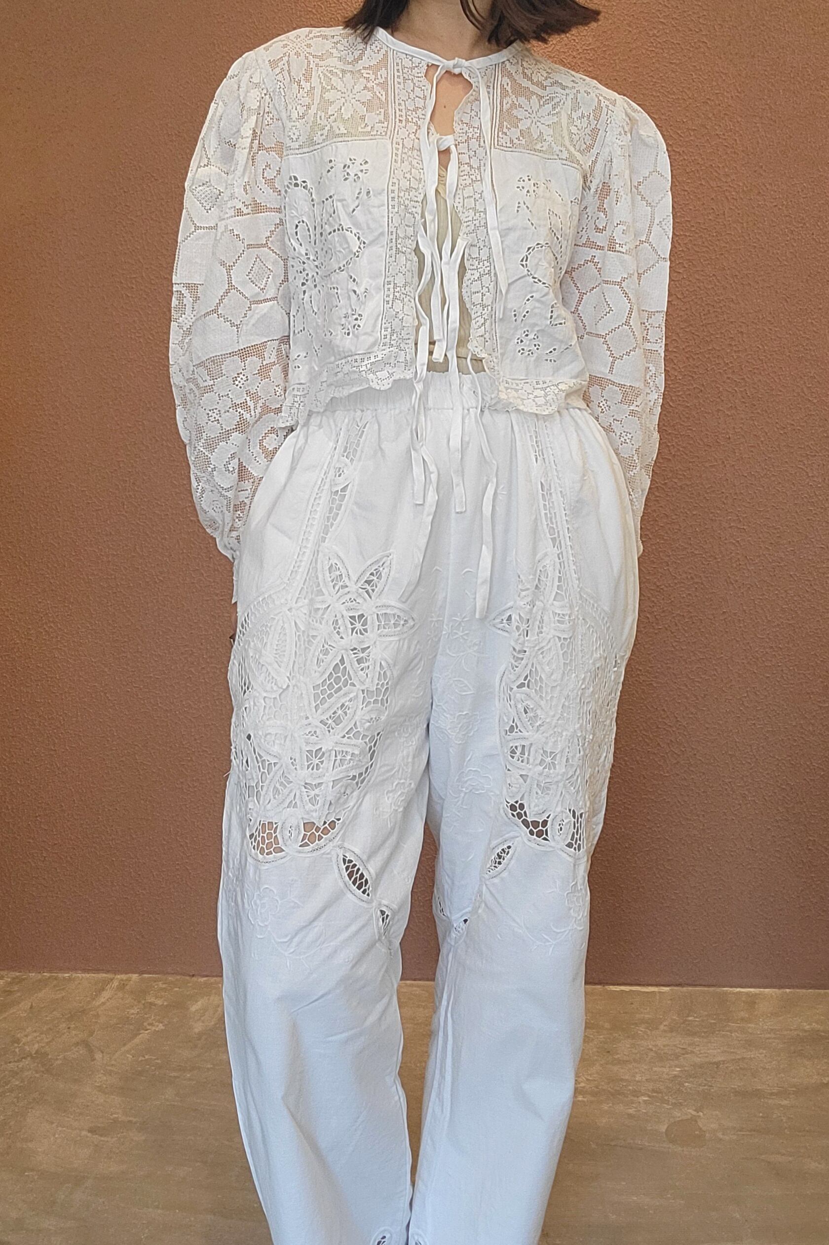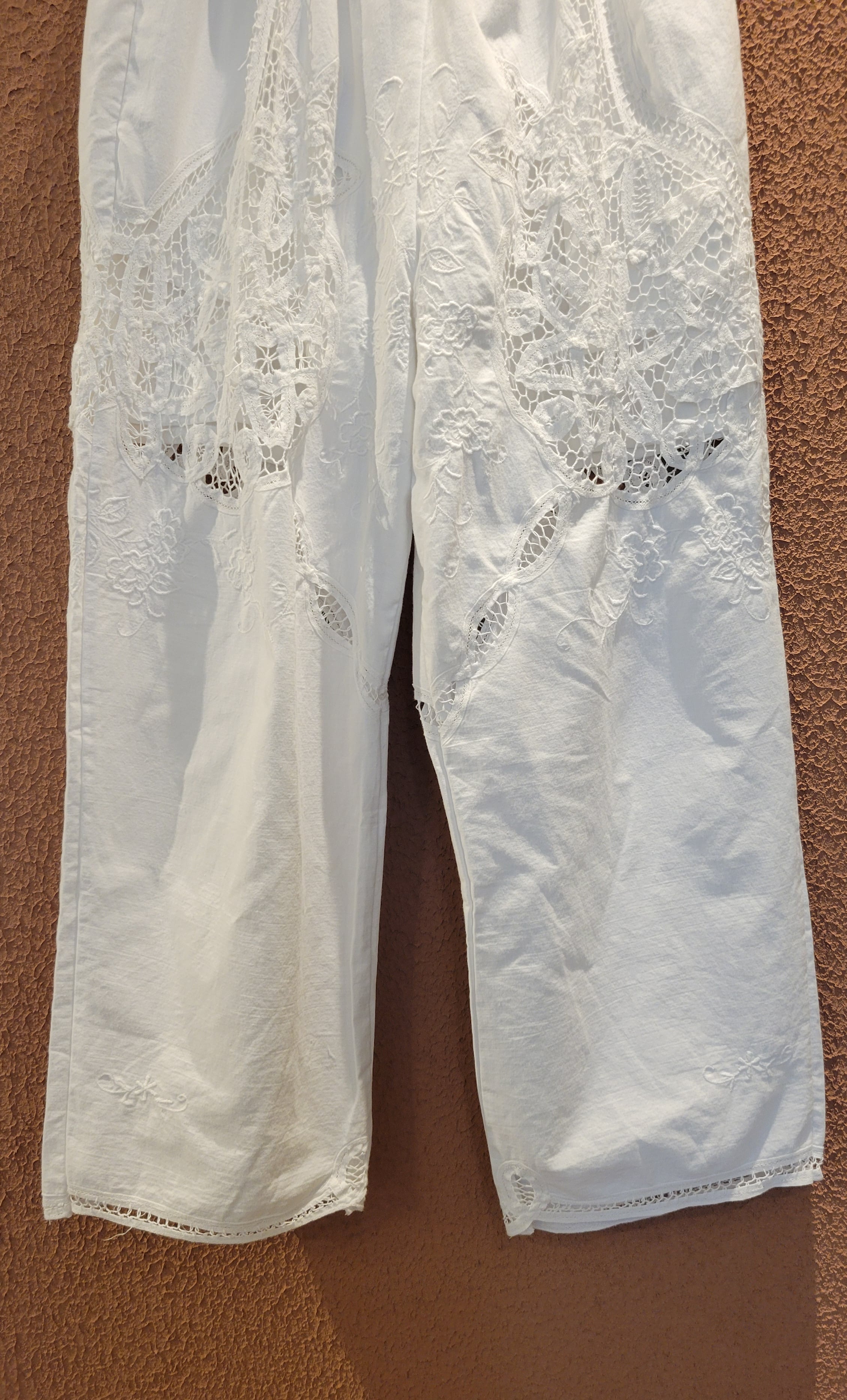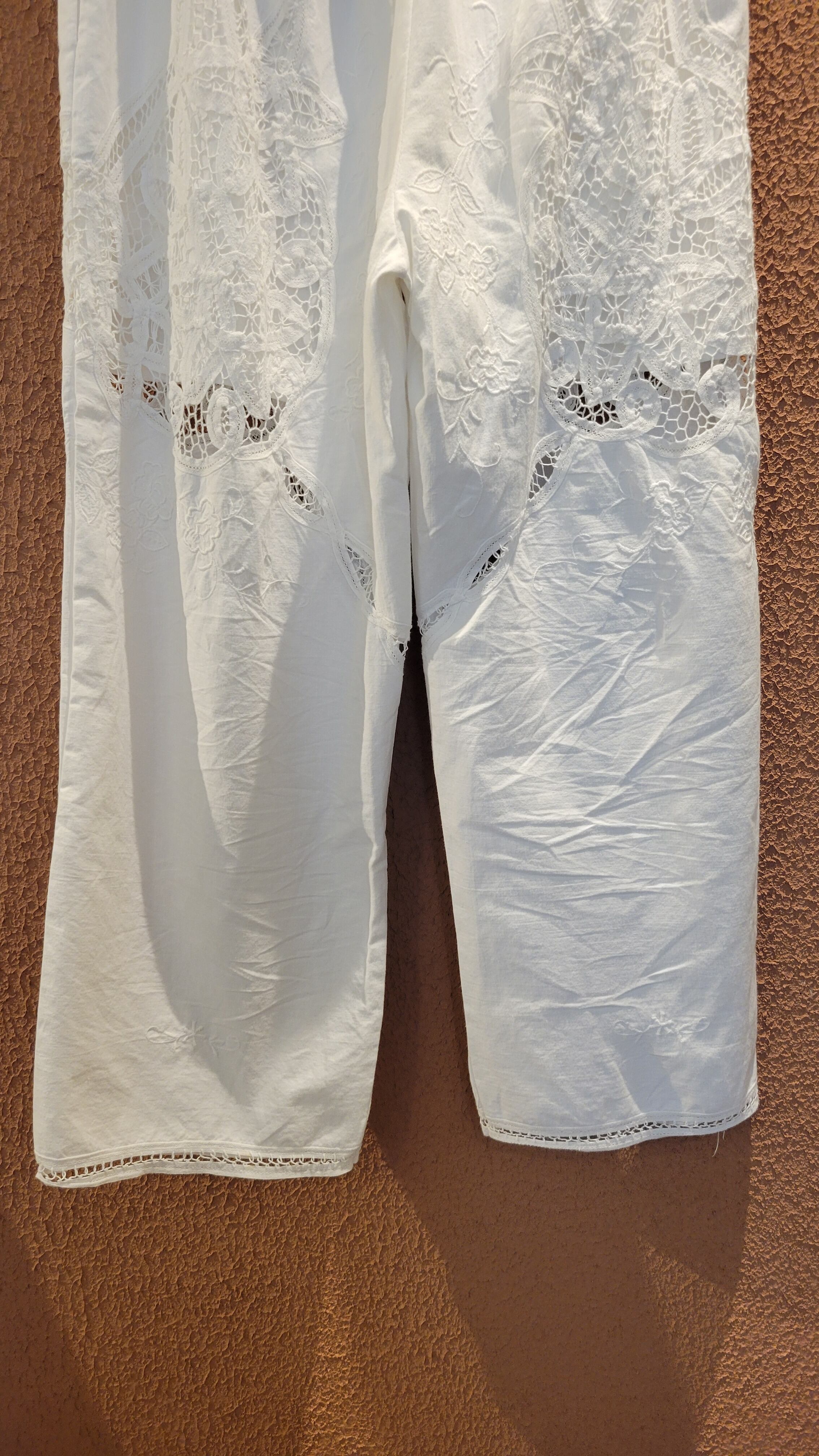 ヴィンテージレース生地を繋ぎ合わせたリメイクイージーパンツ。素材表記はありませんがコットンのようです。ウエストゴム、左右サイドポケット付き。ウエストから約40cmのハーフ丈の裏地付きで1枚で着用できます。腰回りゆったり、履き心地ストレスフリーな1本です。