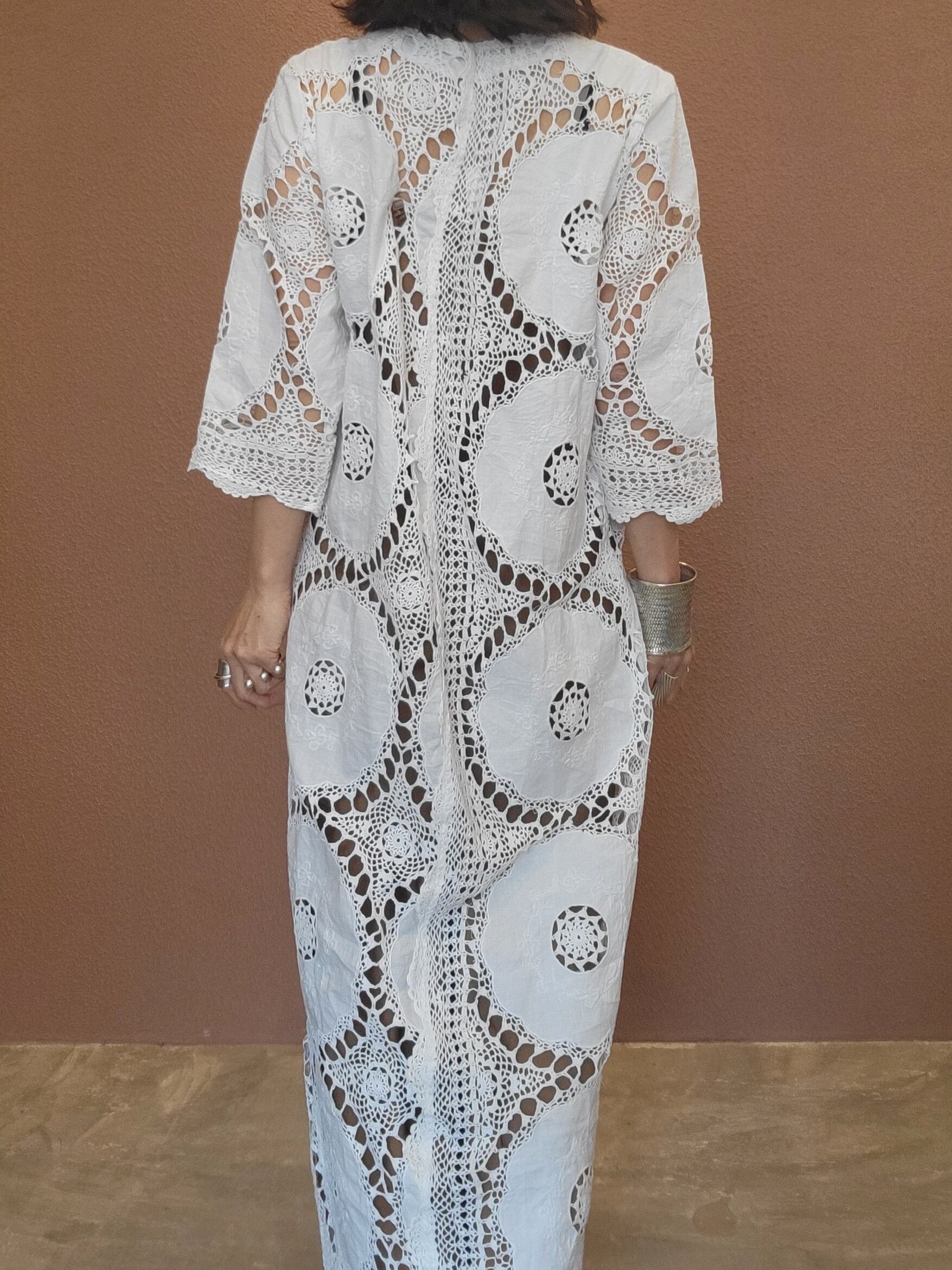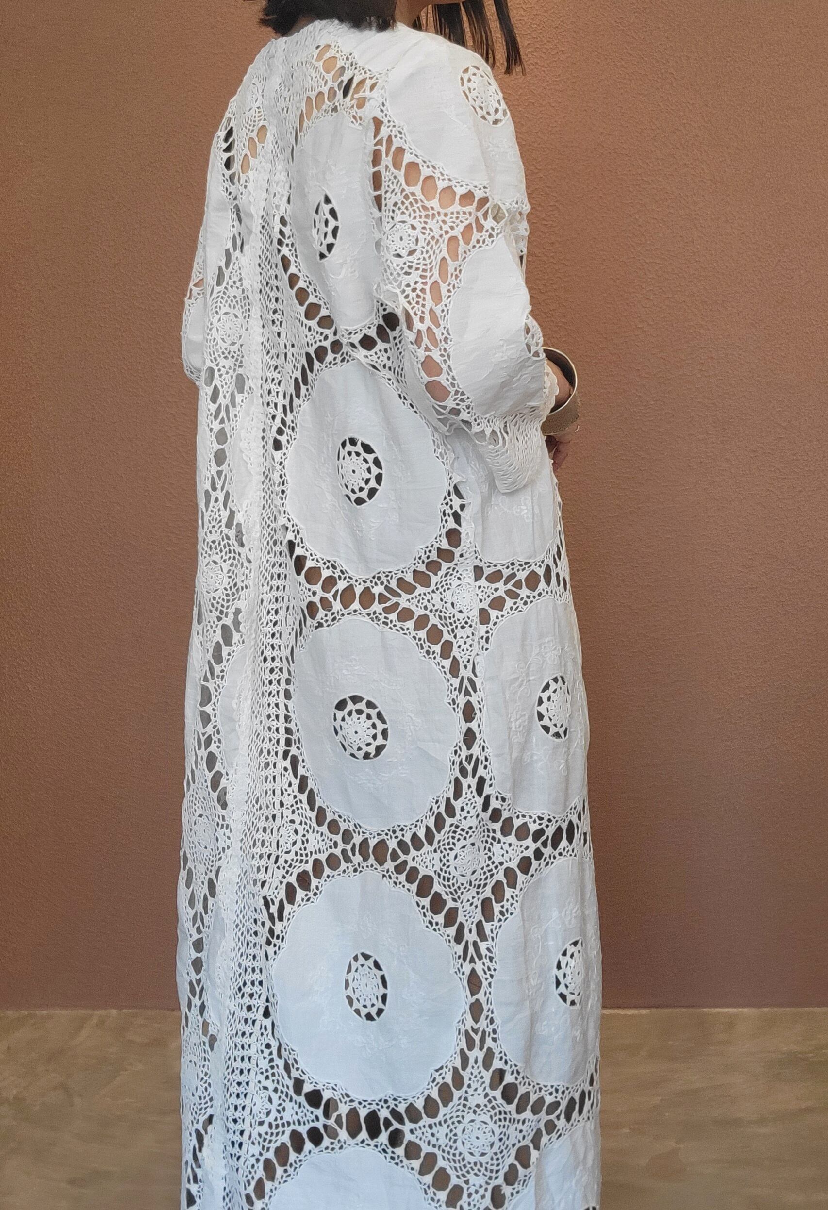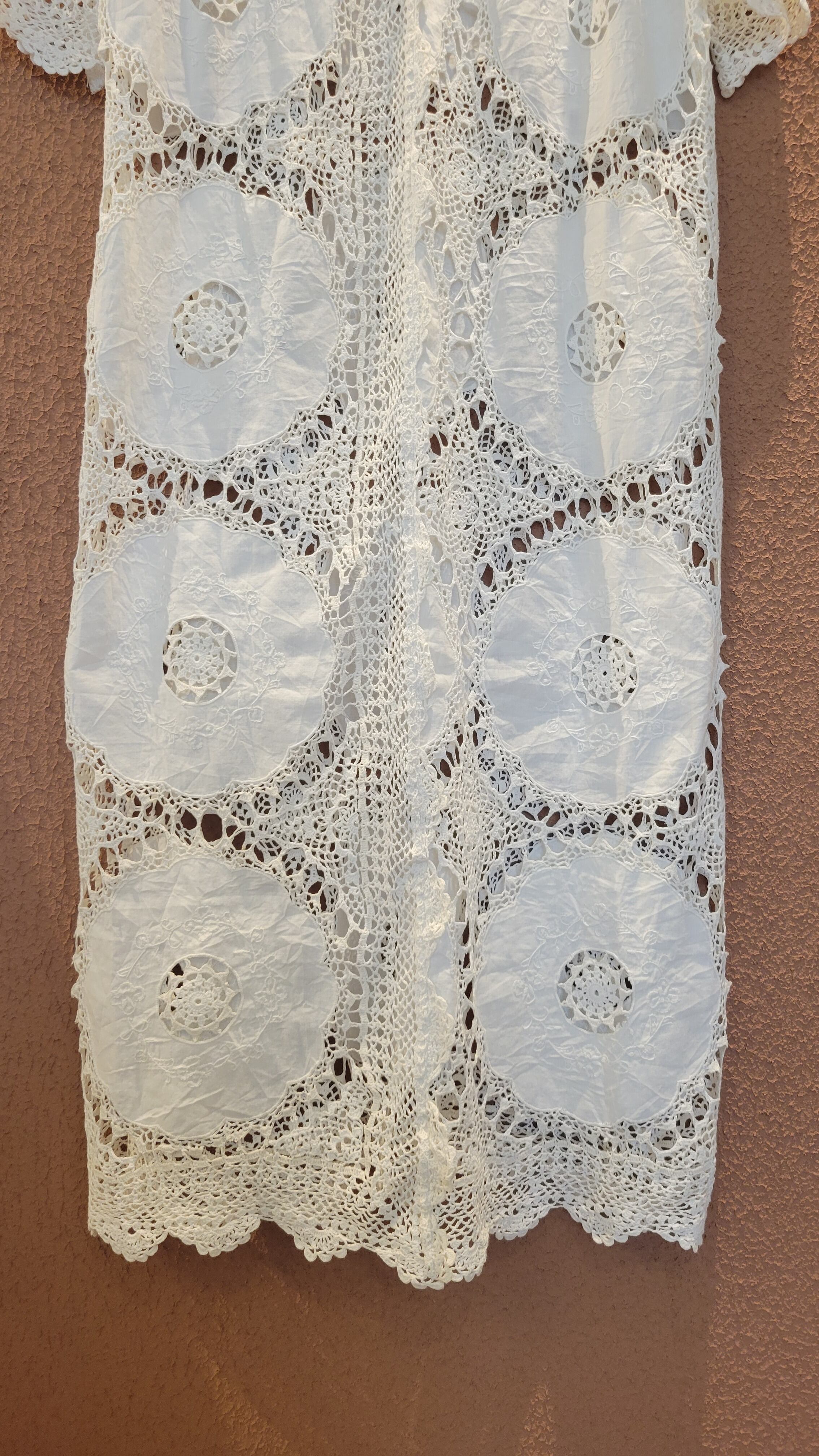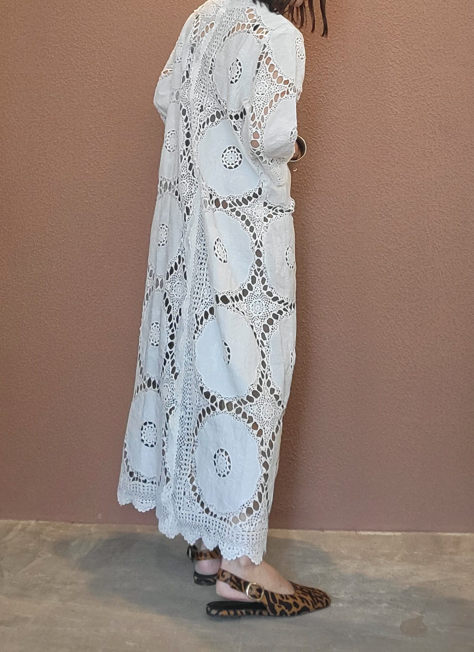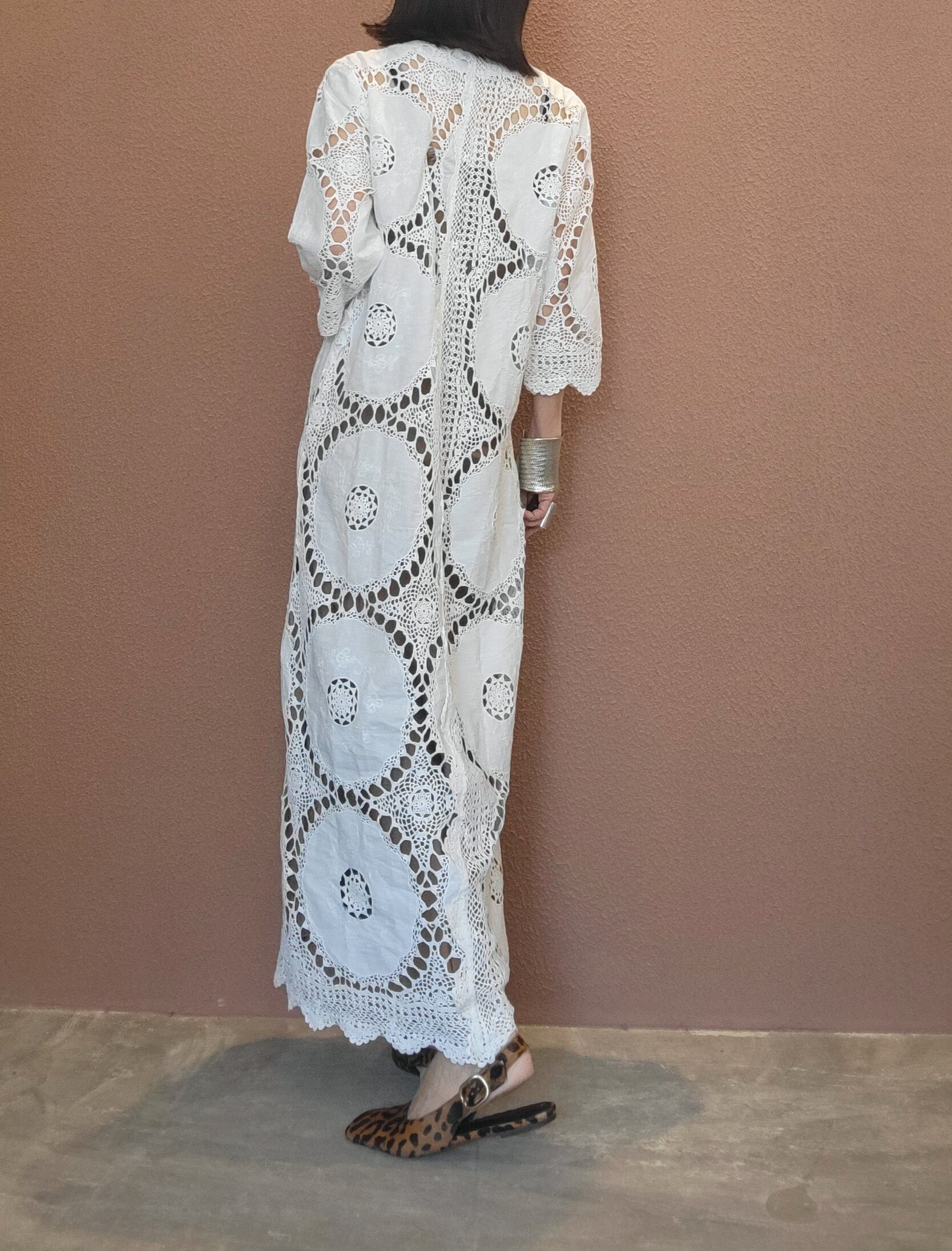 ヴィンテージのクロシェ×刺繍生地をたっぷり使用したリメイクマキシワンピース。素材表記はありませんがコットンのようです。ファスナー等は無く頭から被るように着用するプルオーバータイプ。締め付け感無くストレスを感じない着用感です。裏地は付いていません。程よい肌の透け感が品のある1着。