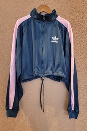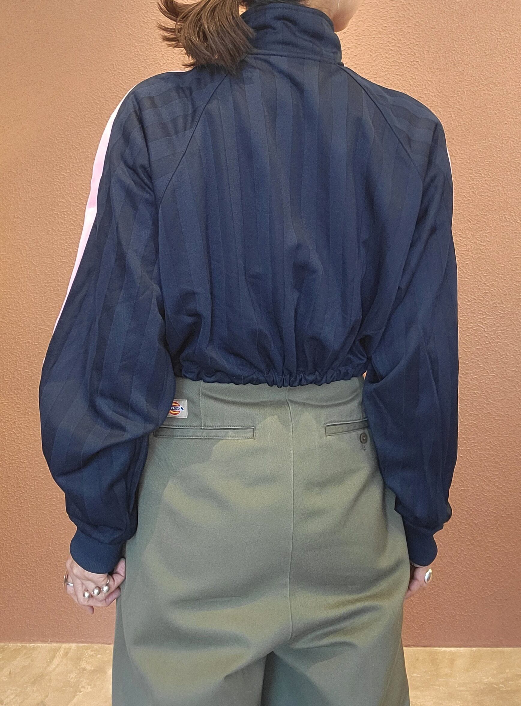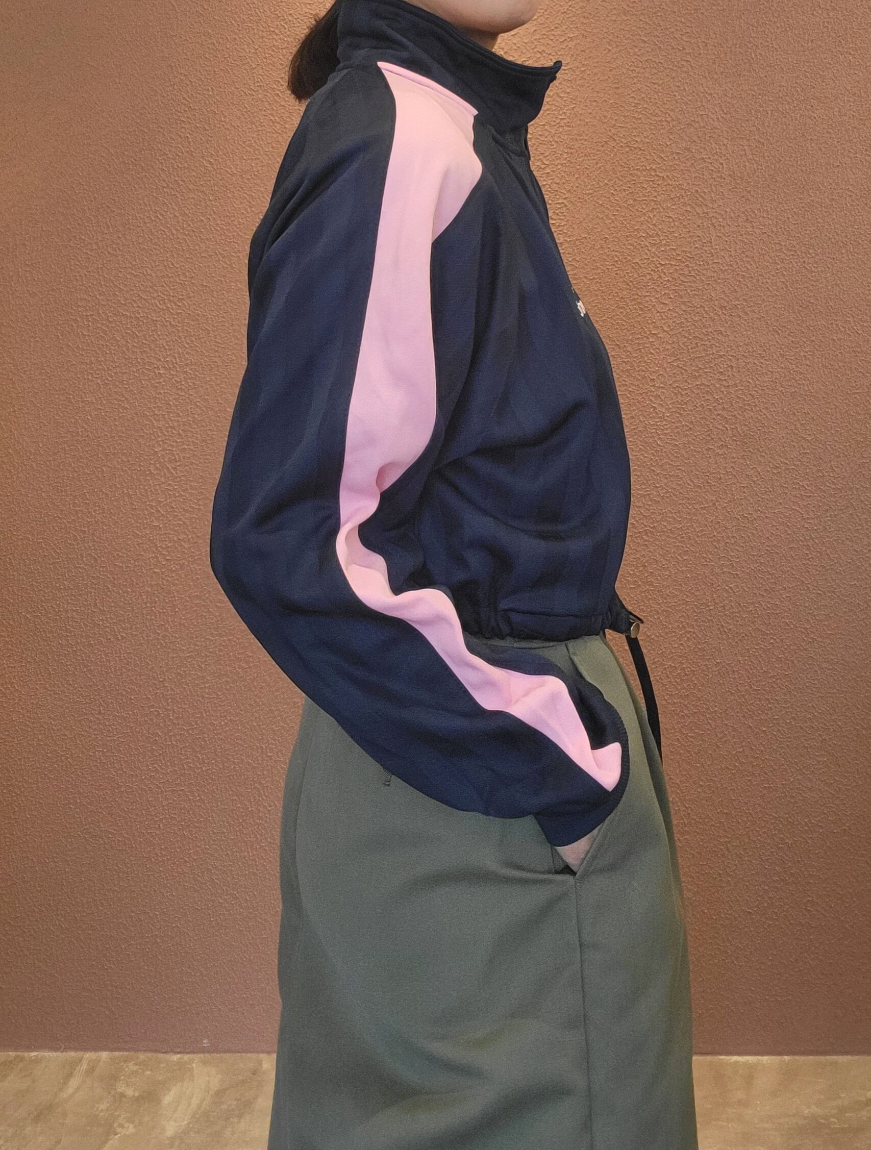 Used ジャージをリメイクしたトラックジャケット。裾のドローコードはゴム仕様、ジッパーはダブルジッパーで上下から開閉が可能です。クロップド丈でボレロ感覚で羽織ってスポーツミックスを楽しめます。ハイウエストパンツやマキシスカートとの相性もよく、バランス良くスタイリングできます。