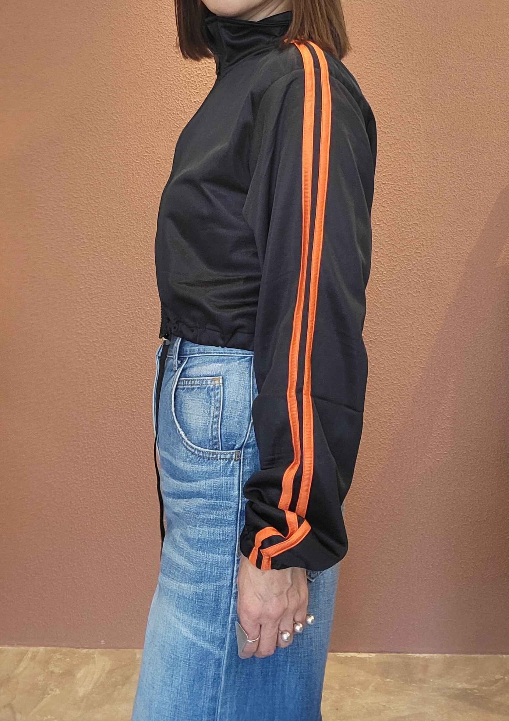 Used ジャージをリメイクしたトラックジャケット。裾のドローコードはゴム仕様、ジッパーはダブルジッパーで上下から開閉が可能です。クロップド丈でボレロ感覚で羽織ってスポーツミックスを楽しめます。ハイウエストパンツやマキシスカートとの相性もよく、バランス良くスタイリングできます。