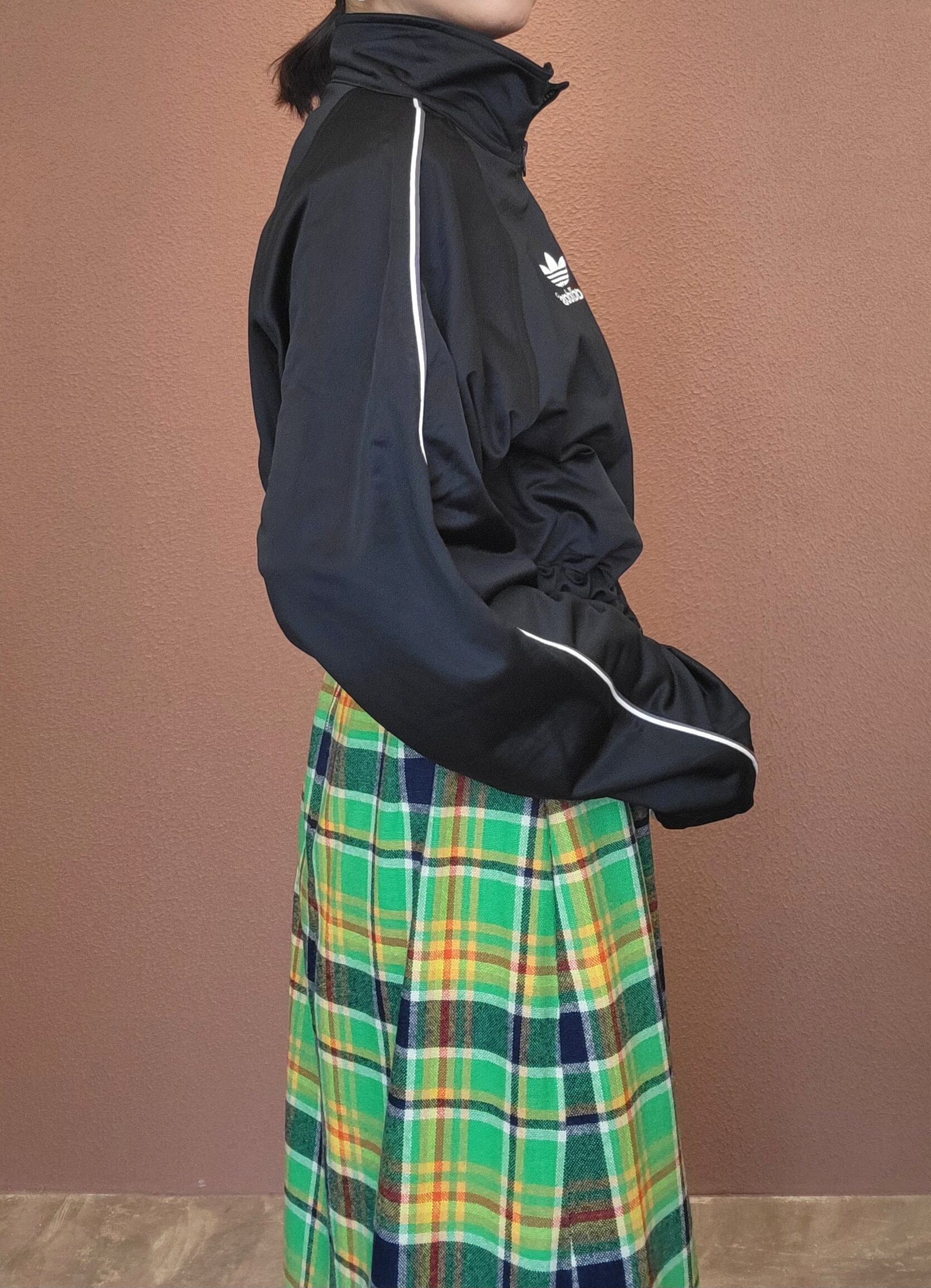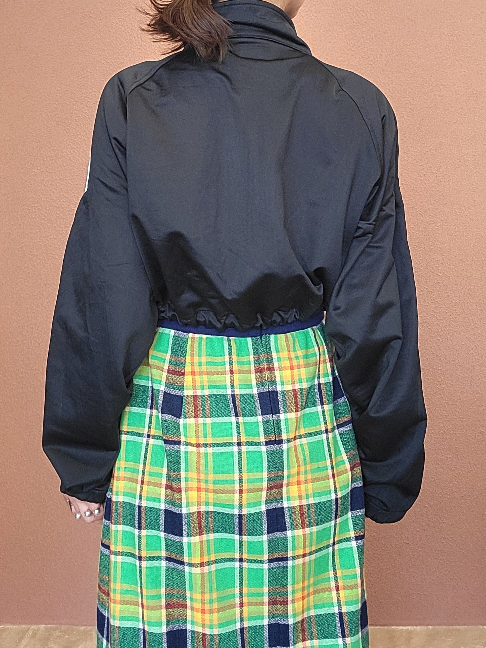 Used ジャージをリメイクしたトラックジャケット。裾のドローコードはゴム仕様、ジッパーはダブルジッパーで上下から開閉が可能です。クロップド丈でボレロ感覚で羽織ってスポーツミックスを楽しめます。ハイウエストパンツやマキシスカートとの相性もよく、バランス良くスタイリングできます。